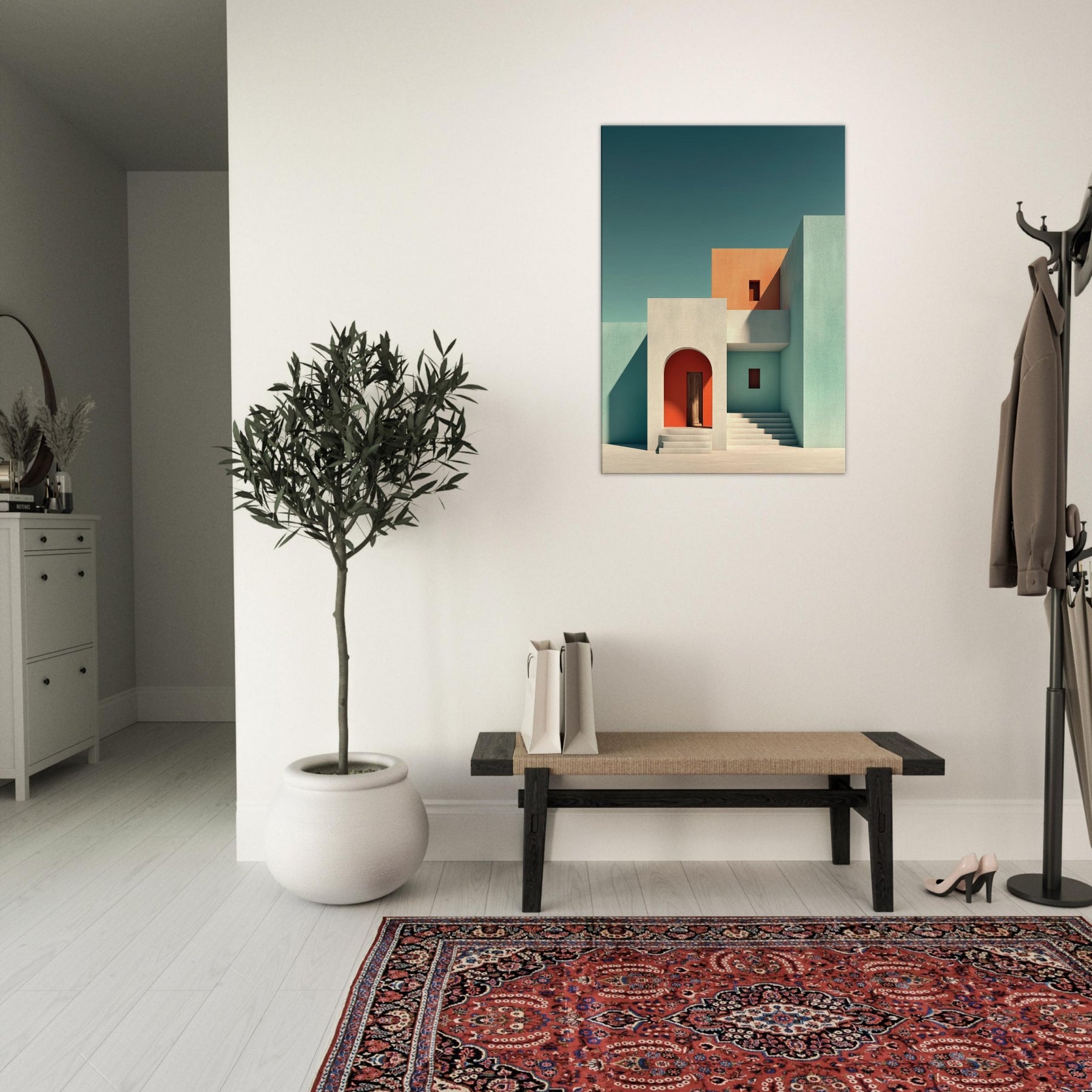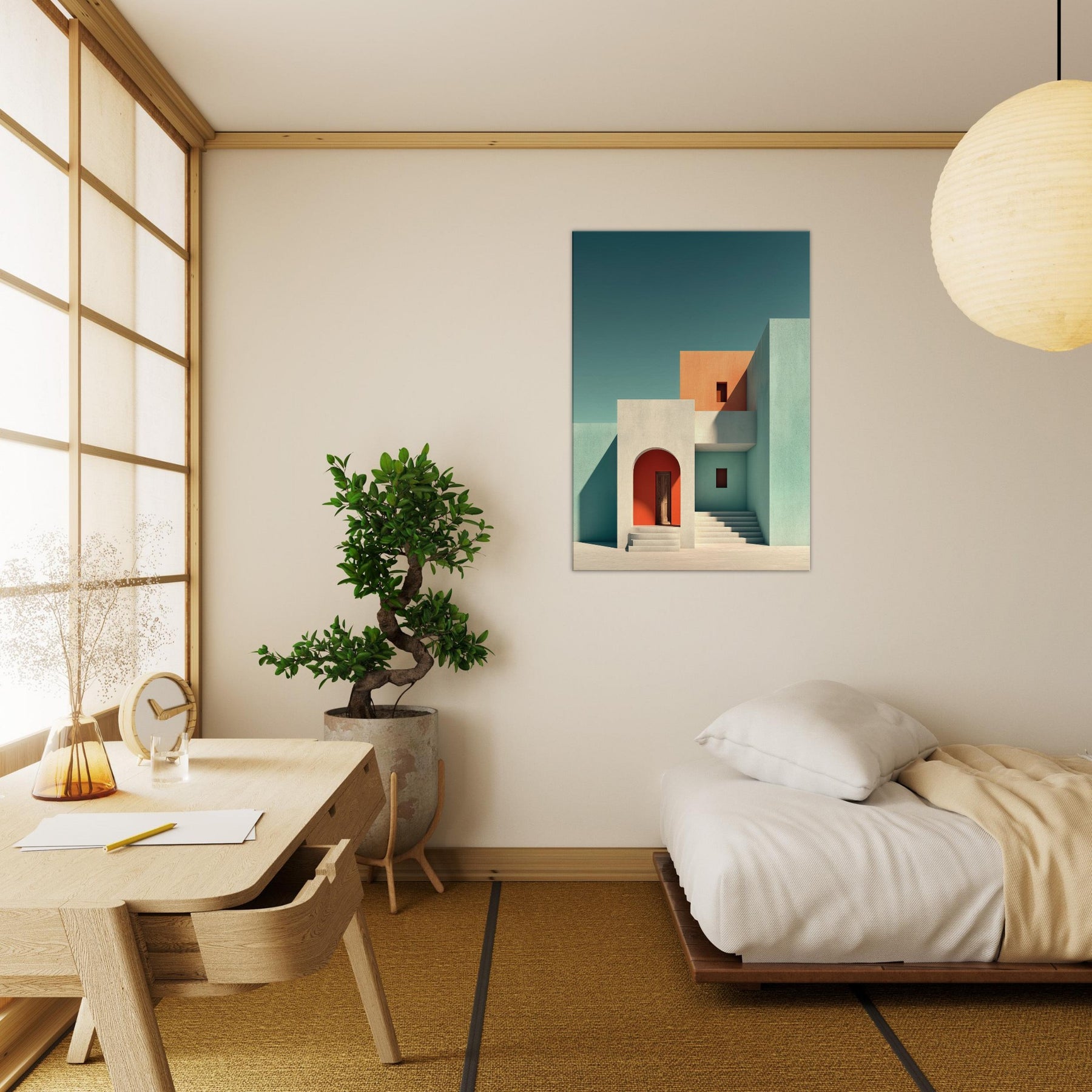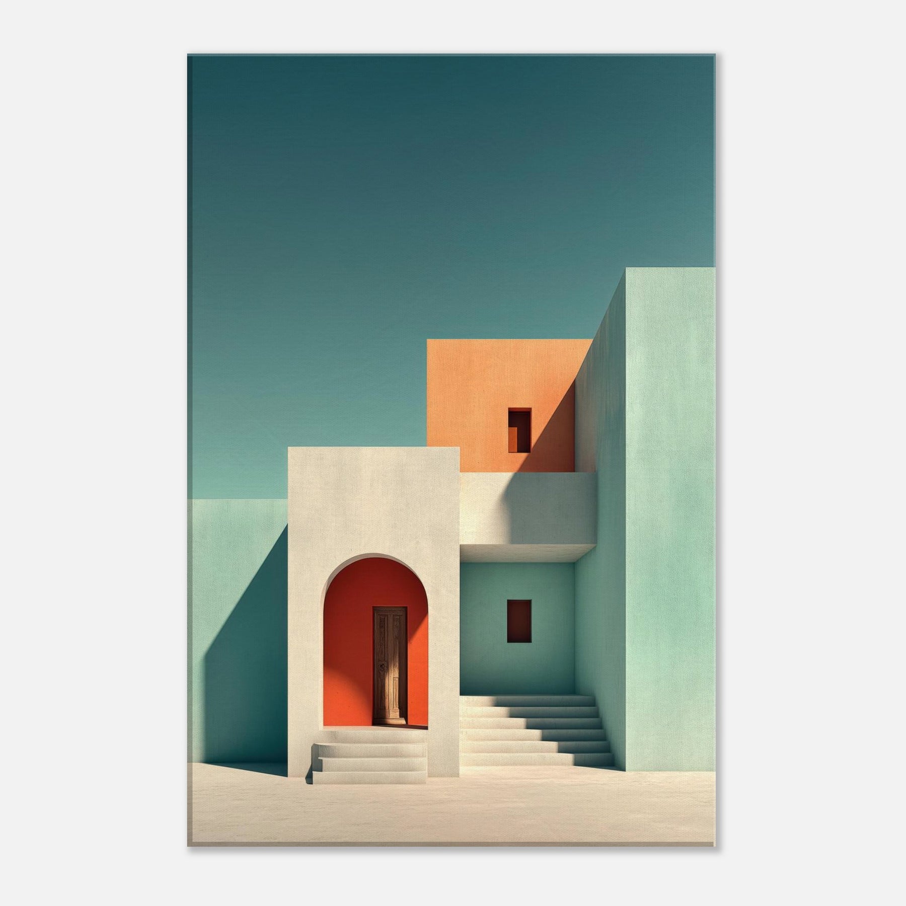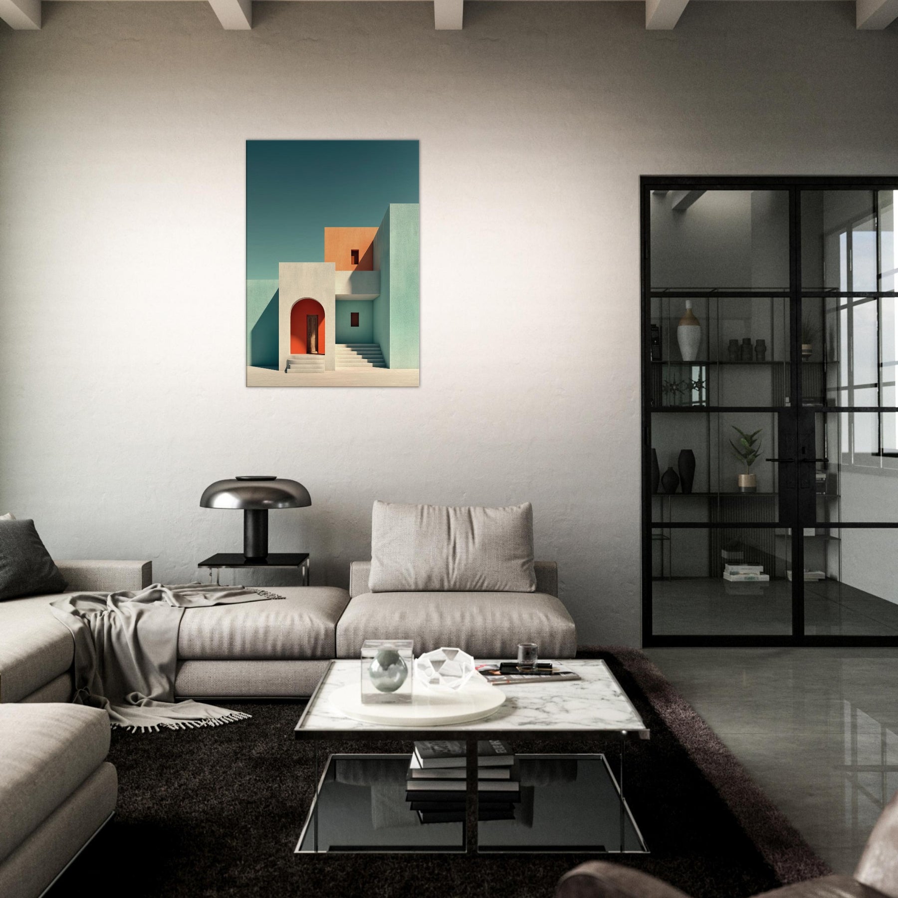 Santorini unfolds in a dreamlike architecture of pastel blocks and soft light, where staircases float and doorways prefer silence to speech. This surreal composition invites the eye to wander through sun warmed walls, a coral doorway, and cool turquoise shadows, evoking the sea kissed calm of an island afternoon. Printed as wall art, it lends a refined, cinematic atmosphere to any living space, turning a room into a tranquil horizon of color, texture, and memory.