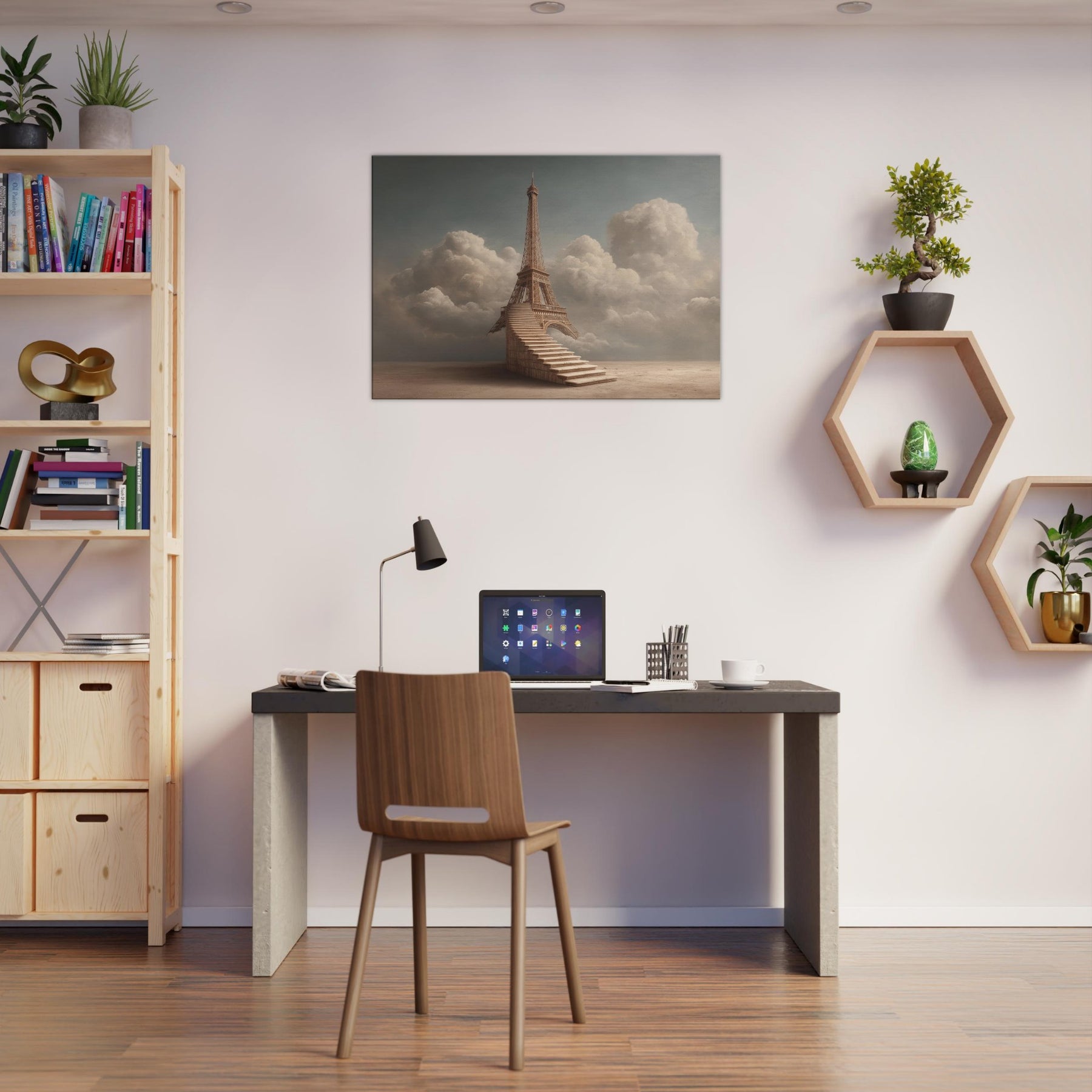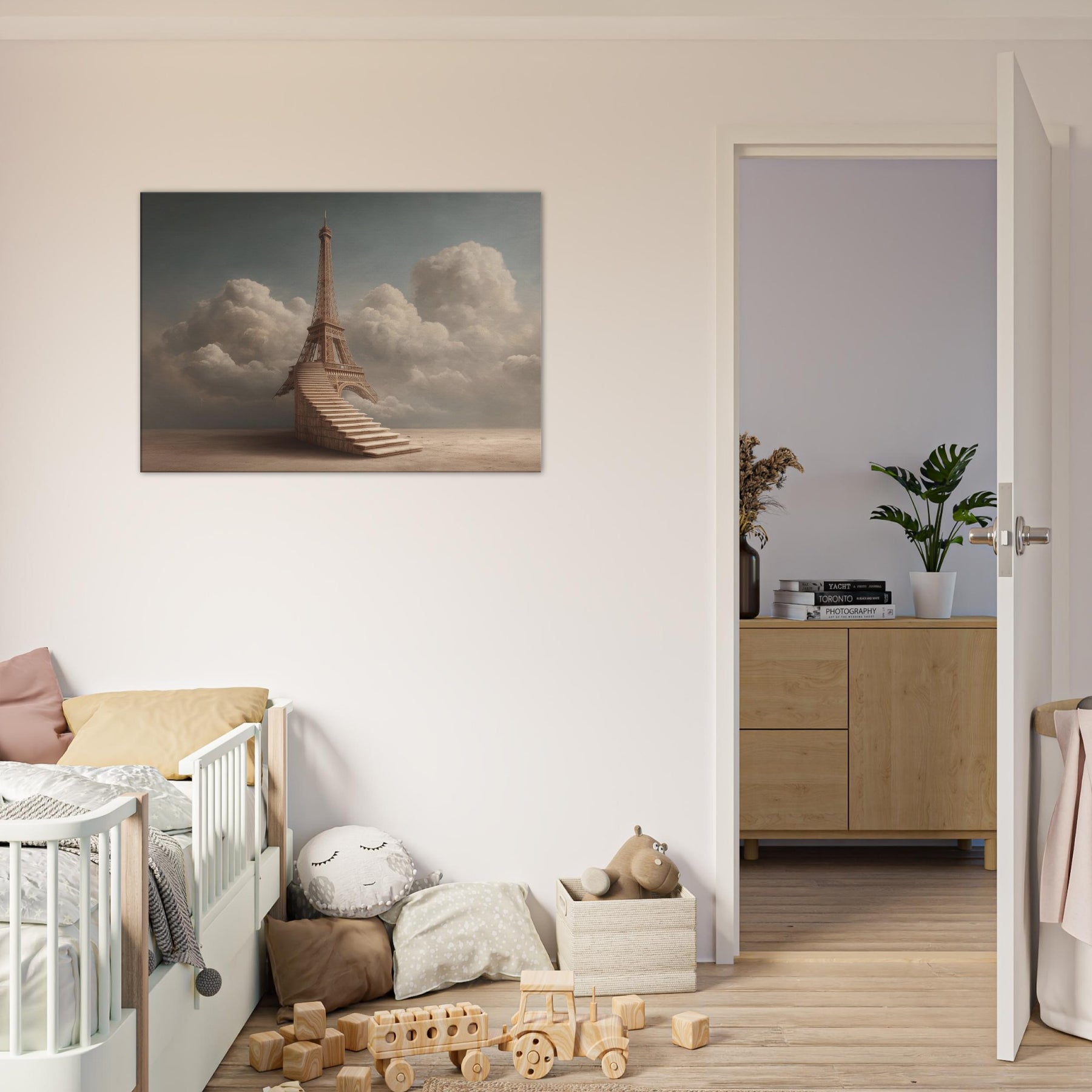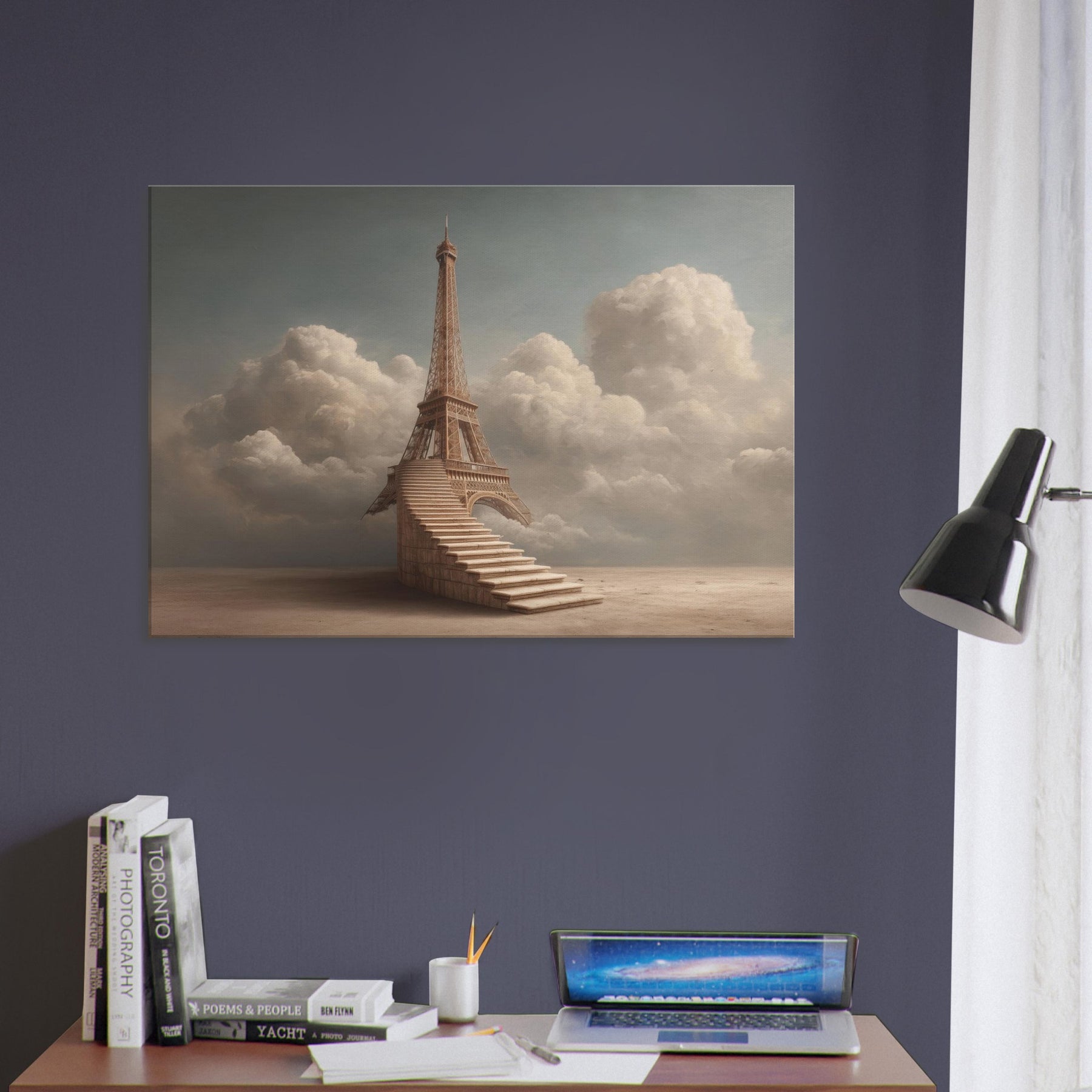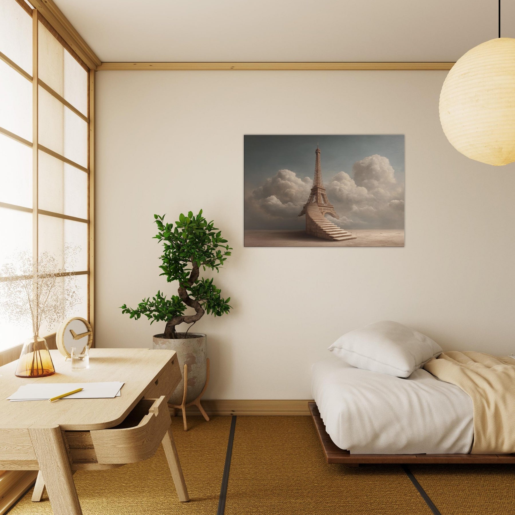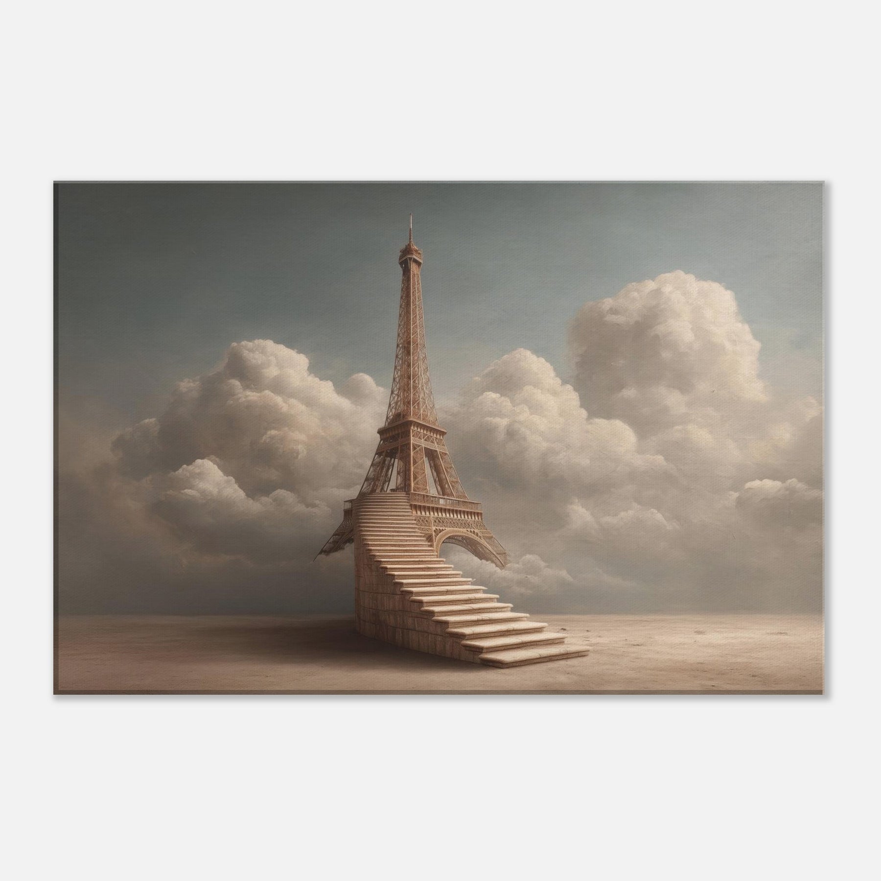 A dreamlike ascent unfolds around the Eiffel Tower, reimagined as a serene staircase that climbs into a soft, cloud lit sky. The composition breathes calm and wonder, with amber tones that echo sunset over a sleeping city. It invites slow, reflective thoughts and gentle conversation, turning walls into a contemplative horizon. In a living space, this piece becomes a warm, cinematic focal point that pairs effortlessly with neutral textiles and natural woods, evoking memory, travel, and quiet possibility.