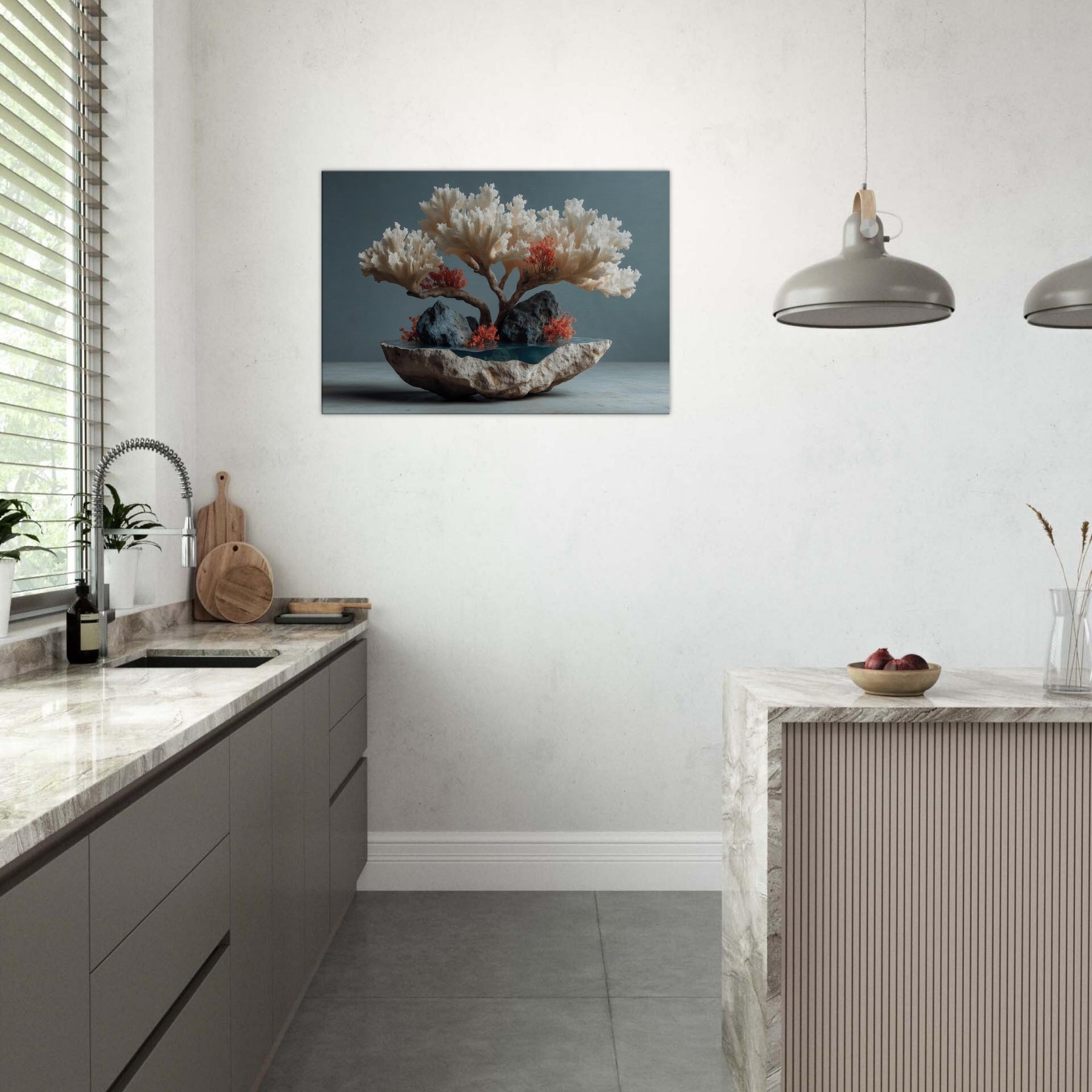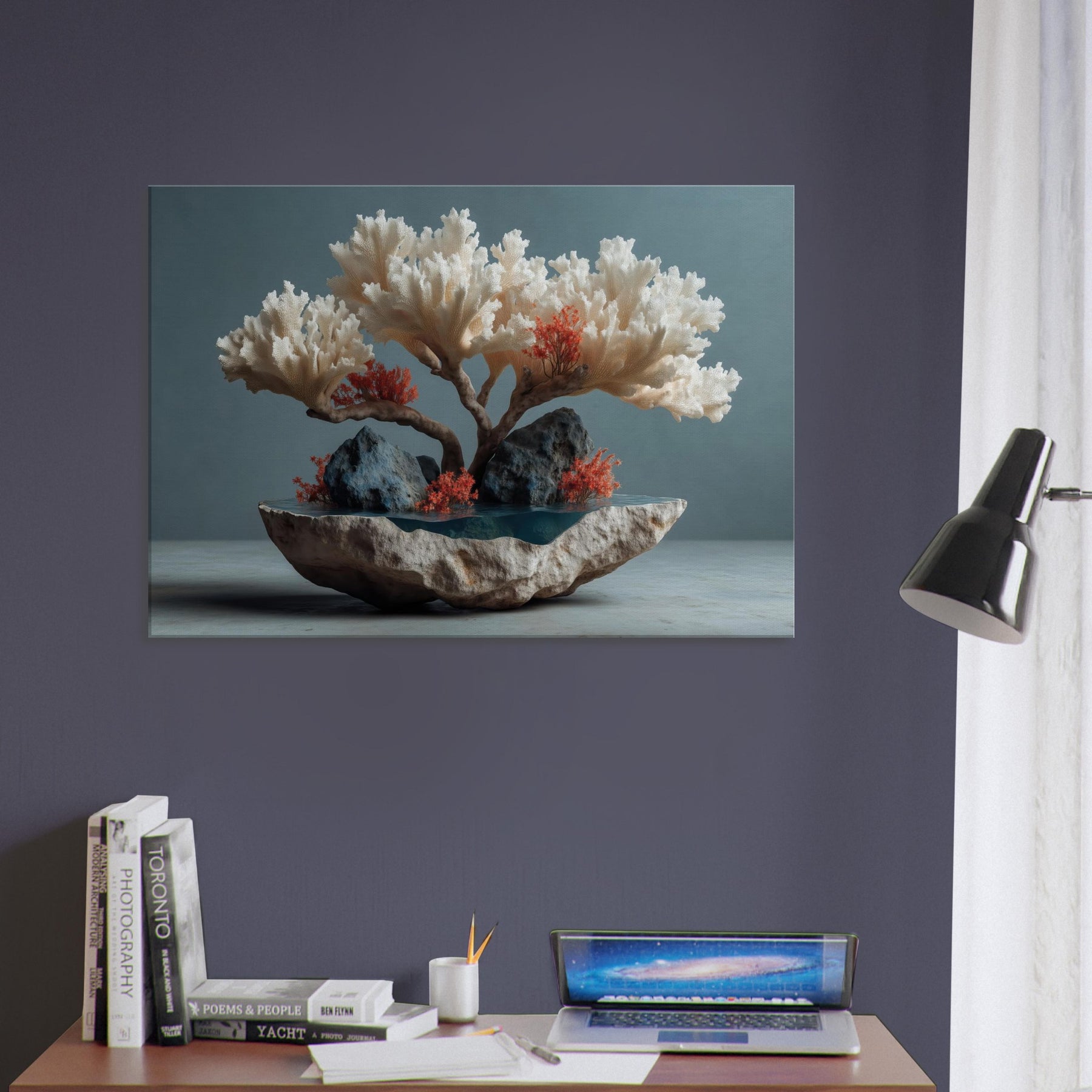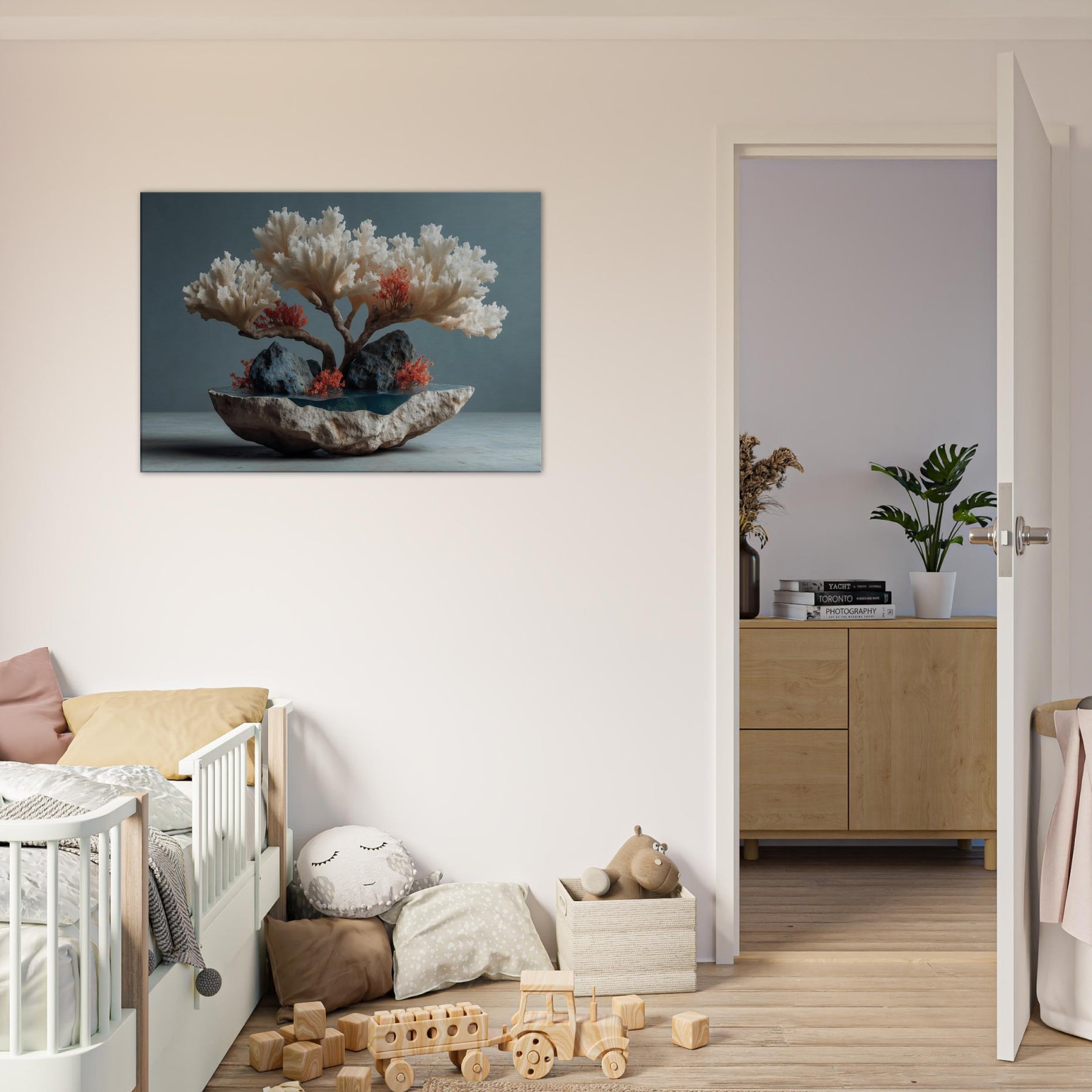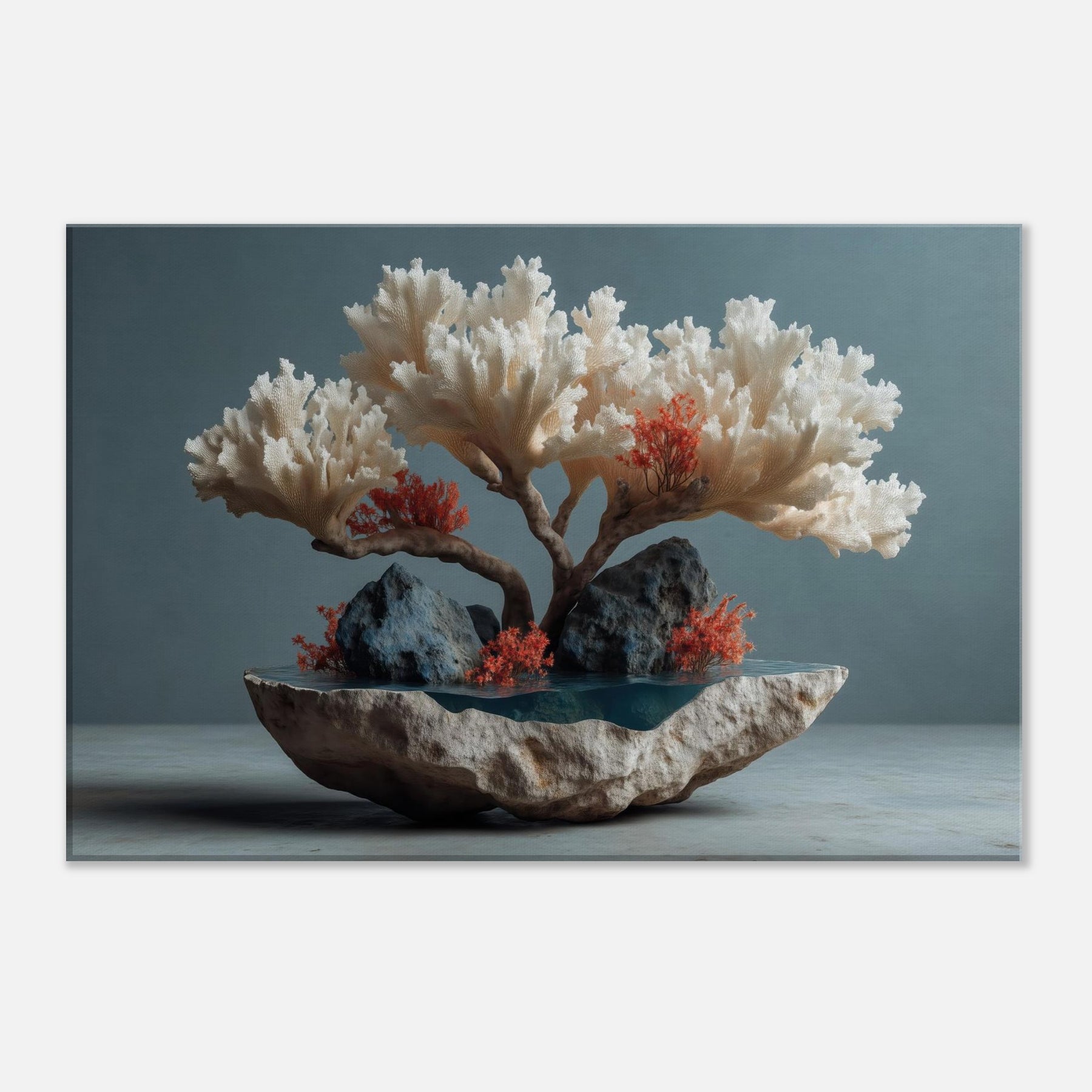 Like a dream carved from tide and stone, this Coral inspired sculpture rests in a rugged shell basin, where quiet water gleams beneath. Twin rock pillars support a luminous coral canopy, its white fans unfurling against a moody blue backdrop, with bright red coral accents lending heat to the scene. The surreal composition invites contemplation, turning any wall into a grotto of stillness and wonder. Perfect for living rooms or bedrooms, it seduces the senses, enriching spaces with oceanic calm, whimsy, and a whisper of distant reefs.