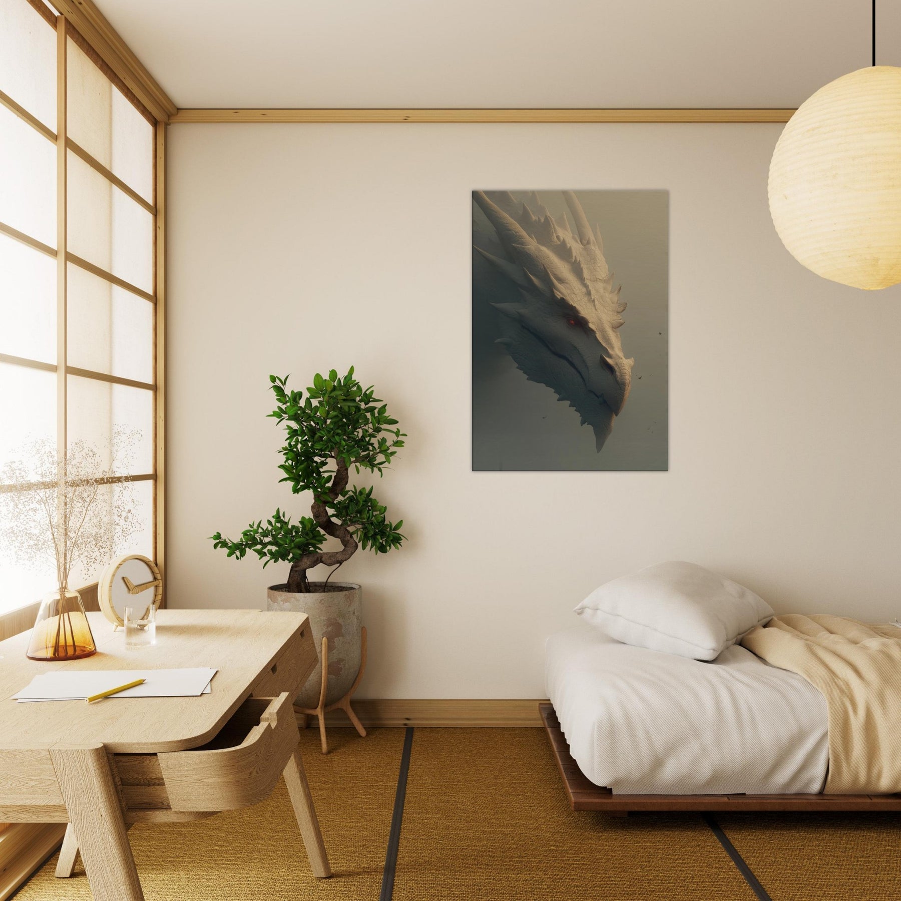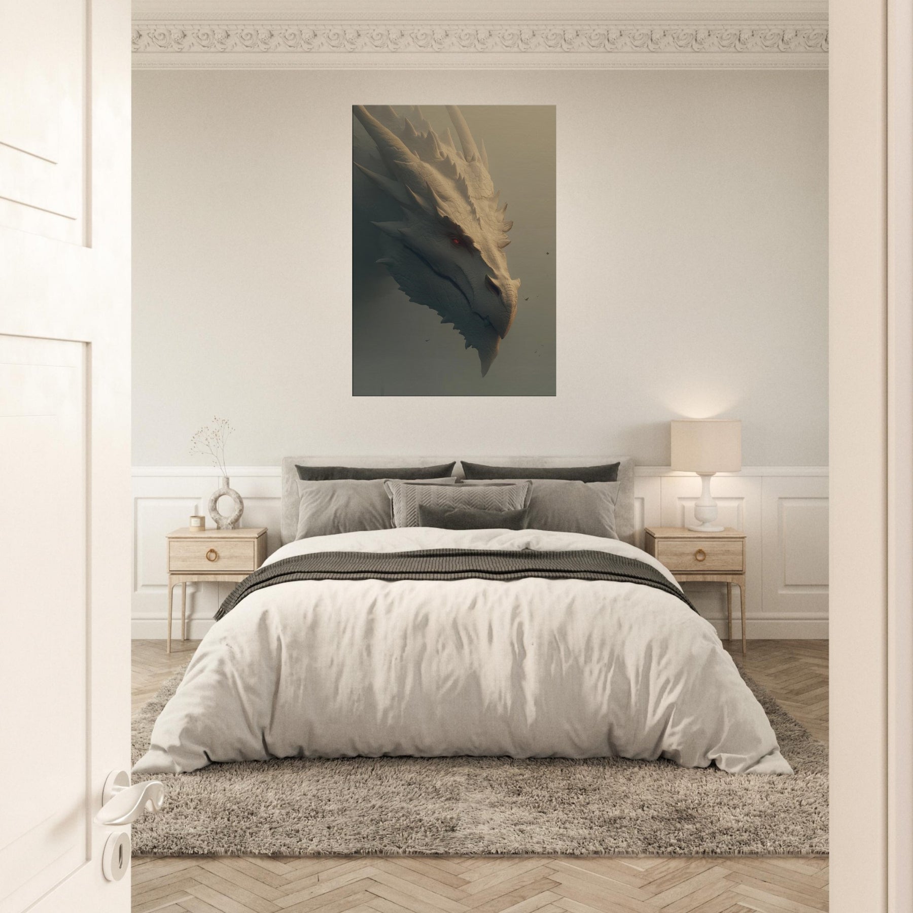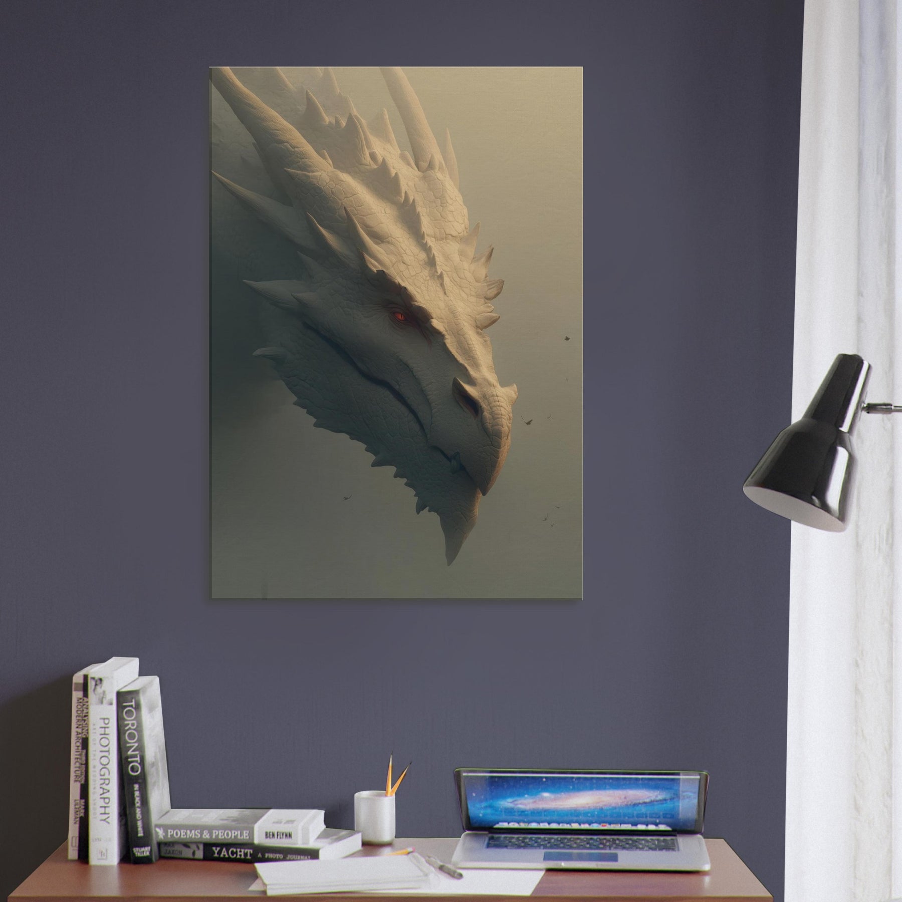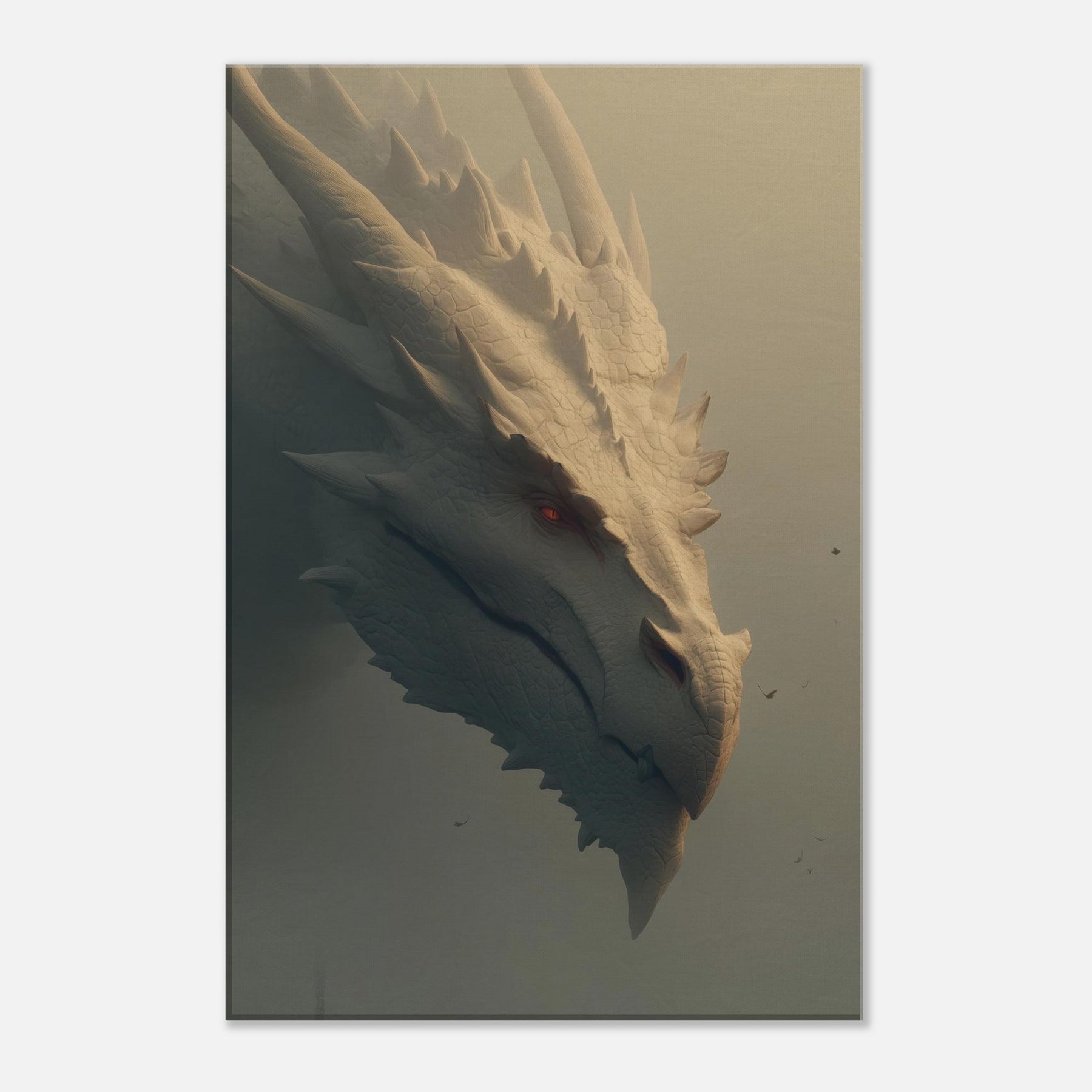 In this soaring surreal , a Majestic Dragon moves with patient gravity through a dreamlike dawn, where light pools in ridges of bone white scales and soft fog brushes the blade like spines. The atmosphere feels ancient and wise, as if the creature guards a memory of forgotten skies. This wall art invites the senses to slow its tactile detail, warm tonal glow, and quiet menace create a centerpiece that transforms a room into a sanctuary of imagination, wonder, and conversation.
