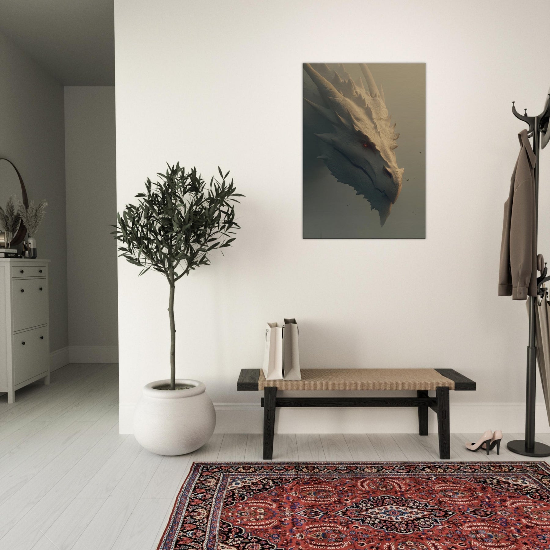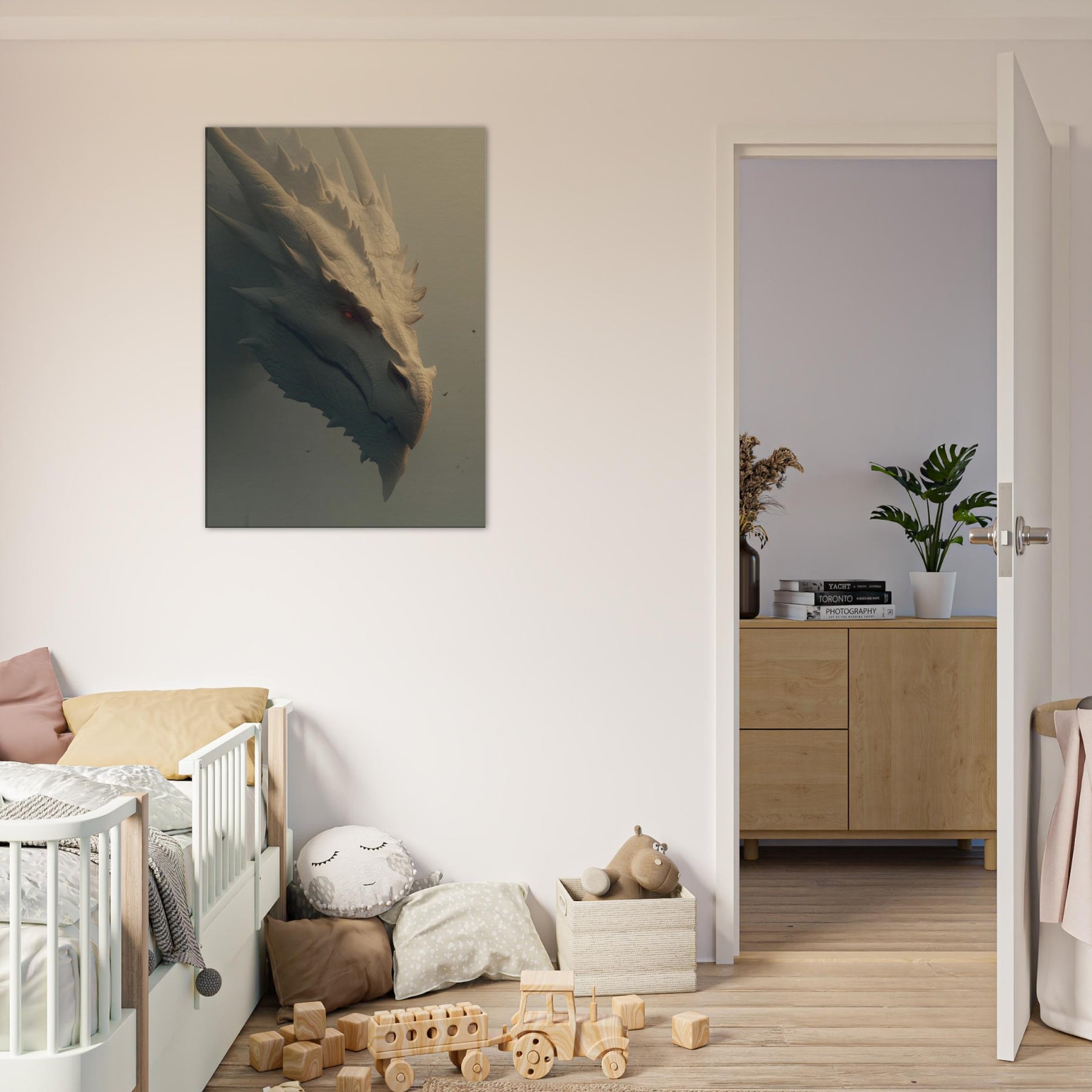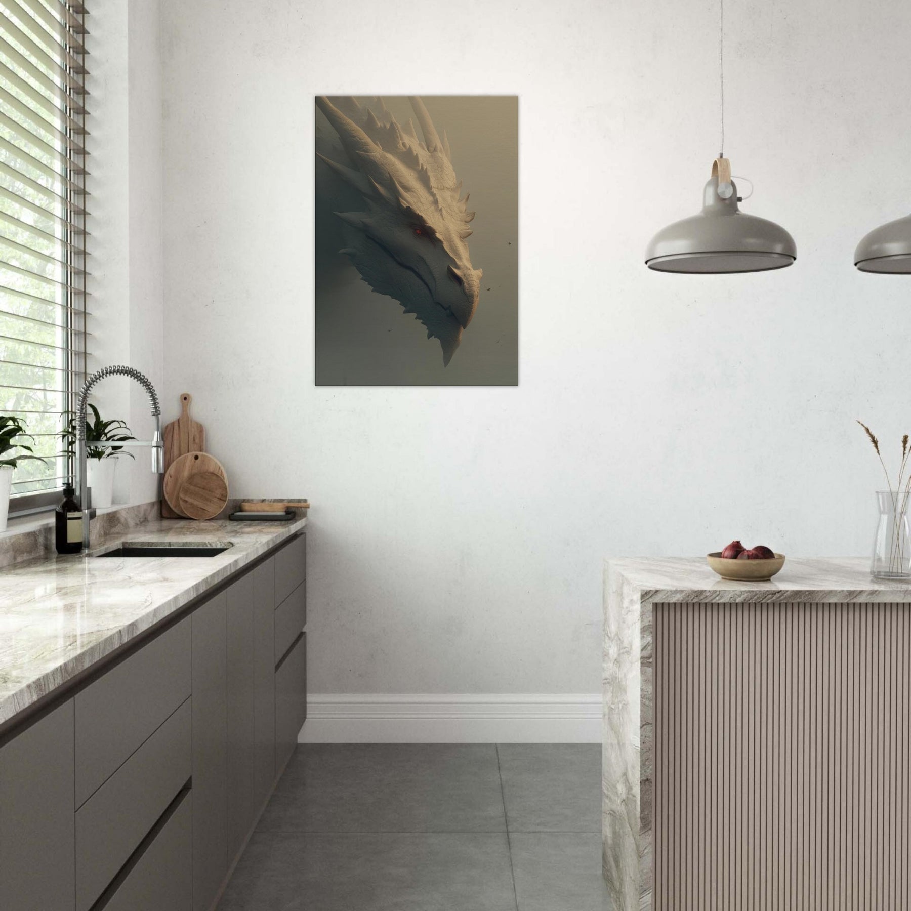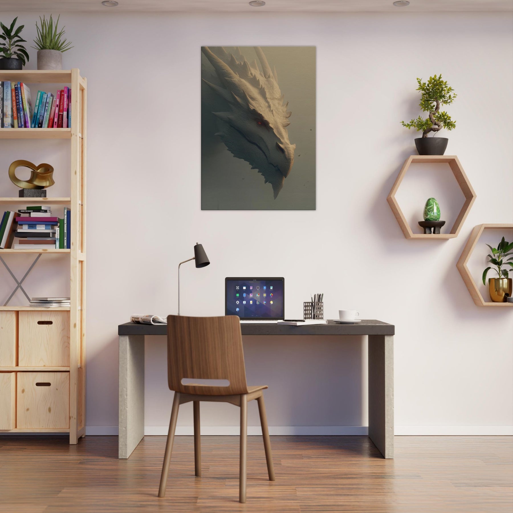 In this soaring surreal , a Majestic Dragon moves with patient gravity through a dreamlike dawn, where light pools in ridges of bone white scales and soft fog brushes the blade like spines. The atmosphere feels ancient and wise, as if the creature guards a memory of forgotten skies. This wall art invites the senses to slow its tactile detail, warm tonal glow, and quiet menace create a centerpiece that transforms a room into a sanctuary of imagination, wonder, and conversation.
