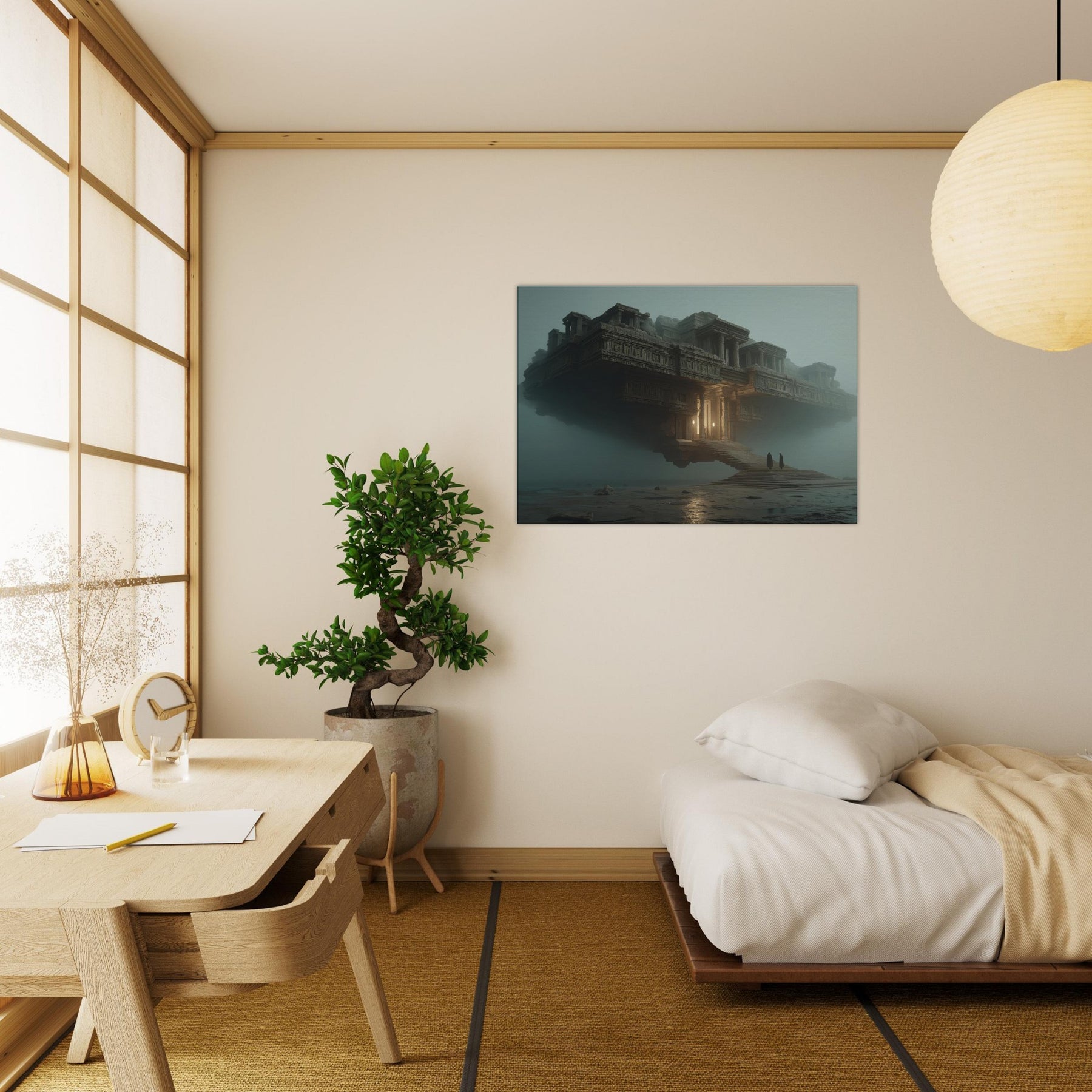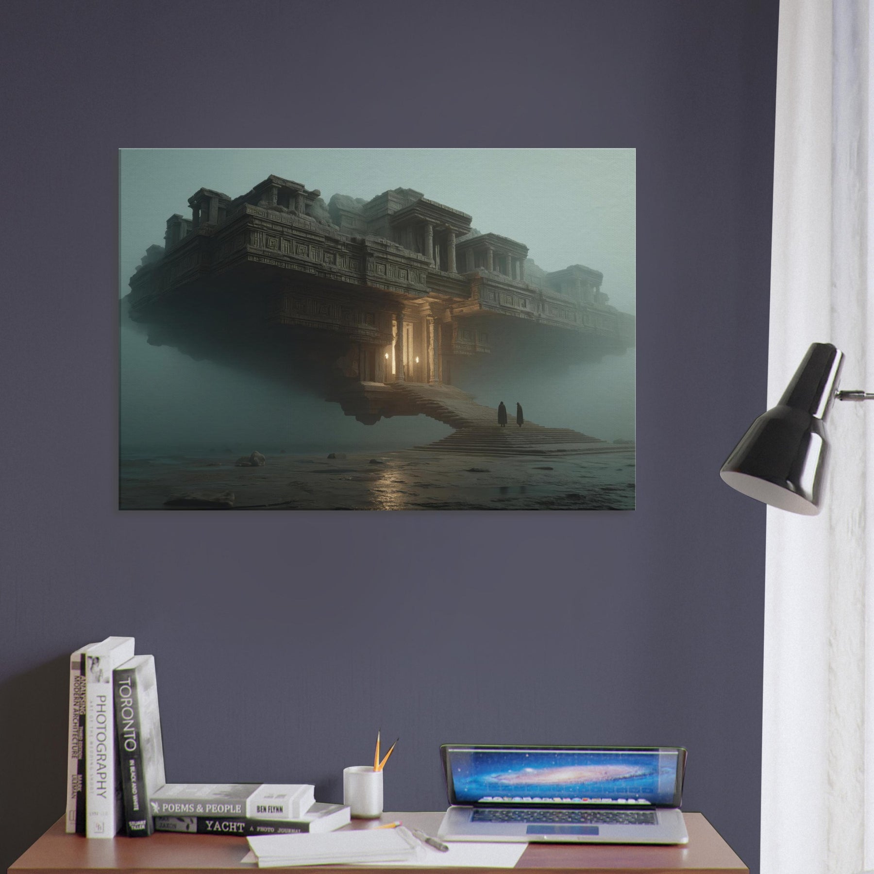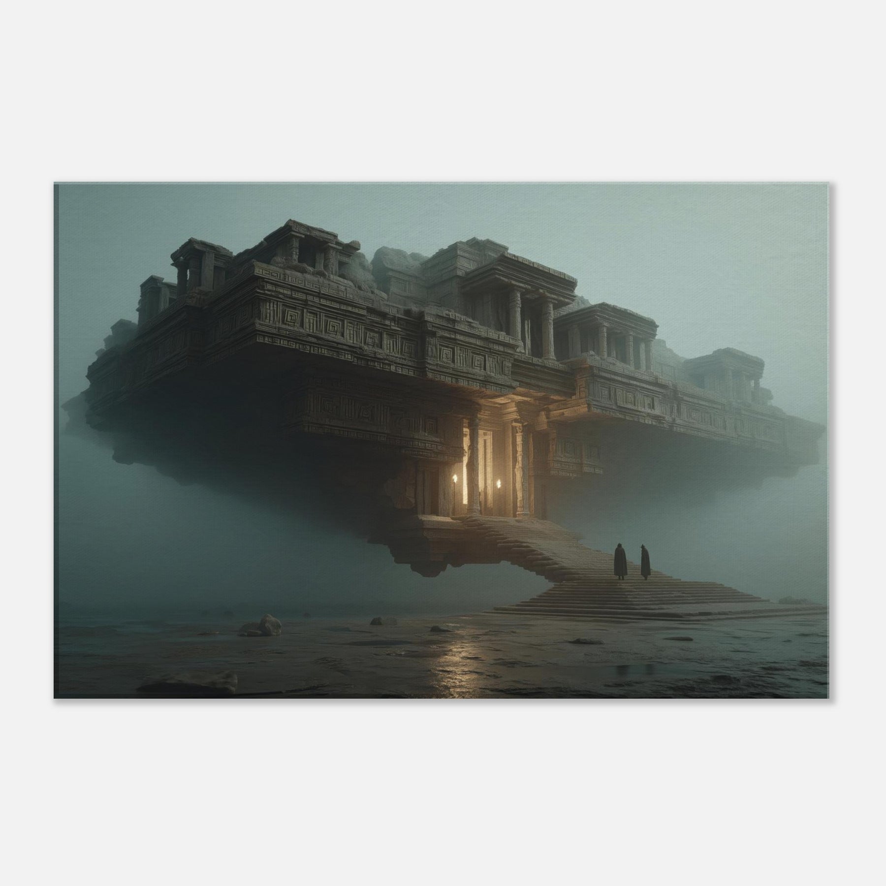 Balanced between architecture and dream, this piece centers on Mayan Temples as a suspended city that hovers above a quiet sea of fog. The surreal composition invites the eye to wander along carved stone details, stairways, and glowing alcoves that hint at forgotten rituals. Its warm amber light punctuates the dusk, making the room feel grounded yet otherworldly. Perfect for a living room or study, it invites contemplation, transformation, and a sense of expansive, cinematic calm.