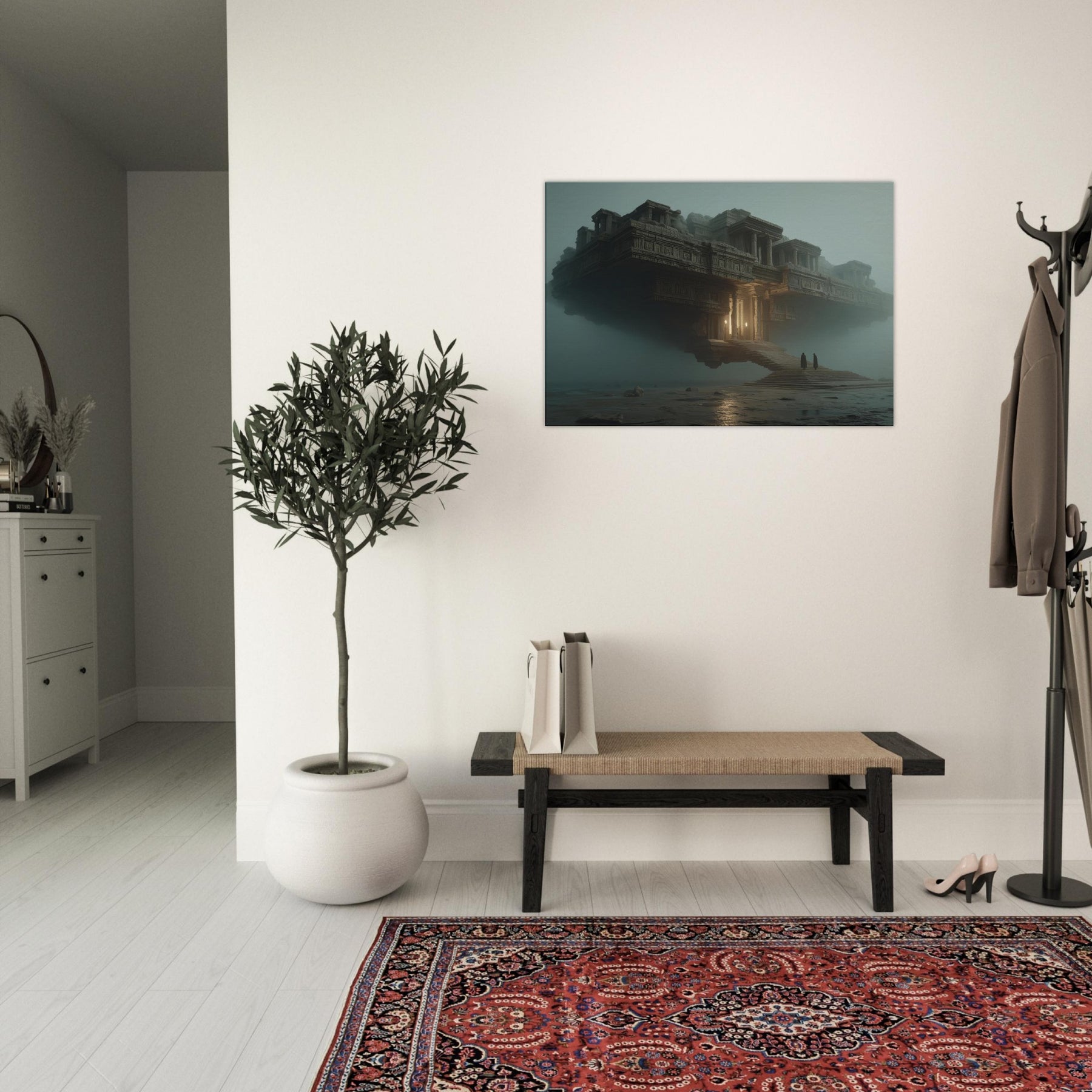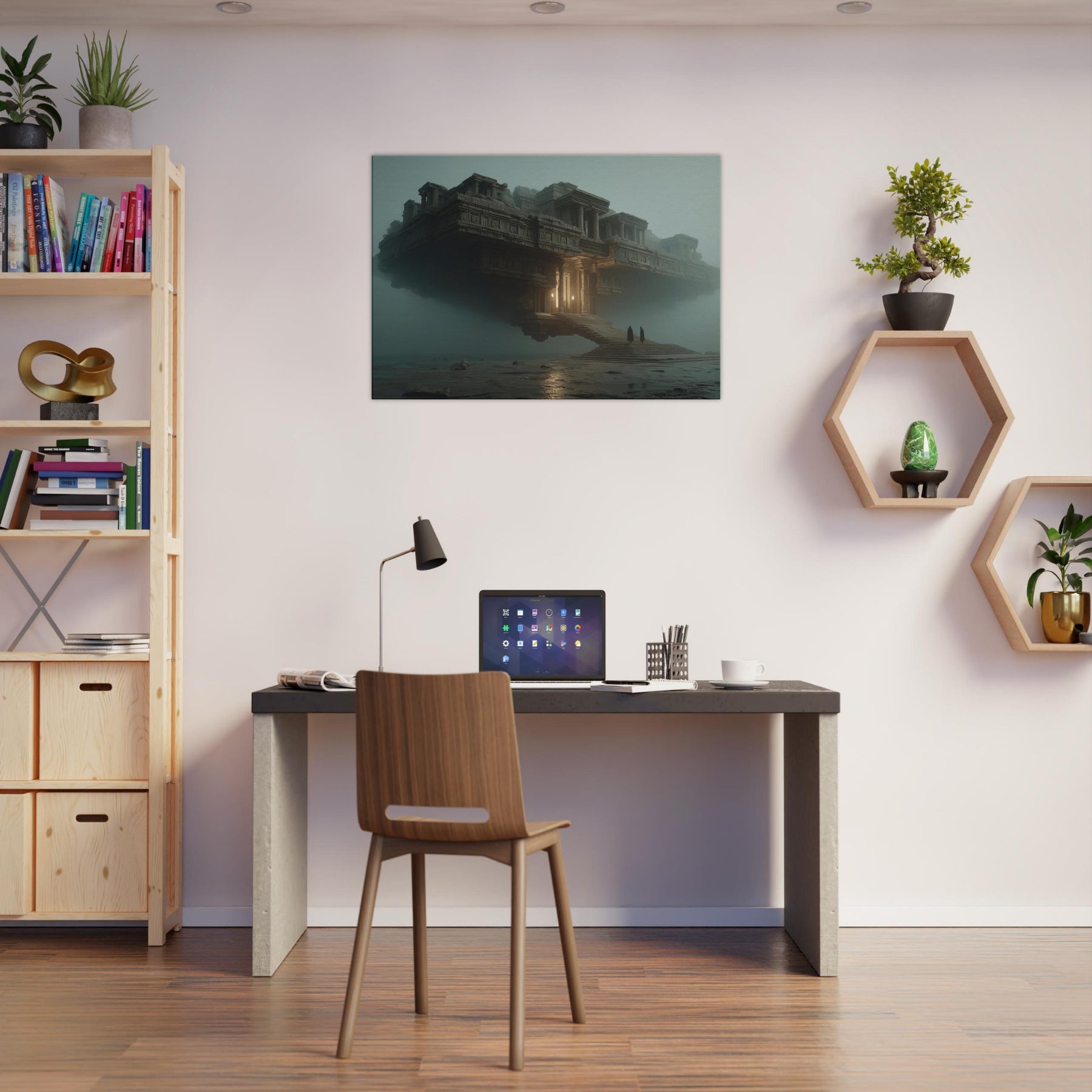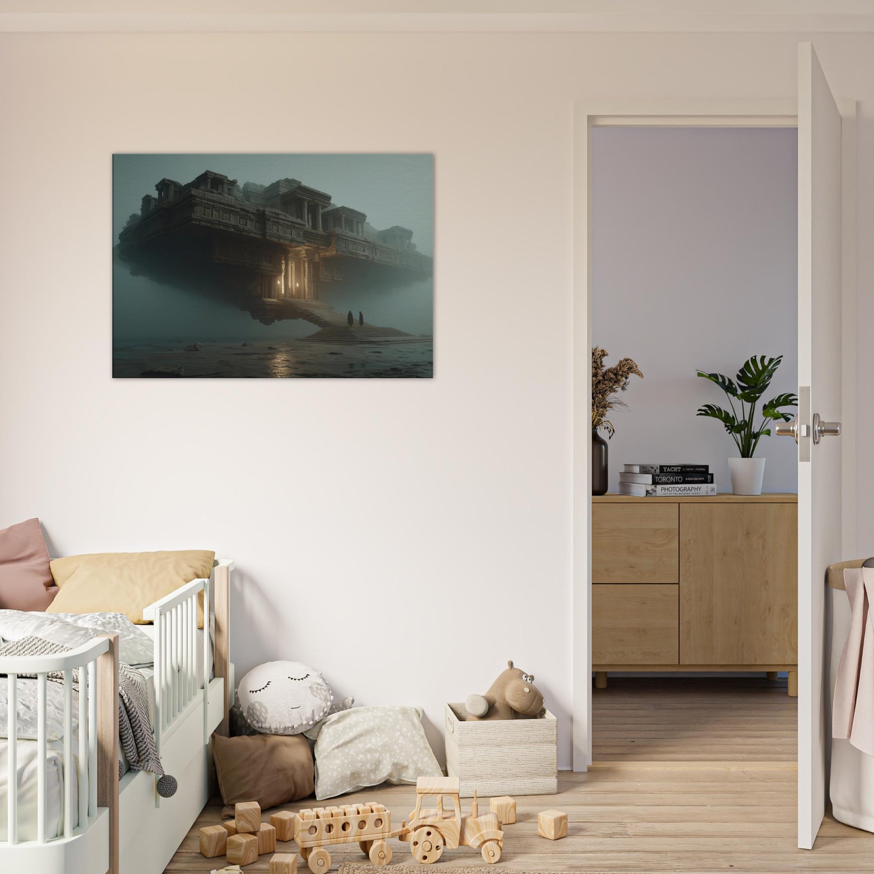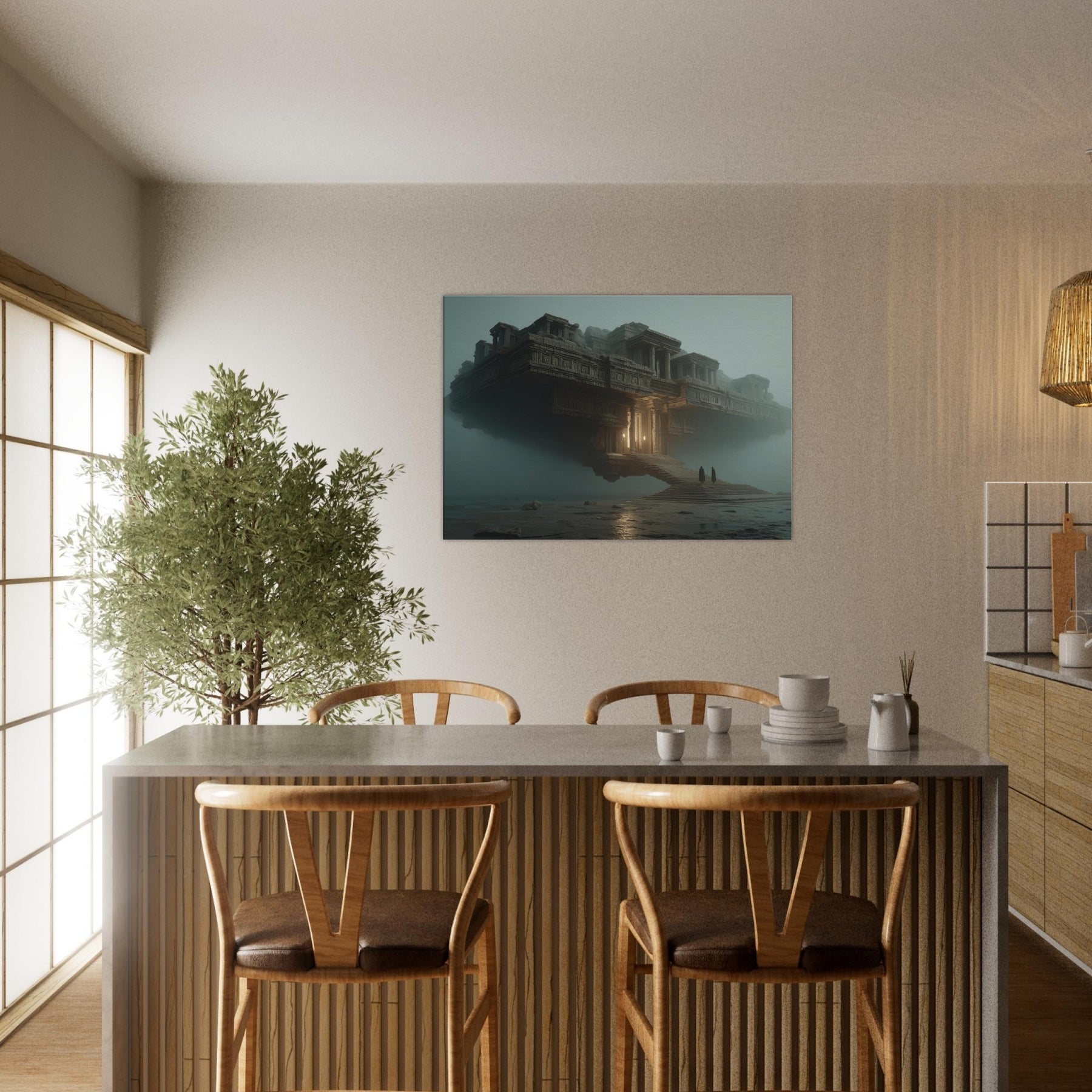 Balanced between architecture and dream, this piece centers on Mayan Temples as a suspended city that hovers above a quiet sea of fog. The surreal composition invites the eye to wander along carved stone details, stairways, and glowing alcoves that hint at forgotten rituals. Its warm amber light punctuates the dusk, making the room feel grounded yet otherworldly. Perfect for a living room or study, it invites contemplation, transformation, and a sense of expansive, cinematic calm.