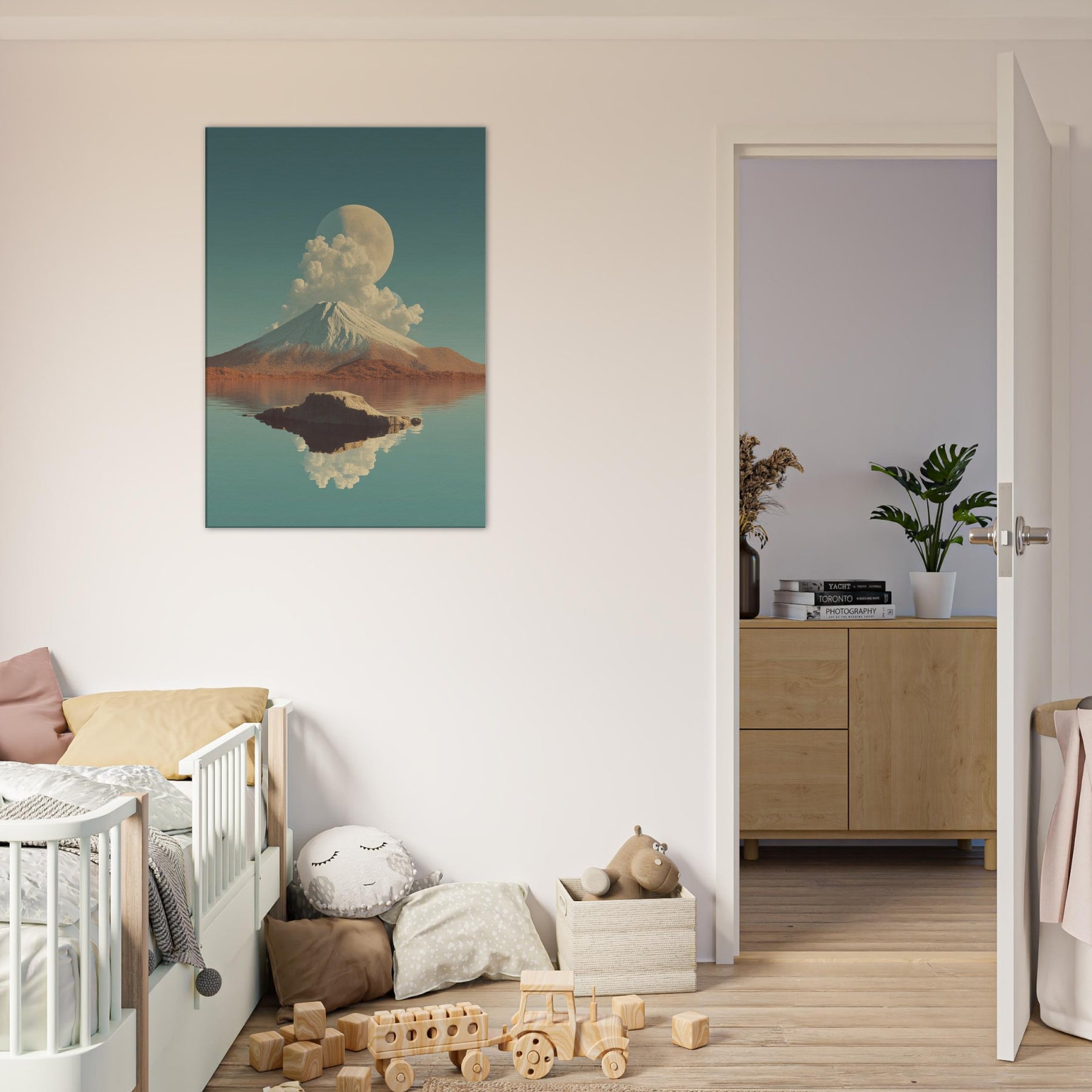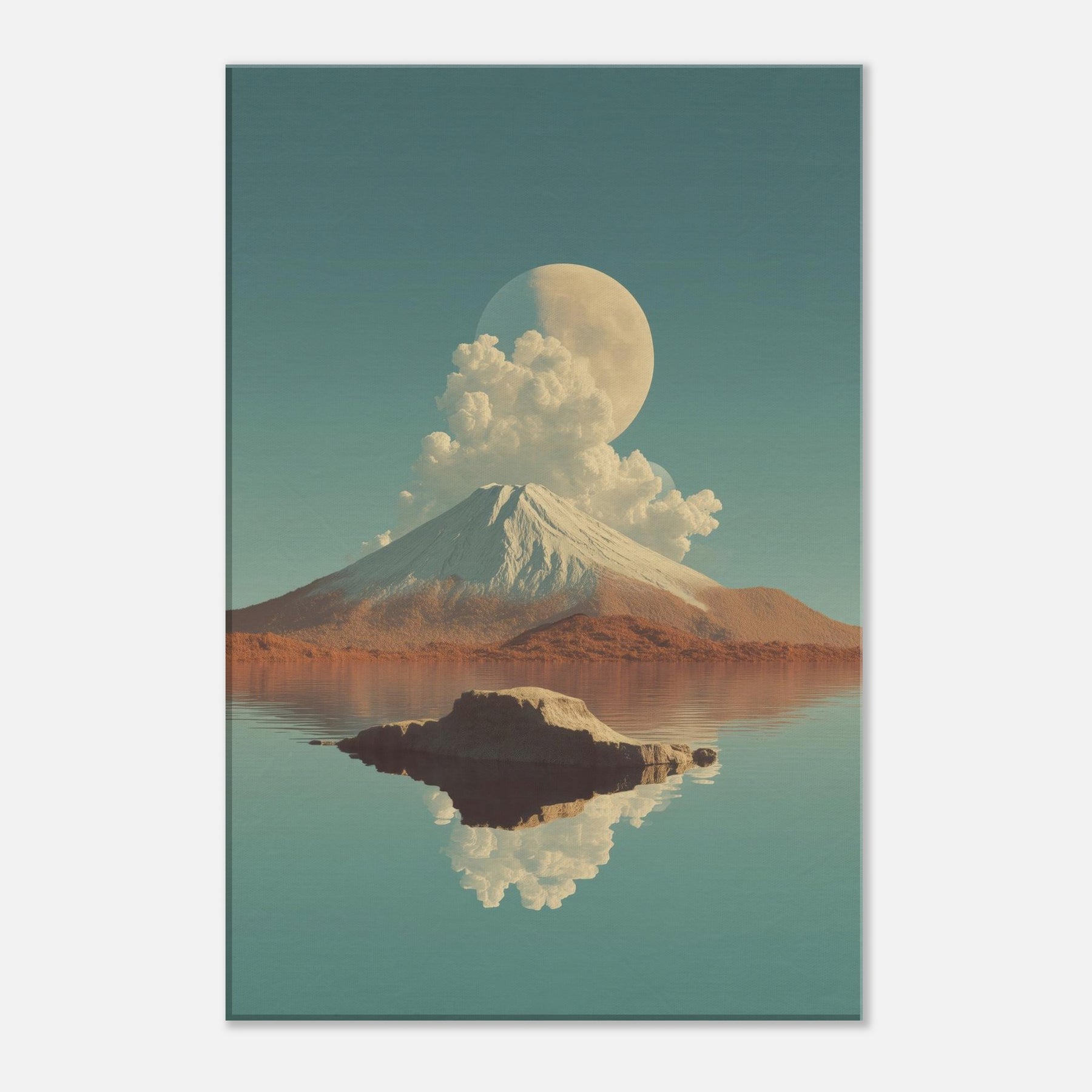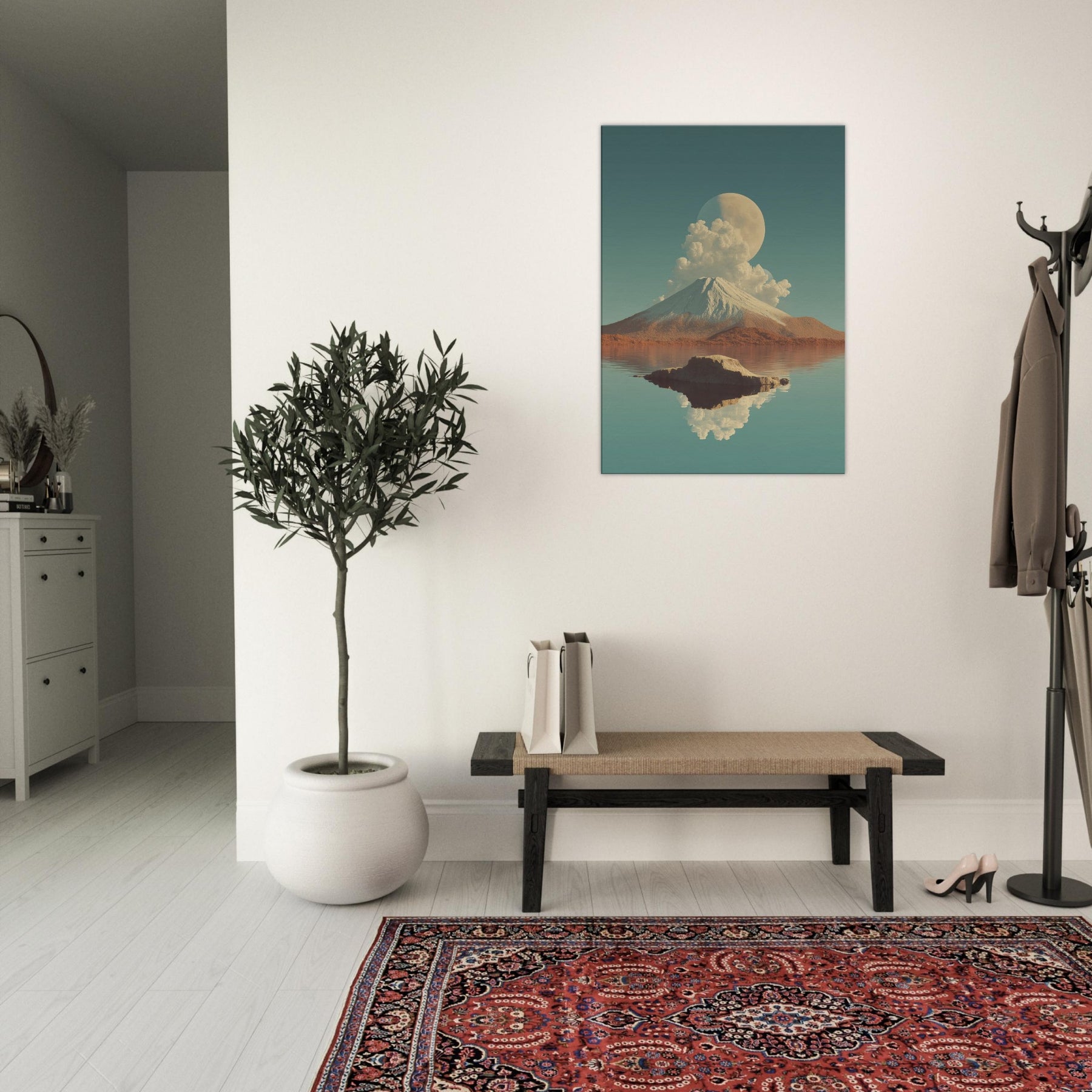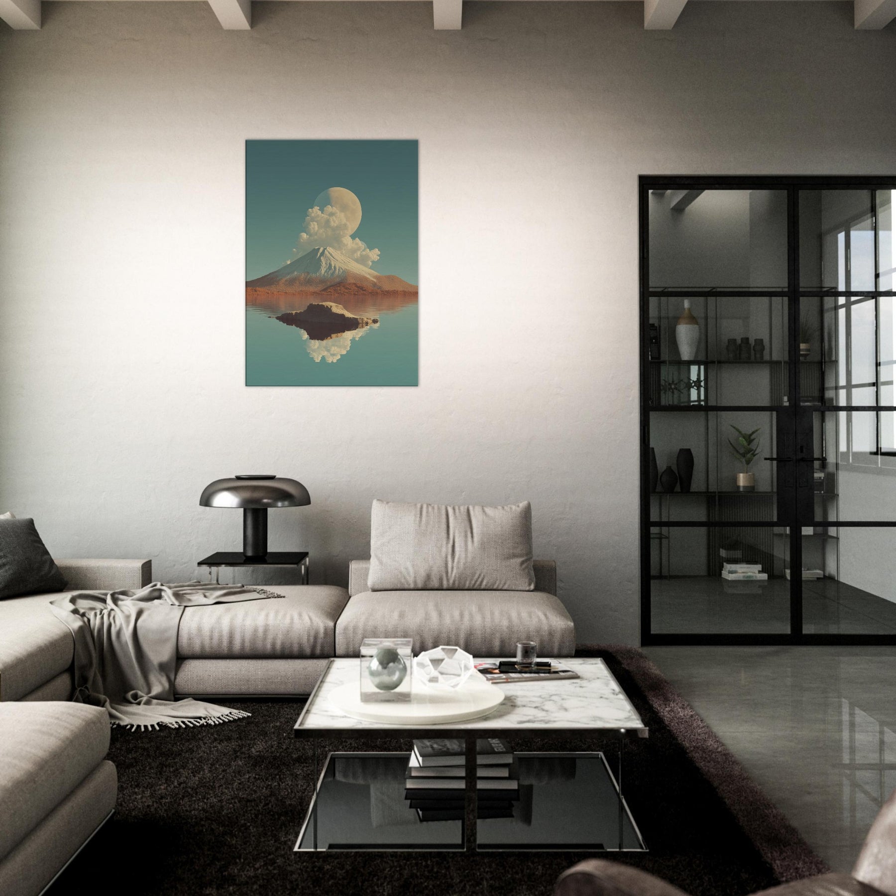 Mount Fuji rises in a dreamlike swell, its snow kissed summit brushing a sky that seems to breathe. Clouds coil around the peak as a tranquil lake mirrors the scene, turning the room into a quiet theater of memory. This surreal composition blends mystery with clarity, inviting slow, spacious moments of pause and reflection. Hang it to soften walls with luminous calm and a sense of vistas unfolding beyond the everyday.