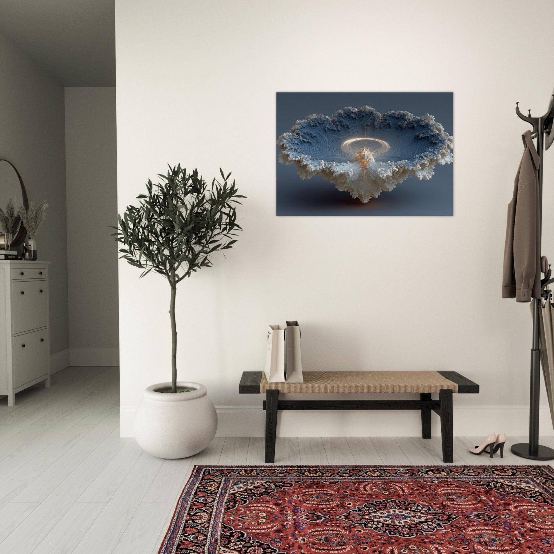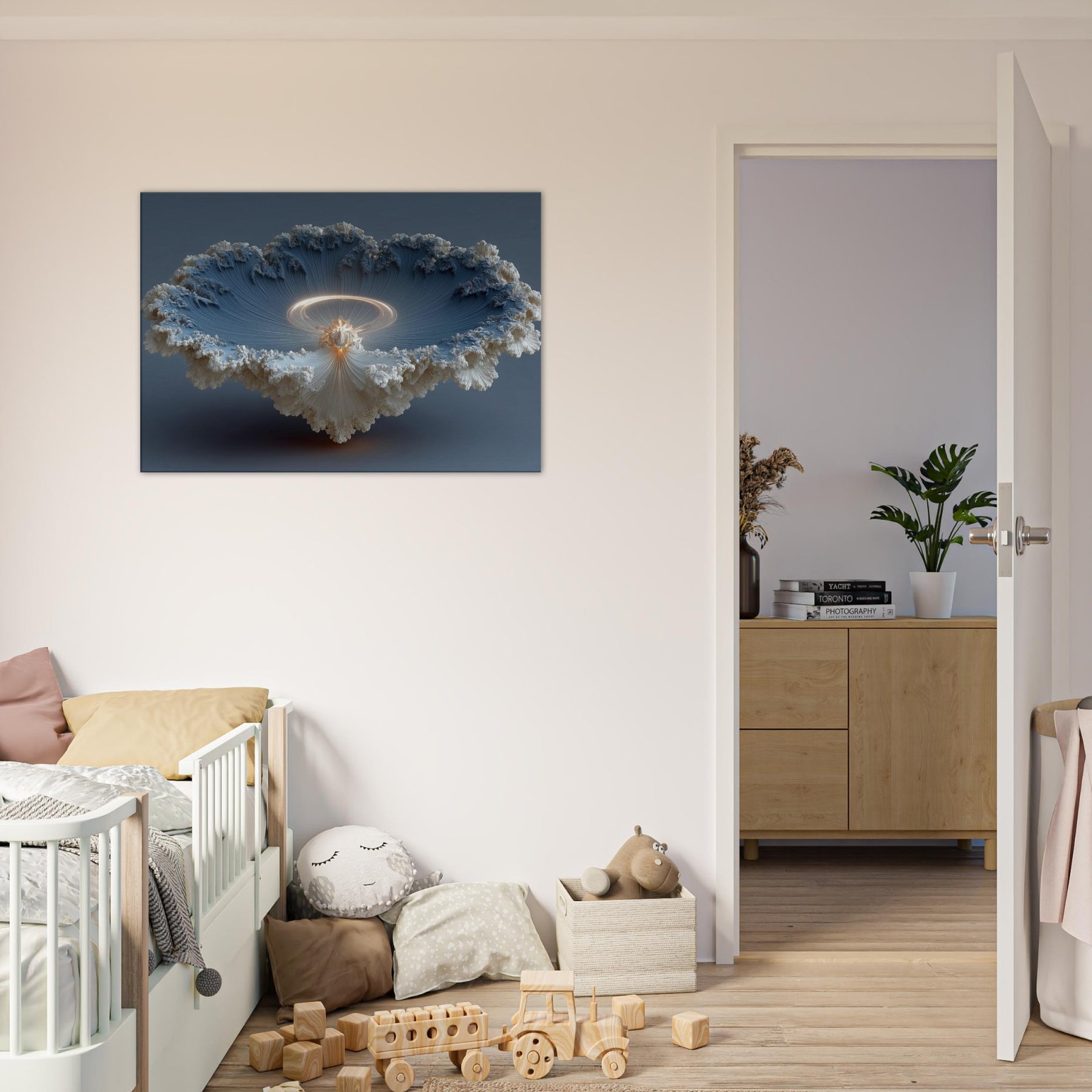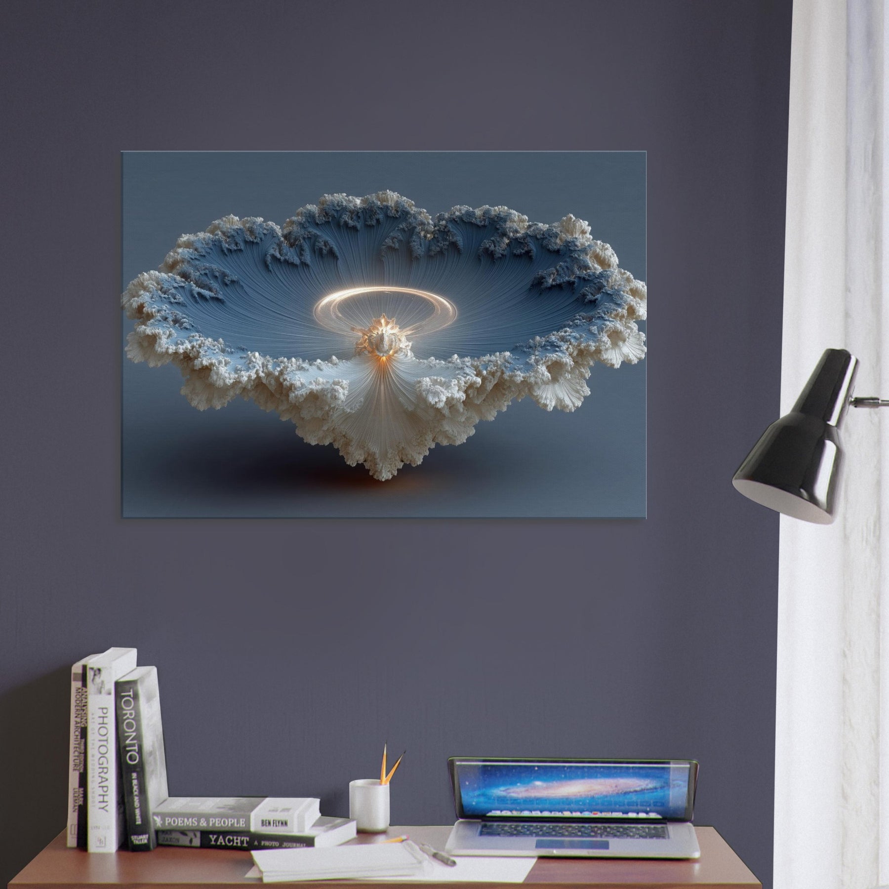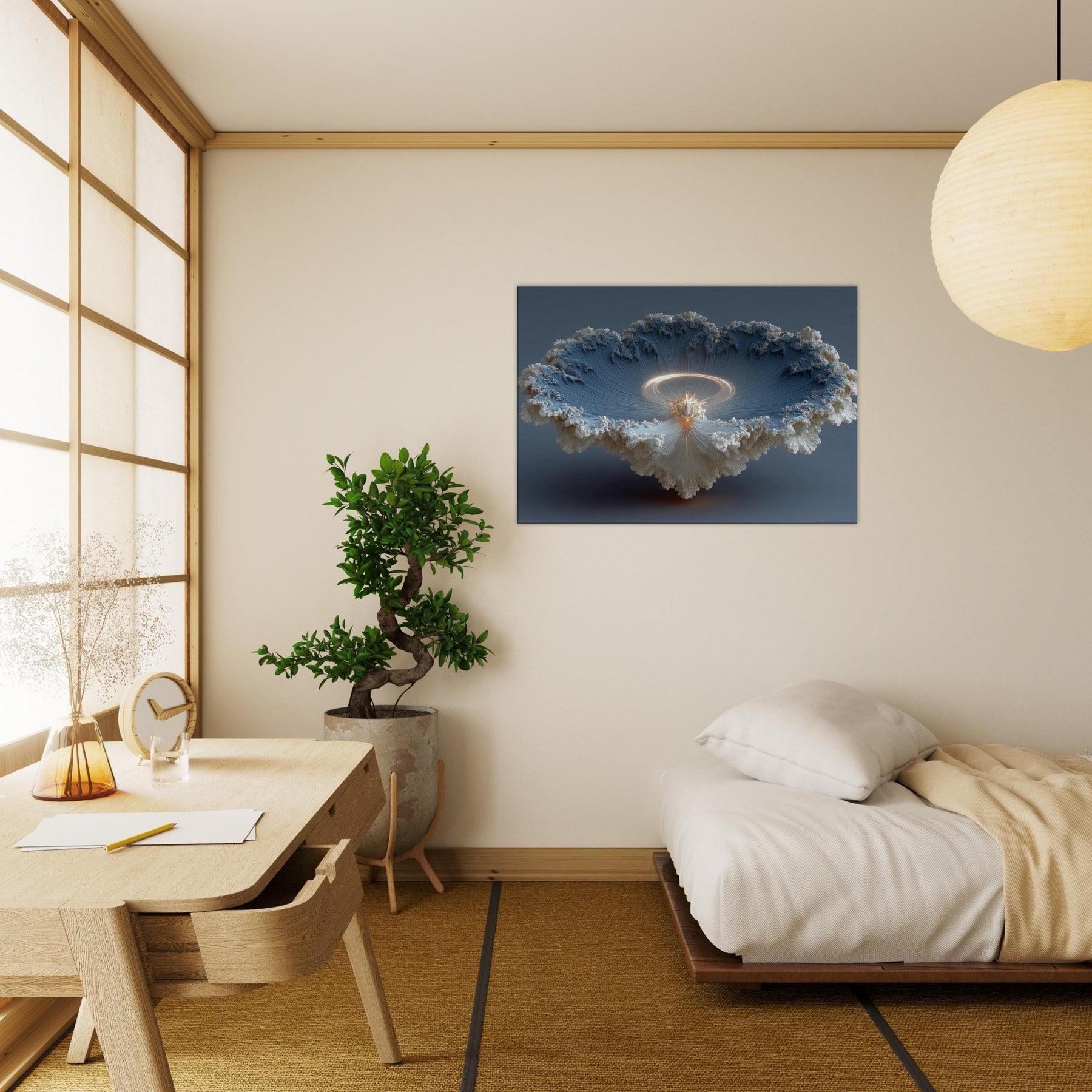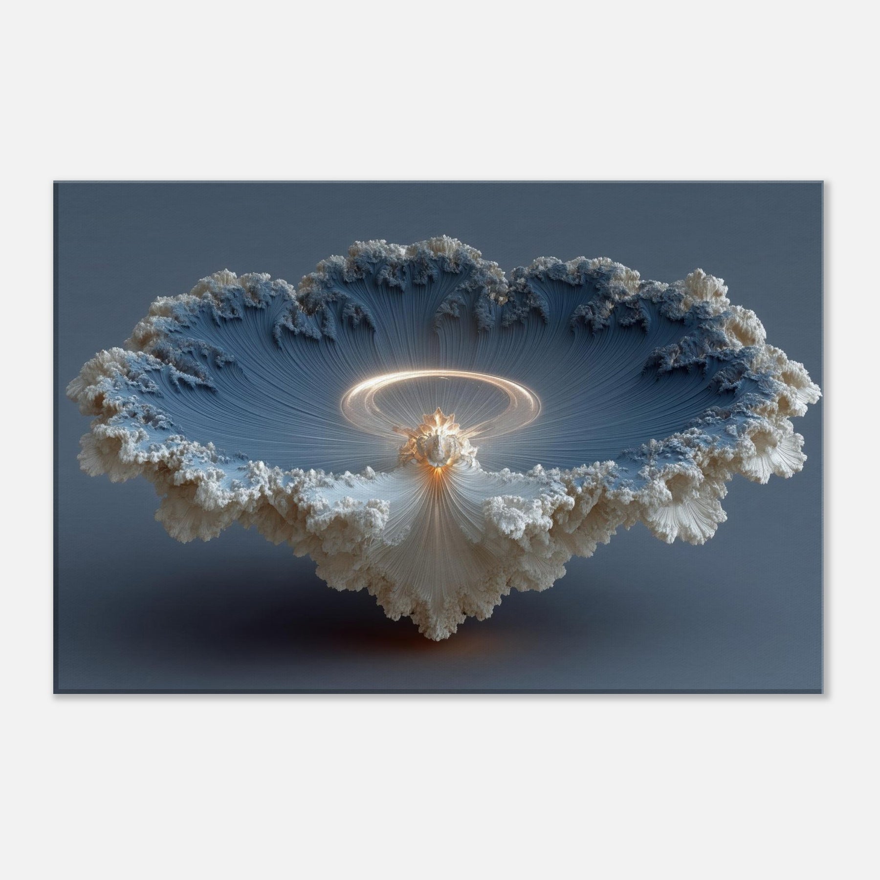 Robed in surreal light, this piece centers on a Bodhisattva, shimmering at the threshold between dream and waking life. The composition spirals into a luminous halo, as if time itself dissolves into quiet radiance, inviting stillness and contemplation. Soft, cloudlike textures cradle the figure, while delicate, threadlike ridges draw the eye toward a warm core of amber glow. In a living room or meditation nook, the artwork becomes a tranquil focal point whispering calm, inviting reflection, and transforming walls into a sanctuary of mystic serenity. The central subject is Bodhisattva (Abstract).