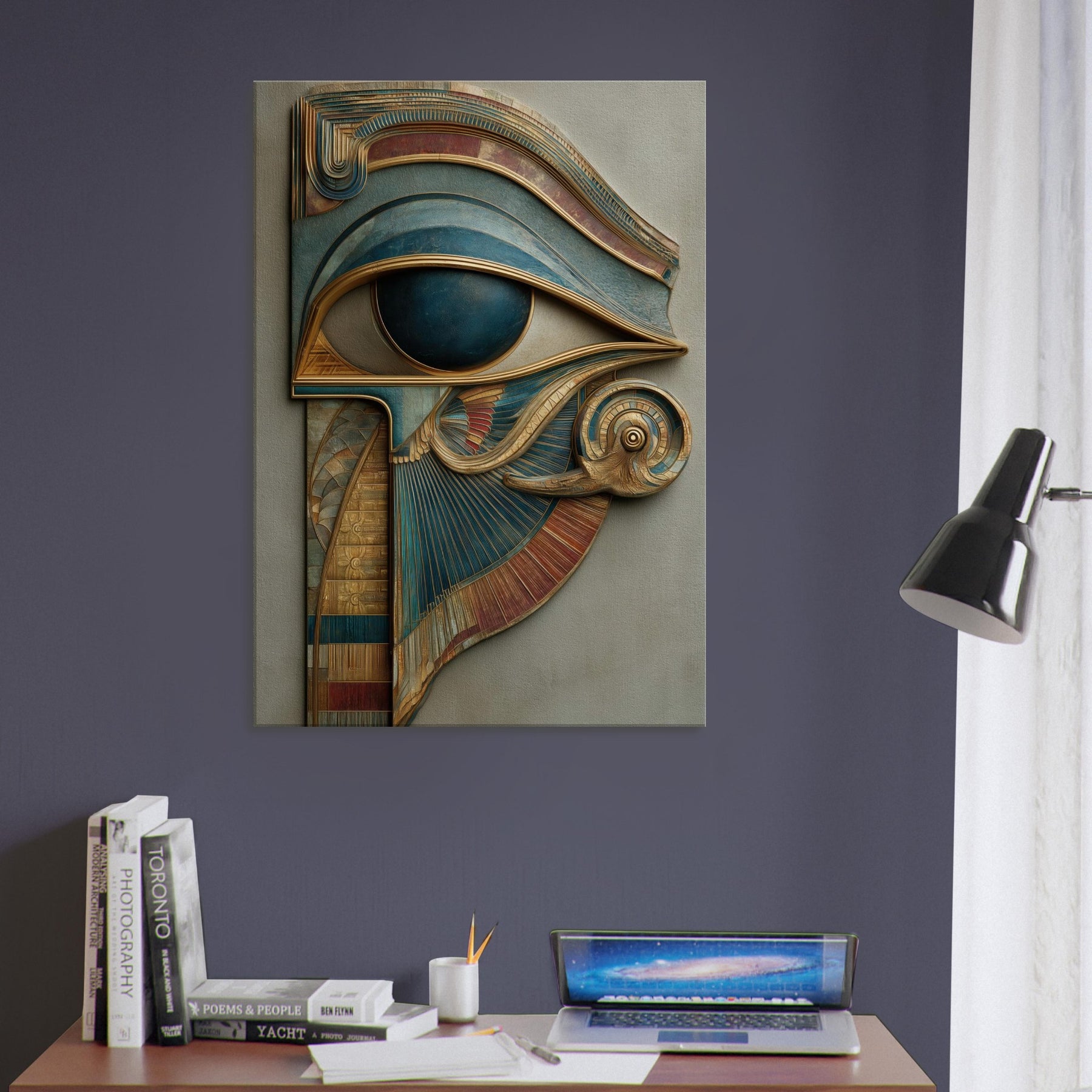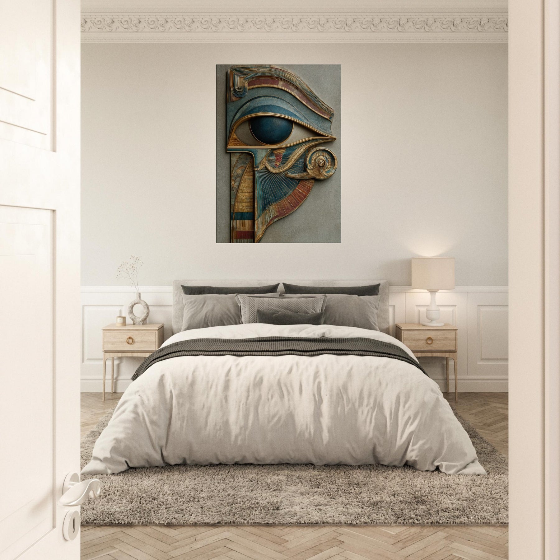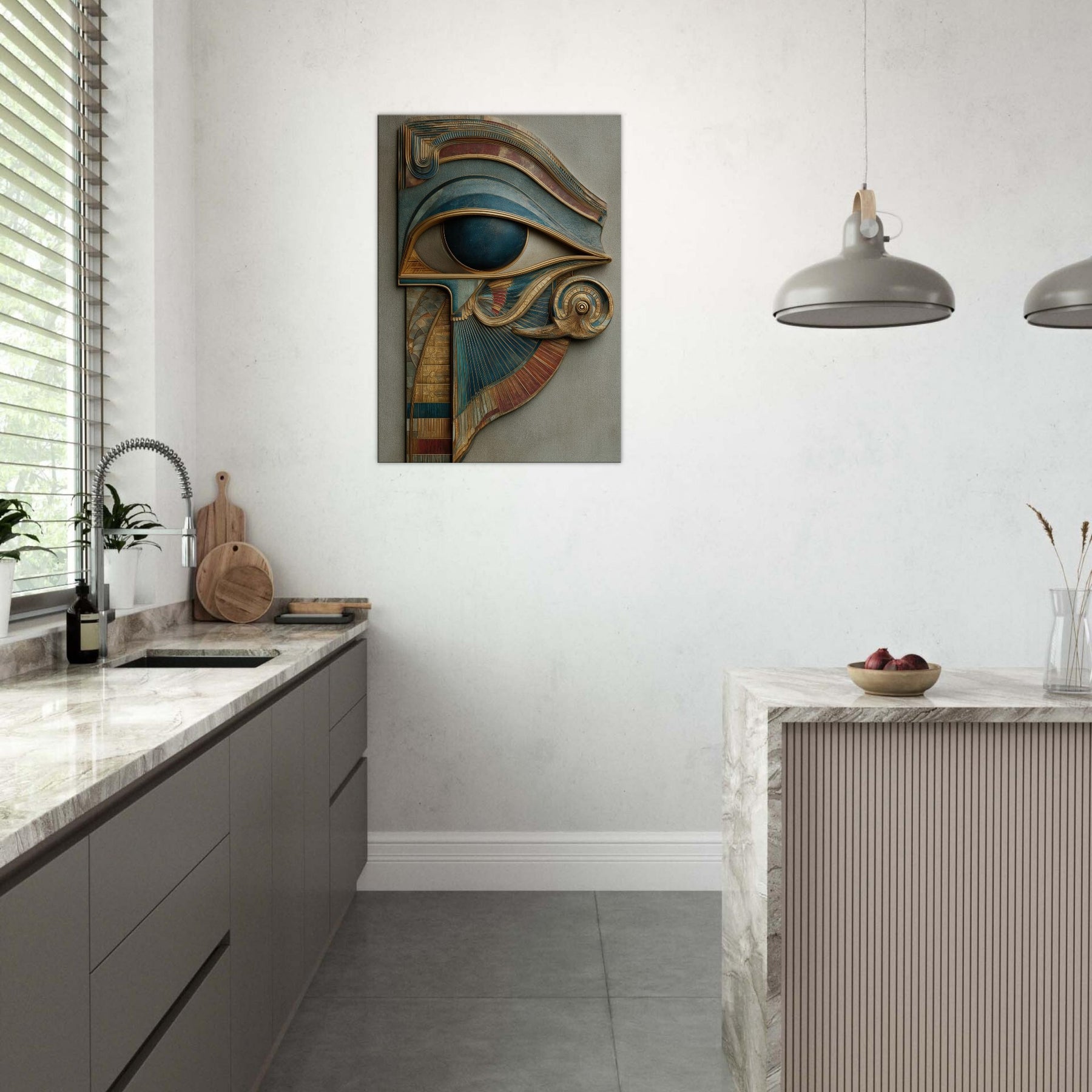 A sculpted dream that laces ancient mysticism with contemporary sensibility, this piece centers on the Eye of Horus as a living gateway rather than a distant emblem. Carved layers and metallic patinas curl and fold into a surreal crest, inviting the eye to travel along ridges of gold and teal as if tracing a whispered map. In a softly lit living room, its presence becomes a quiet oracle a protection and a reminder to see with intention, even in everyday moments.