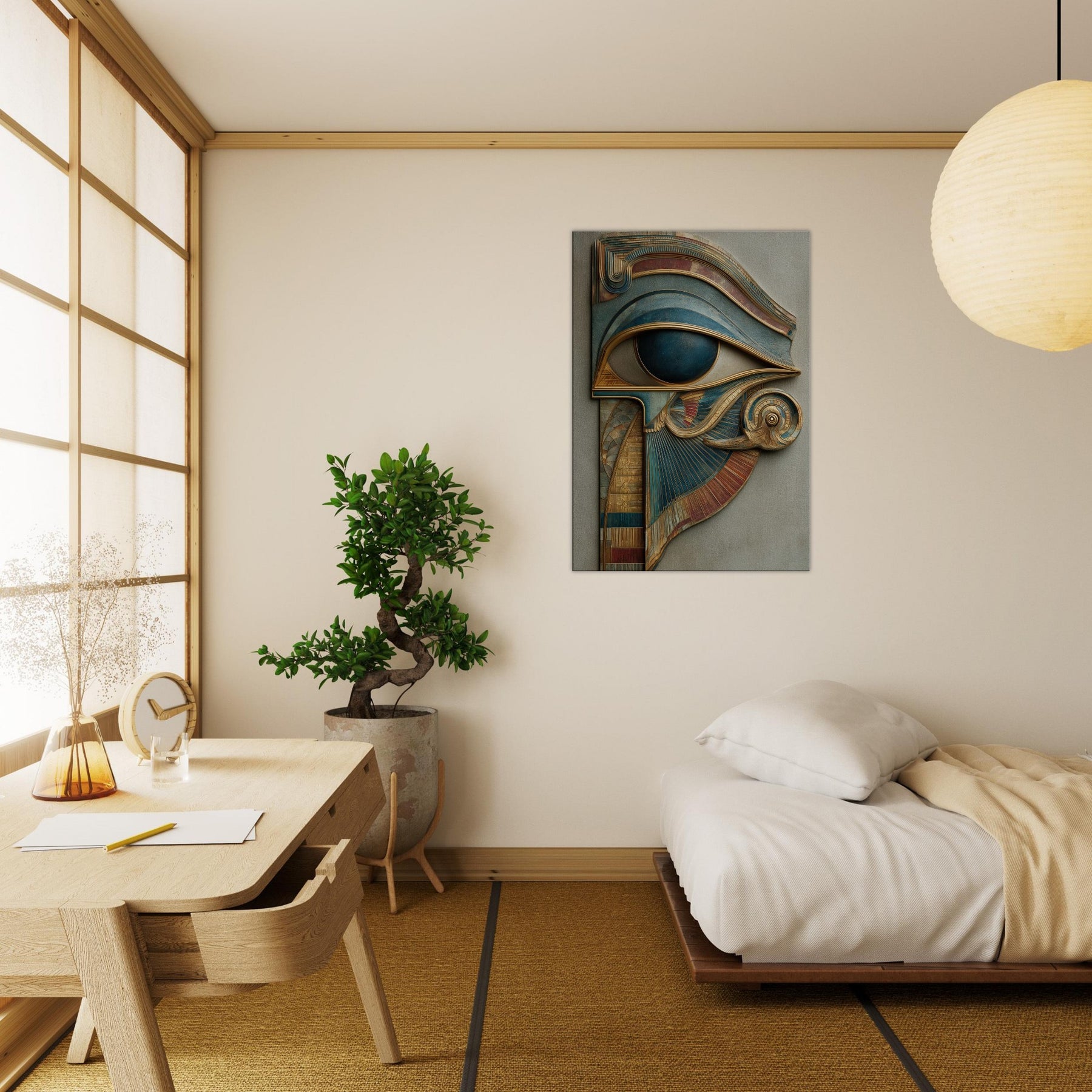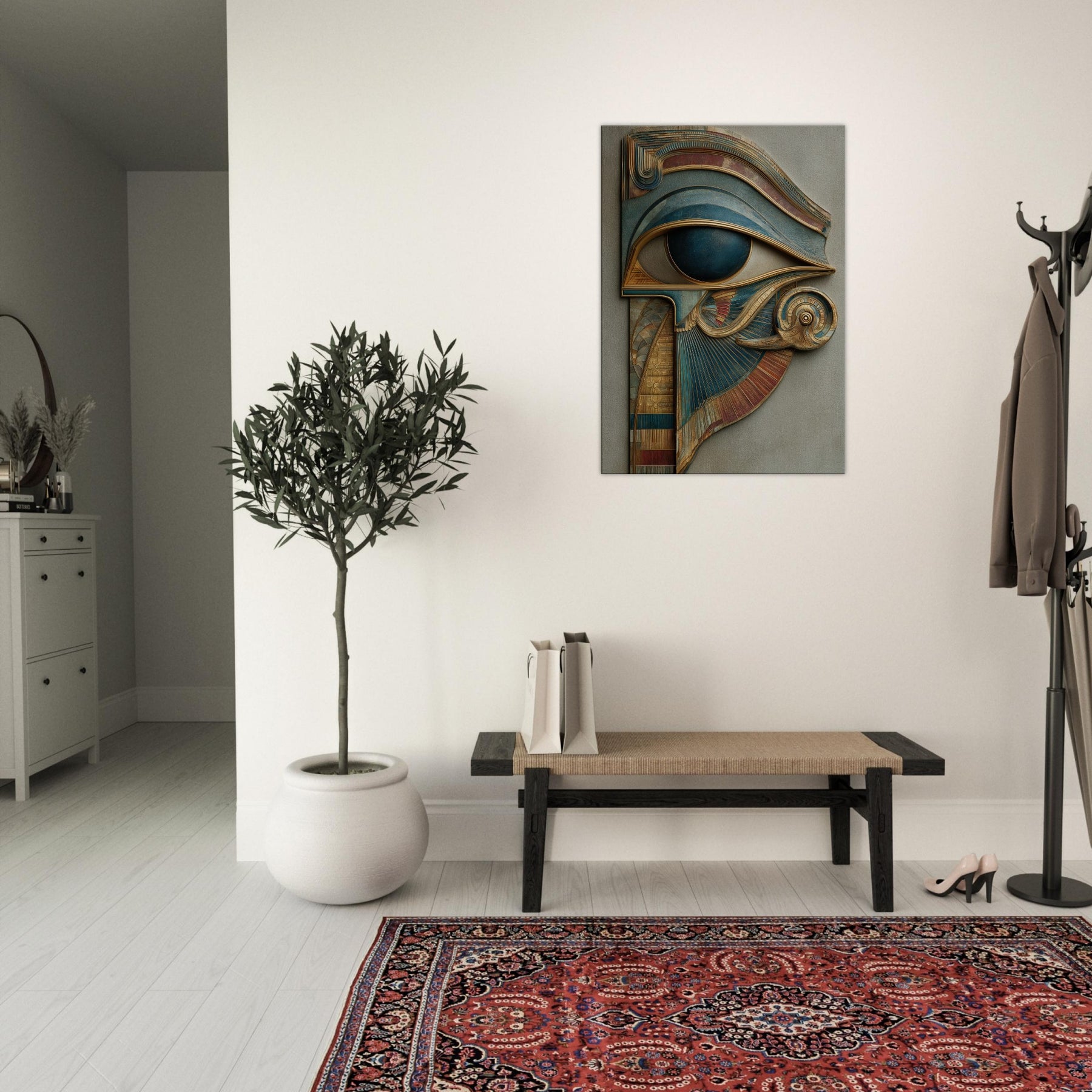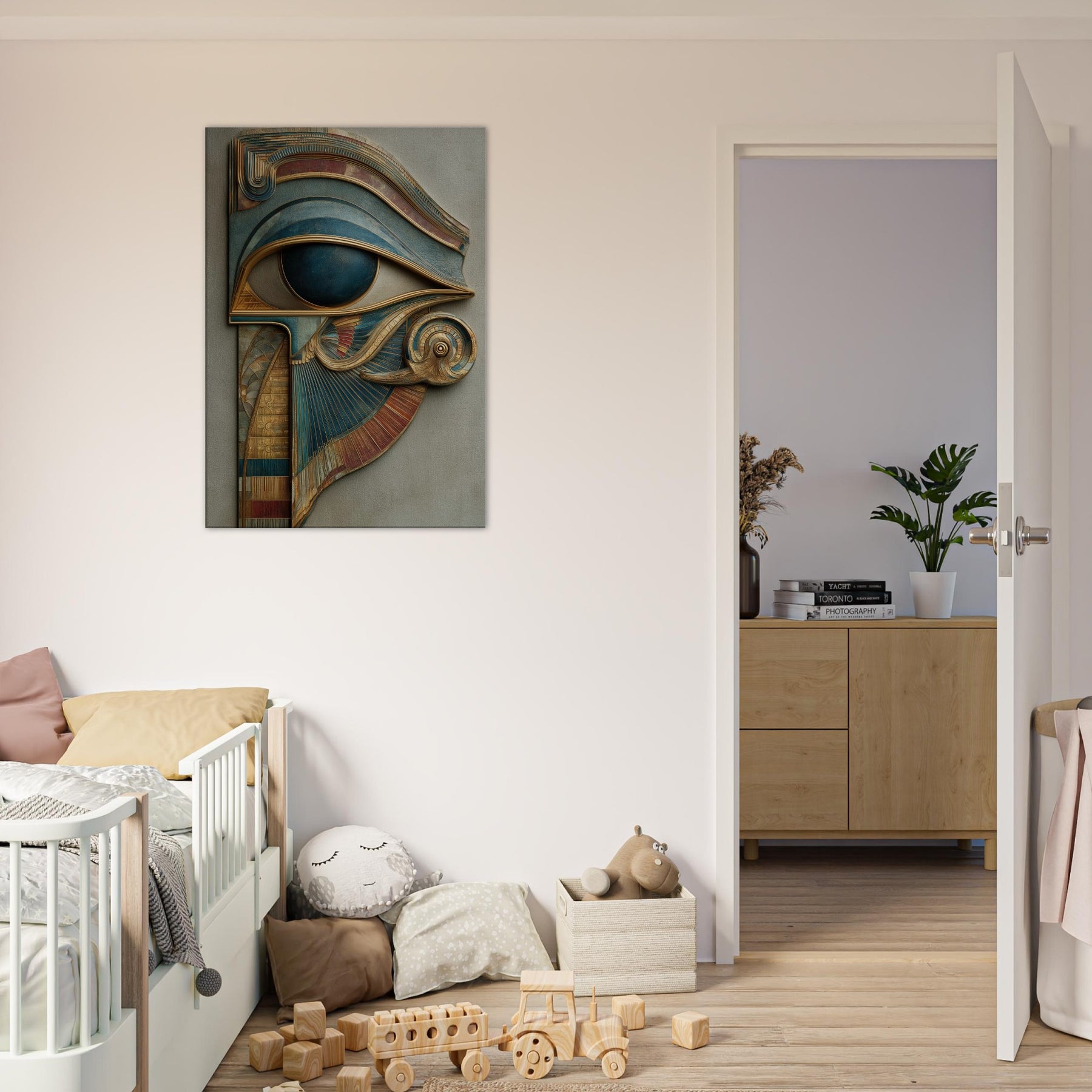 A sculpted dream that laces ancient mysticism with contemporary sensibility, this piece centers on the Eye of Horus as a living gateway rather than a distant emblem. Carved layers and metallic patinas curl and fold into a surreal crest, inviting the eye to travel along ridges of gold and teal as if tracing a whispered map. In a softly lit living room, its presence becomes a quiet oracle a protection and a reminder to see with intention, even in everyday moments.