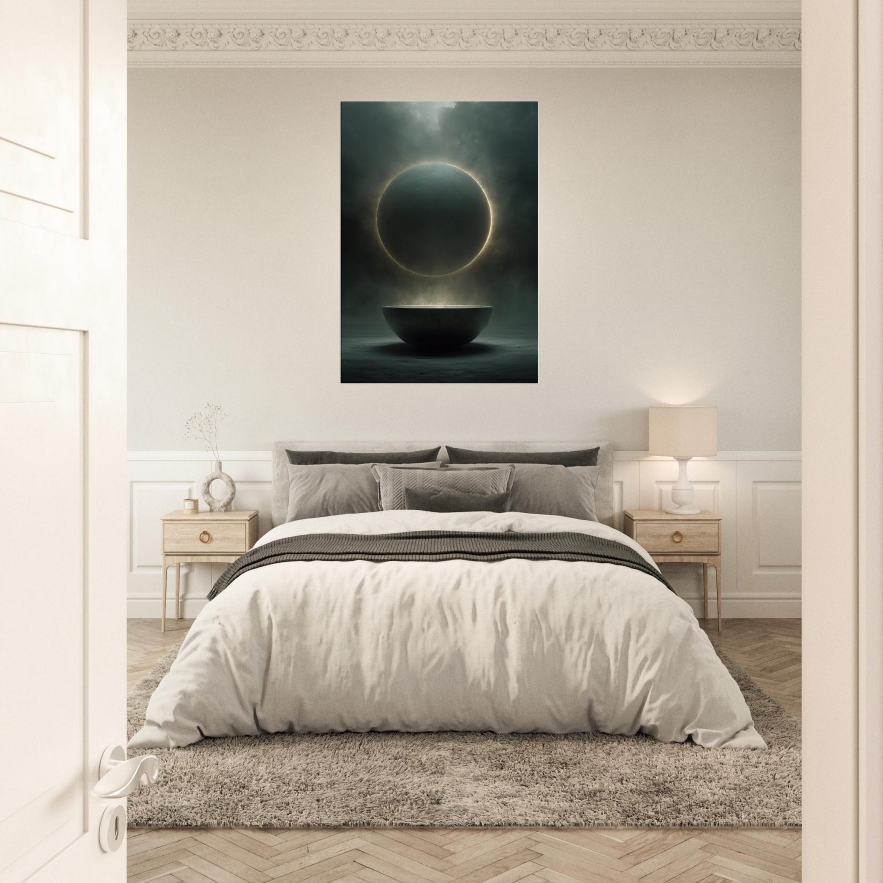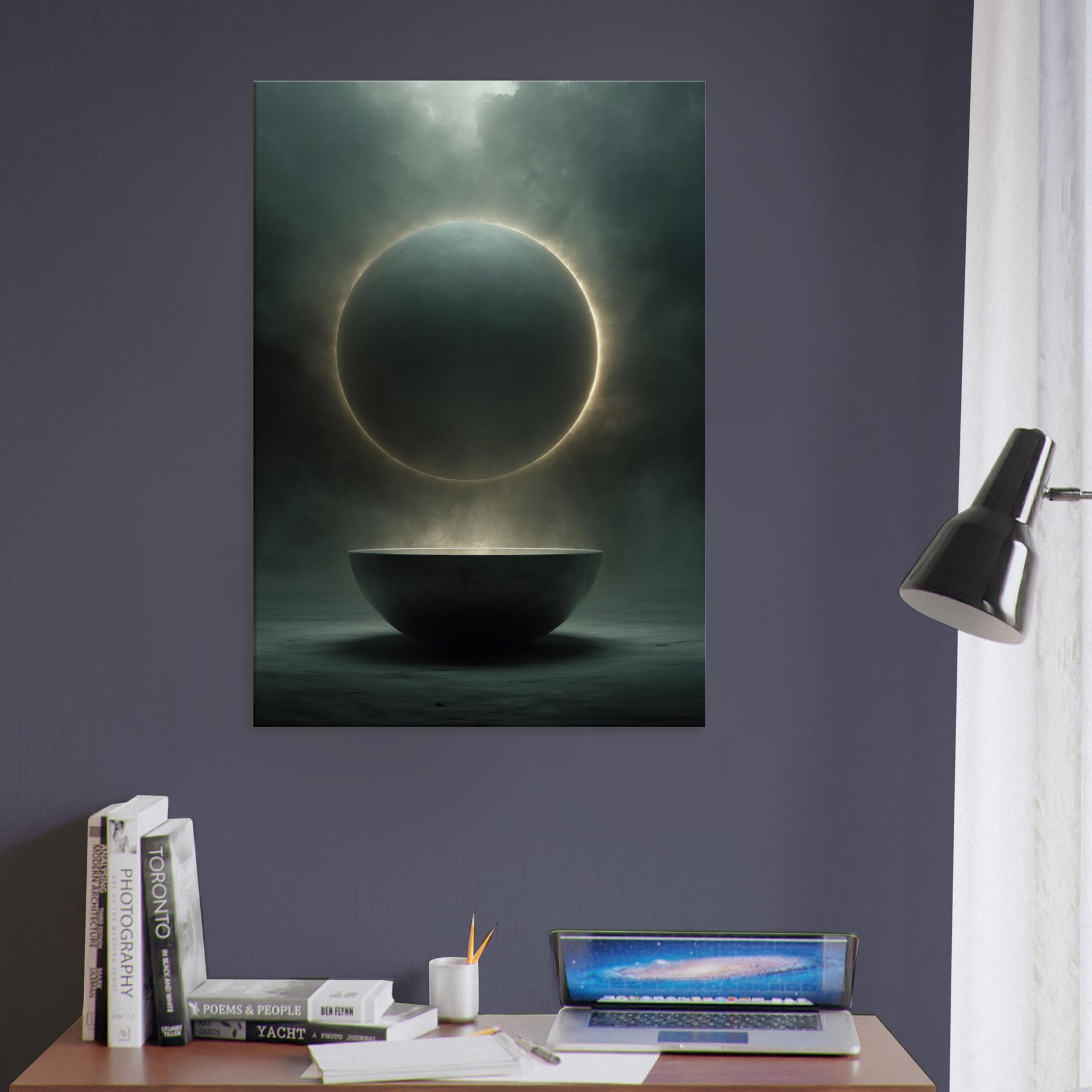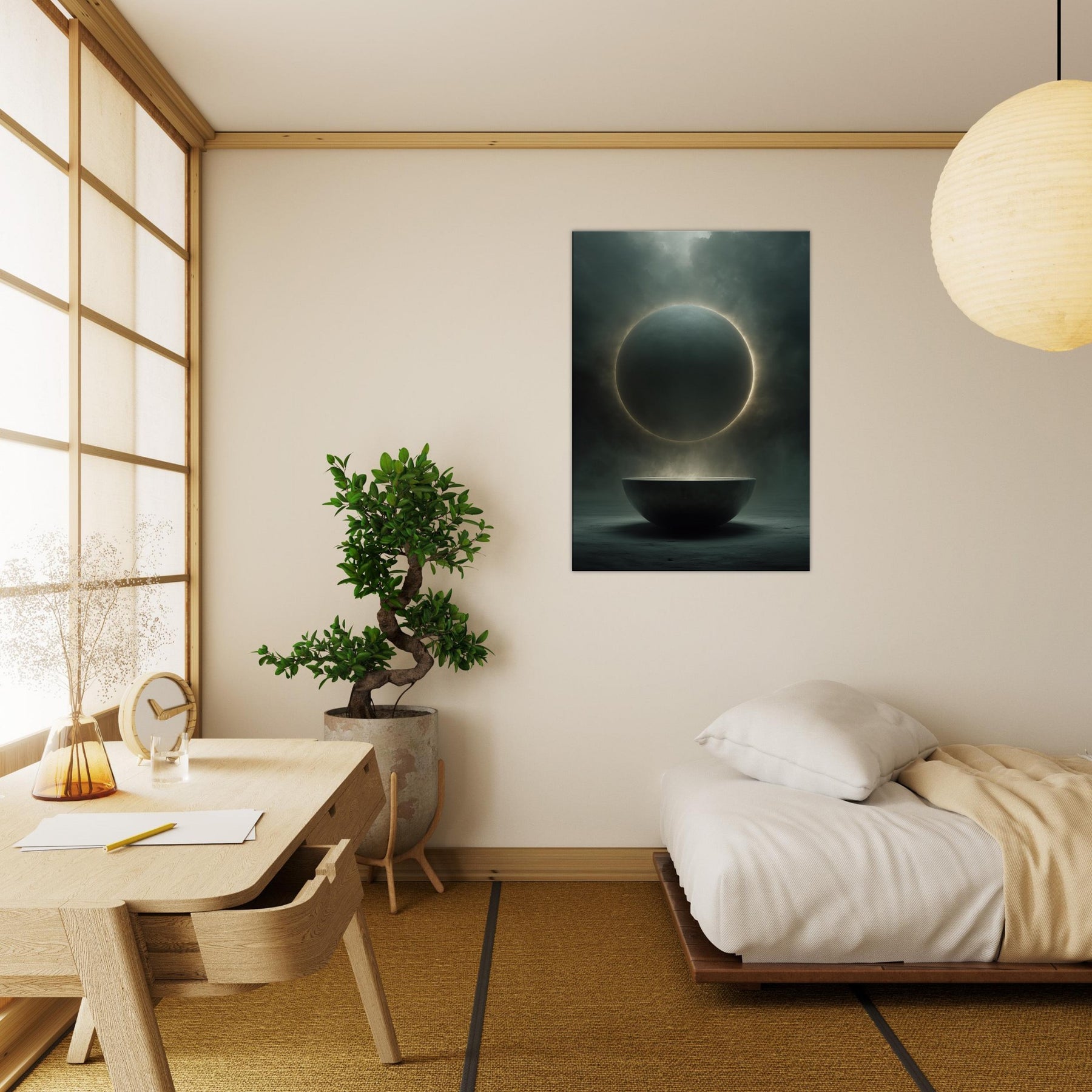 In this dreamlike moment, a Singing Bowl hovers above a quiet, brimmed bowl, a luminous ring tracing the air like a tidal breath. Surrounded by twilight fog, the halo glows with a warm, mineral light that slowly seeps into walls and air. The scene invites a hush to linger, turning a living room into a sanctuary and a hallway into a corridor of memory. This surreal piece awakens ritual stillness, pairing resonance with mystery to elevate everyday spaces into contemplative, sacred spaces.