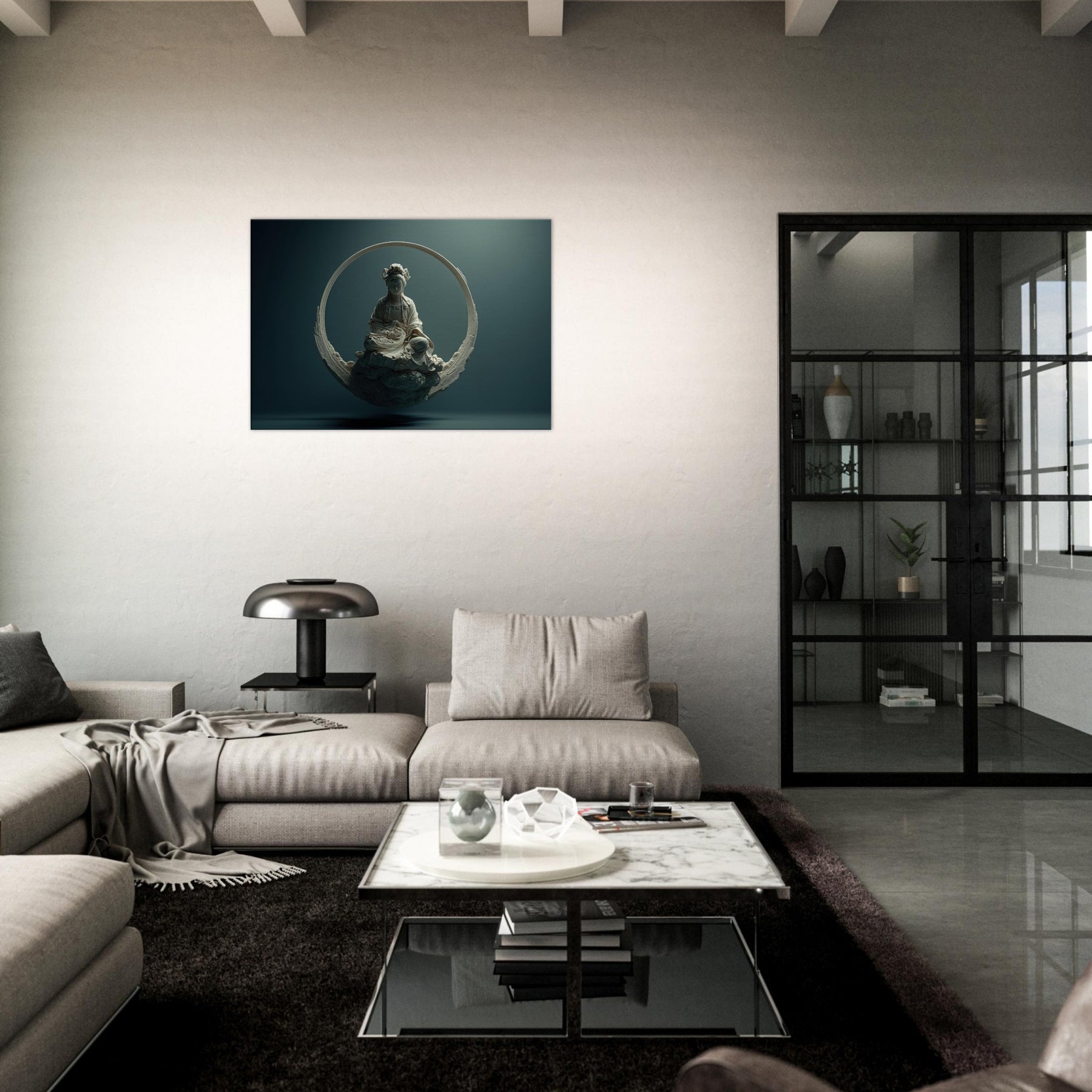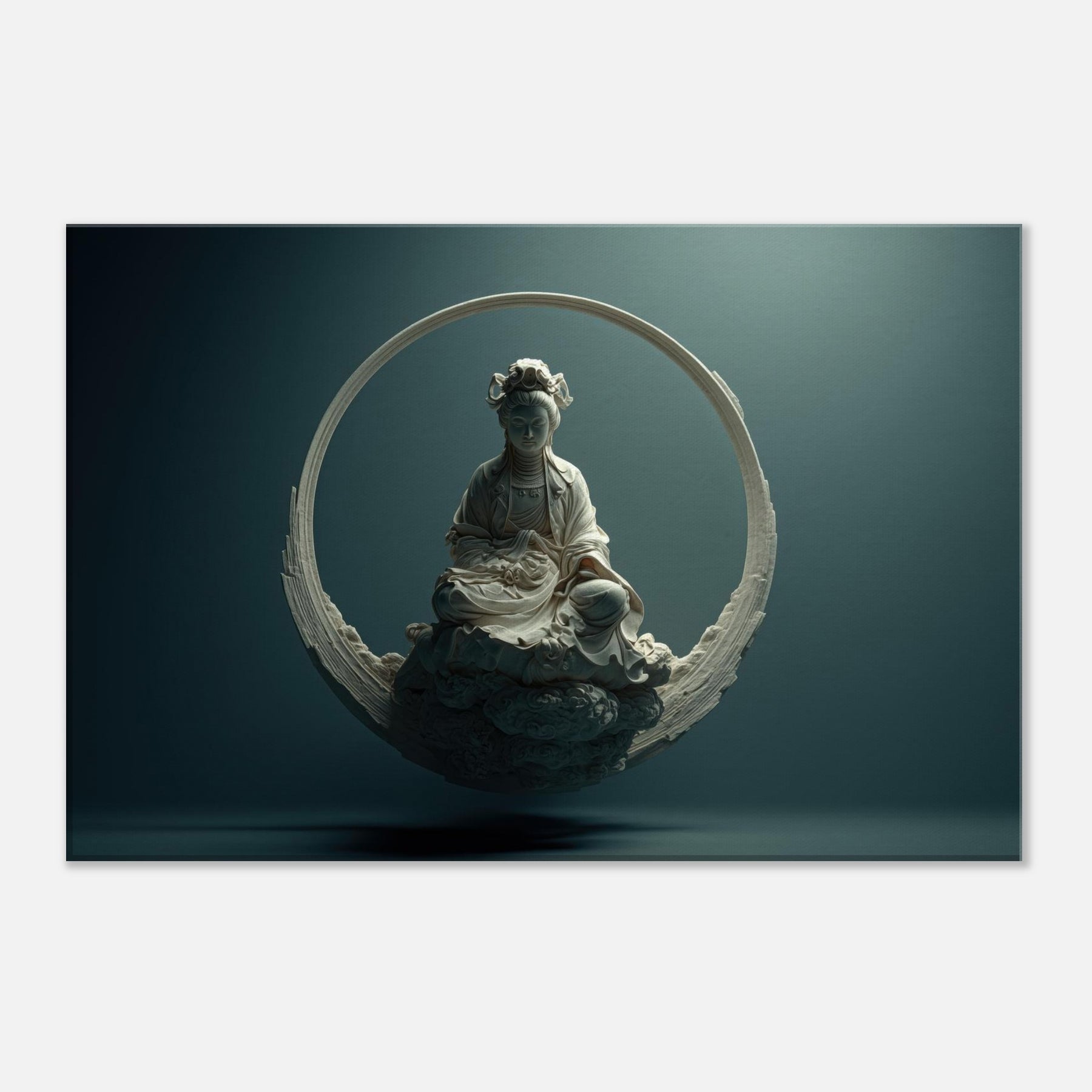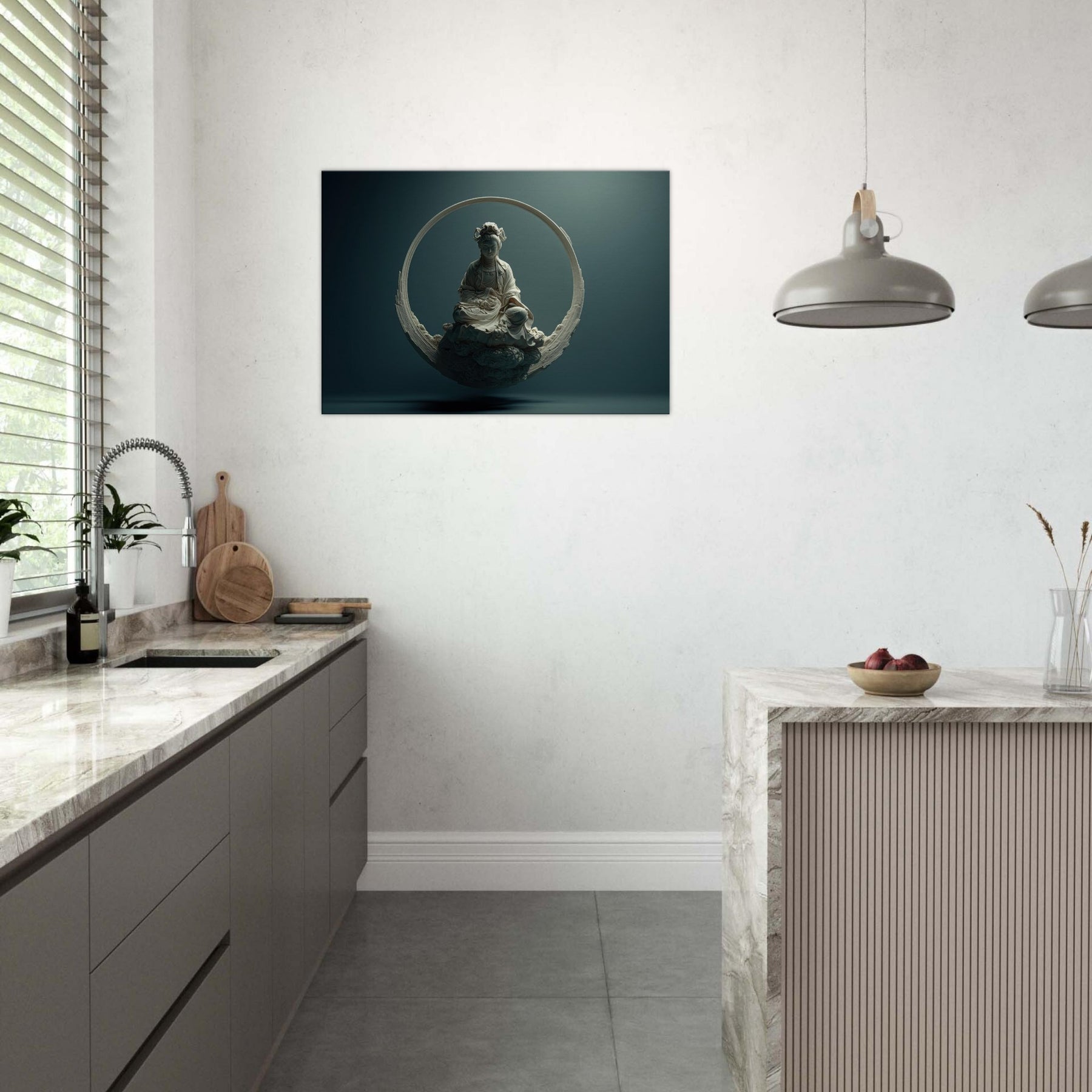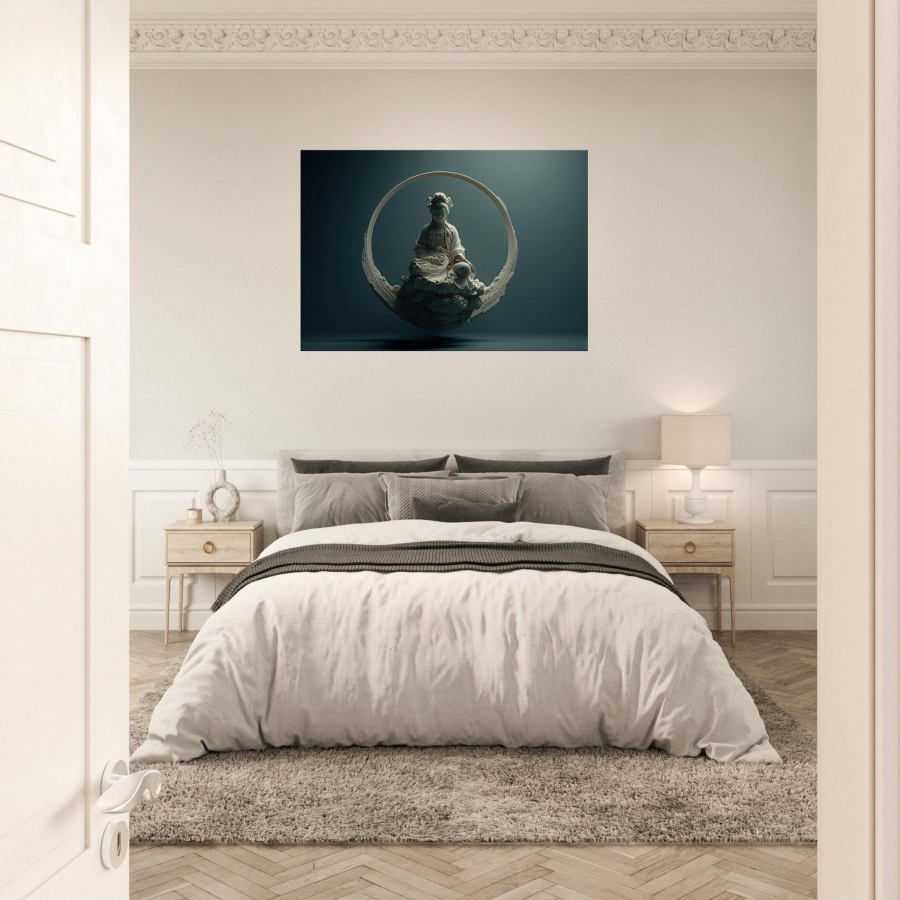 Within a suspended circle, Kuan Yin (Guanyin) rests in serene repose, a mystical beacon that merges porcelain stillness with dream like motion. The Surreal composition folds wind and water into her draped robes, inviting quiet reflection and gentle reverence. Soft, muted tones glow like candlelight, turning any living space into a sanctuary of presence. This piece whispers compassion into the room, elevating atmosphere, inviting slow breaths, and sparking introspection as art becomes a doorway to grace.