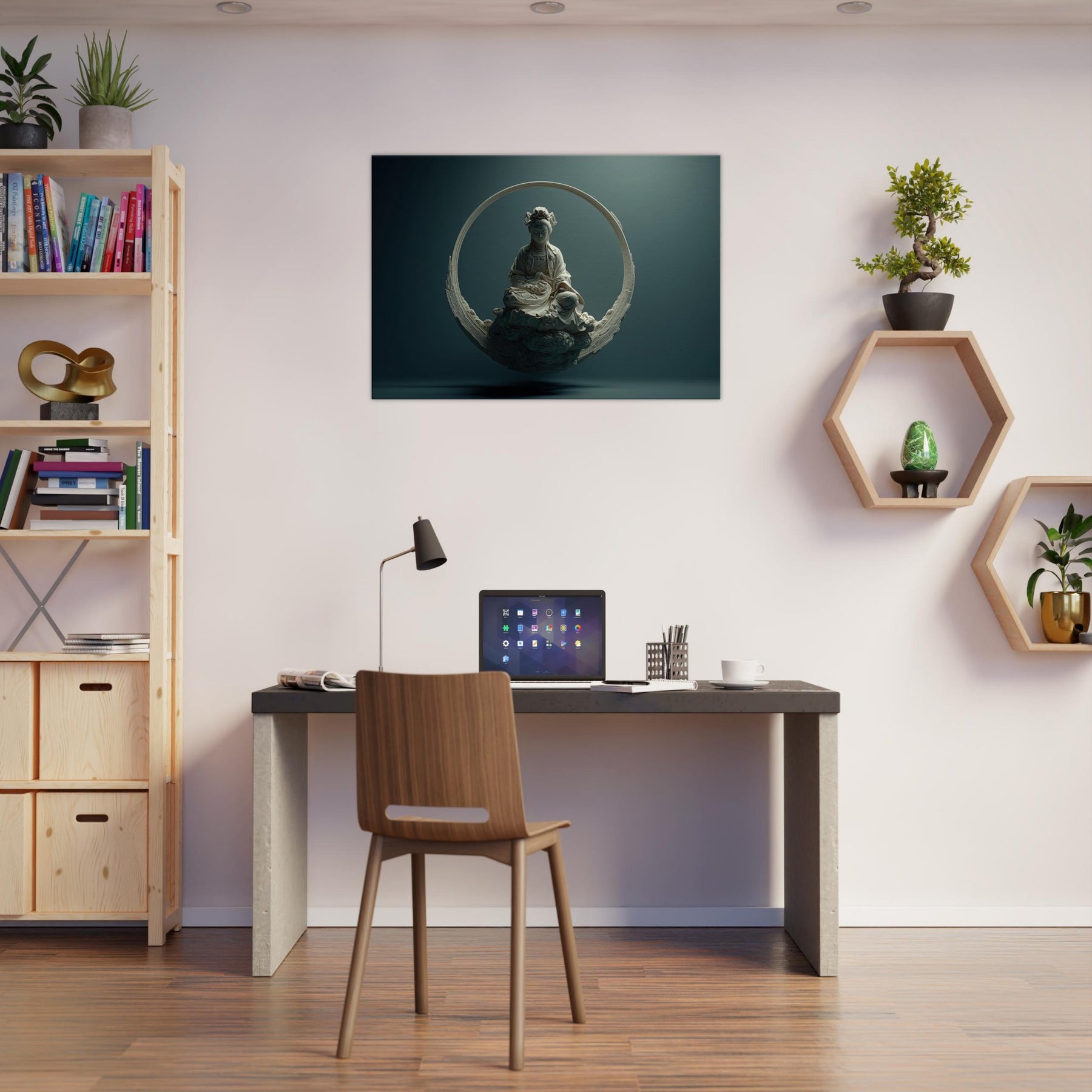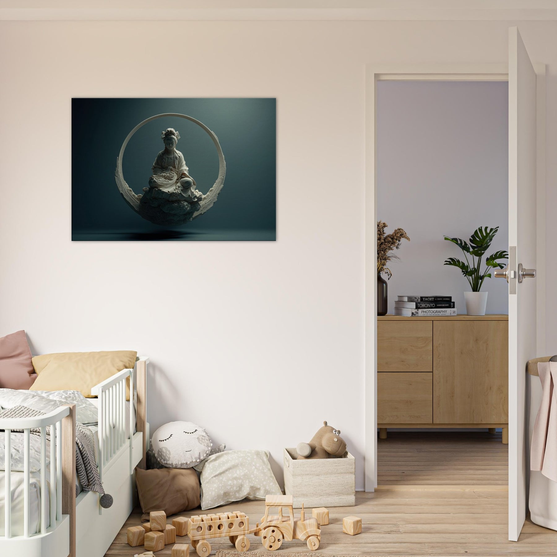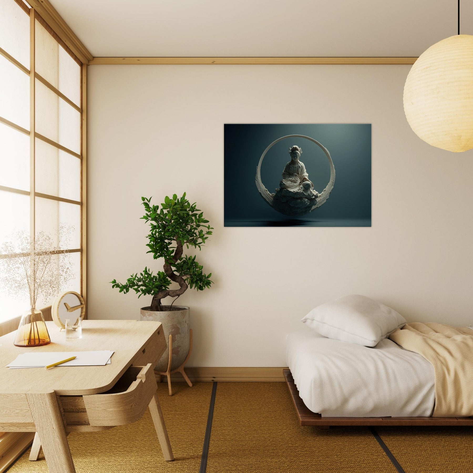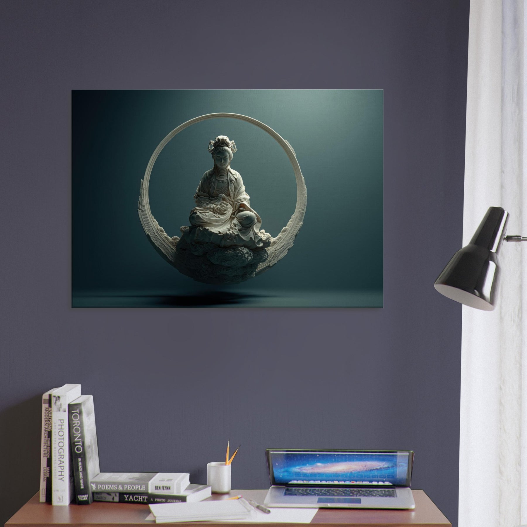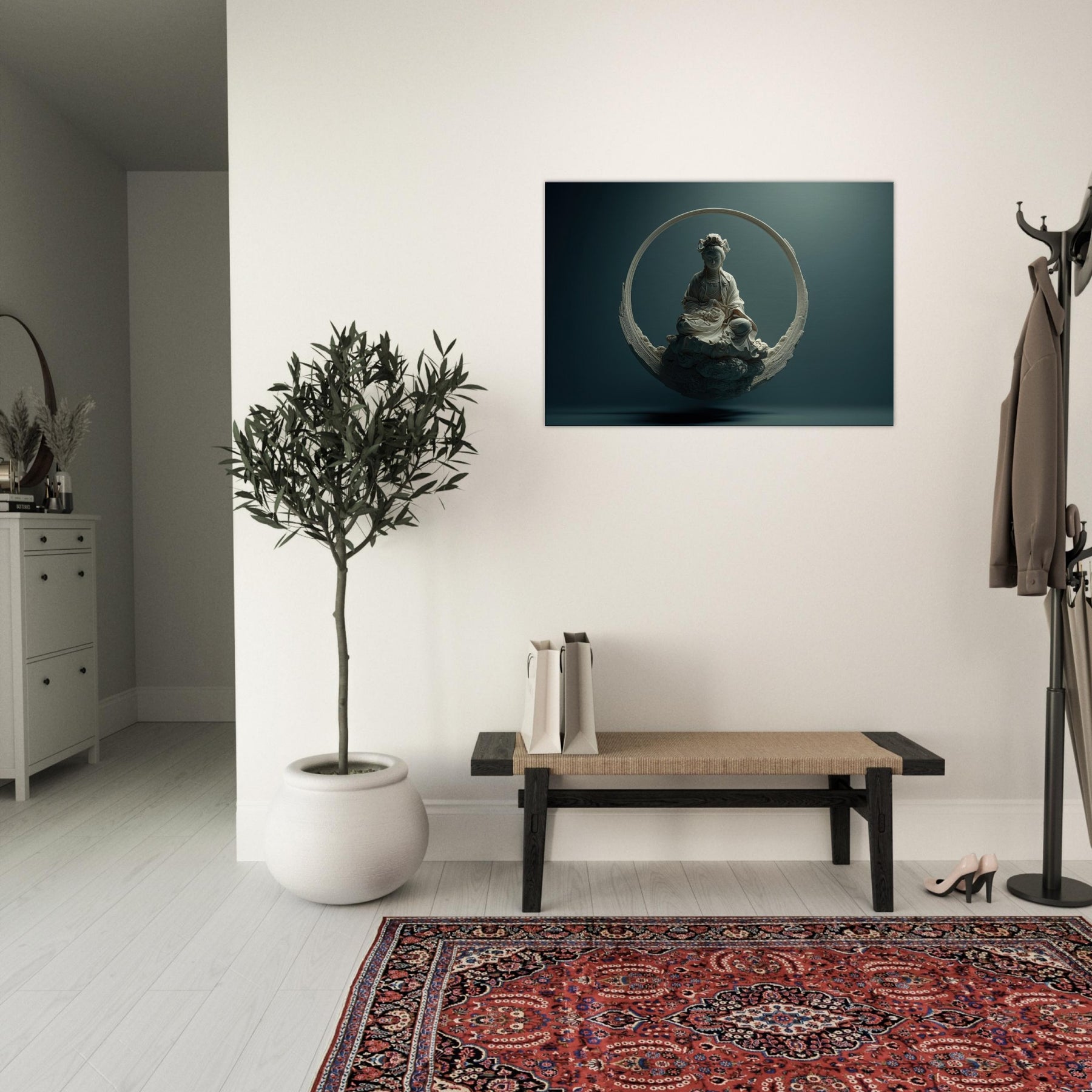 Within a suspended circle, Kuan Yin (Guanyin) rests in serene repose, a mystical beacon that merges porcelain stillness with dream like motion. The Surreal composition folds wind and water into her draped robes, inviting quiet reflection and gentle reverence. Soft, muted tones glow like candlelight, turning any living space into a sanctuary of presence. This piece whispers compassion into the room, elevating atmosphere, inviting slow breaths, and sparking introspection as art becomes a doorway to grace.