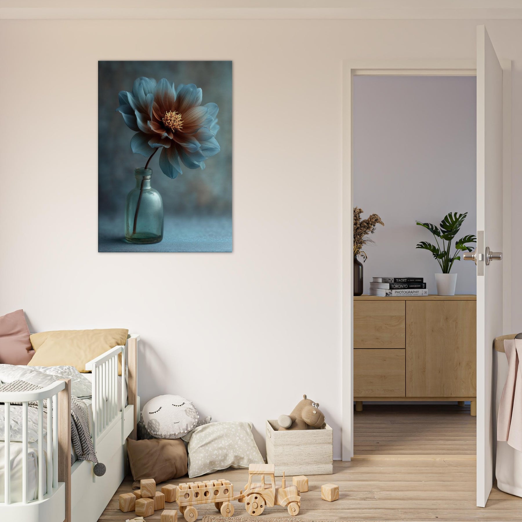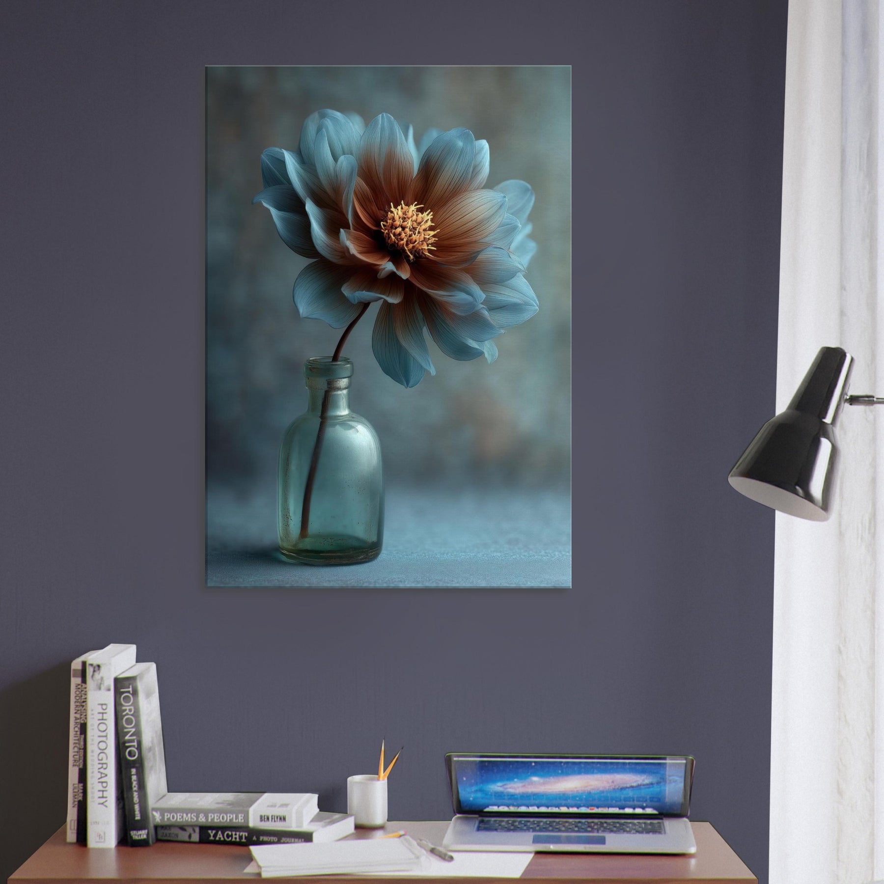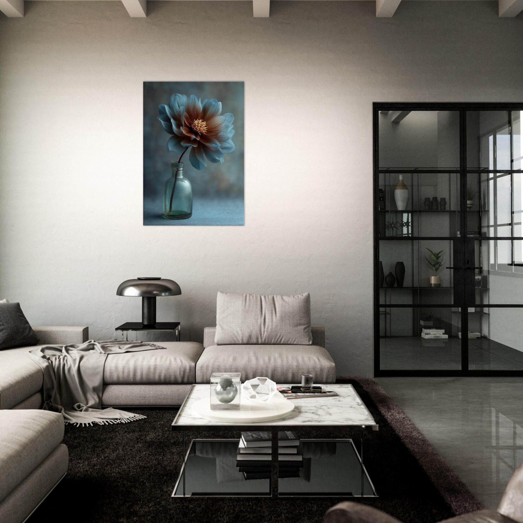 Single Flower in Vase blooms within a glass bottle, a dreamlike presence that shifts light and mood rather than form. Surrealized by teal tones and copper highlights, the petals curl like a whispered secret, inviting you to linger. The scene radiates calm, a soft glow that enhances a living room with intimate texture and quiet drama. It turns daily space into a contemplative refuge, where emotion and memory unfurl with every glance, and ordinary corners become portals to wonder.