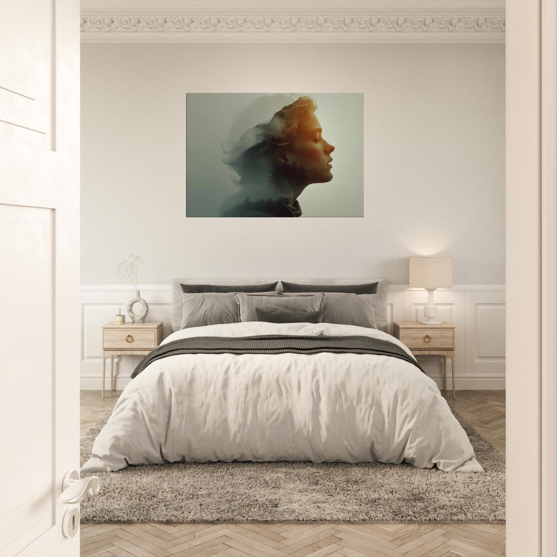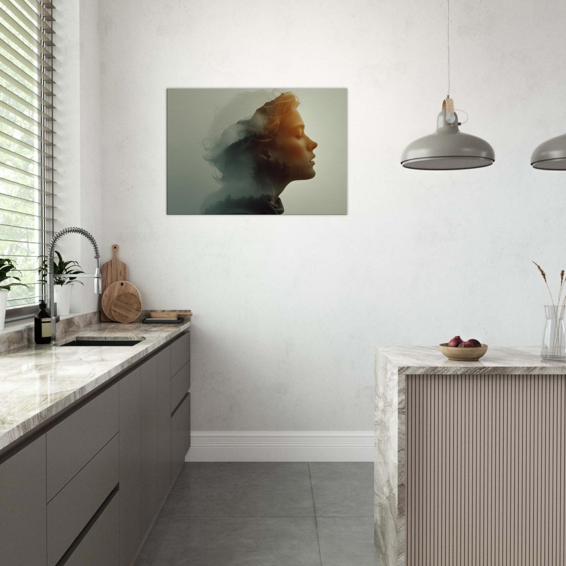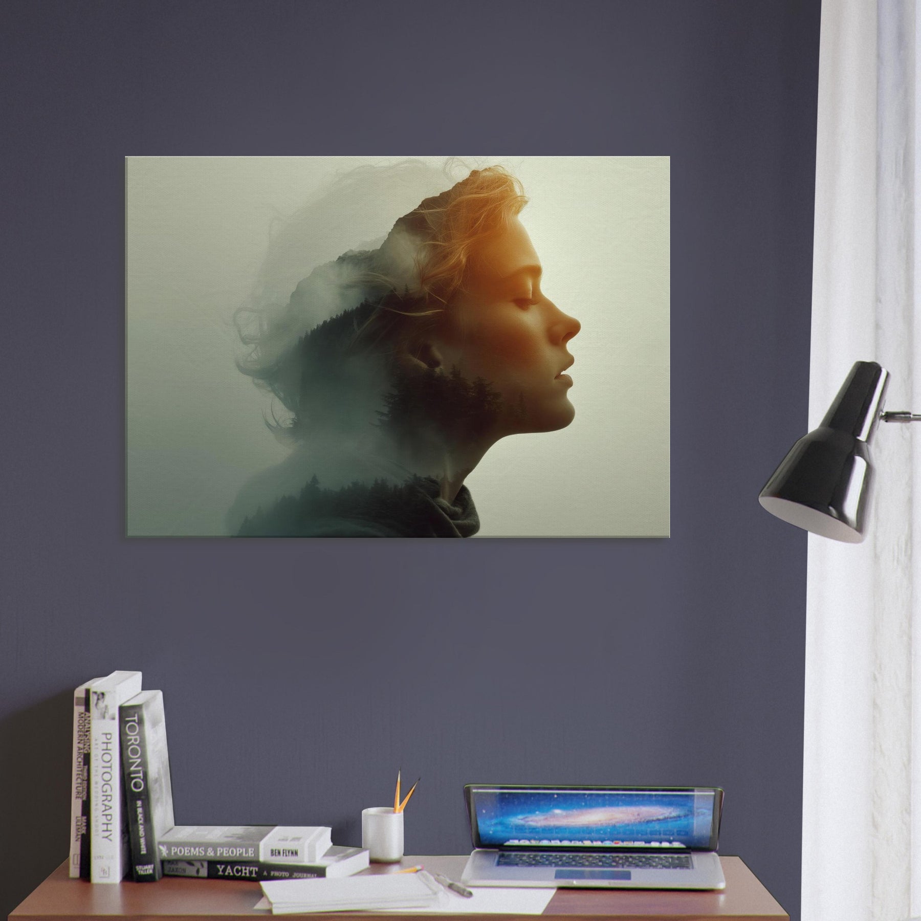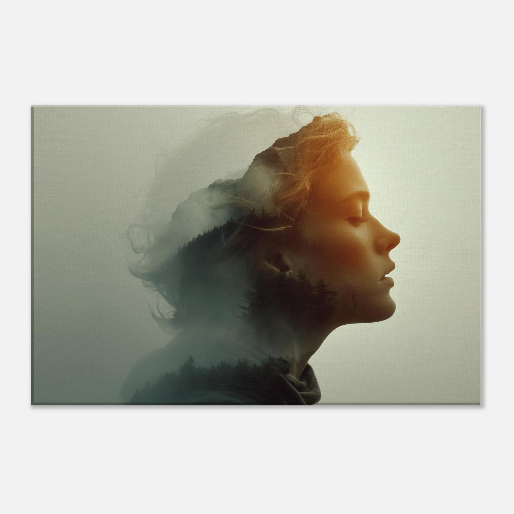 Echoes of a Color Field dissolves the boundary between and . A serene profile is bathed in soft amber light while a forested hillside glides across the cheek and neck, like a memory surfacing from a mist. The surreal double exposure invites quiet contemplation, turning a blank wall into a window of mood calm, mysterious, and warmly luminous. Perfect for a living room or bedroom, it creates a focal point that softens furnishings and invites a slower, more legible pace for daily life.