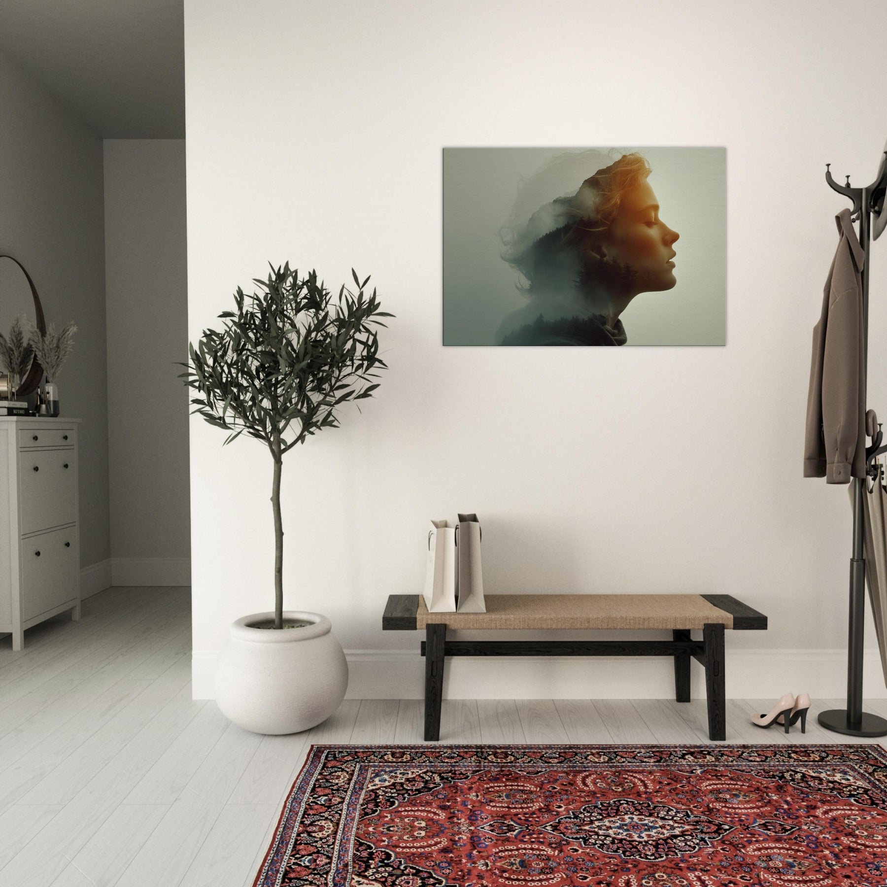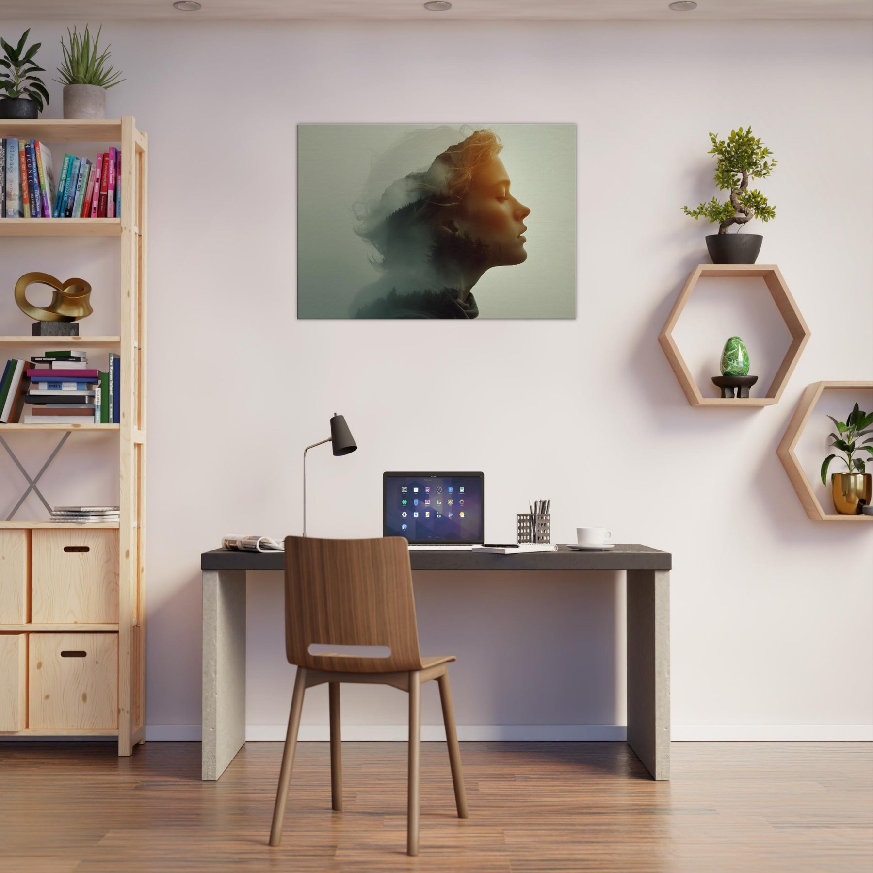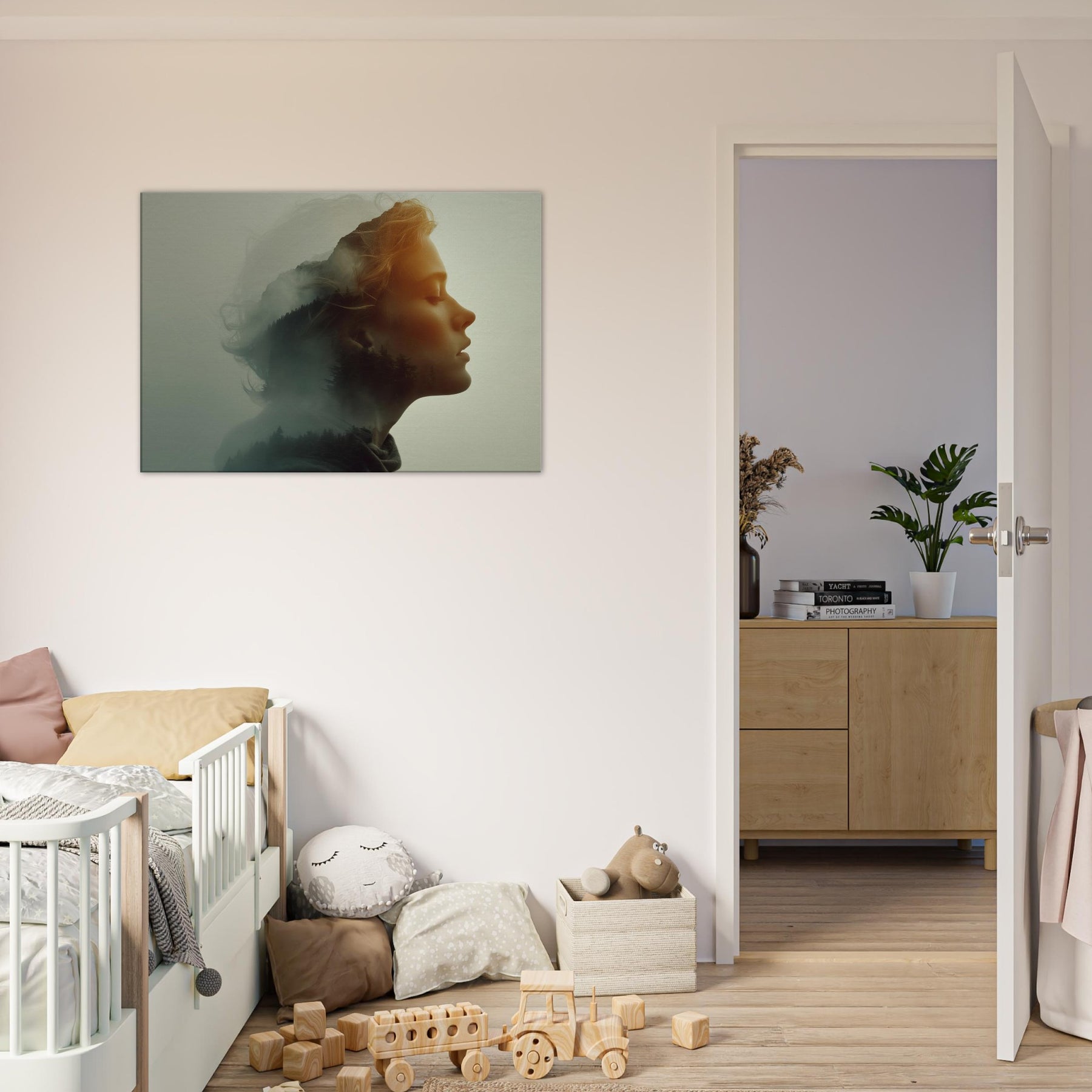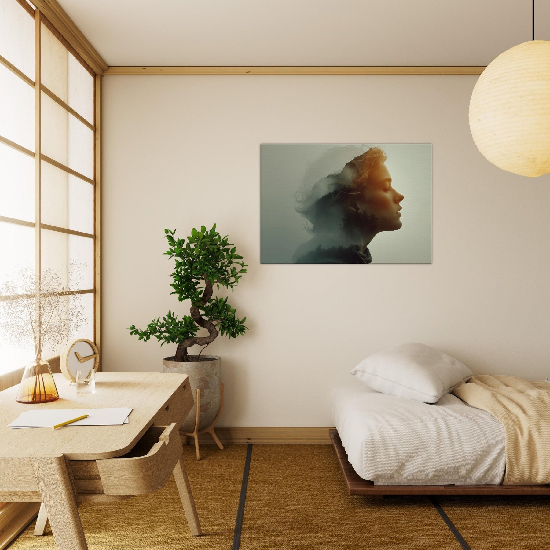 Echoes of a Color Field dissolves the boundary between and . A serene profile is bathed in soft amber light while a forested hillside glides across the cheek and neck, like a memory surfacing from a mist. The surreal double exposure invites quiet contemplation, turning a blank wall into a window of mood calm, mysterious, and warmly luminous. Perfect for a living room or bedroom, it creates a focal point that softens furnishings and invites a slower, more legible pace for daily life.