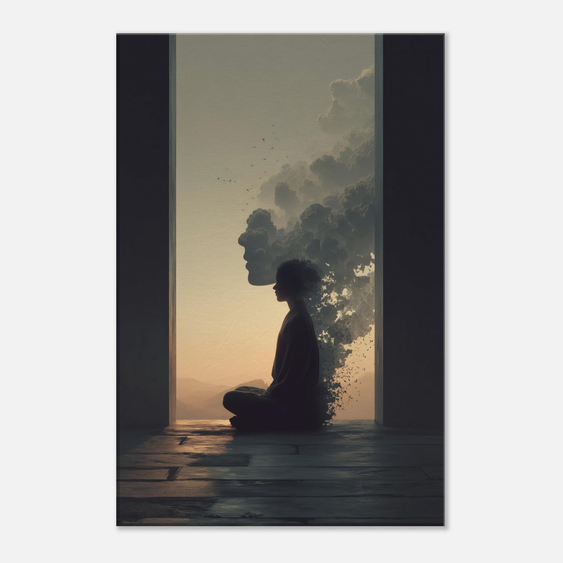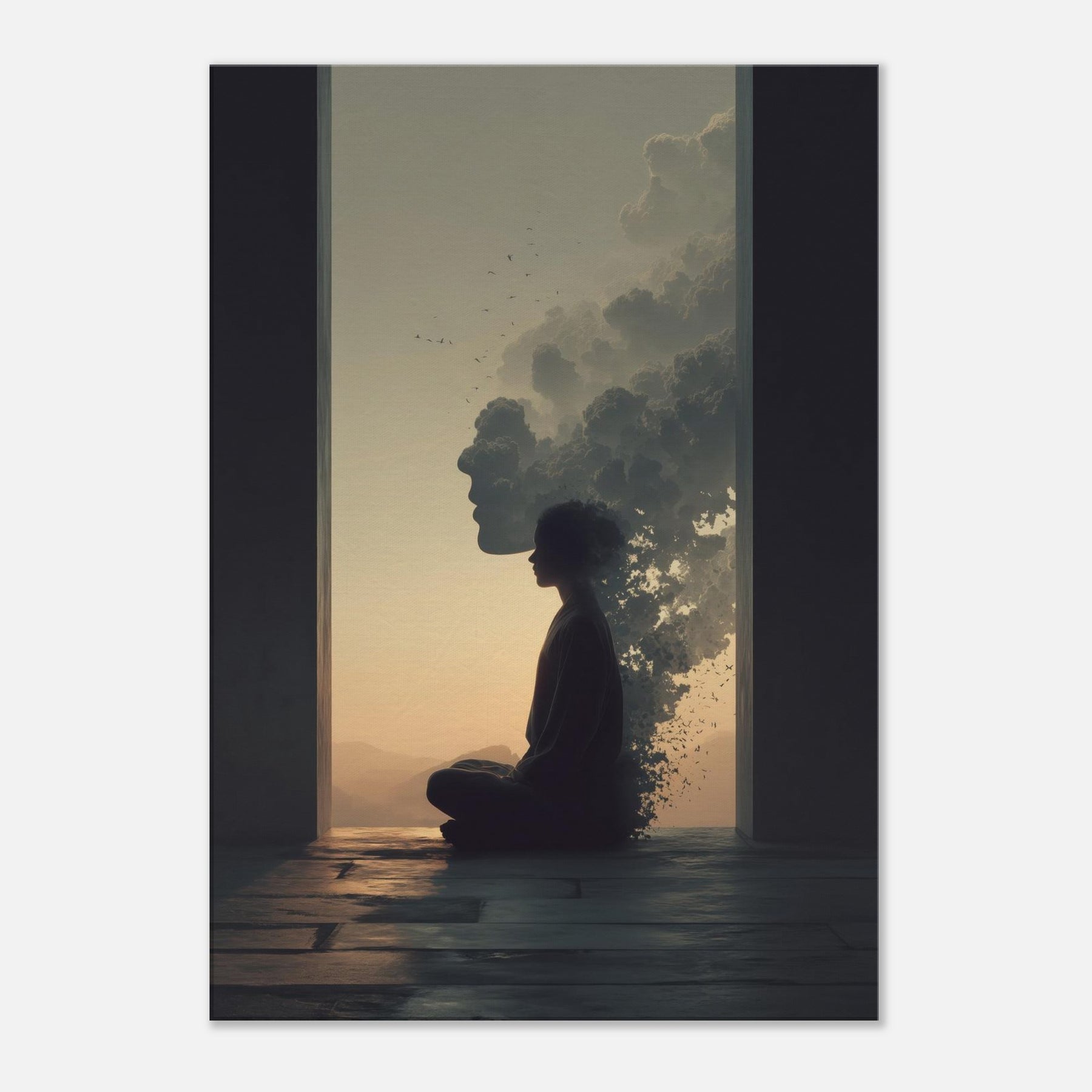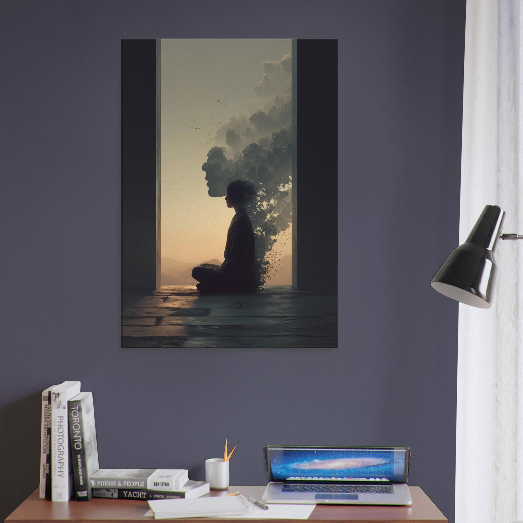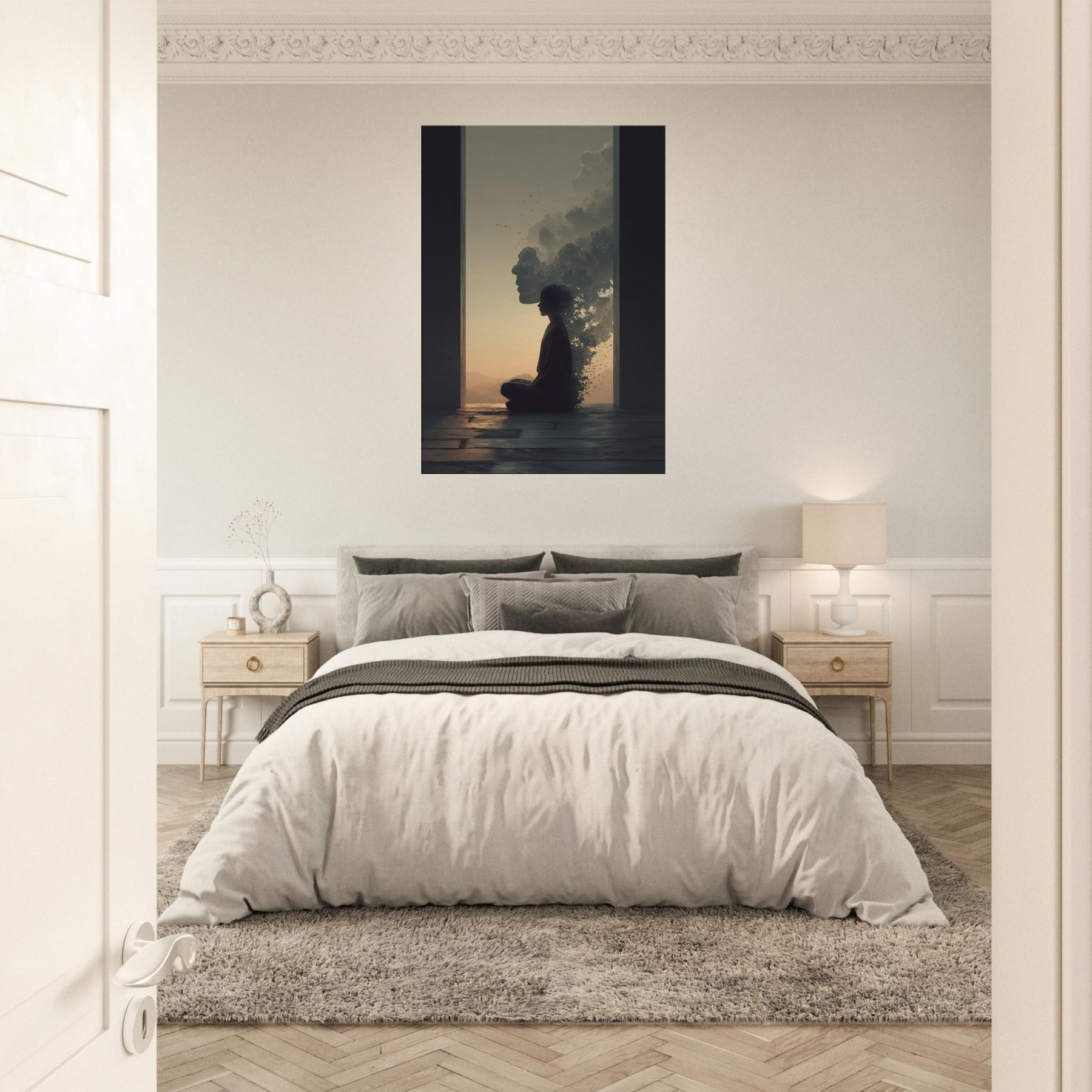 In this surreal meditation, the Yoga Lotus Pose becomes a gateway between breath and dream. A slender silhouette kneels at the threshold as a luminous cloud form of faces rises behind, turning stillness into a living . The soft twilight palette and hazy light invite quiet reflection, making the room feel suspended between dawn and infinity. Hang this artwork where you seek calm and becoming; it nourishes focus, heightens atmosphere, and lends a cinematic, otherworldly presence to everyday space.
