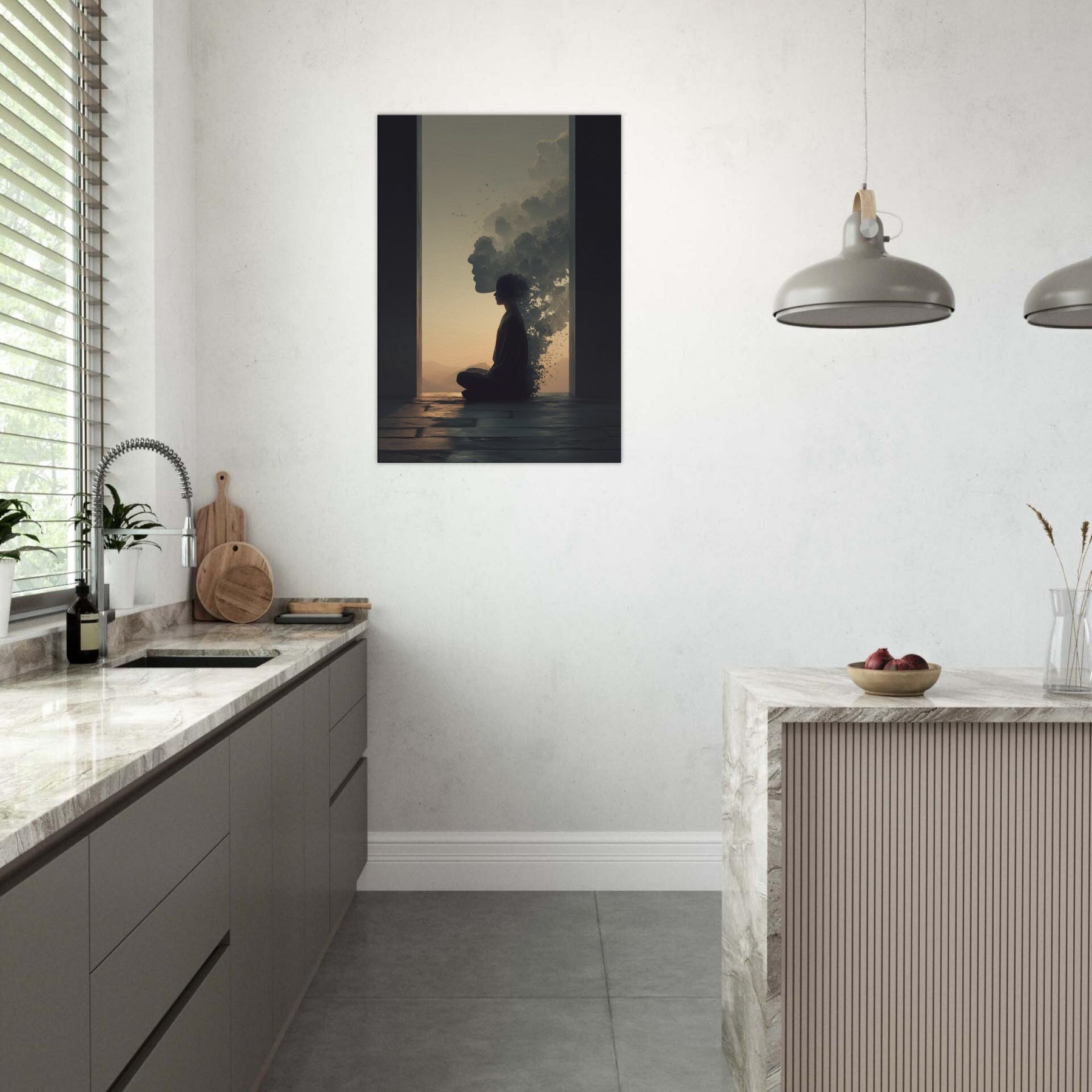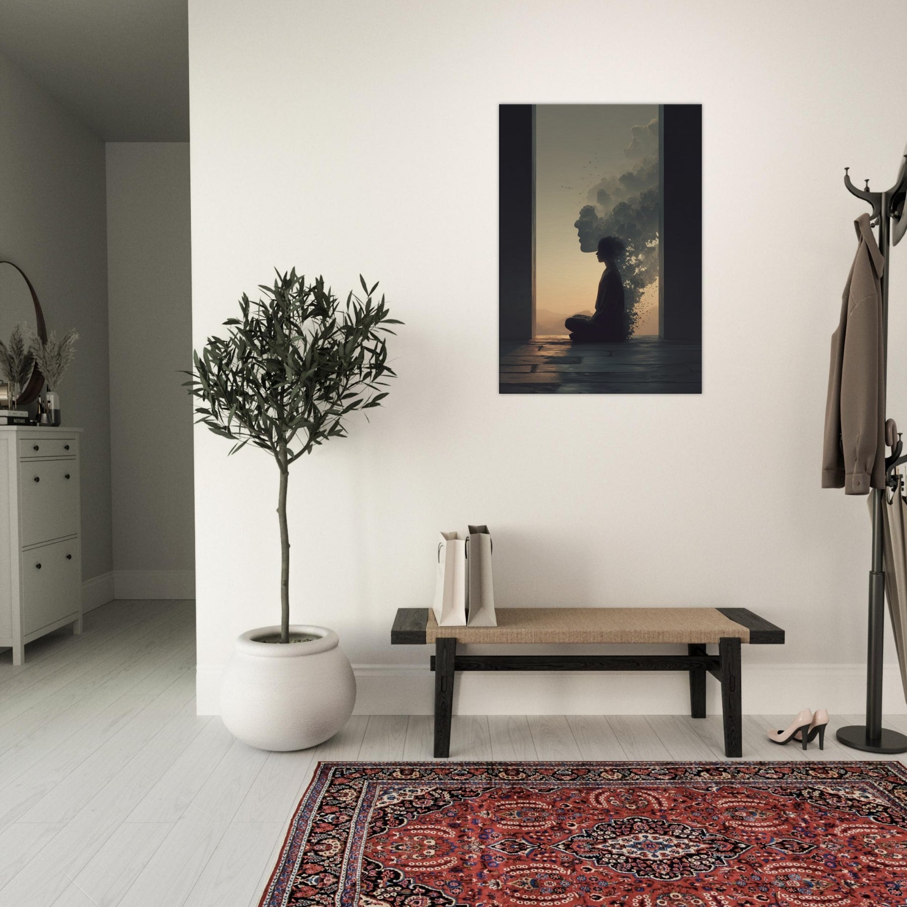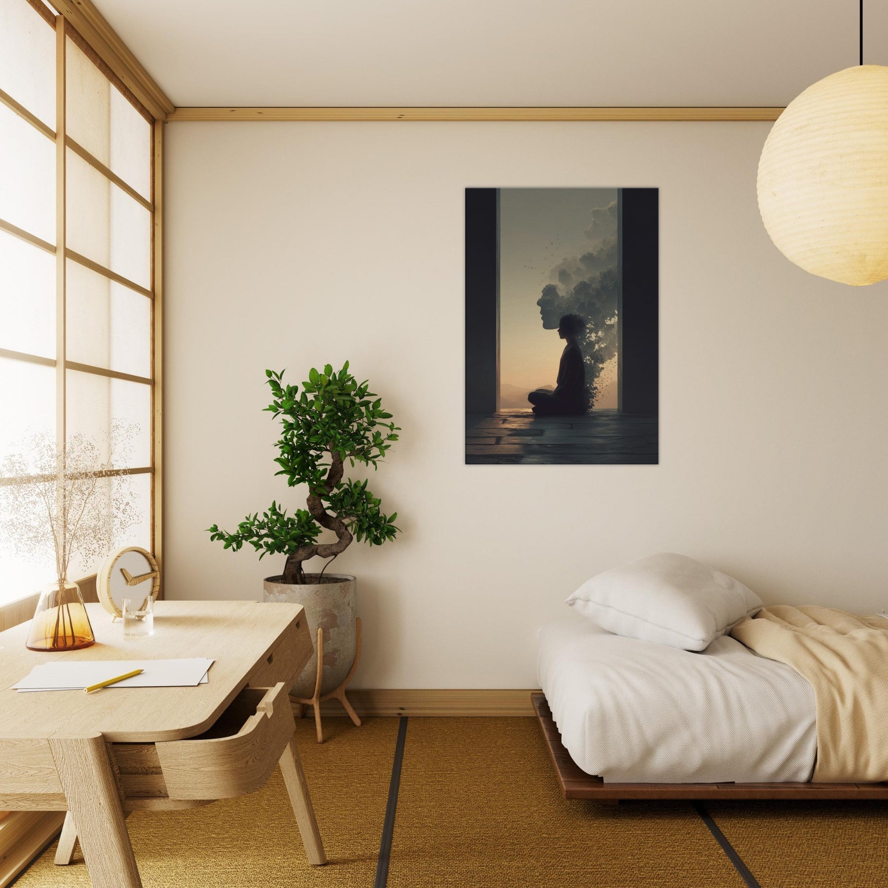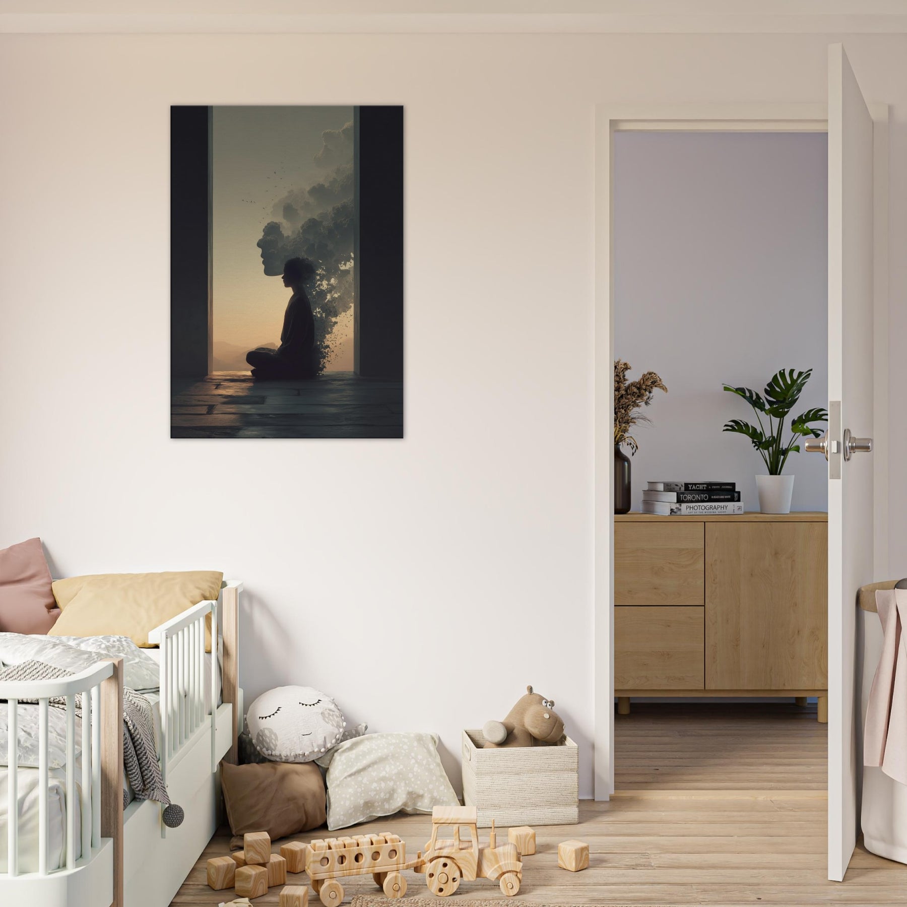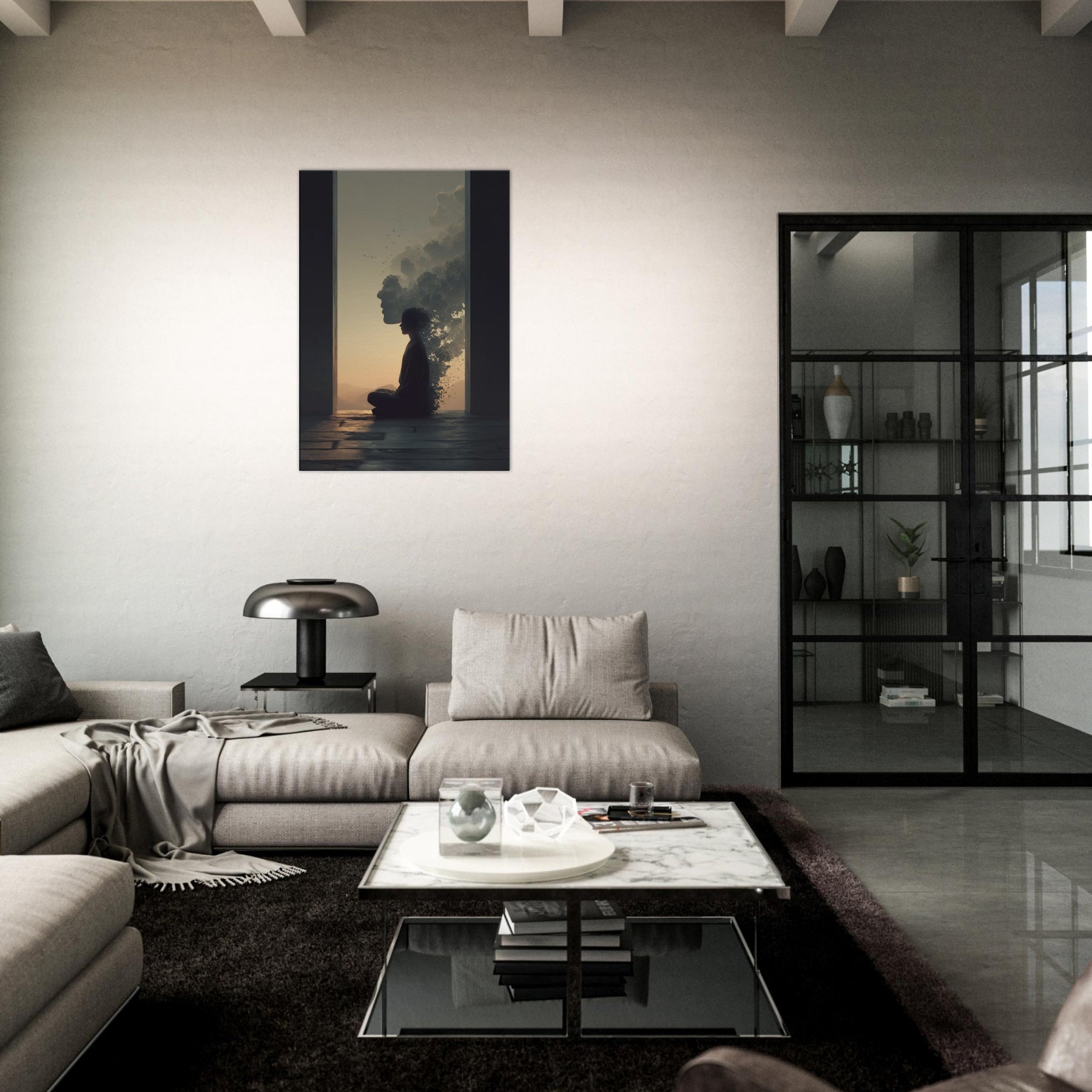 In this surreal meditation, the Yoga Lotus Pose becomes a gateway between breath and dream. A slender silhouette kneels at the threshold as a luminous cloud form of faces rises behind, turning stillness into a living . The soft twilight palette and hazy light invite quiet reflection, making the room feel suspended between dawn and infinity. Hang this artwork where you seek calm and becoming; it nourishes focus, heightens atmosphere, and lends a cinematic, otherworldly presence to everyday space.