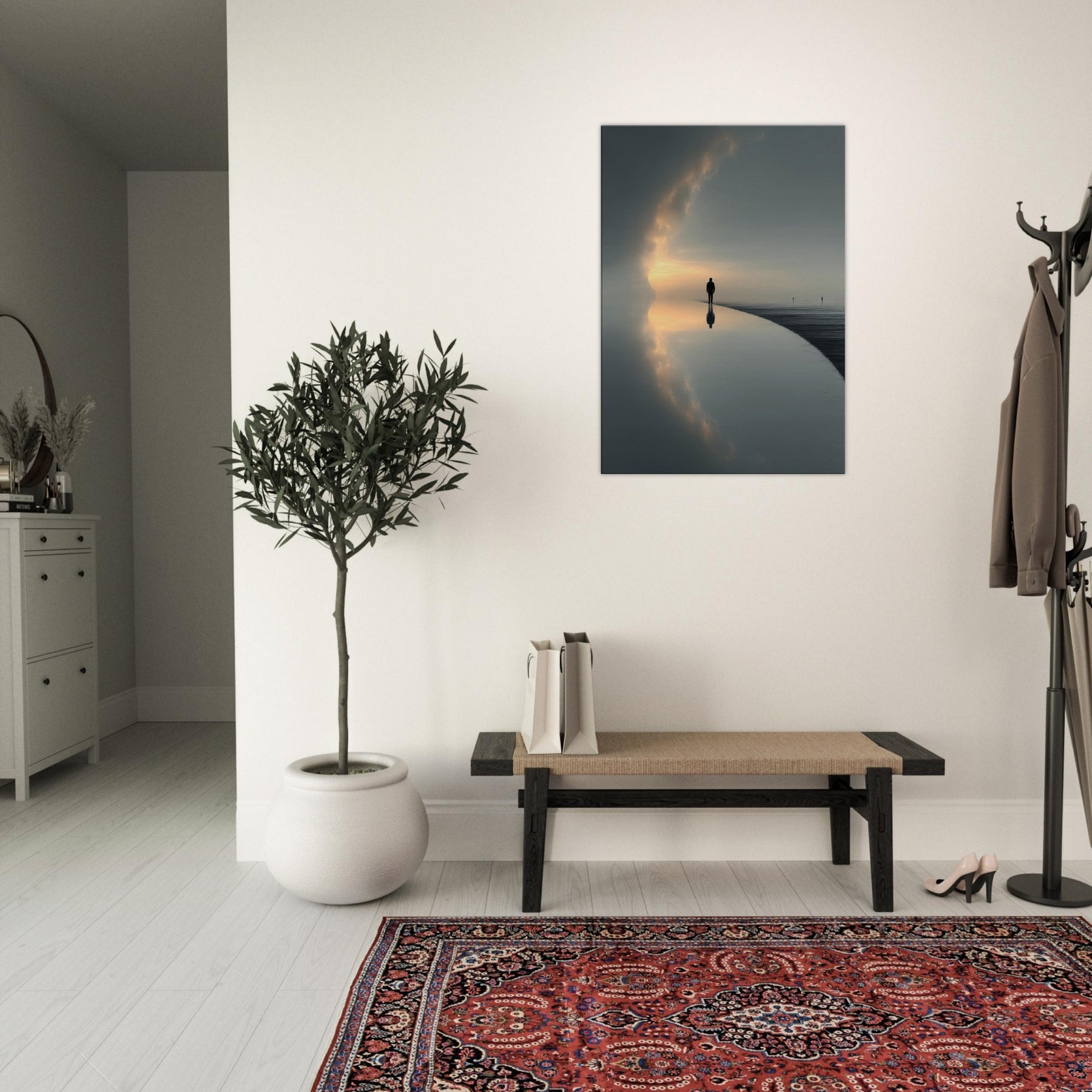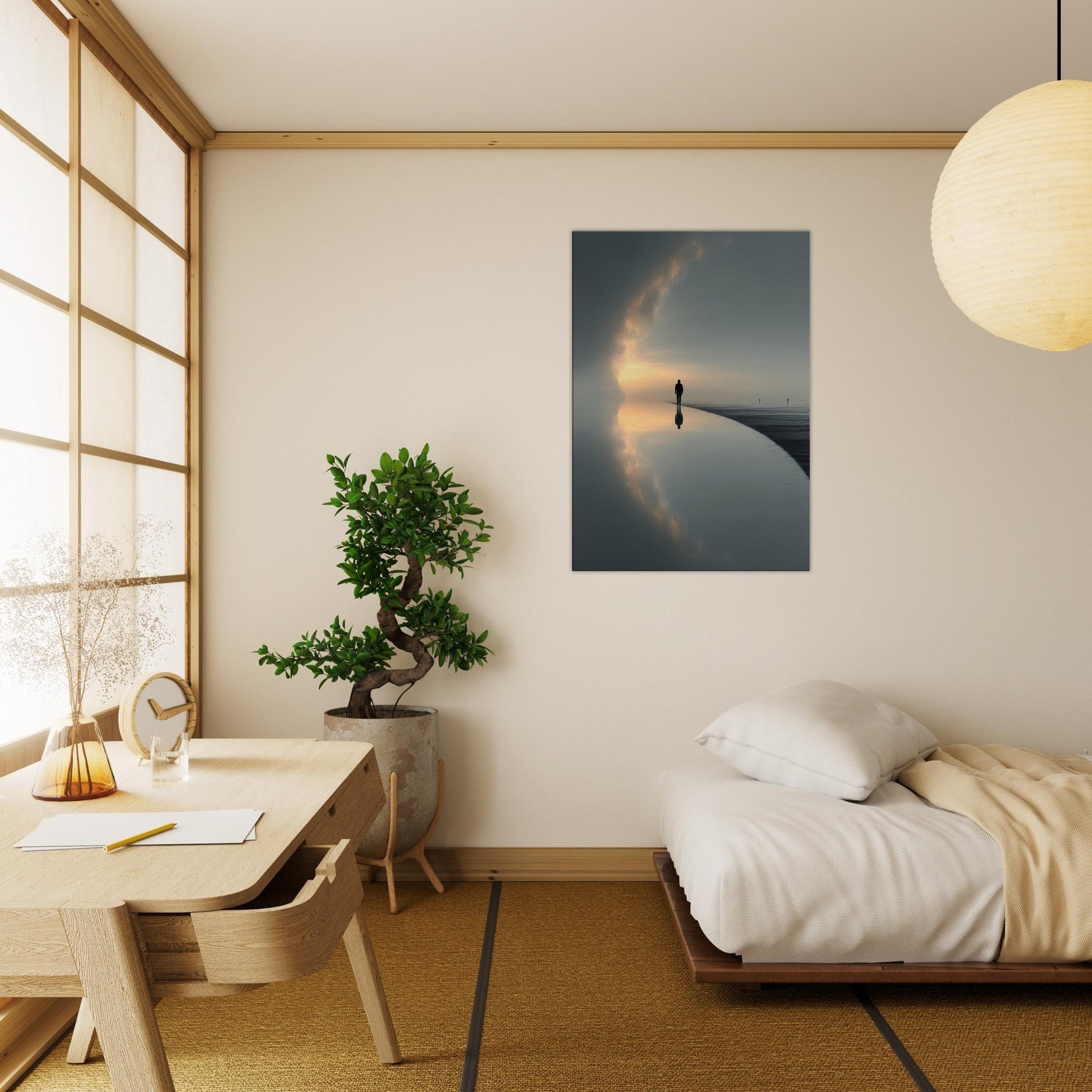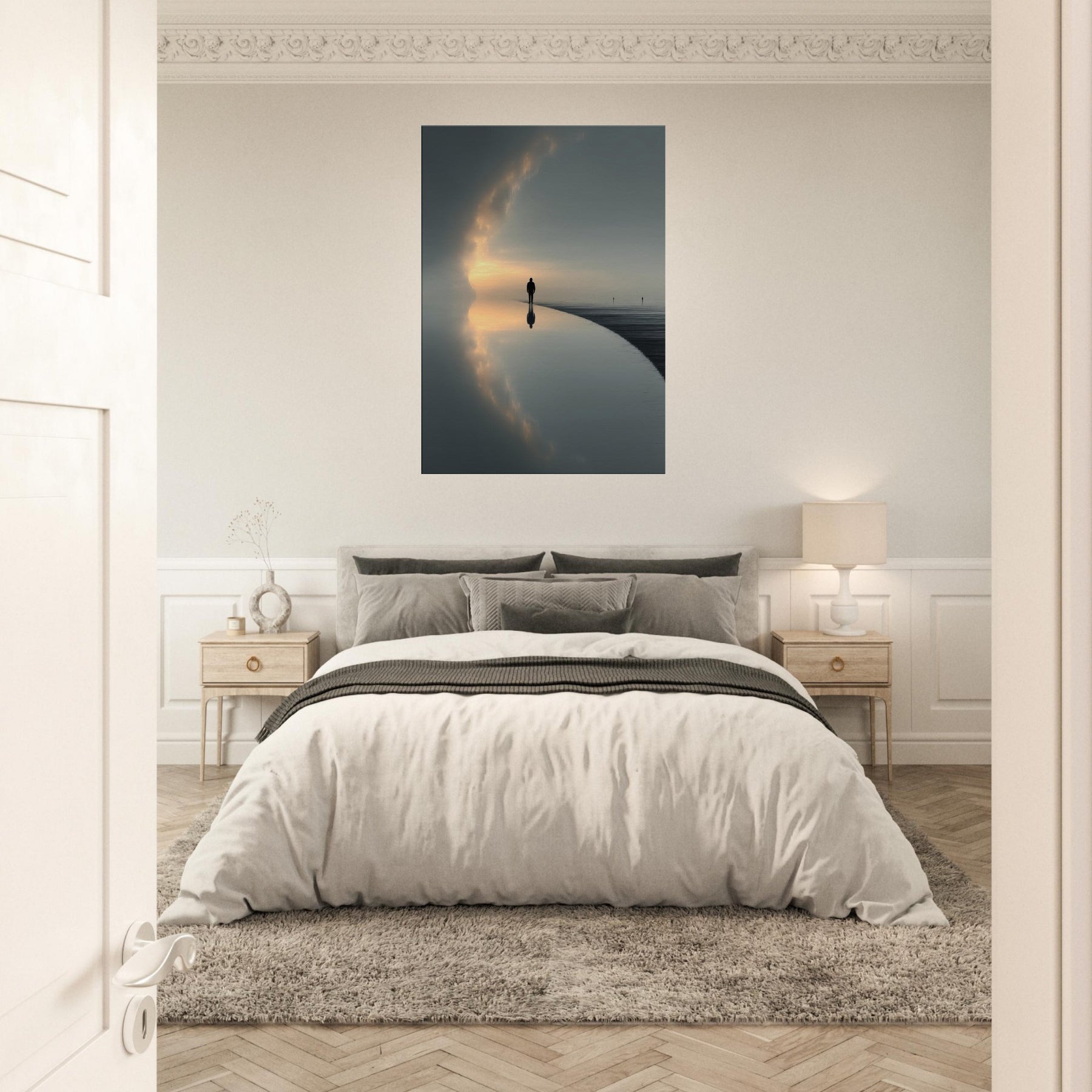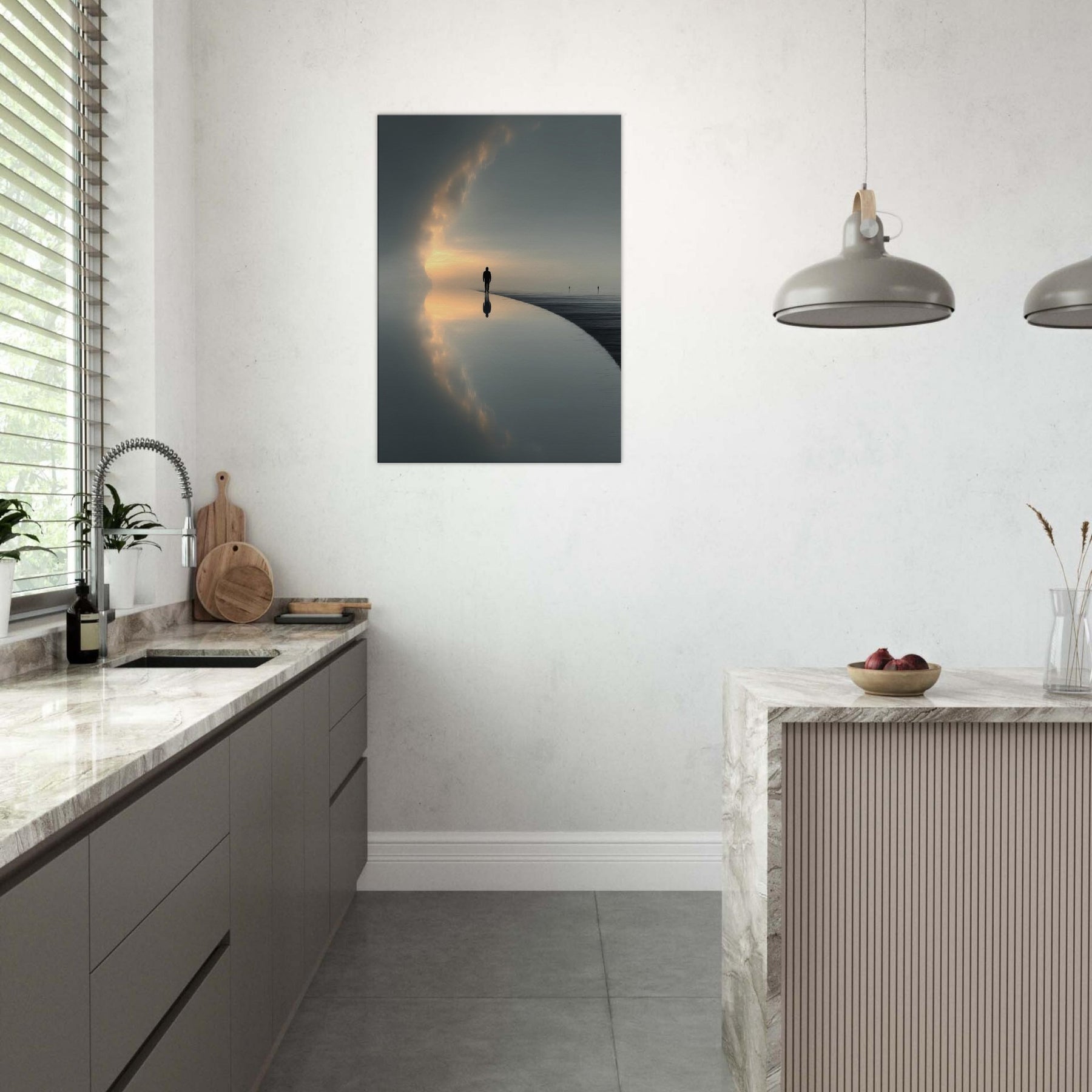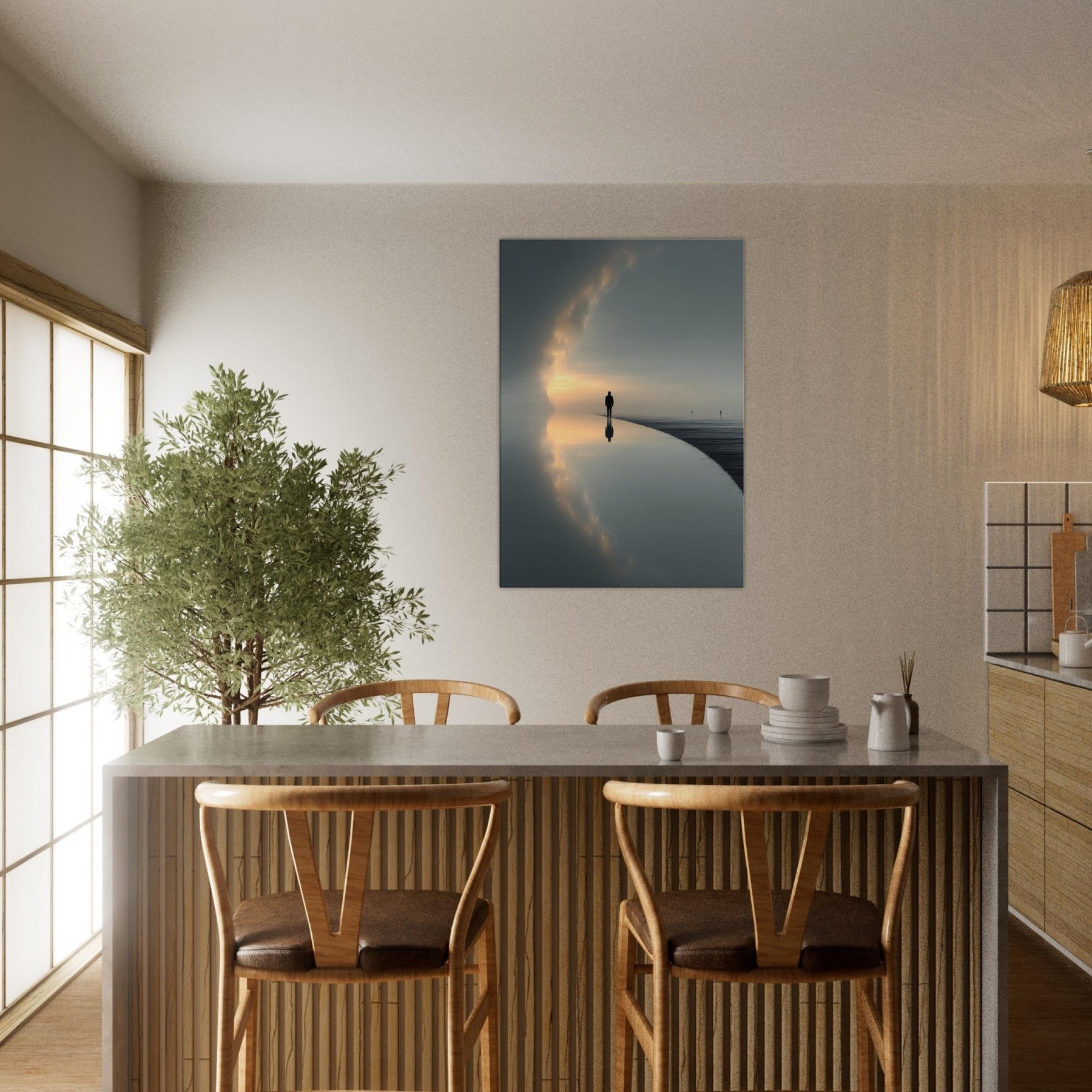 Focus on the Primary Subject, a Vinyl Record, standing at the edge of a glassy horizon where daybreak stretches into song. This surreal scene blends tactile memory with liquid geometry, turning sound into light and memory into . The atmosphere hums with quiet mystery, inviting slower moments, intimate corners, and conversations that drift beyond the room. Printed on fine gallery canvas with a luminous finish, it elevates a living space with elegance, texture, and a whisper of timeless rhythm.