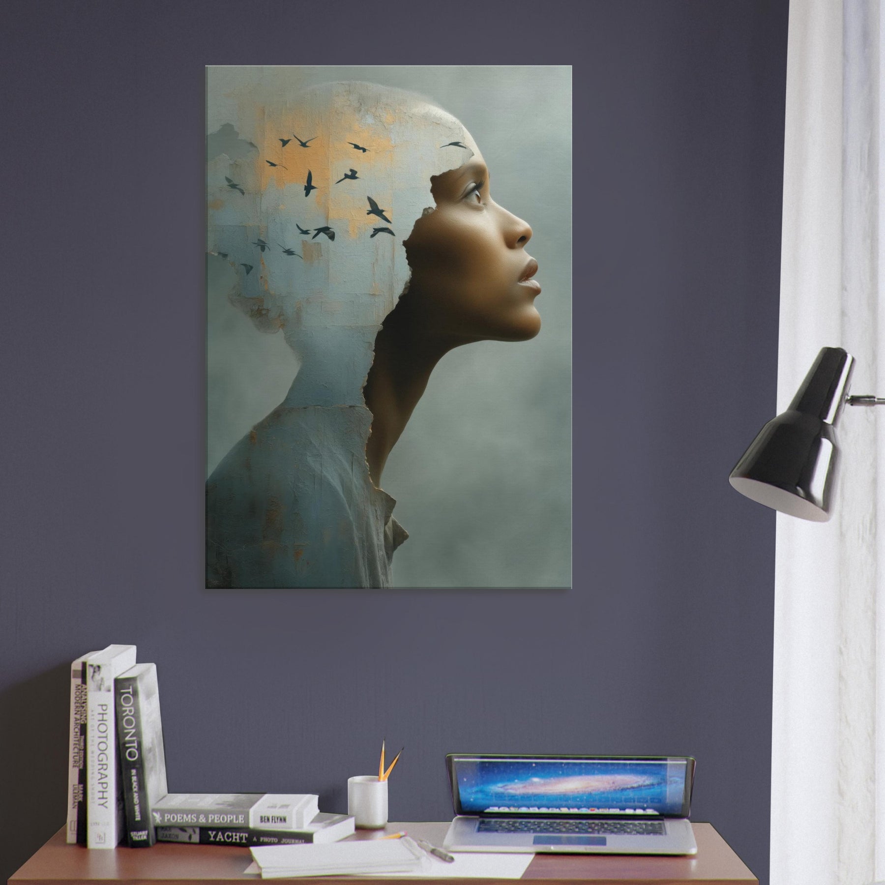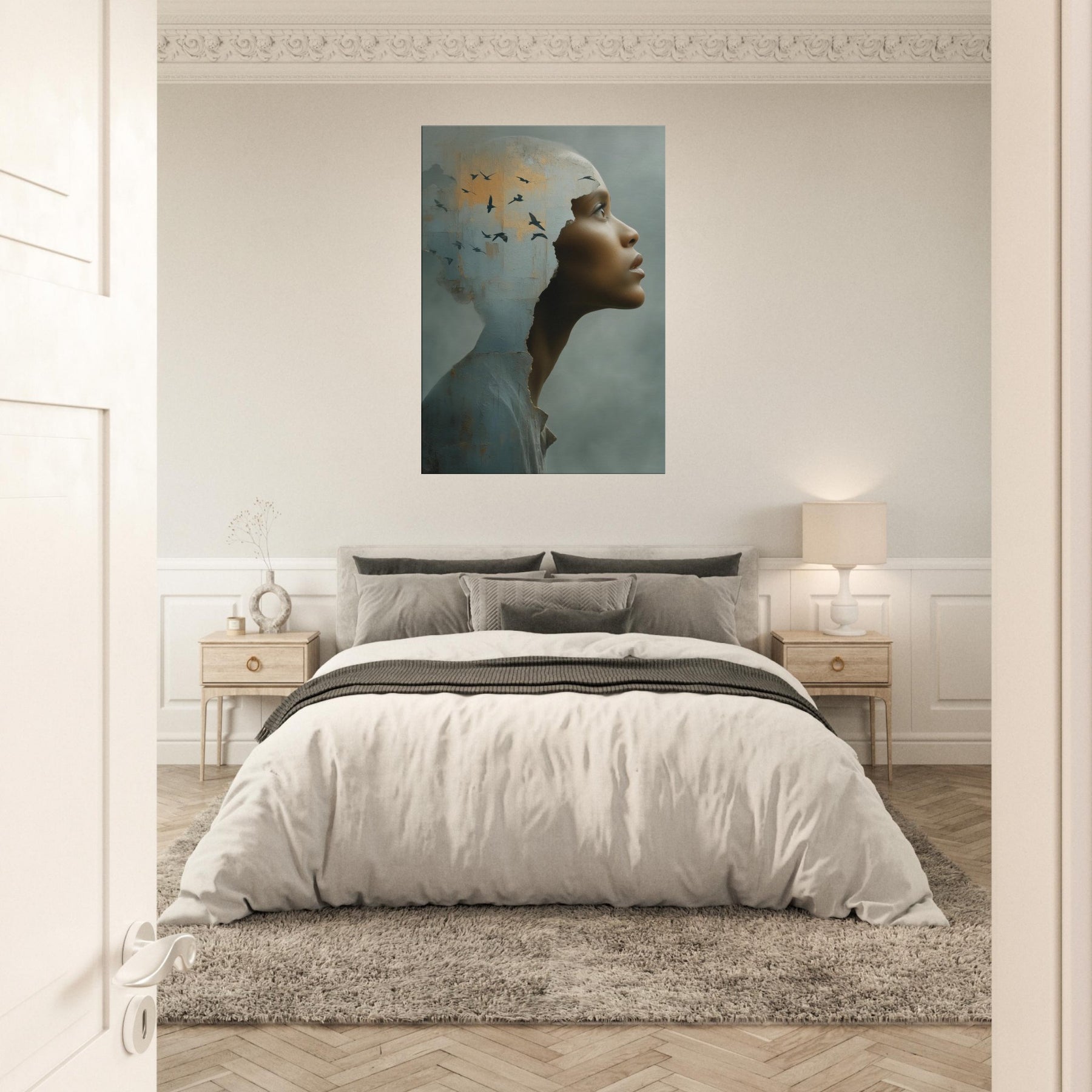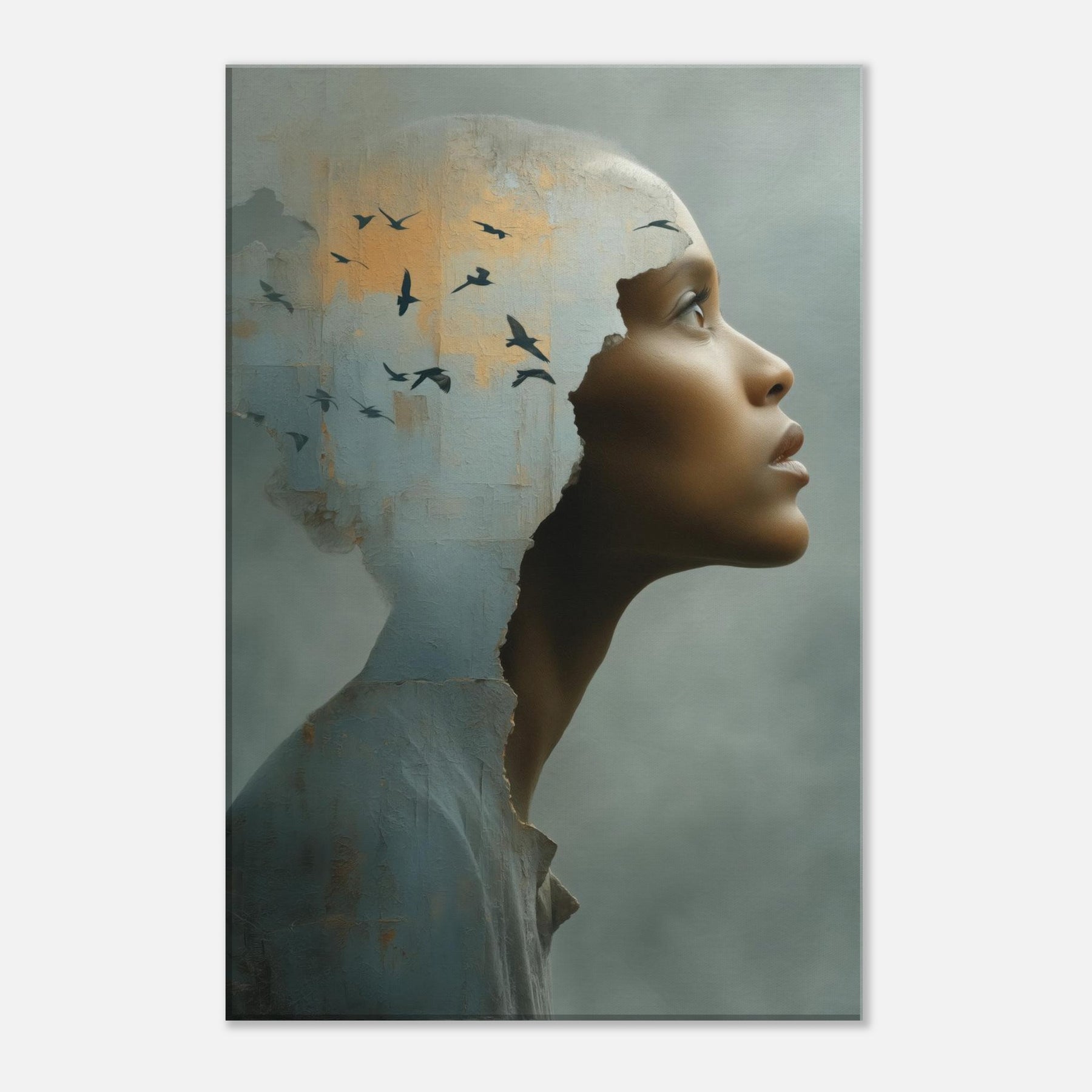 An intimate, dreamlike study of identity, as the Primary Subject, the African Woman steps from a weathered shell into a wide, quiet horizon. The torn edge feels like a doorway into another realm, where a flock of birds lifts the room on whispering currents of light. This surreal composition blends tactile texture with airy symbolism, inviting calm and curiosity in equal measure. Hang it in a living room or entryway to soften hard edges with warmth, depth, and a luminous, contemplative presence.