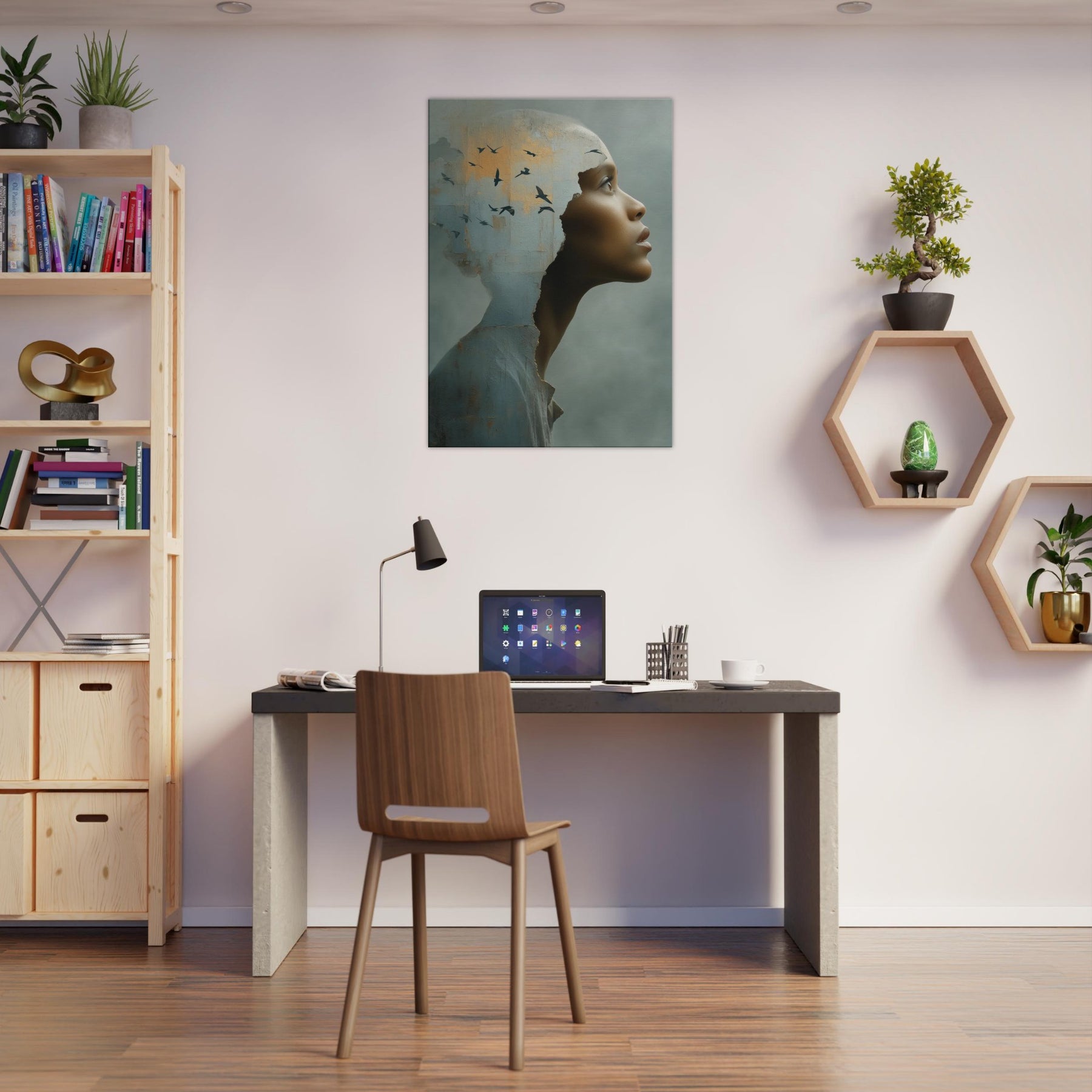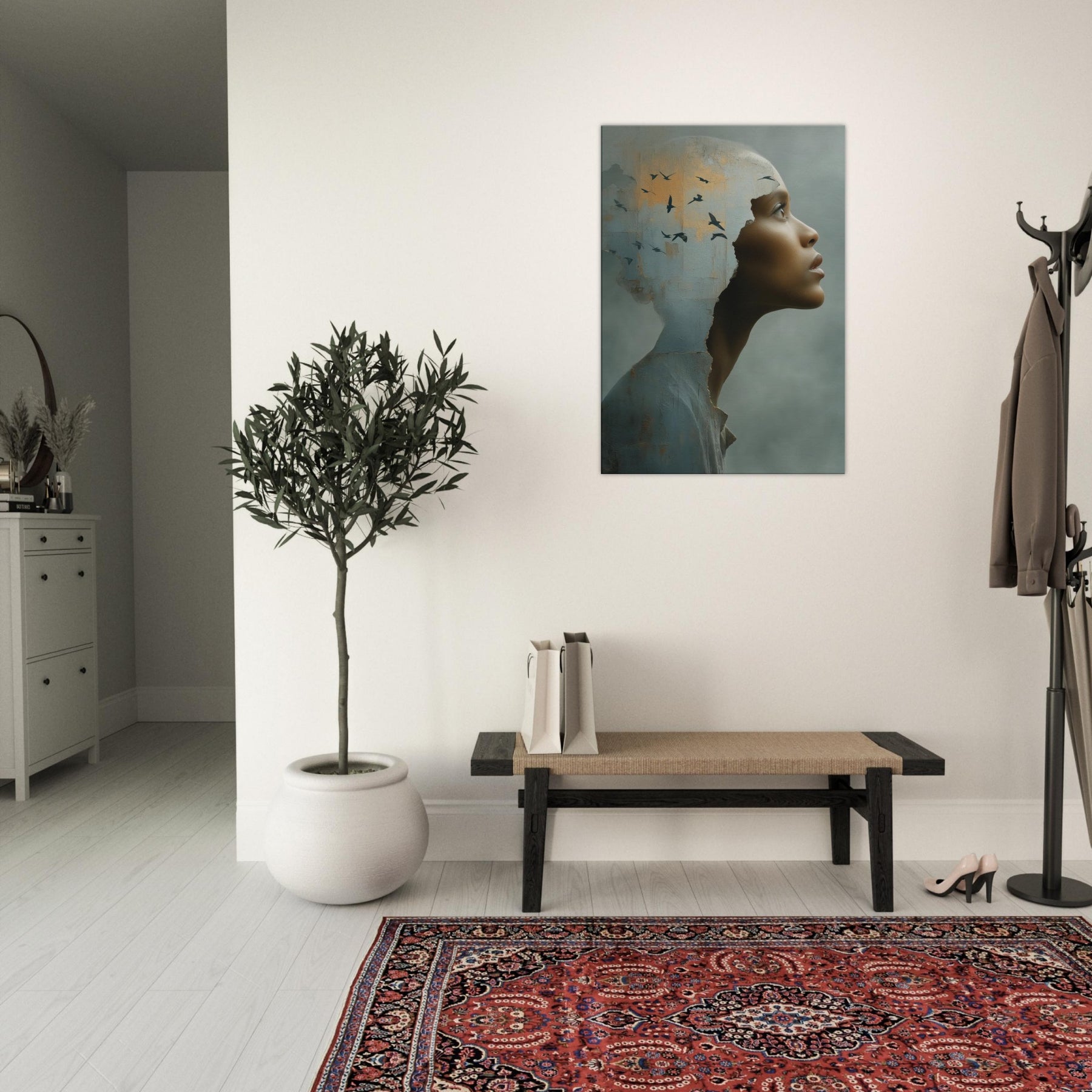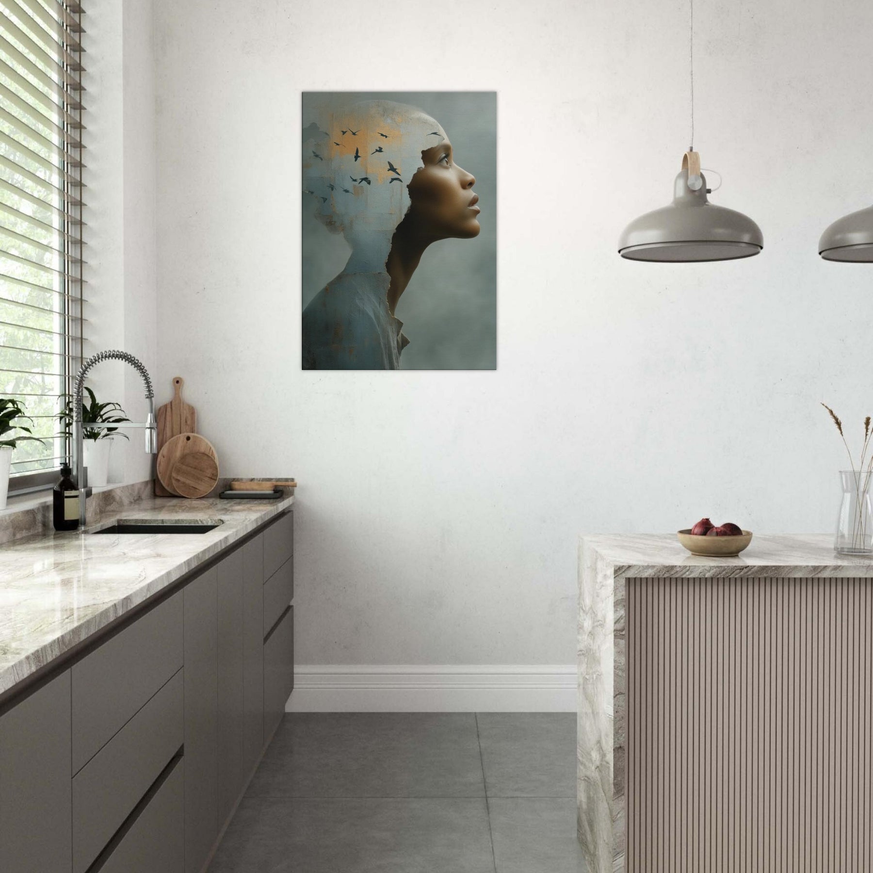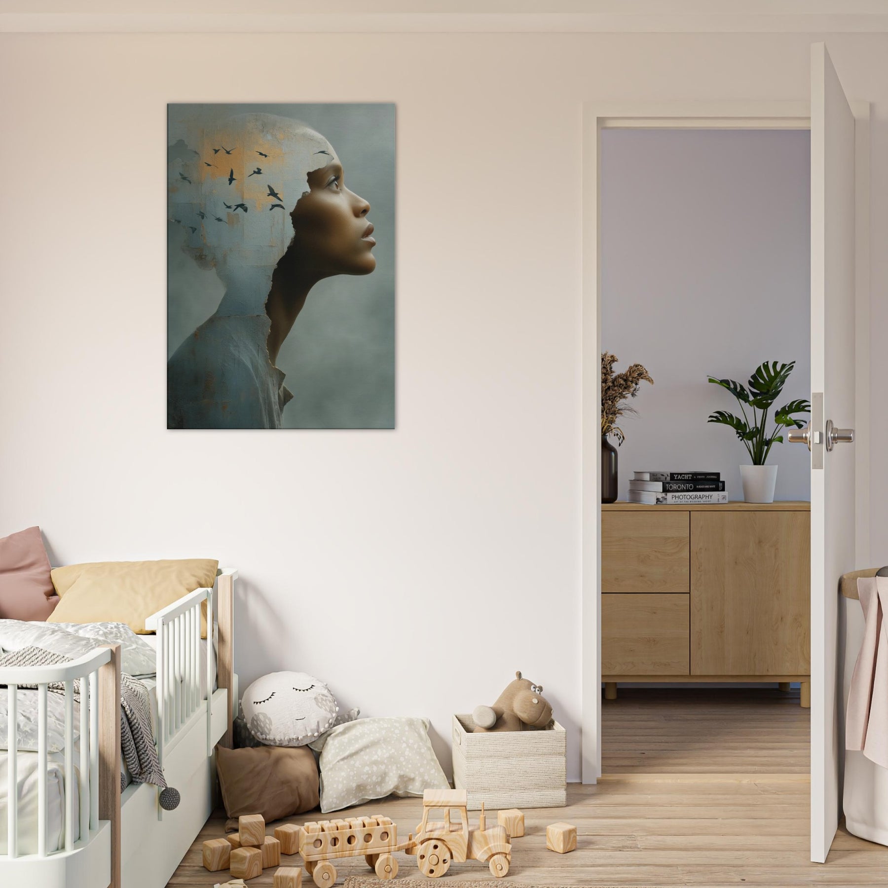 An intimate, dreamlike study of identity, as the Primary Subject, the African Woman steps from a weathered shell into a wide, quiet horizon. The torn edge feels like a doorway into another realm, where a flock of birds lifts the room on whispering currents of light. This surreal composition blends tactile texture with airy symbolism, inviting calm and curiosity in equal measure. Hang it in a living room or entryway to soften hard edges with warmth, depth, and a luminous, contemplative presence.