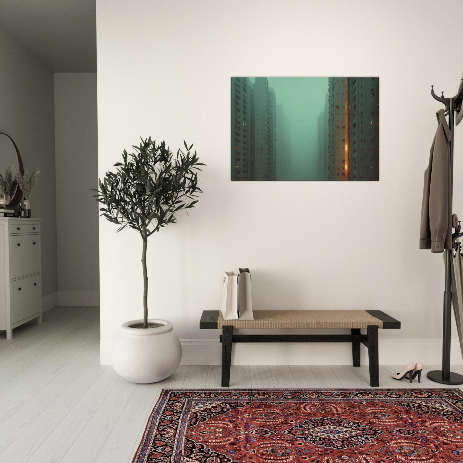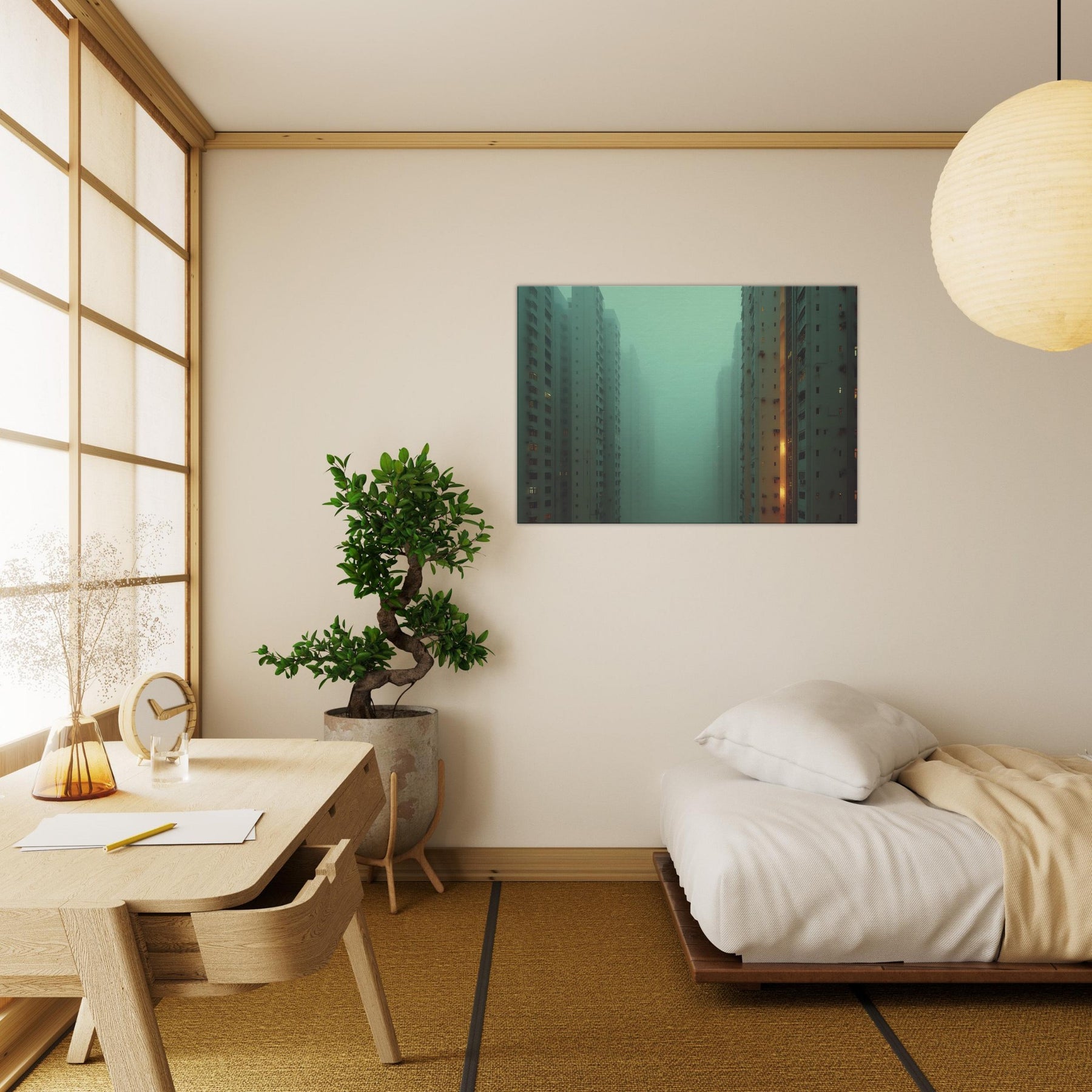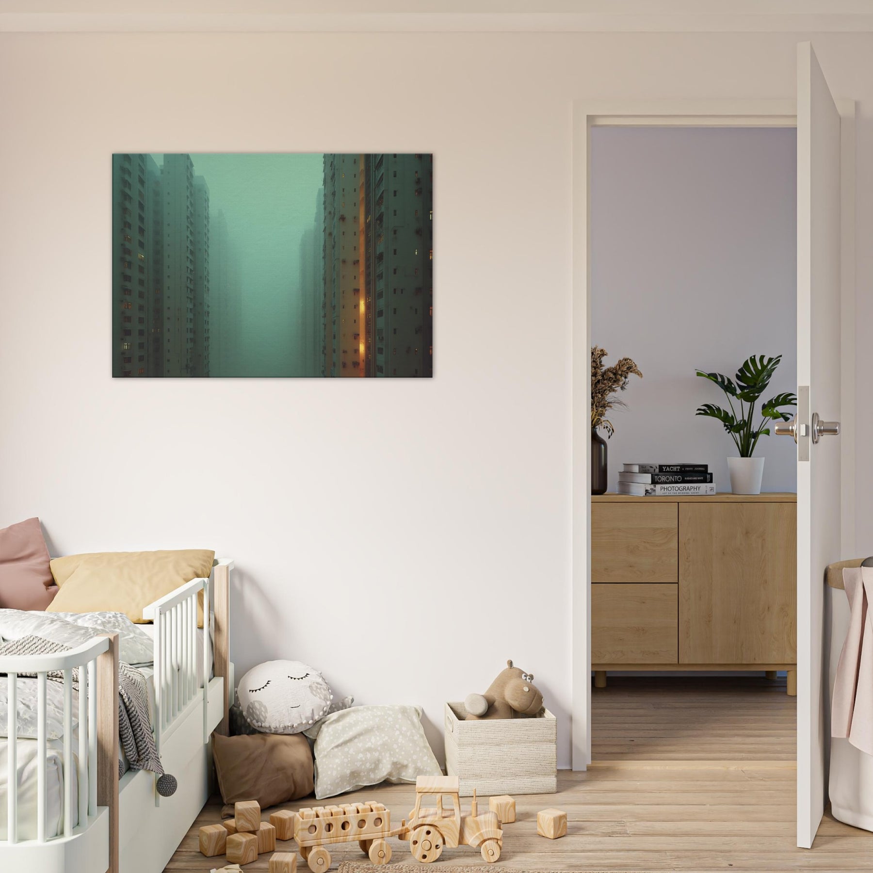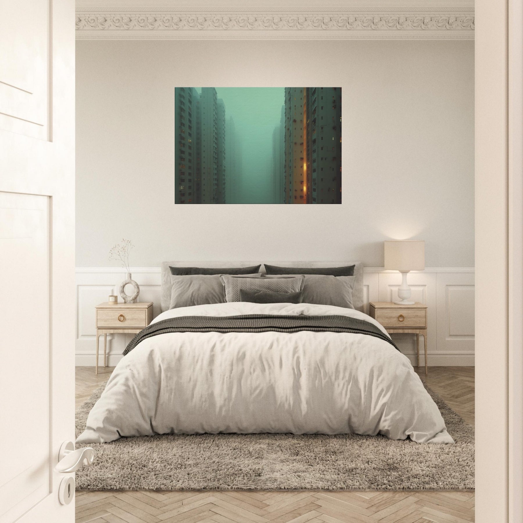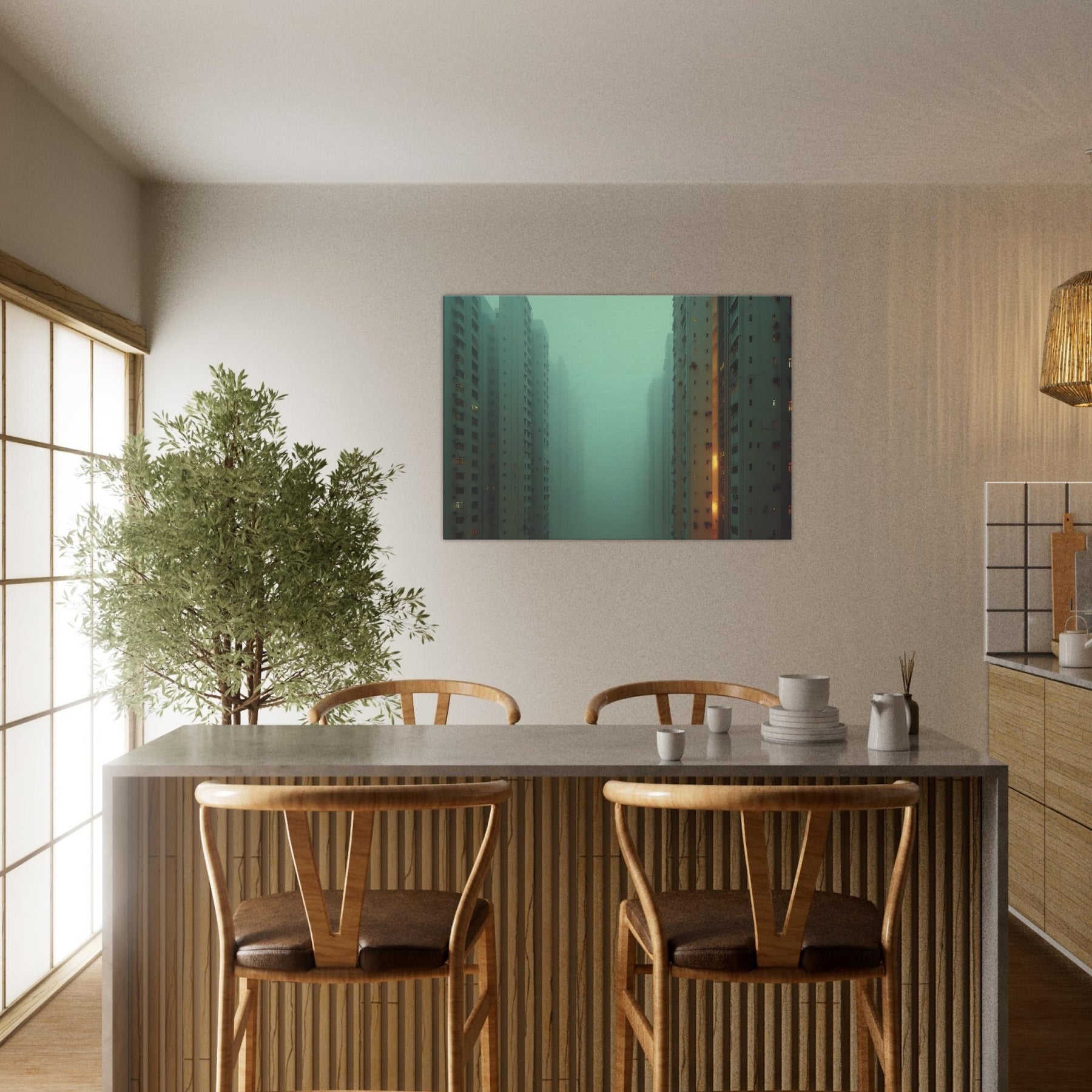 In a dreamscape of glass and fog, this Surrealist cityscape dissolves the ordinary into luminous possibility. Skyscrapers vanish into a teal green haze, lantern light breathes along ribbed facades, and the air tastes of rain warmed neon. It invites quiet reflection, turning a living room into a contemplative horizon where memory and modernity meet. A single breath of space between towers makes the room feel larger, more intimate, and endlessly curious like Hong Kong’s pulse captured as a whispering, melodic echo.