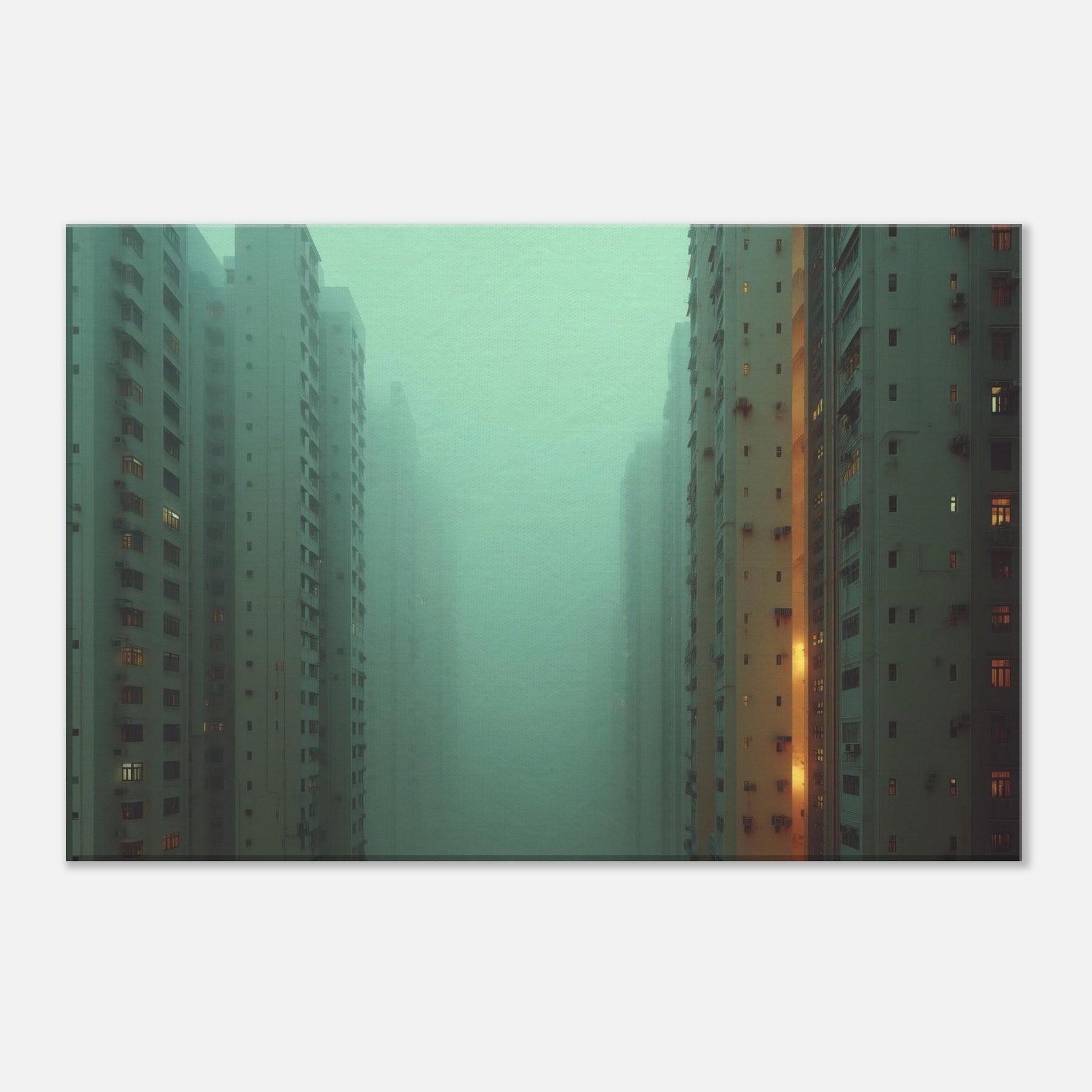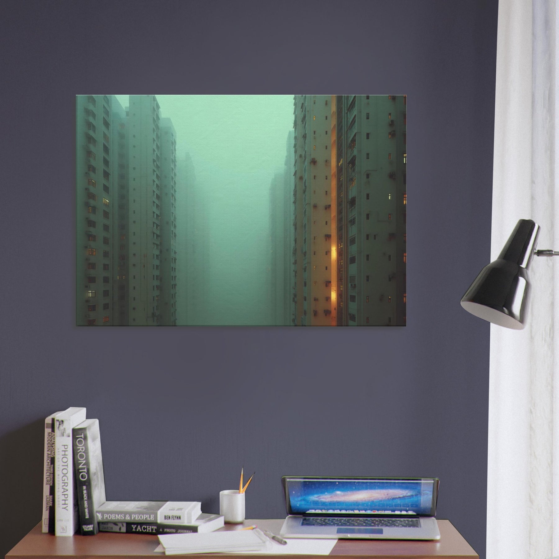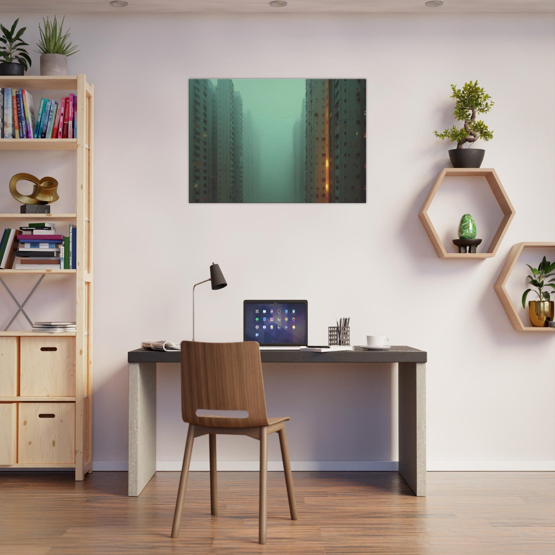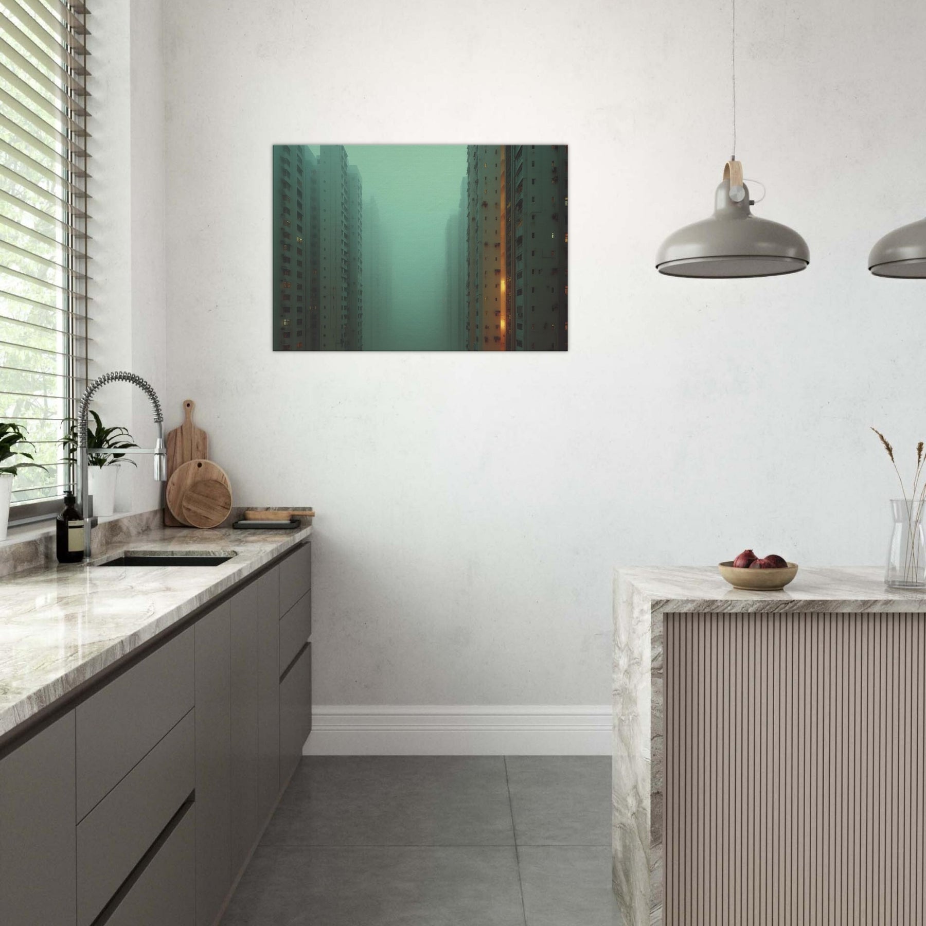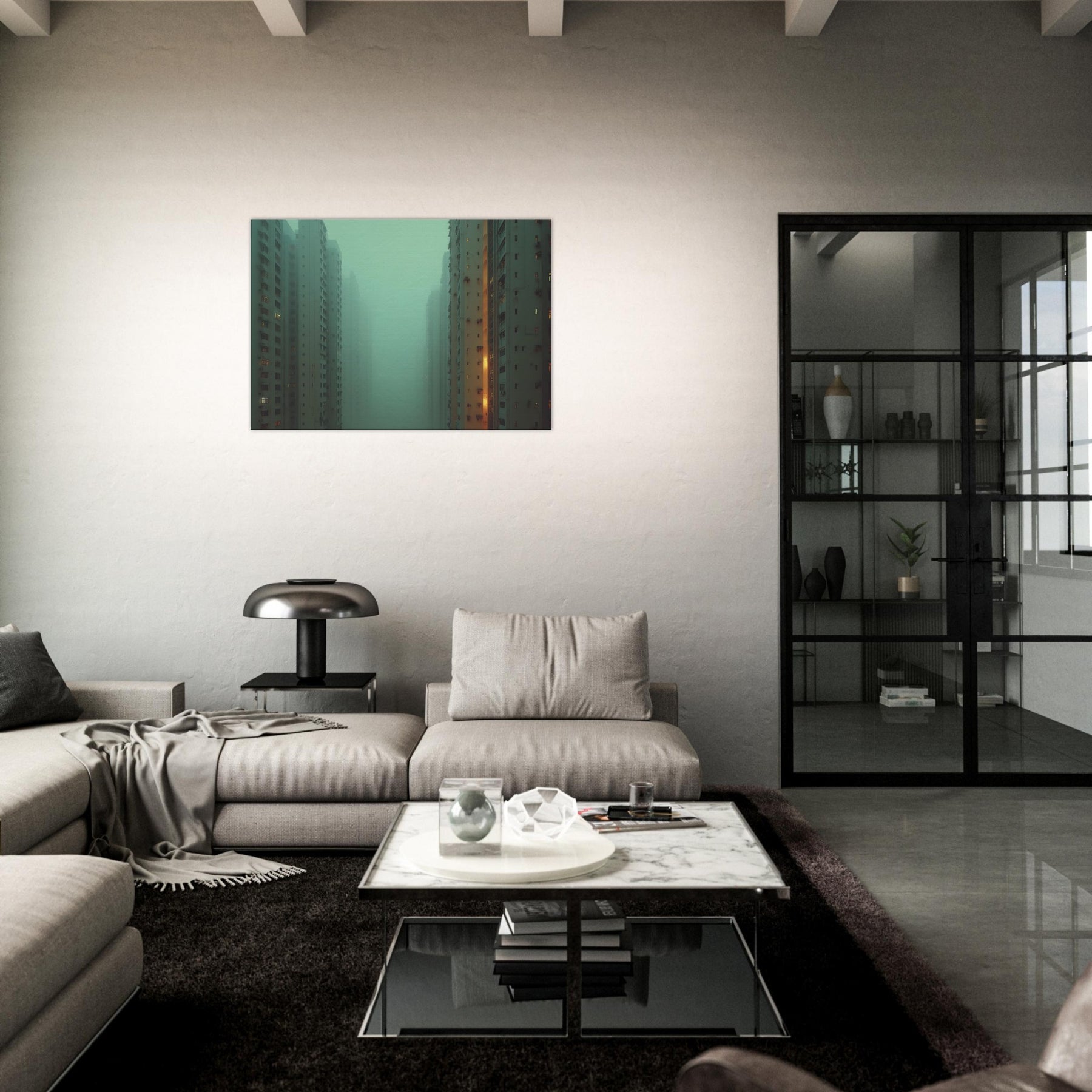 In a dreamscape of glass and fog, this Surrealist cityscape dissolves the ordinary into luminous possibility. Skyscrapers vanish into a teal green haze, lantern light breathes along ribbed facades, and the air tastes of rain warmed neon. It invites quiet reflection, turning a living room into a contemplative horizon where memory and modernity meet. A single breath of space between towers makes the room feel larger, more intimate, and endlessly curious like Hong Kong’s pulse captured as a whispering, melodic echo.