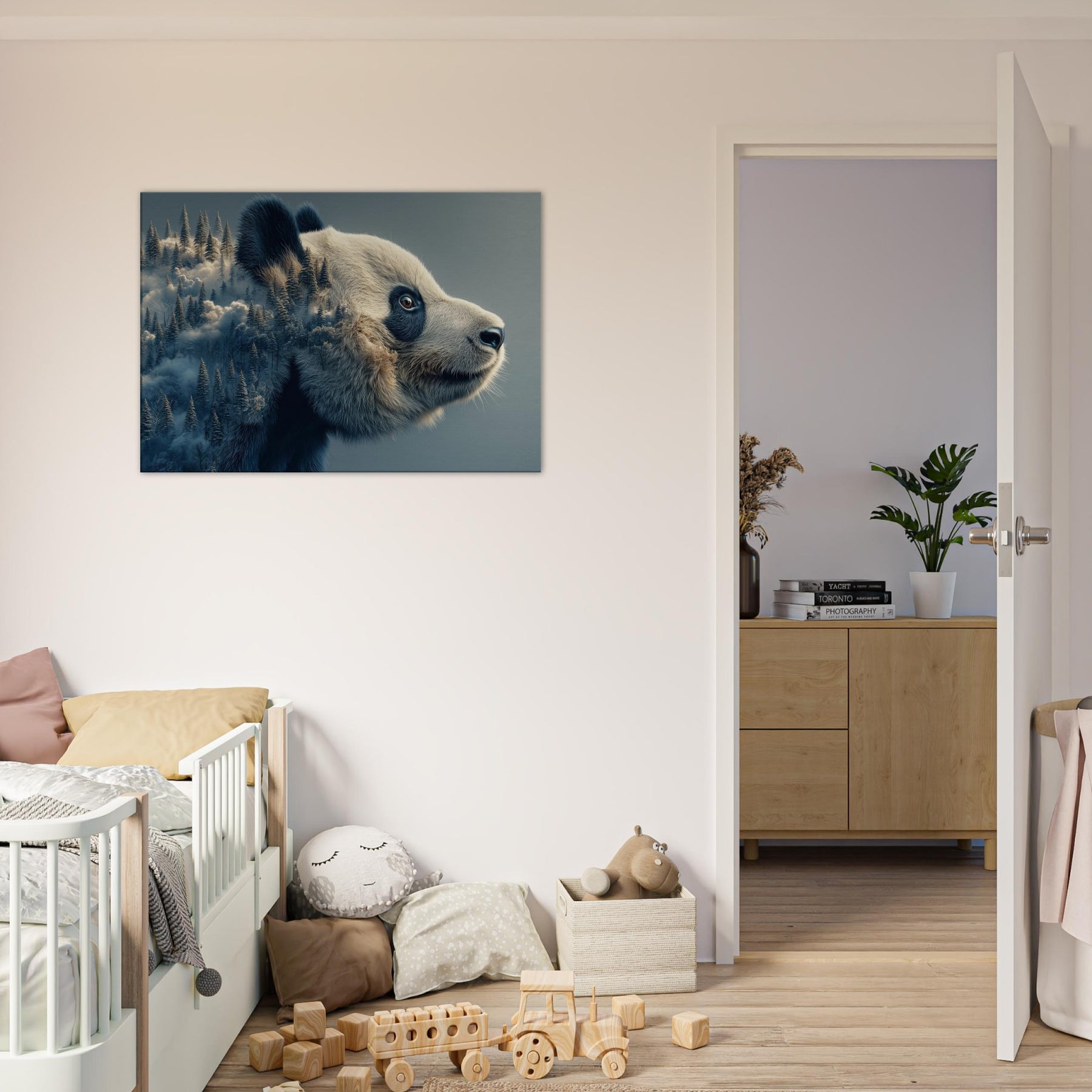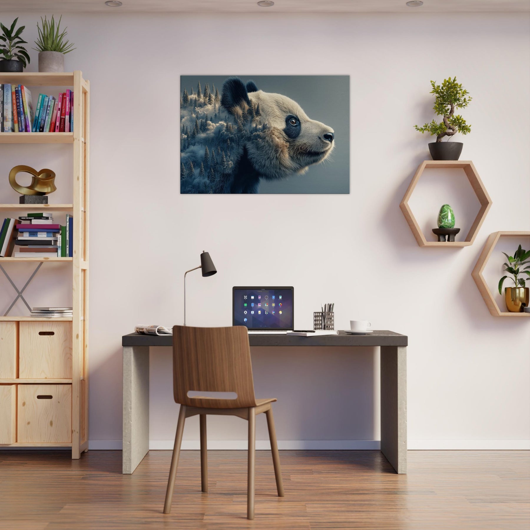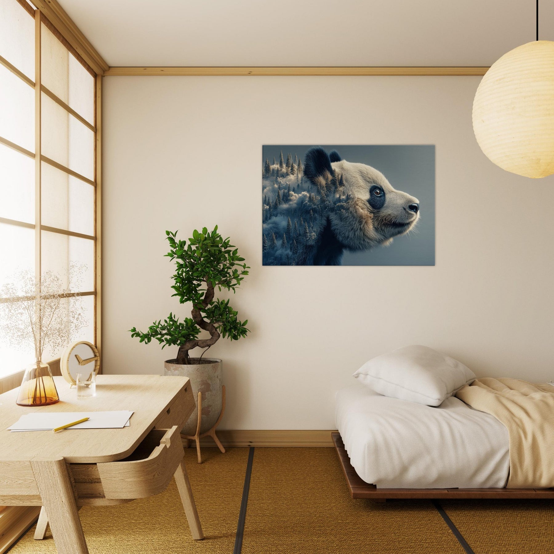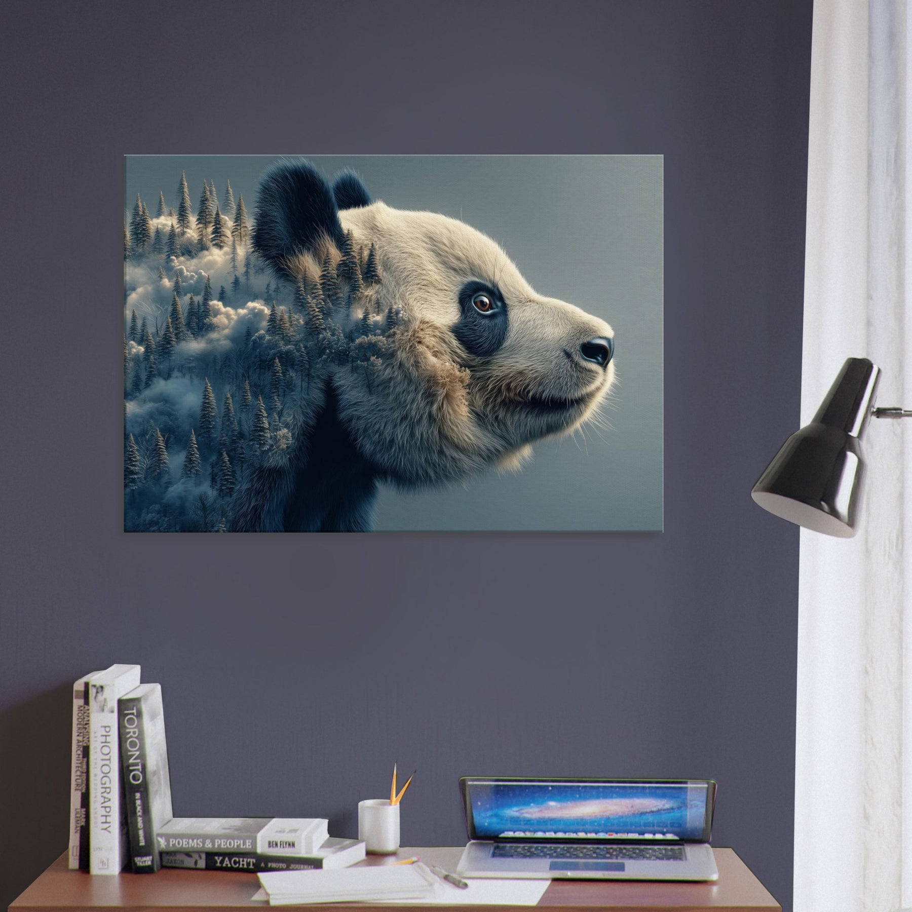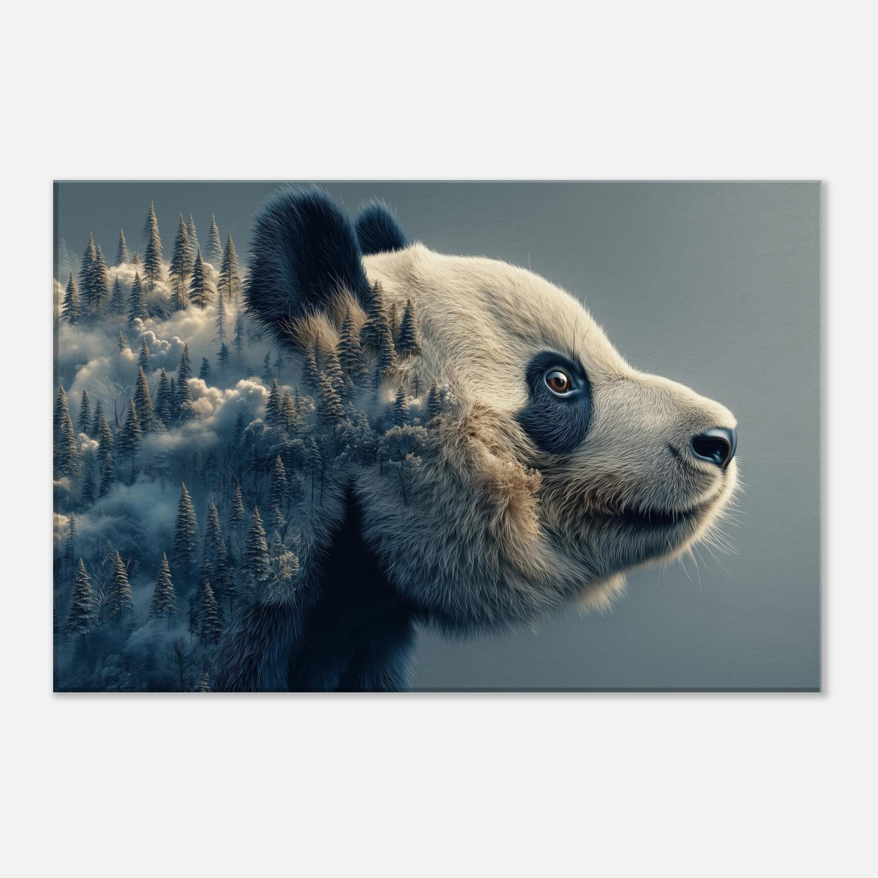 Within this surreal , a gentle Panda unfurls its mind across a wind swept forest of memory. The double vision of fur and firs nestles in soft blues and ivory, inviting breath and stillness into any room. It feels like a quiet dream you can live in a conversation between wilderness and whimsy that softens sharp angles of daily life. Hang it above a sofa or entryway, and let the atmosphere shift into calm wonder.