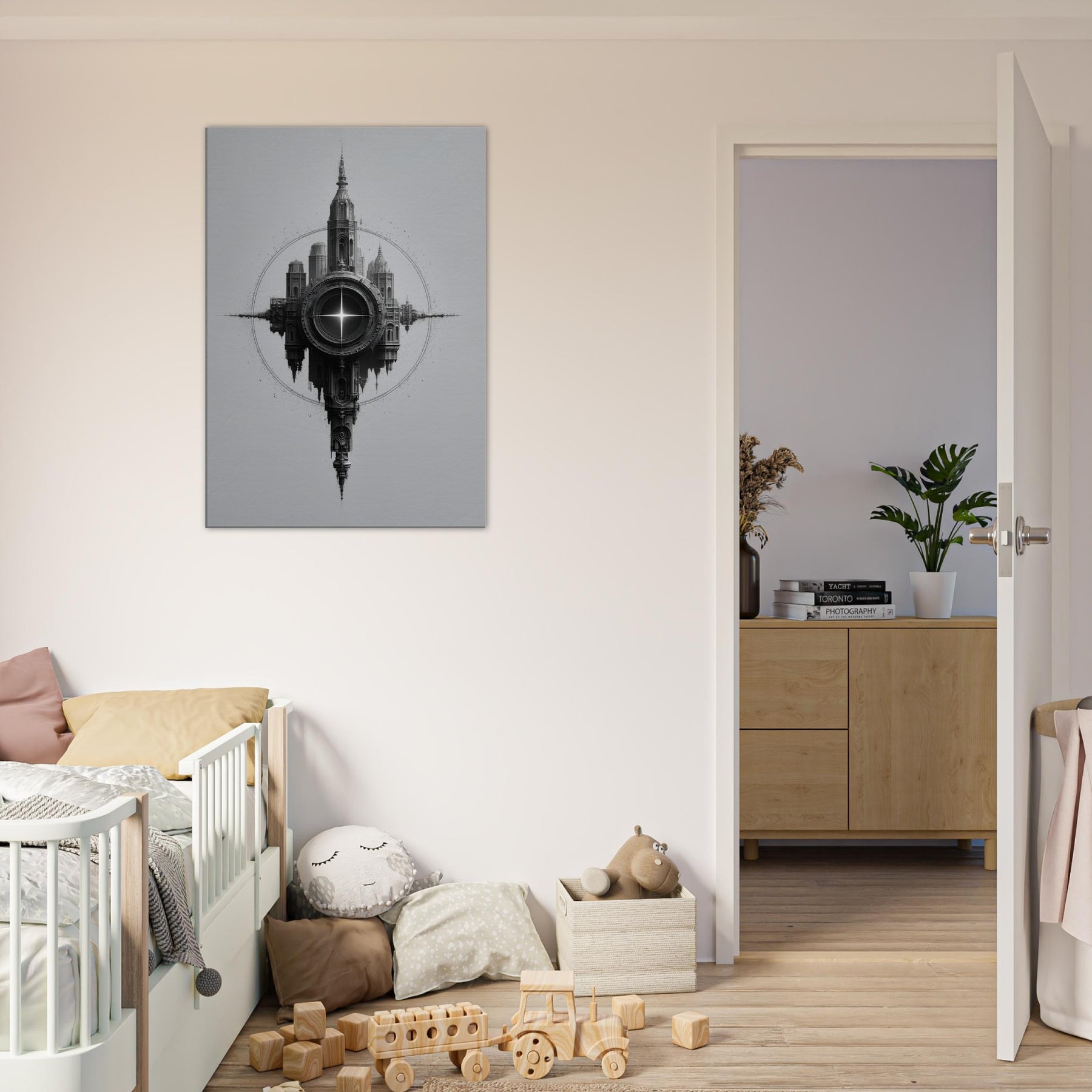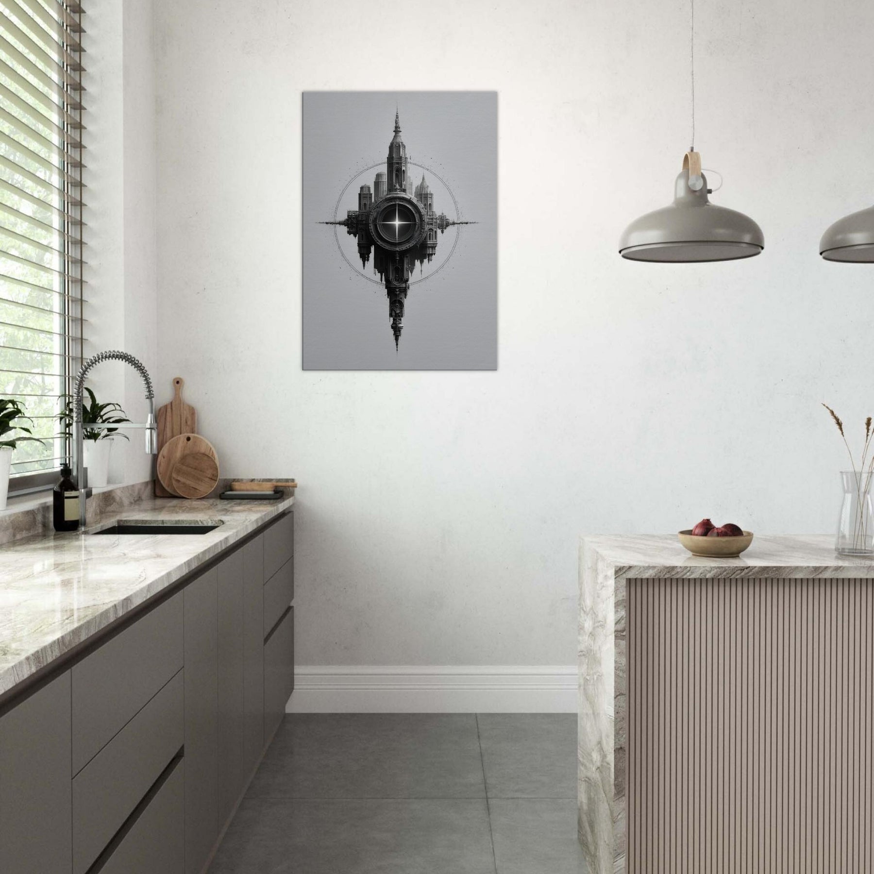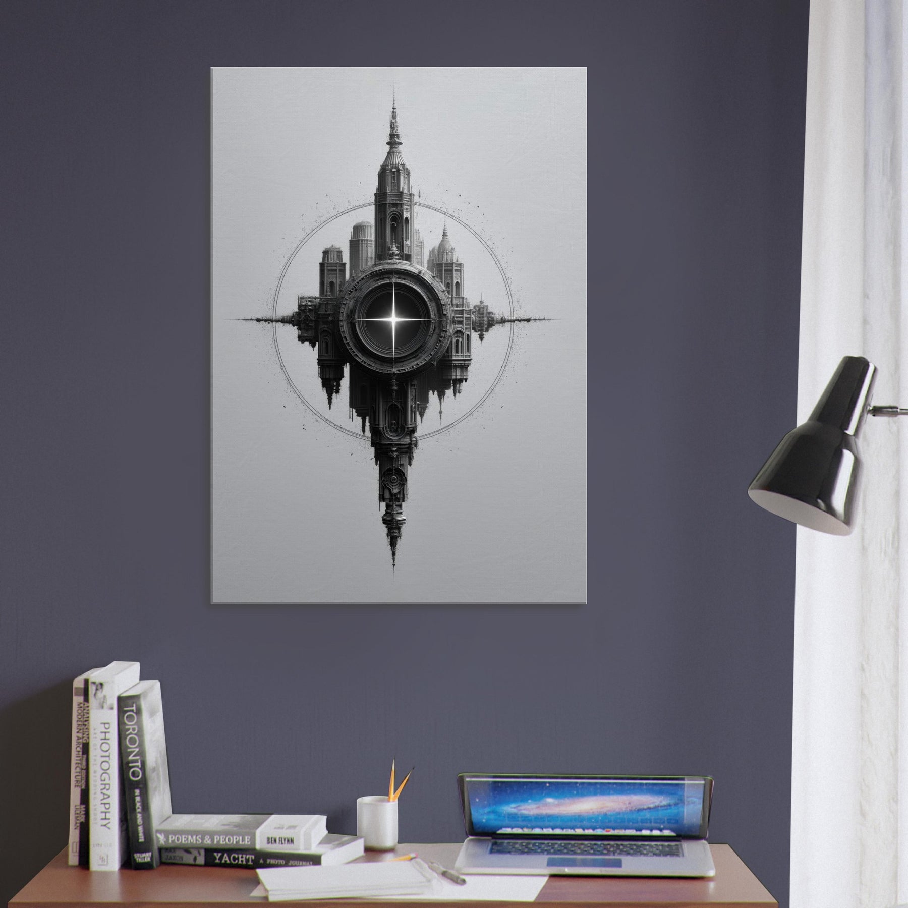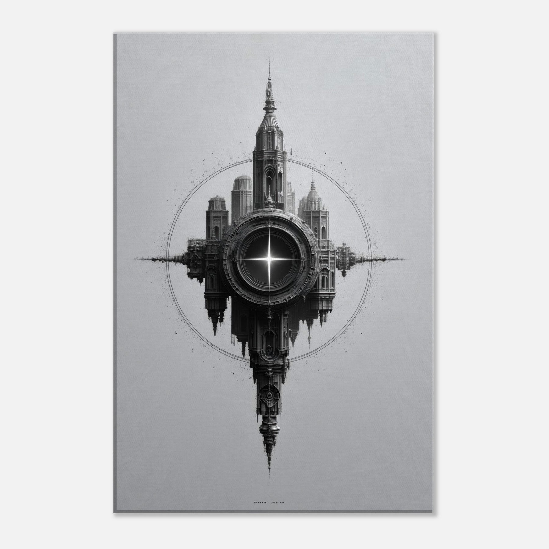 Labyrinth (Chartres) unfurls within a quiet circle of architectural gravity, where soaring towers mesh with iron and stone, and a radiant core pulses like a guiding star. This surreal composition invites slow, contemplative breathing as if you stood at the edge of a cathedral's midnight nave. The grayscale tonality, crisp lines, and delicate specks of ink create a living surface that shifts with light, turning a room into a sanctuary. Hang it in a lounge or study to evoke mystery, reflection, and old world wonder.