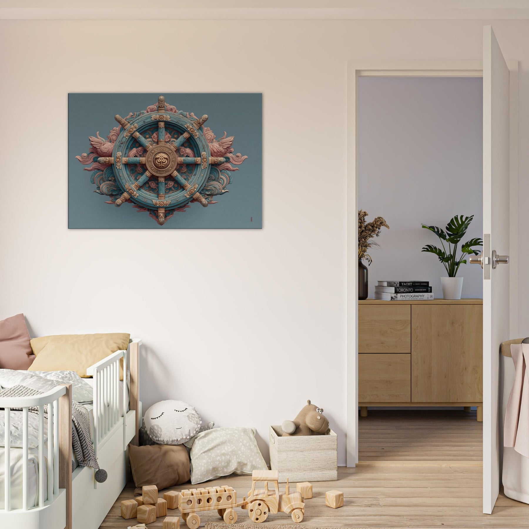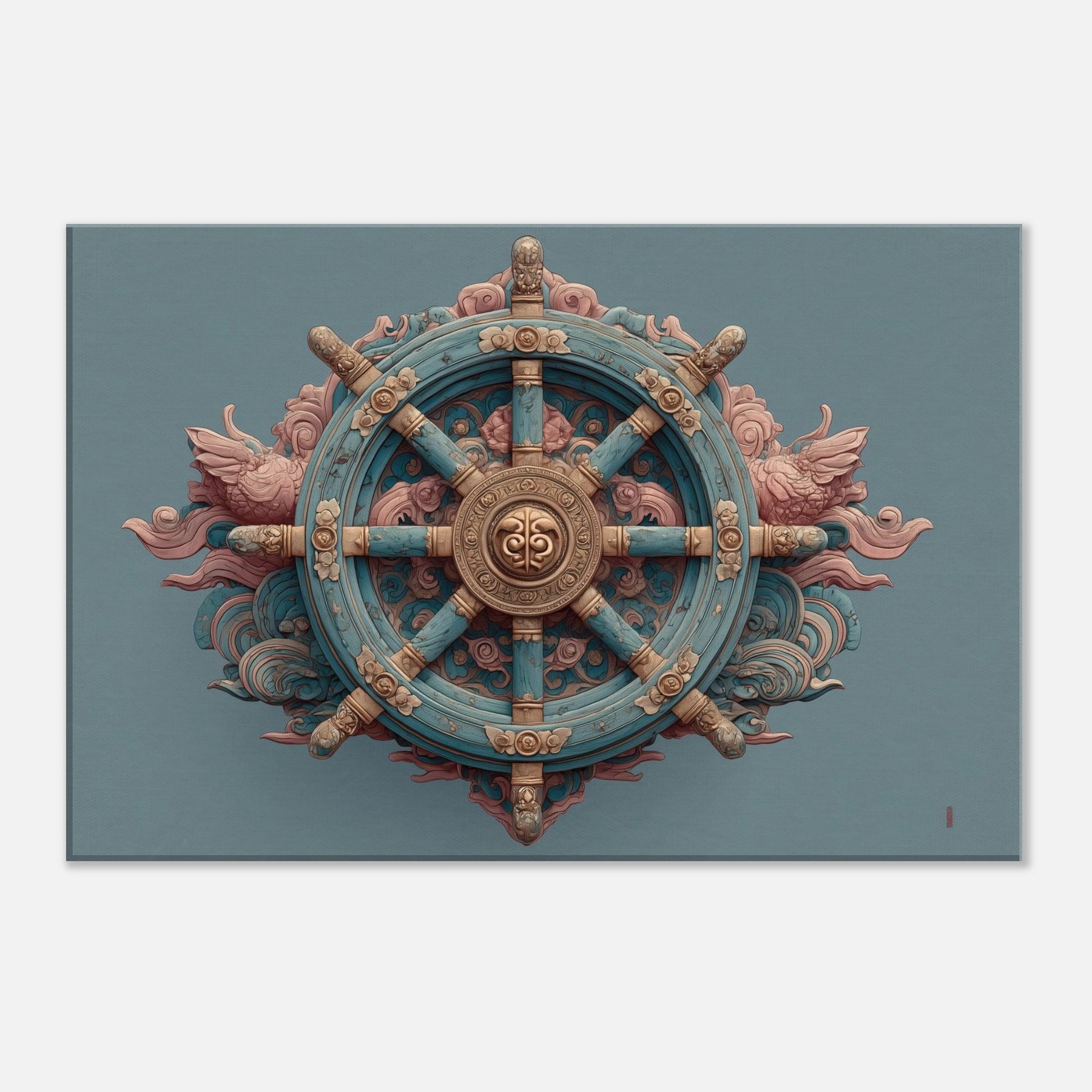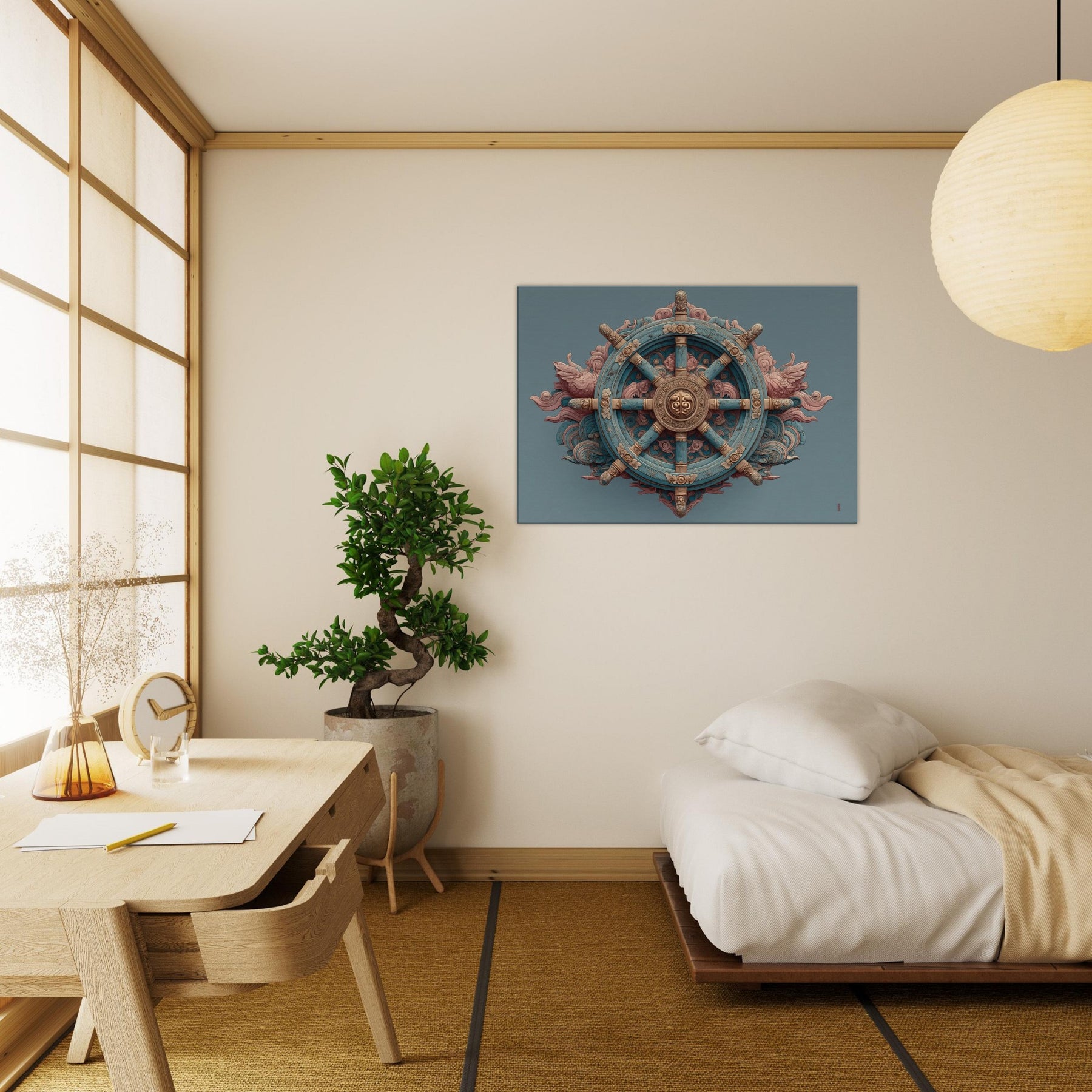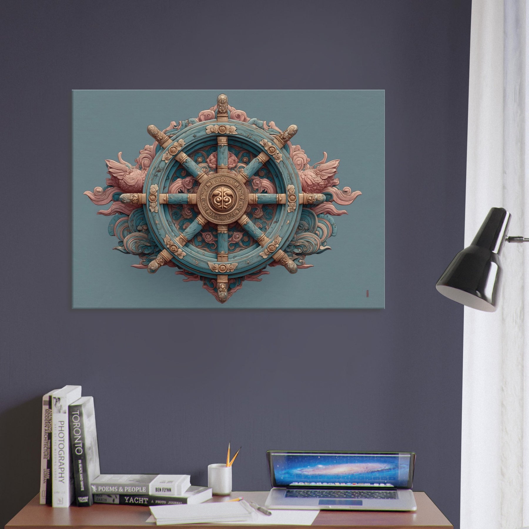 Enter a sanctuary where time slows and breath becomes color. This Dharma Wheel emerges from misty tendrils of cerulean and rose, its spokes turning like a patient cosmos, inviting a gaze to linger, listening for inner currents. Surreal forms swirl around the wheel, mythic tides, soft eddies, and a temple of quiet intention, creating a space that makes a living room feel meditative and awake. Let the mystical aura guide conversations, calming energy, and a sense of spacious possibility in daily life. The central subject is Dharma Wheel (Dharmachakra).