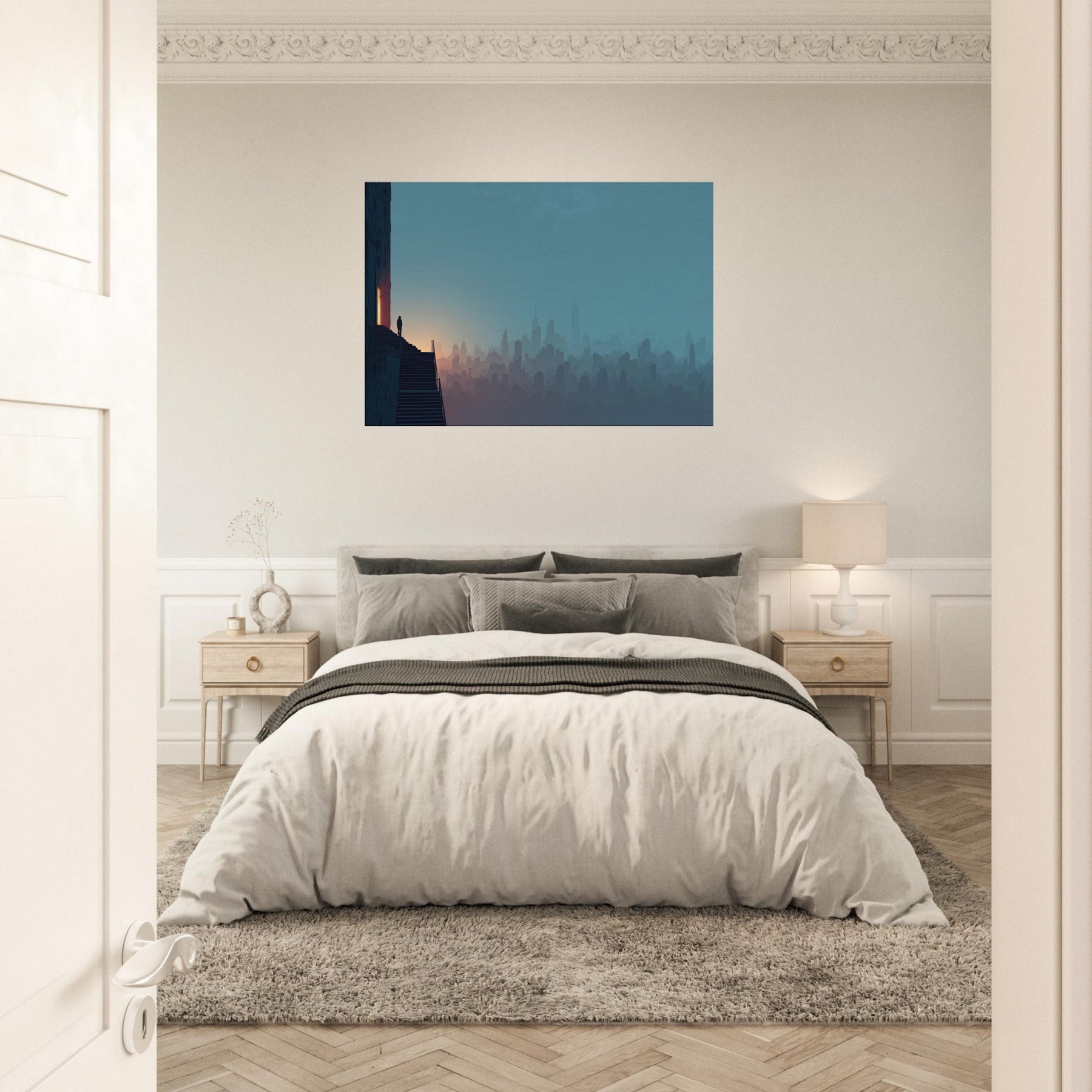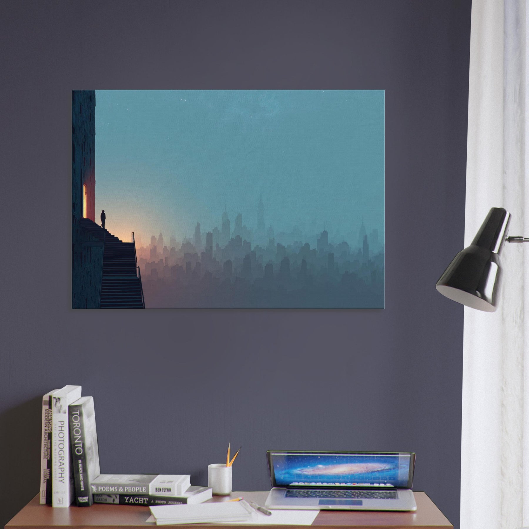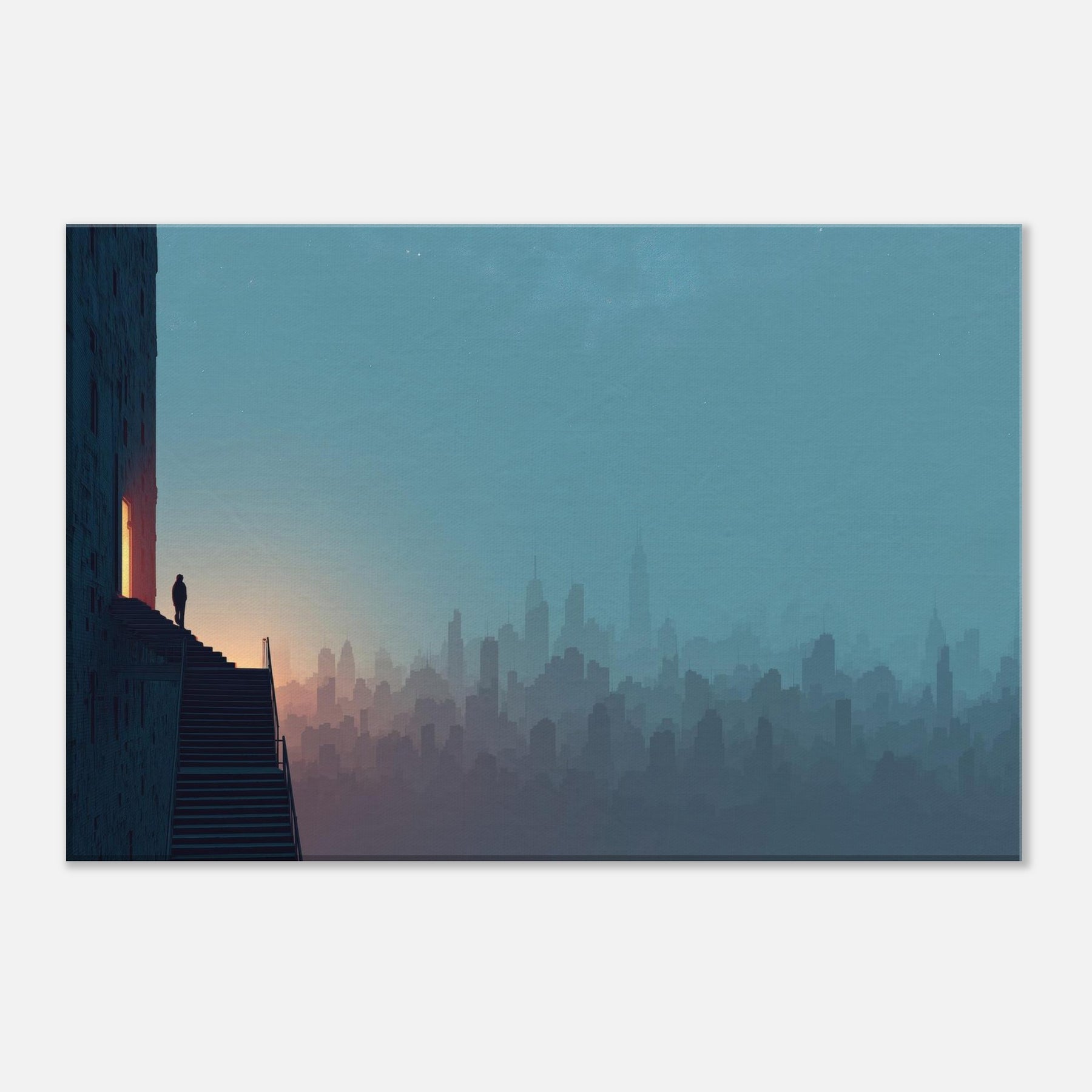 Like a dream traveled along the horizon, this City Skyline Silhouette unfolds in soft layers of dusk and dawn. The surreal composition invites your eye to drift between architecture and atmosphere, where stairs and windows glow with a quiet inner light. Framed by a cool, blue gradient that deepens toward the edge of the room, the artwork lends a contemplative drama to living spaces, elevating entryways, lounges, or studios with cinematic hush and spacious serenity.