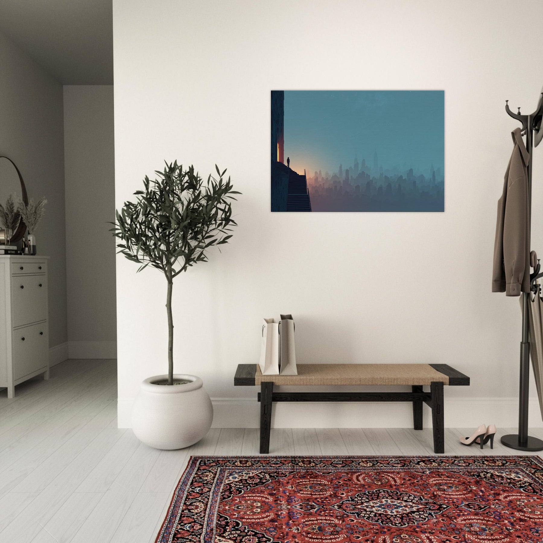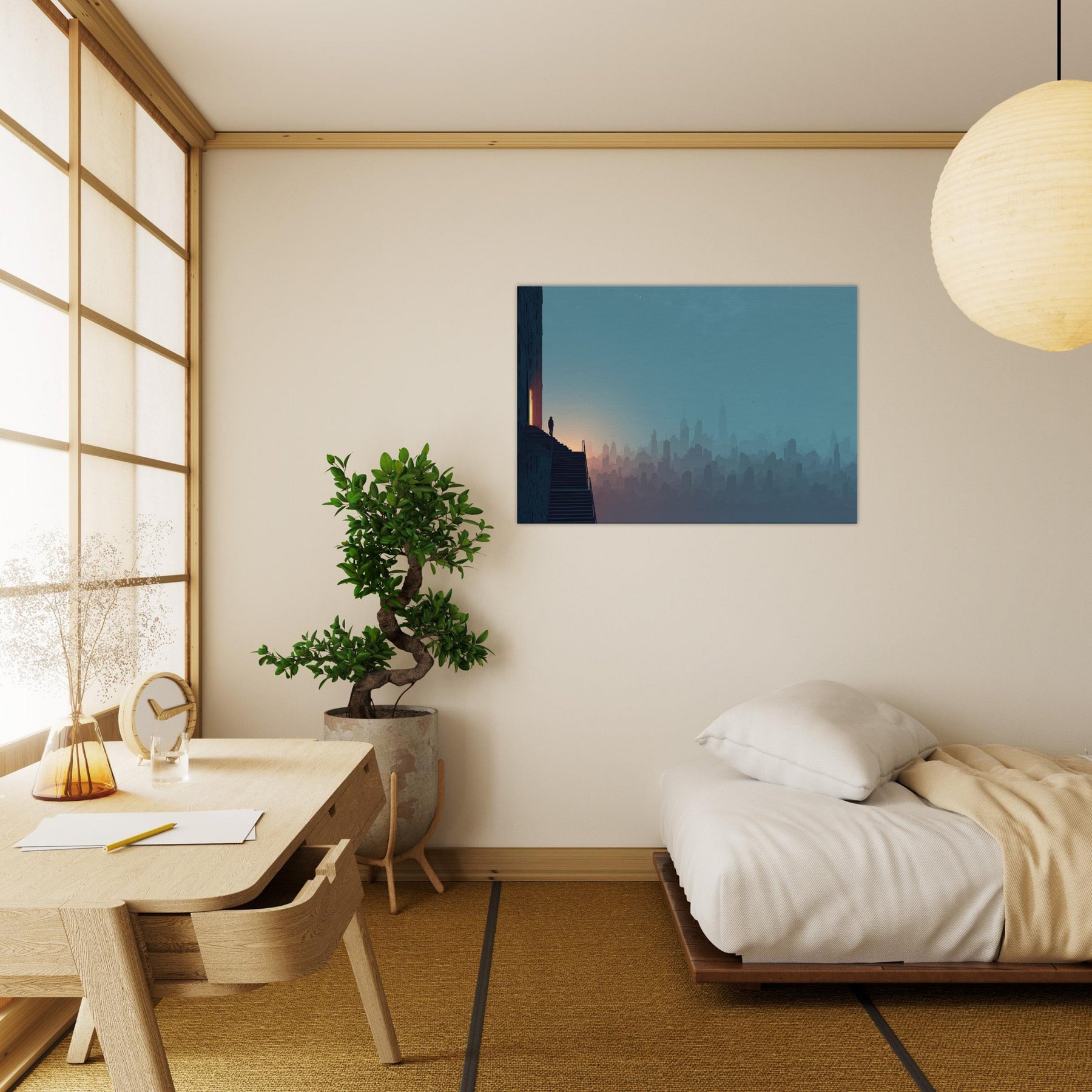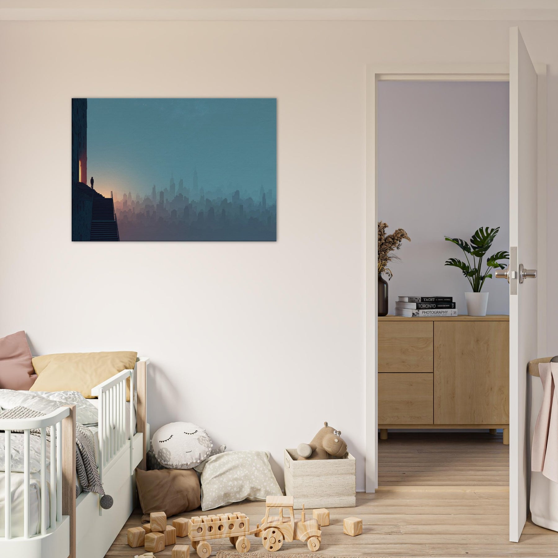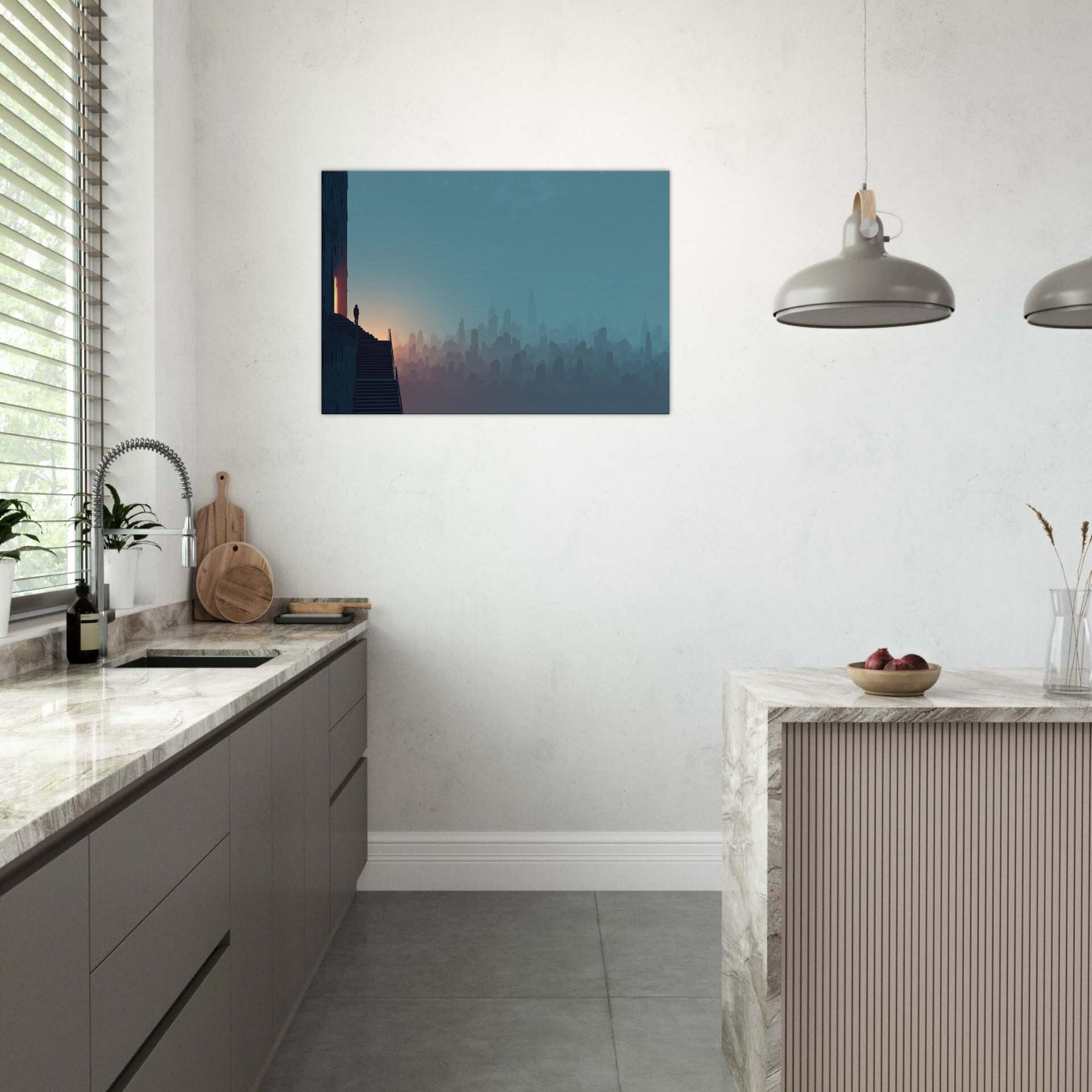 Like a dream traveled along the horizon, this City Skyline Silhouette unfolds in soft layers of dusk and dawn. The surreal composition invites your eye to drift between architecture and atmosphere, where stairs and windows glow with a quiet inner light. Framed by a cool, blue gradient that deepens toward the edge of the room, the artwork lends a contemplative drama to living spaces, elevating entryways, lounges, or studios with cinematic hush and spacious serenity.