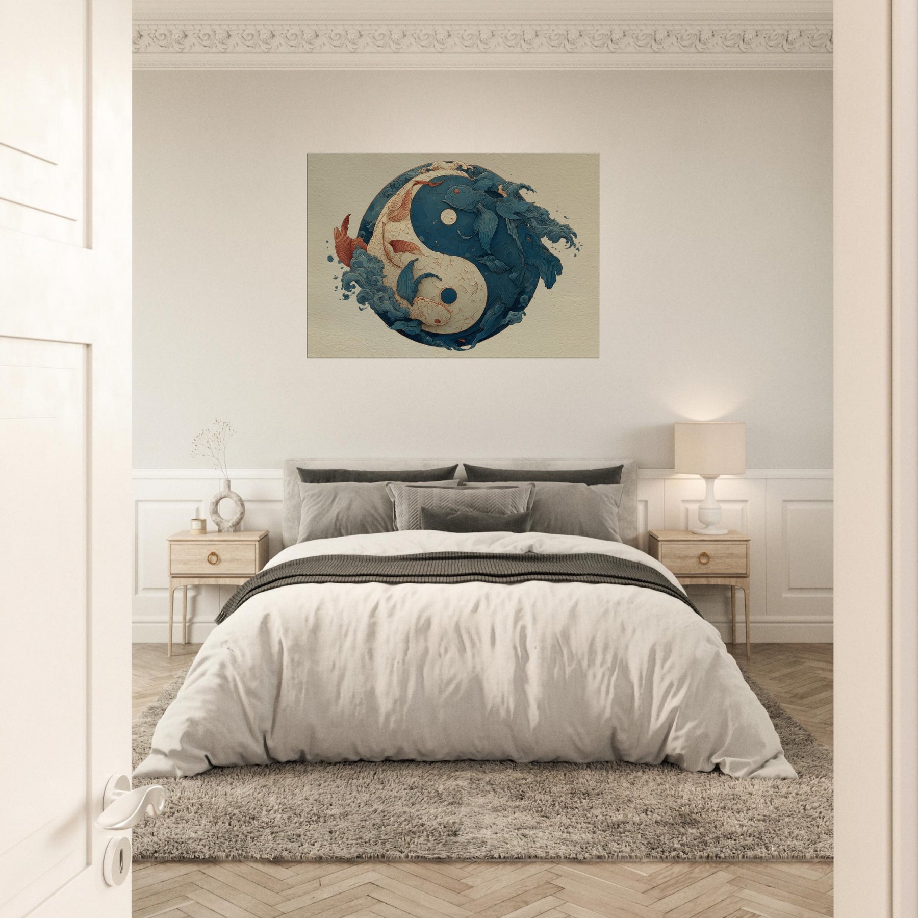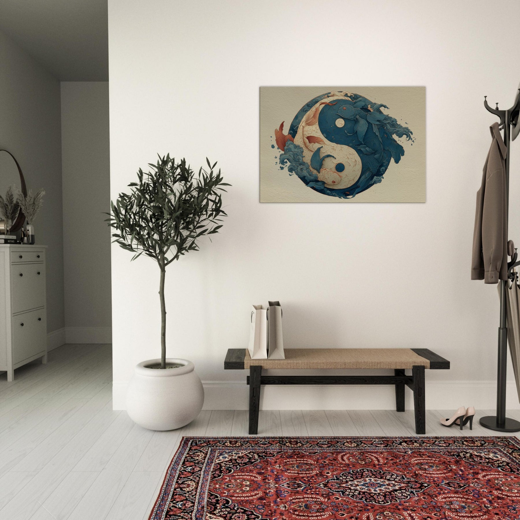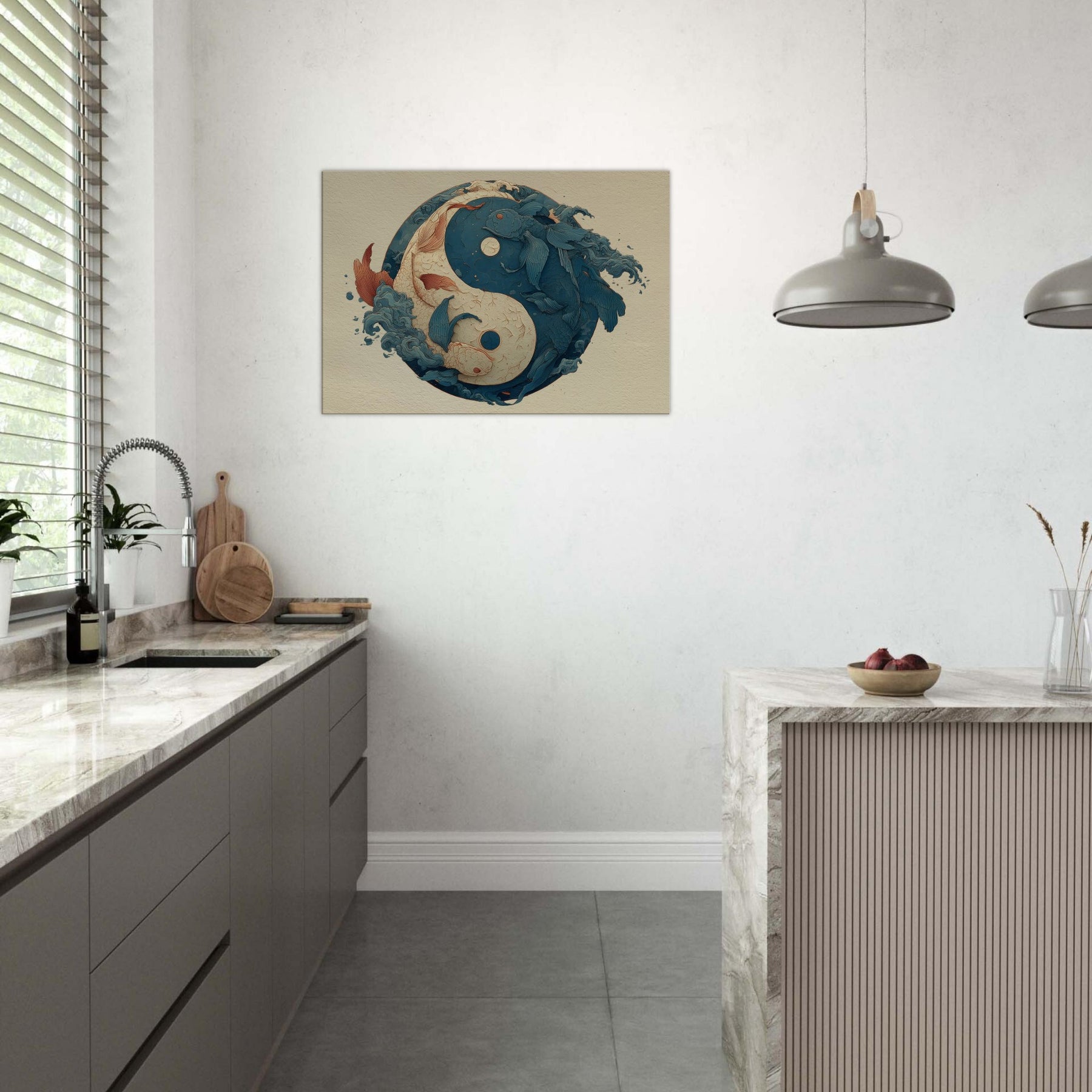 In a world where night and day entwine, Yin Yang becomes a suspended dream. This surreal composition spirals into a circle of soft terracotta and deep sea blue, where sculpted fish and lunar sigils drift like memory. The piece hums with hush and tide, inviting contemplation beside a sofa or study. Its tactile crackle and hushed sheen catch light, shifting with moods and seasons, turning a room into a quiet sanctuary of balance, mystery, and muted wonder.