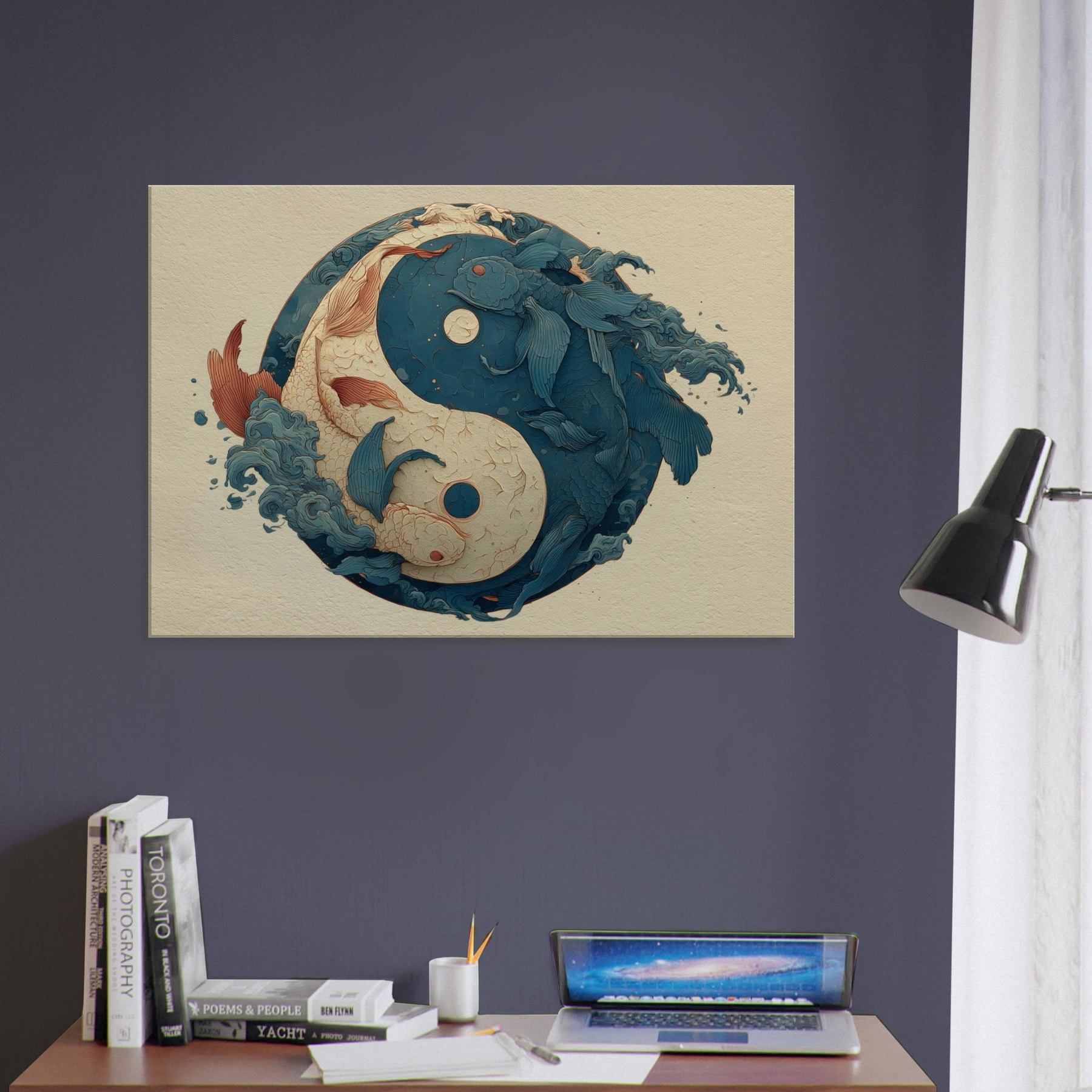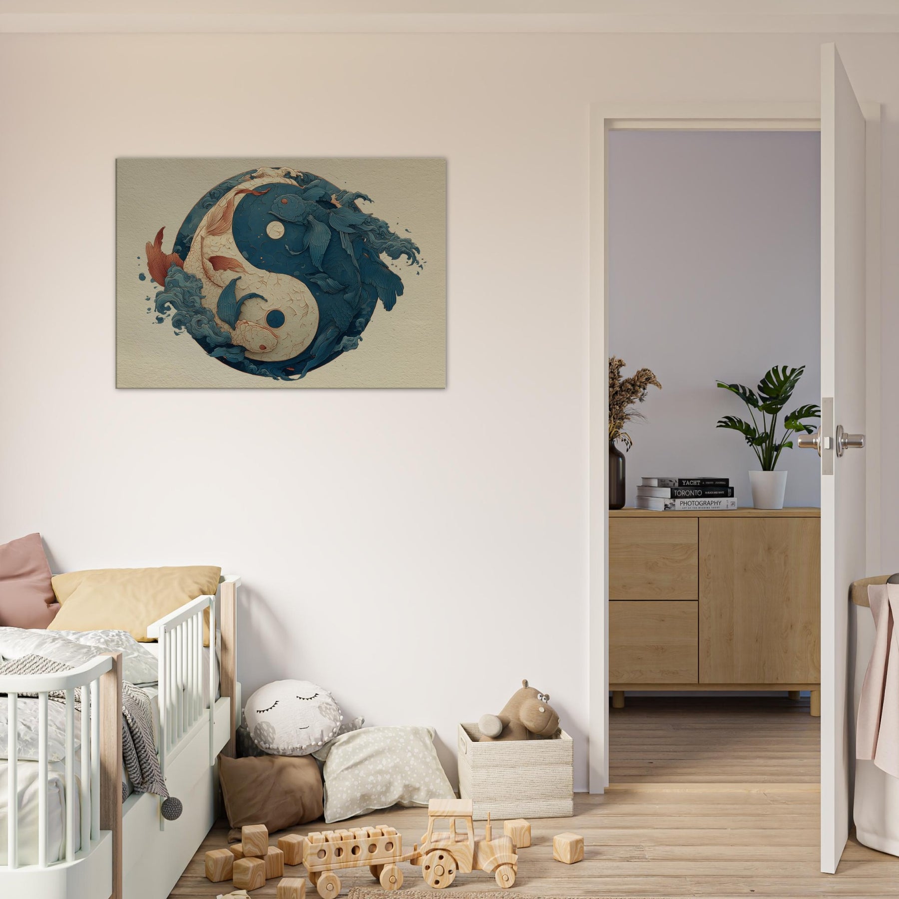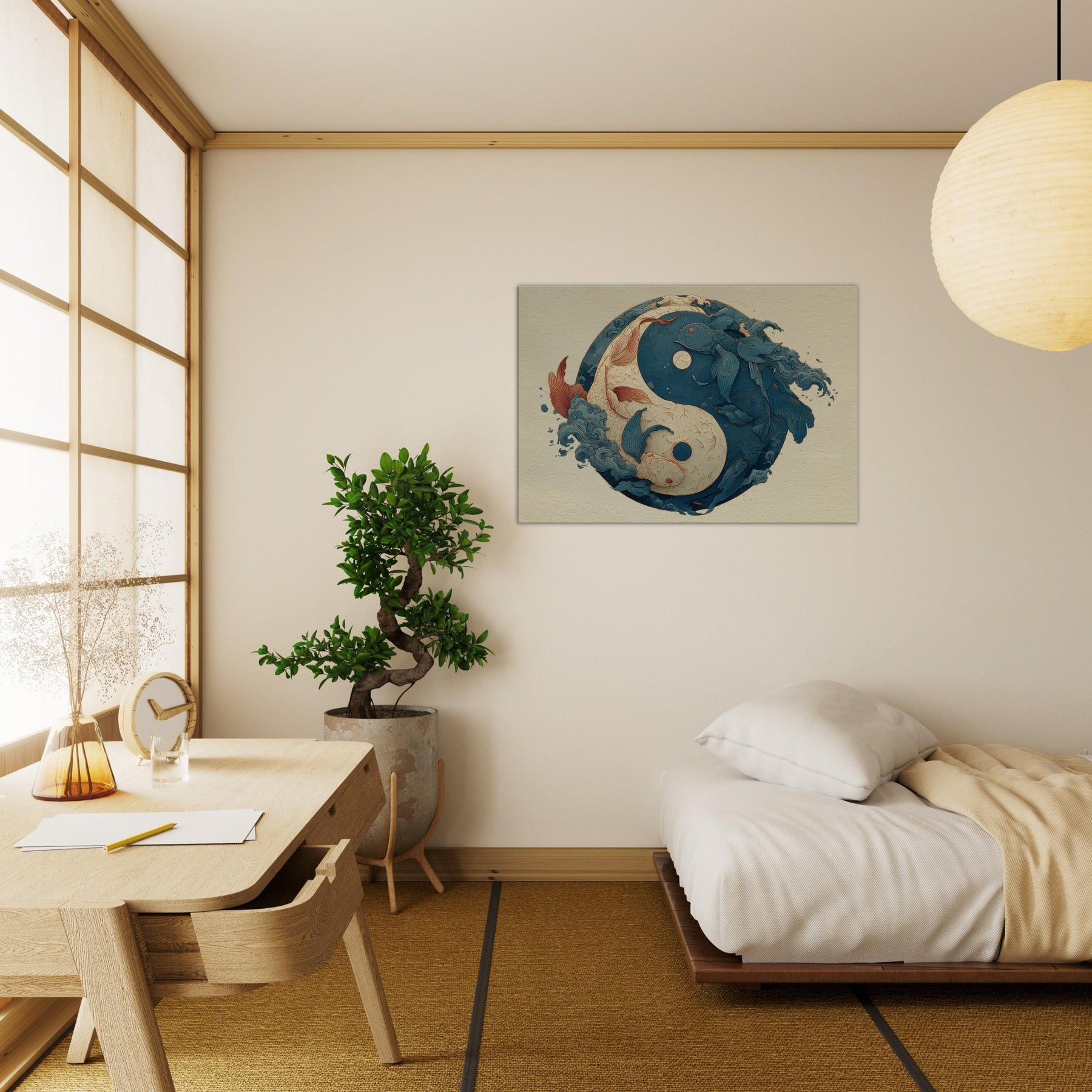 In a world where night and day entwine, Yin Yang becomes a suspended dream. This surreal composition spirals into a circle of soft terracotta and deep sea blue, where sculpted fish and lunar sigils drift like memory. The piece hums with hush and tide, inviting contemplation beside a sofa or study. Its tactile crackle and hushed sheen catch light, shifting with moods and seasons, turning a room into a quiet sanctuary of balance, mystery, and muted wonder.