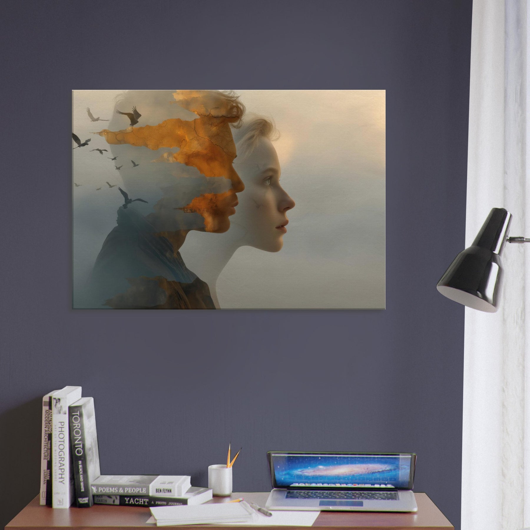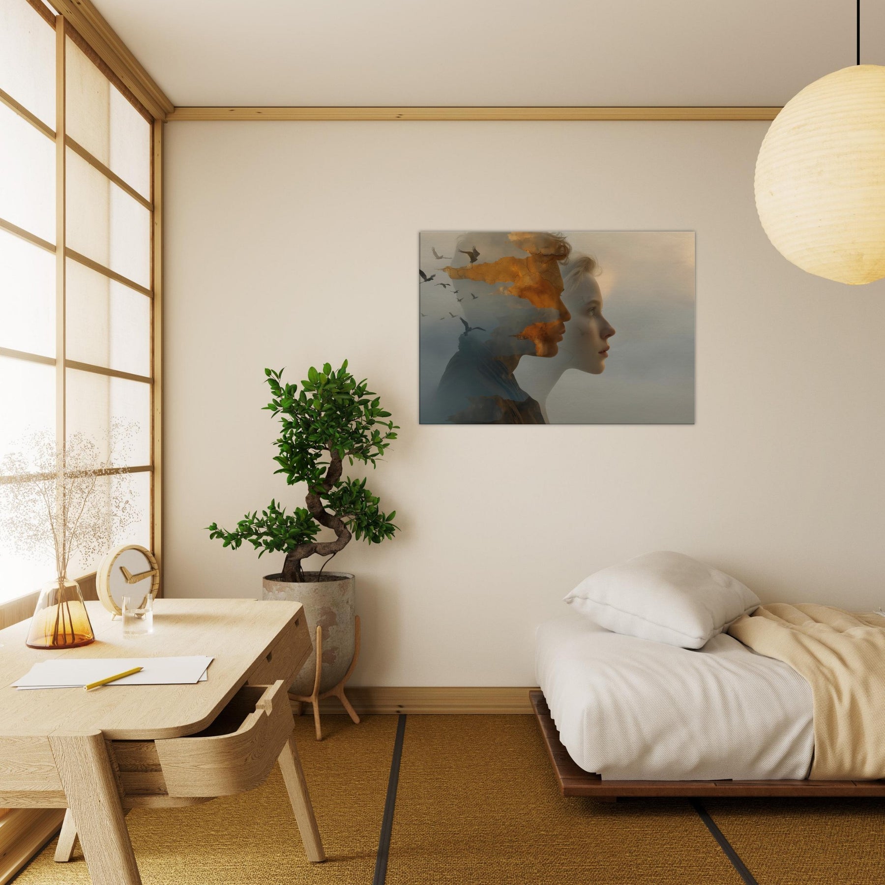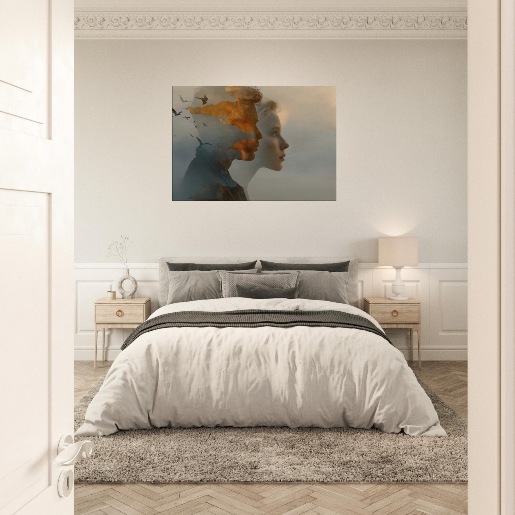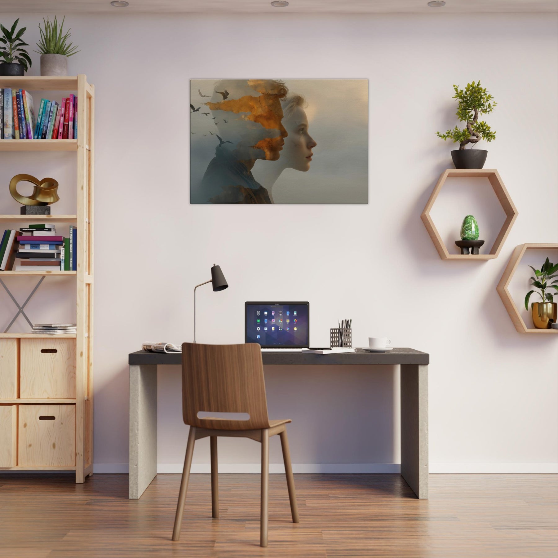Immerse your space in a quietly dramatic conversation between selves. This piece depicts the Couple Silhouette dissolving into a dreamlike horizon, where warm light and shadow morph into birds, clouds, and contour lines. The surreal layering invites slow, lingering gaze, turning a wall into a mood tender, intelligent, and slightly uncanny. Hang it where intimate energy should flow: a living room alcove, a bedroom nook, or an entry that welcomes reflection as daylight softens into evening.