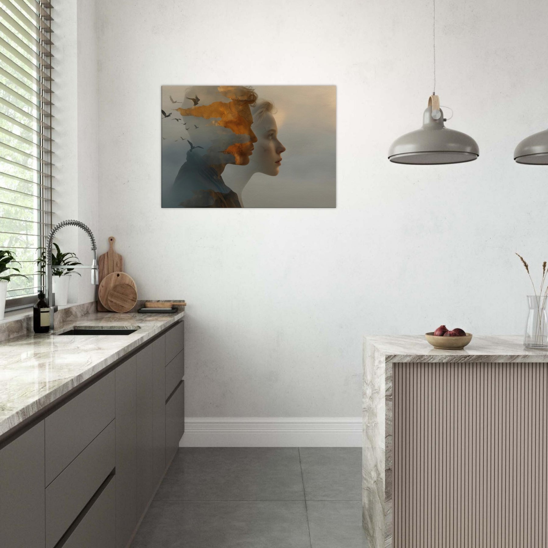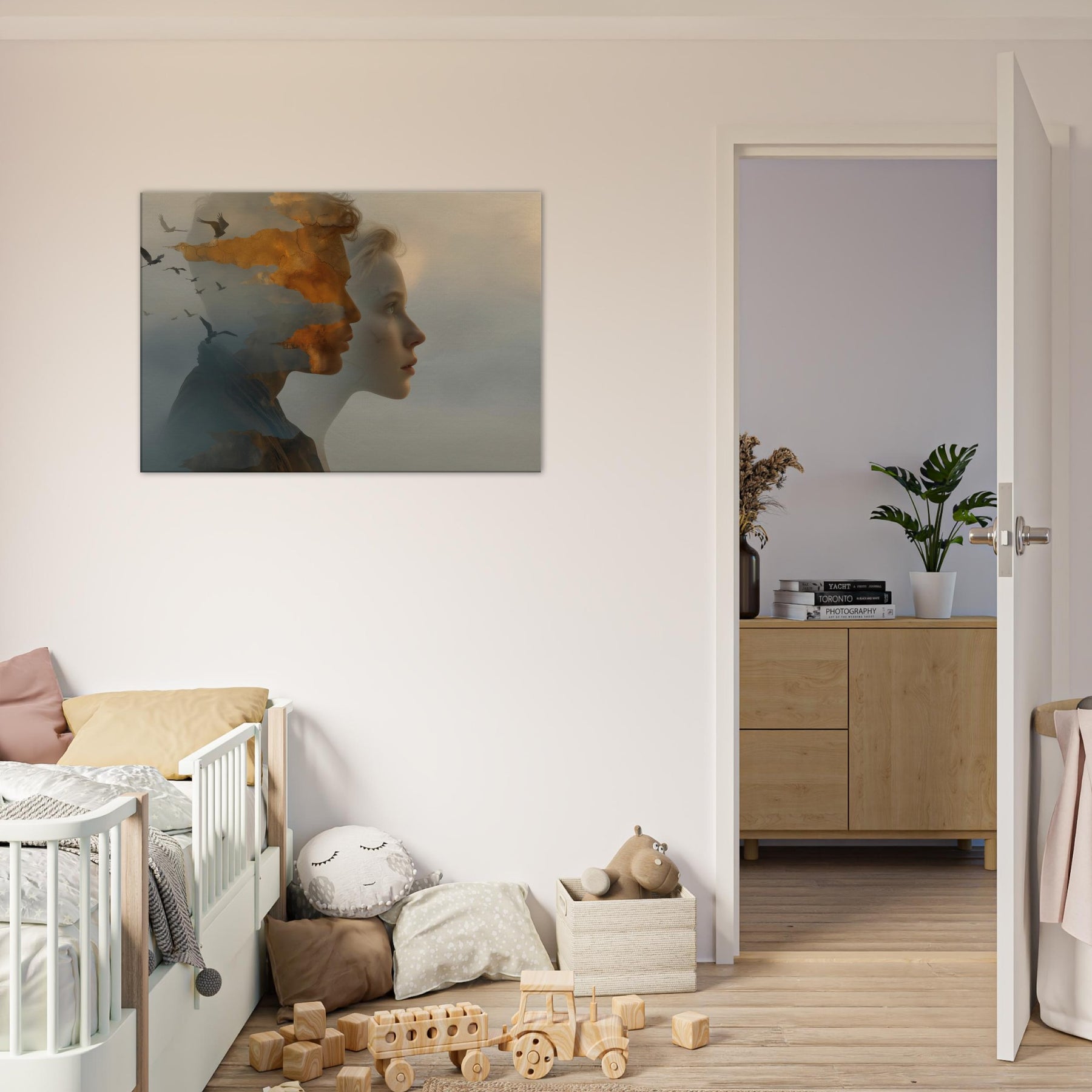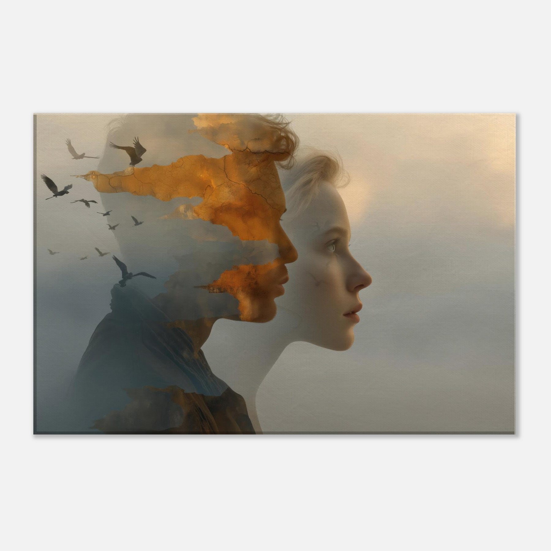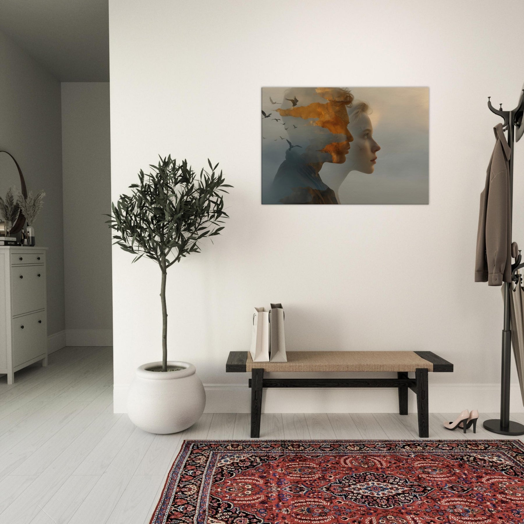 Immerse your space in a quietly dramatic conversation between selves. This piece depicts the Couple Silhouette dissolving into a dreamlike horizon, where warm light and shadow morph into birds, clouds, and contour lines. The surreal layering invites slow, lingering gaze, turning a wall into a mood tender, intelligent, and slightly uncanny. Hang it where intimate energy should flow: a living room alcove, a bedroom nook, or an entry that welcomes reflection as daylight softens into evening.