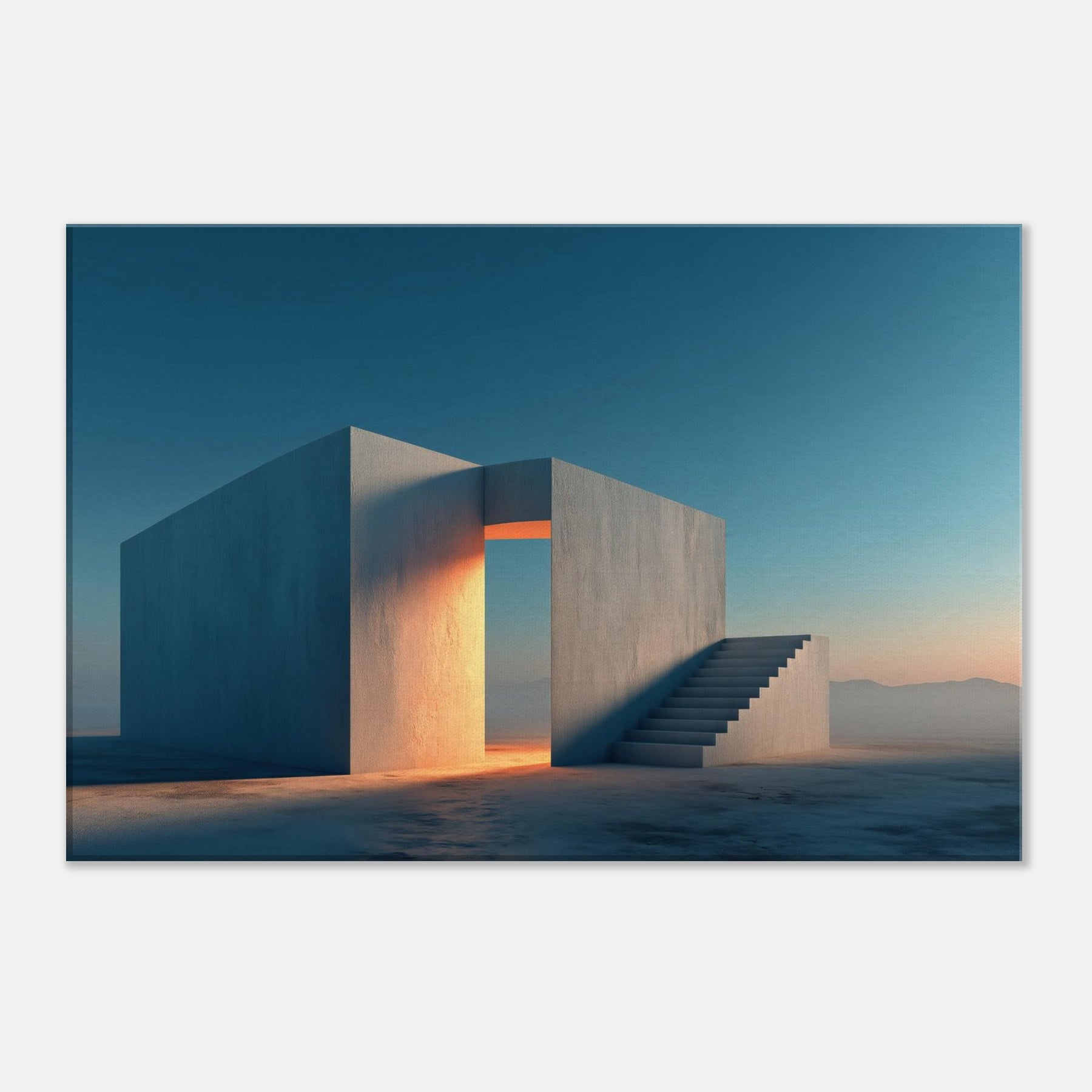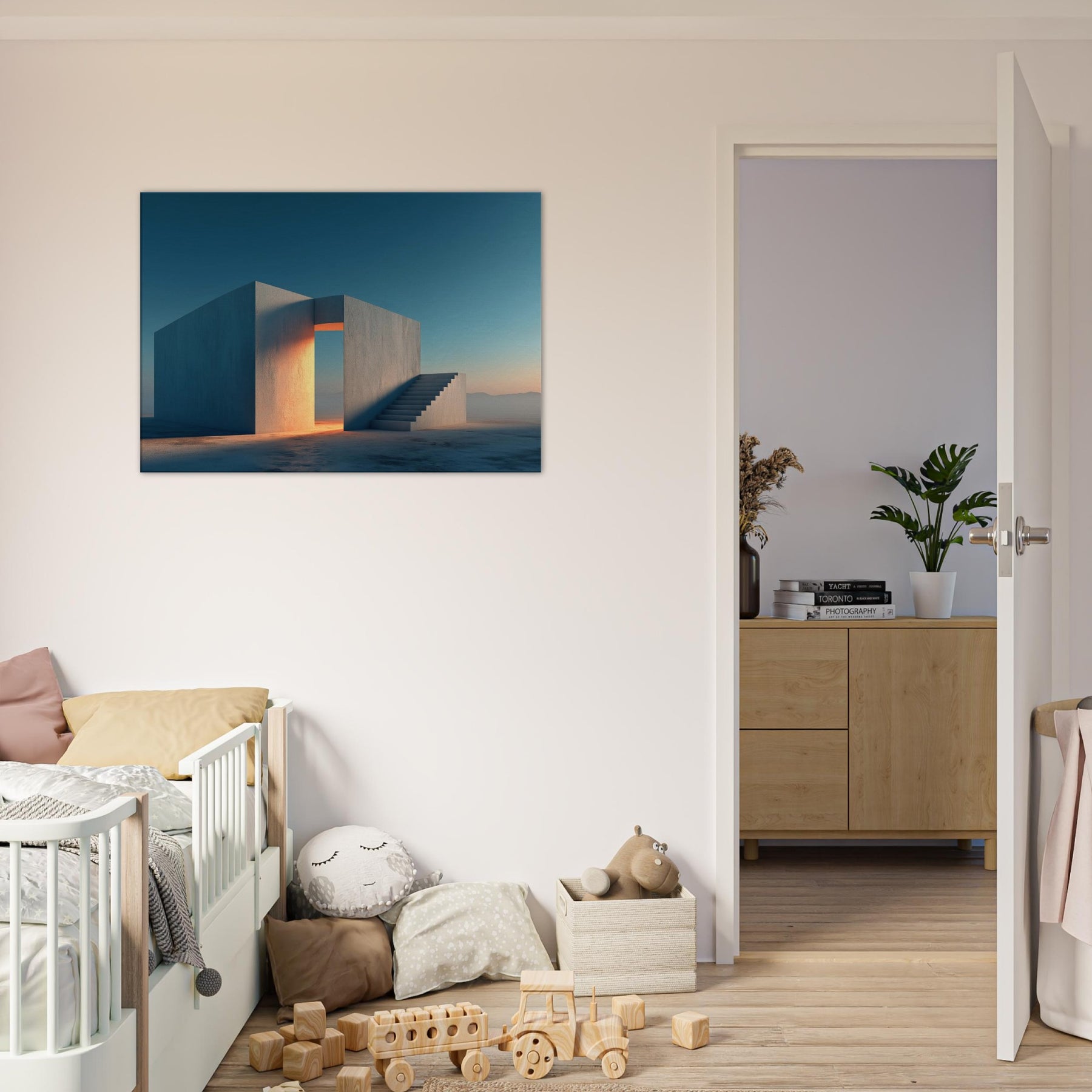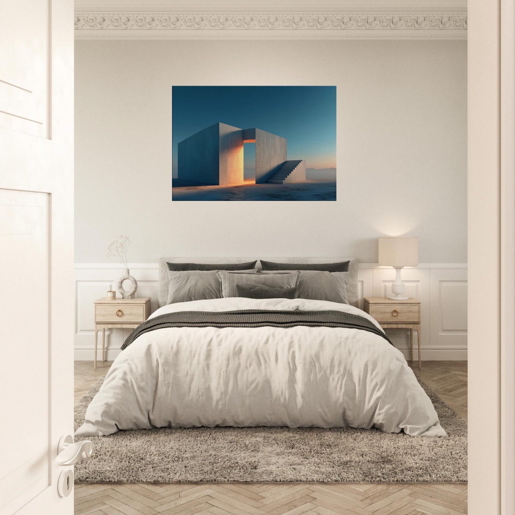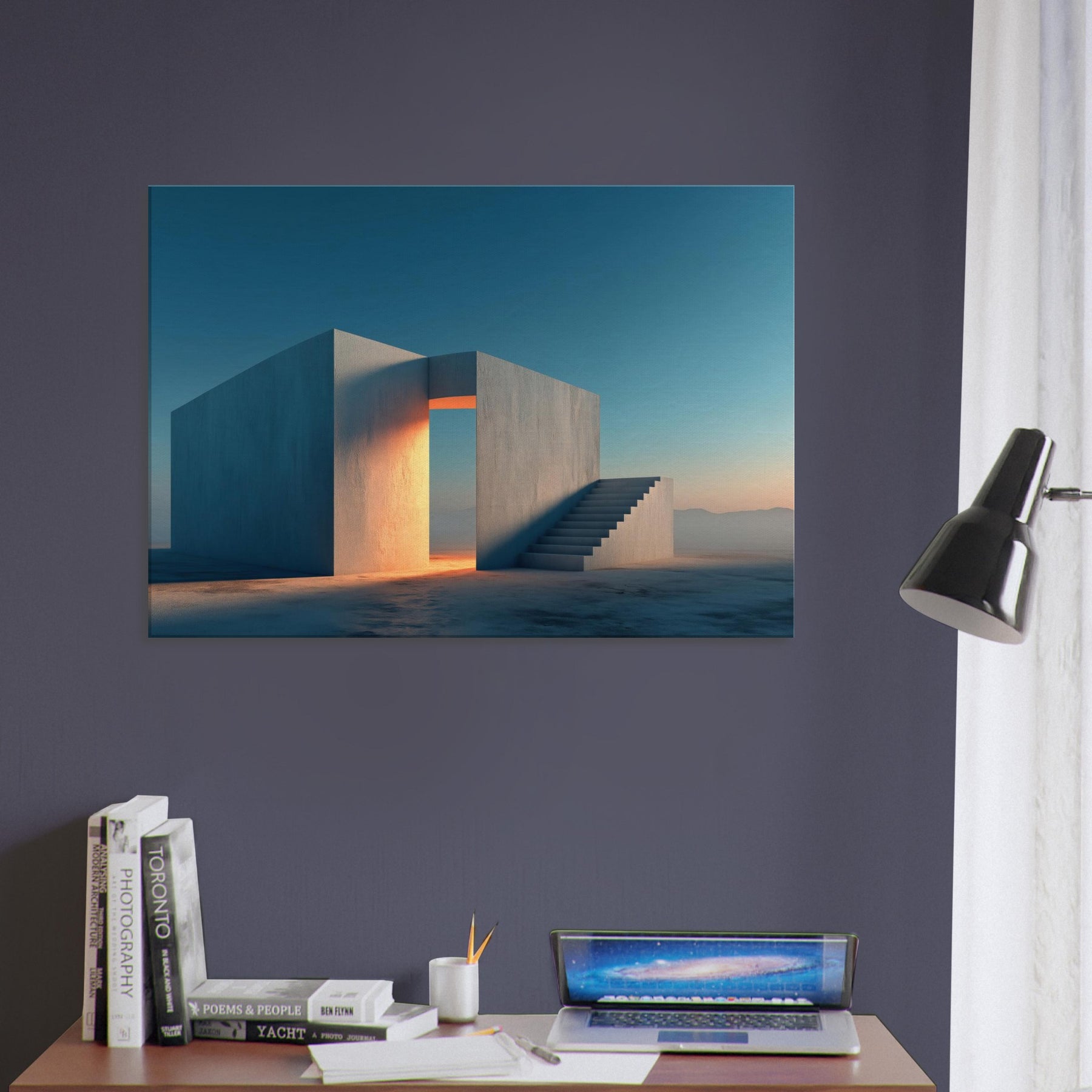 Step into a dream where Santorini's pale blocks meet a horizon that blurs into the edge of imagination. This surreal composition folds light as if it were a living sculpture: warm sun slips through a doorway, cool shadows drift along clean lines, and a staircase leads nowhere yet invites possibility. Perfect for a living room or study, the piece nourishes calm focus, elevates conversations, and infuses walls with a quiet, sun kissed drama.