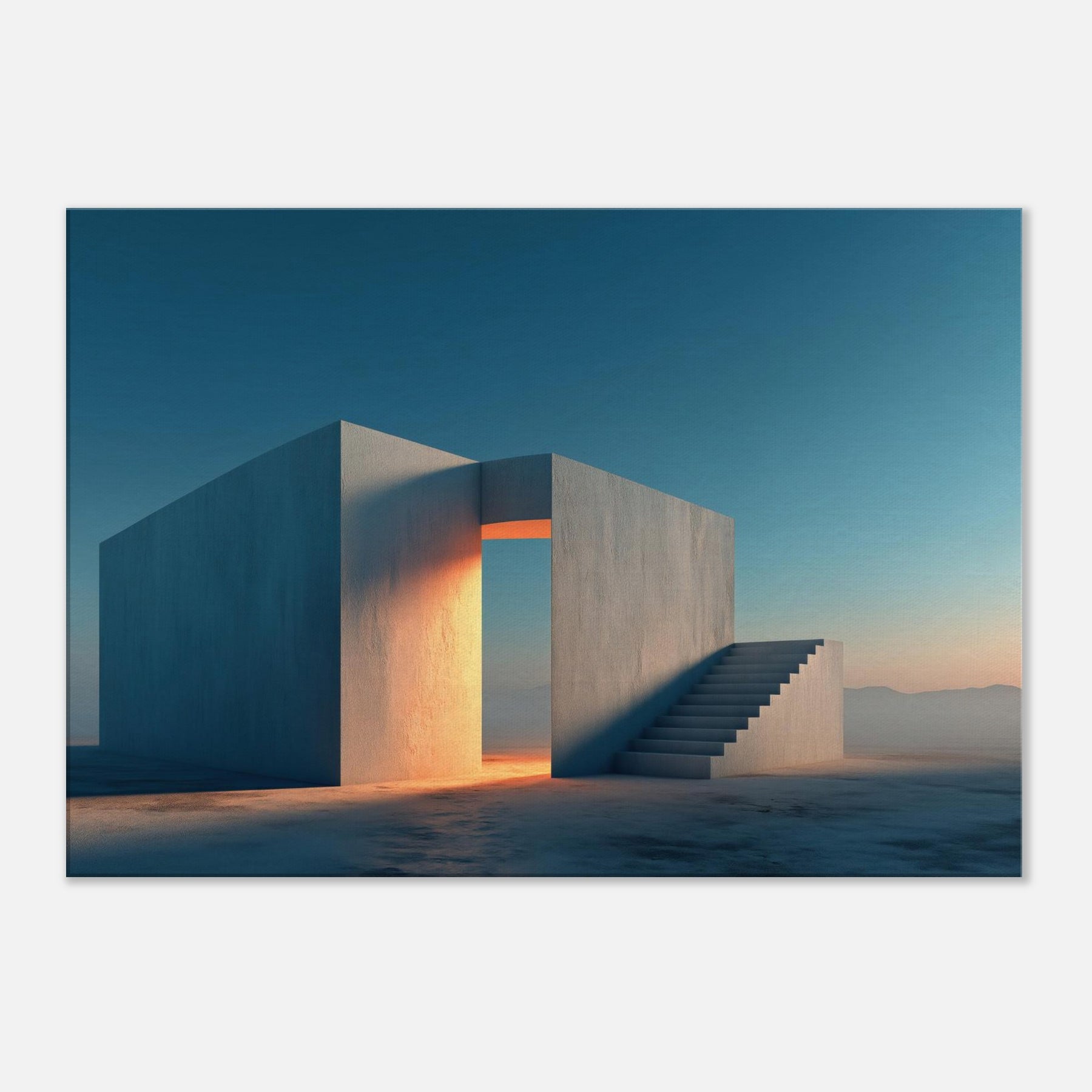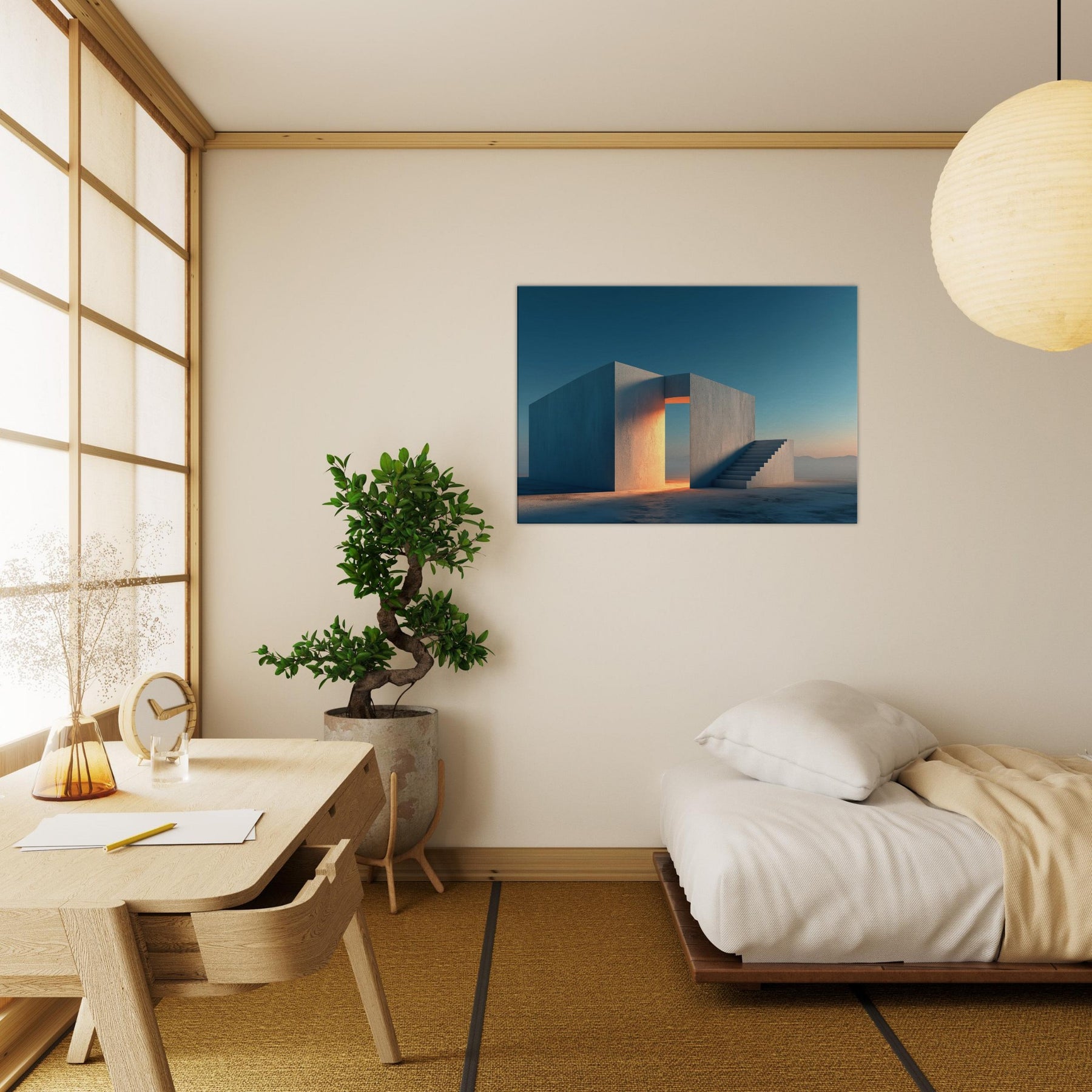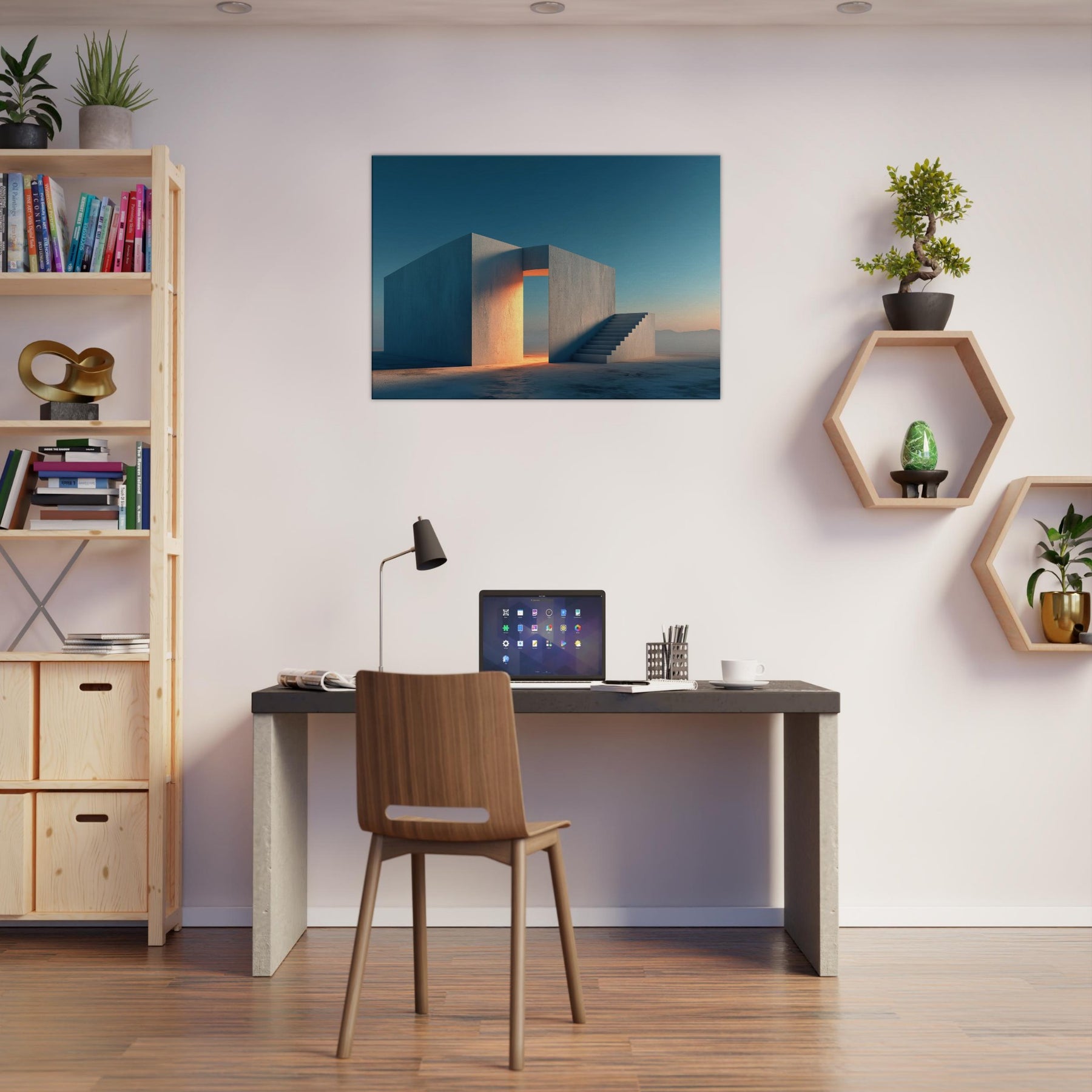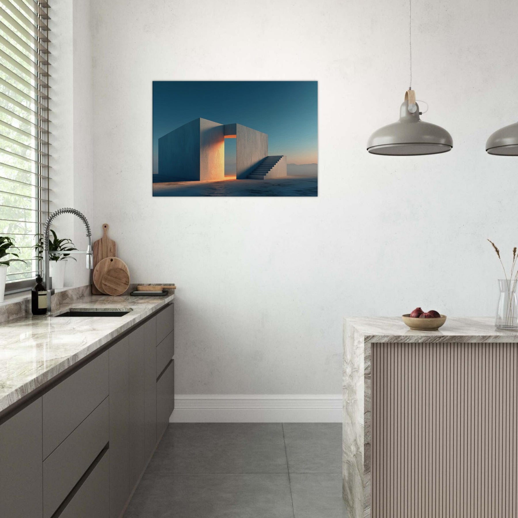 Step into a dream where Santorini's pale blocks meet a horizon that blurs into the edge of imagination. This surreal composition folds light as if it were a living sculpture: warm sun slips through a doorway, cool shadows drift along clean lines, and a staircase leads nowhere yet invites possibility. Perfect for a living room or study, the piece nourishes calm focus, elevates conversations, and infuses walls with a quiet, sun kissed drama.