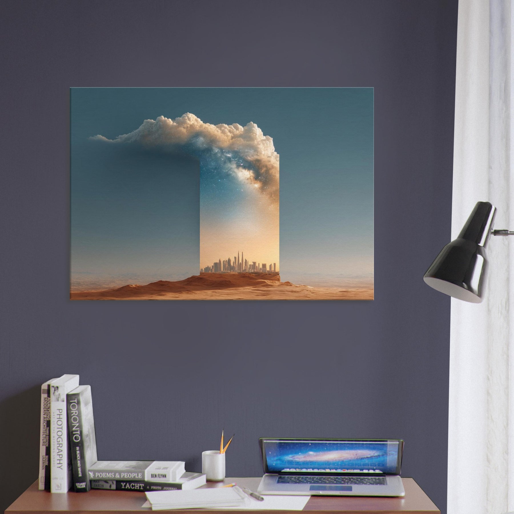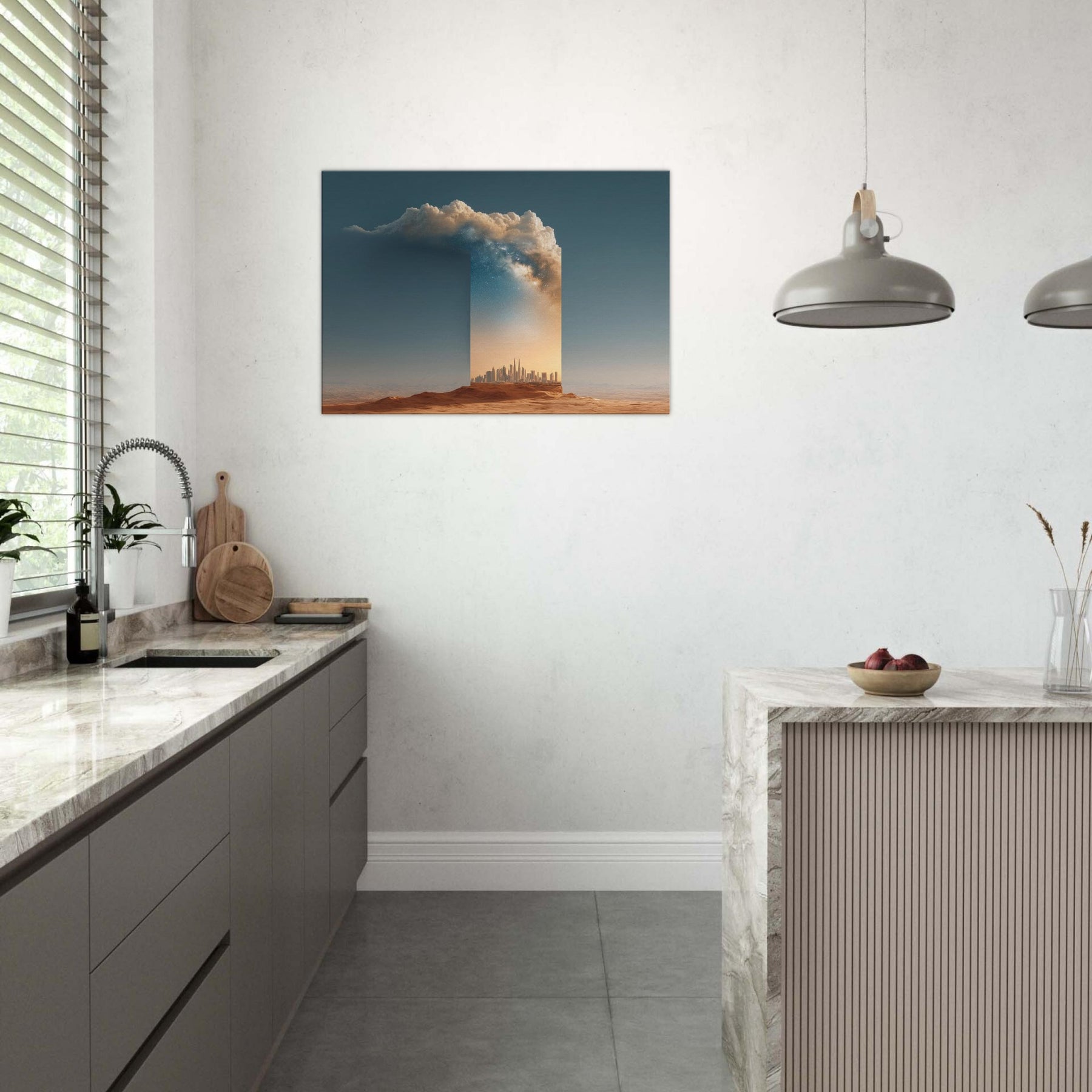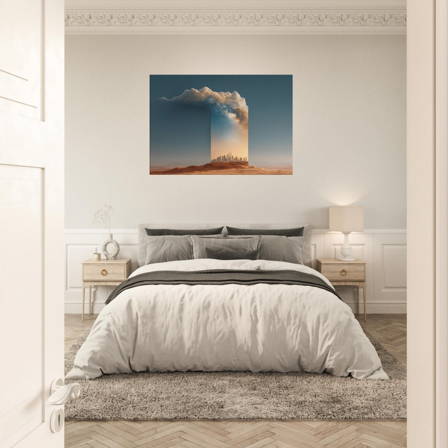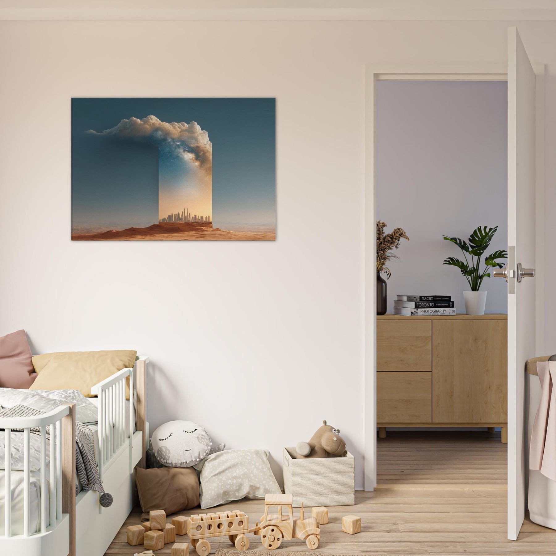 Singapore unfolds through a dreamlike portal, where a strip of skyline rises from desert sands inside a narrow window, topped by a cloud and a shimmer of starlight. The surreal light casts new textures on walls with warm ambers and cool blues, inviting contemplation and calm. This artwork turns any living space into a horizon of possibility, a conversation piece that nurtures imagination while anchoring the room in memory and place Singapore anchored in a larger, cosmic dream.