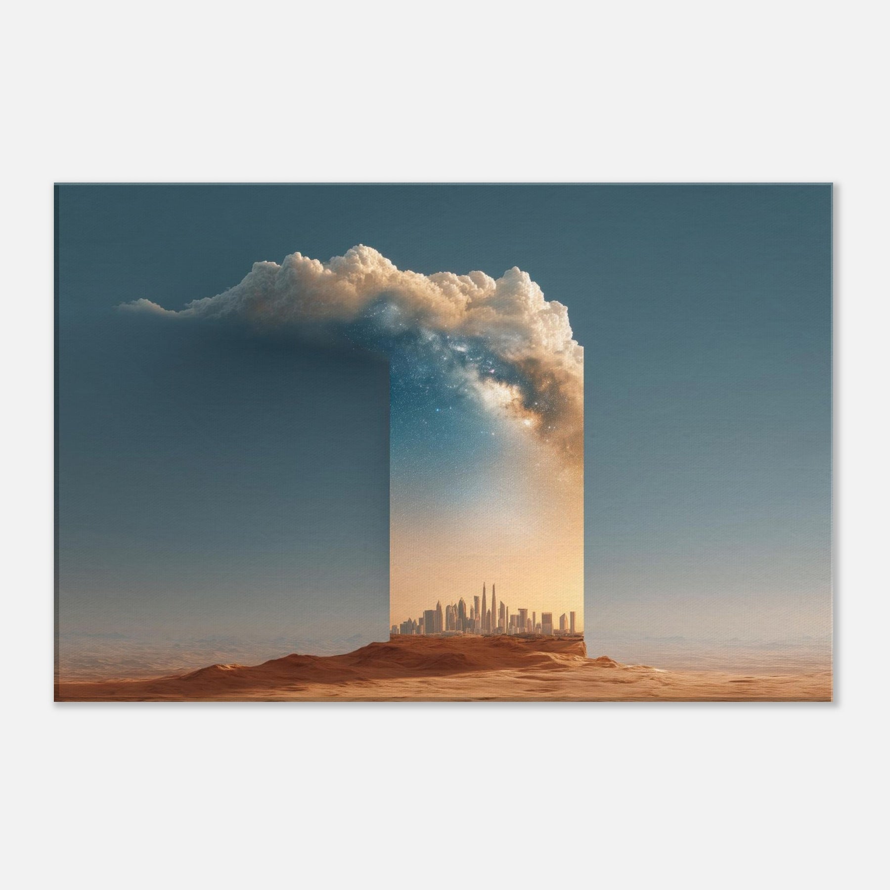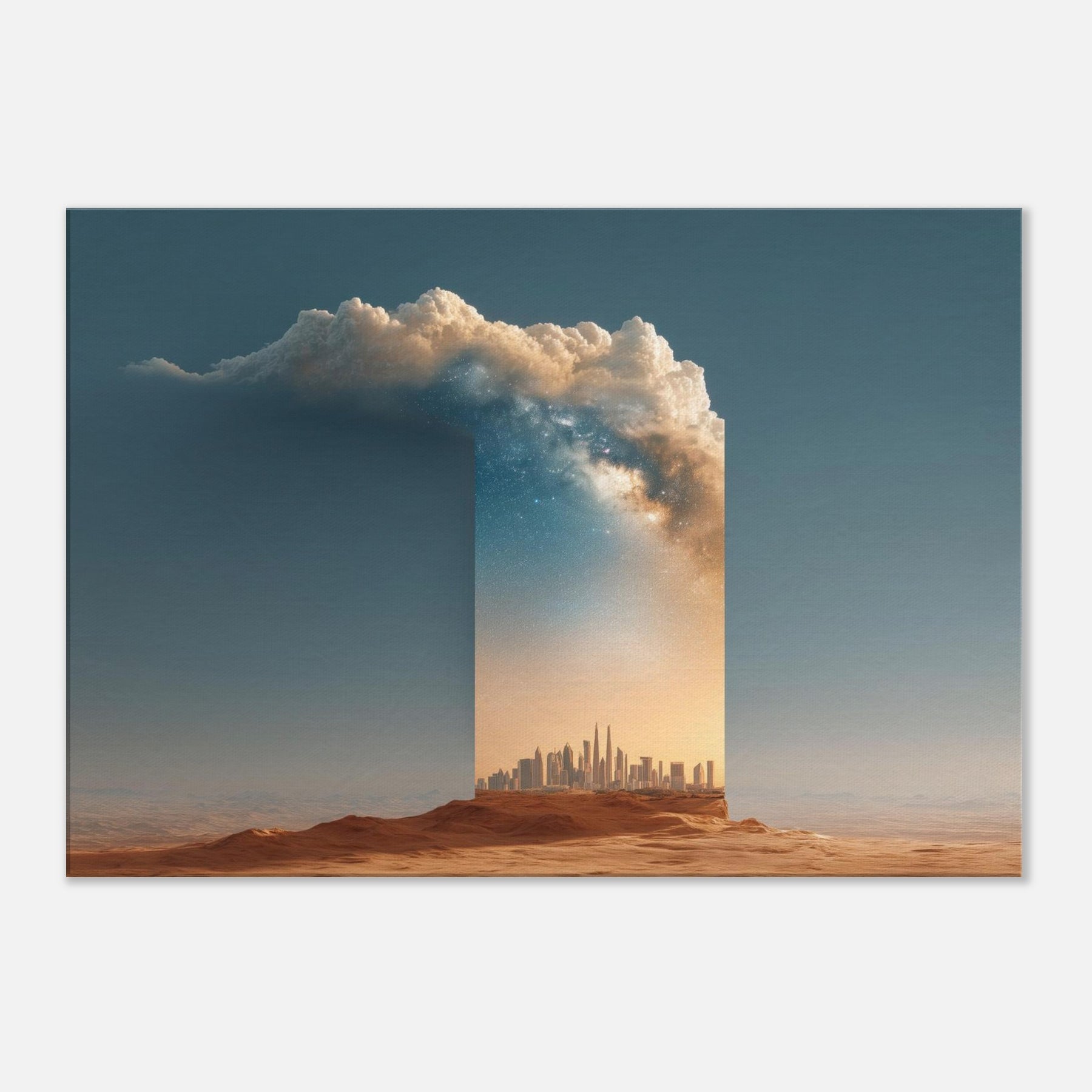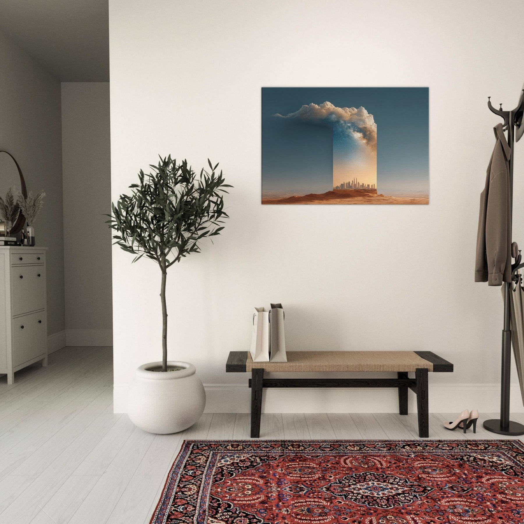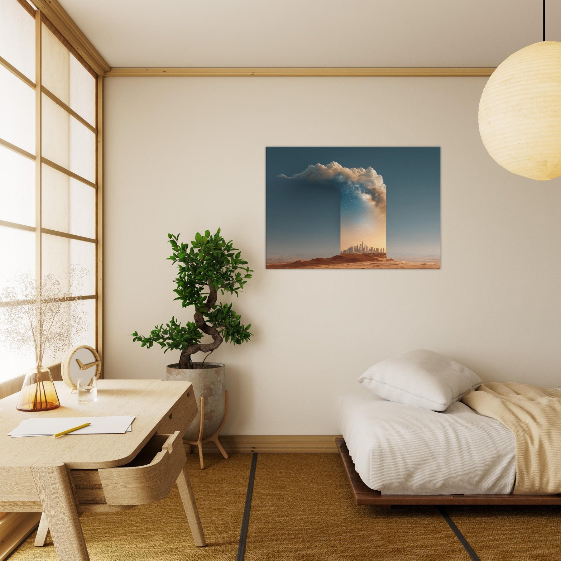 Singapore unfolds through a dreamlike portal, where a strip of skyline rises from desert sands inside a narrow window, topped by a cloud and a shimmer of starlight. The surreal light casts new textures on walls with warm ambers and cool blues, inviting contemplation and calm. This artwork turns any living space into a horizon of possibility, a conversation piece that nurtures imagination while anchoring the room in memory and place Singapore anchored in a larger, cosmic dream.