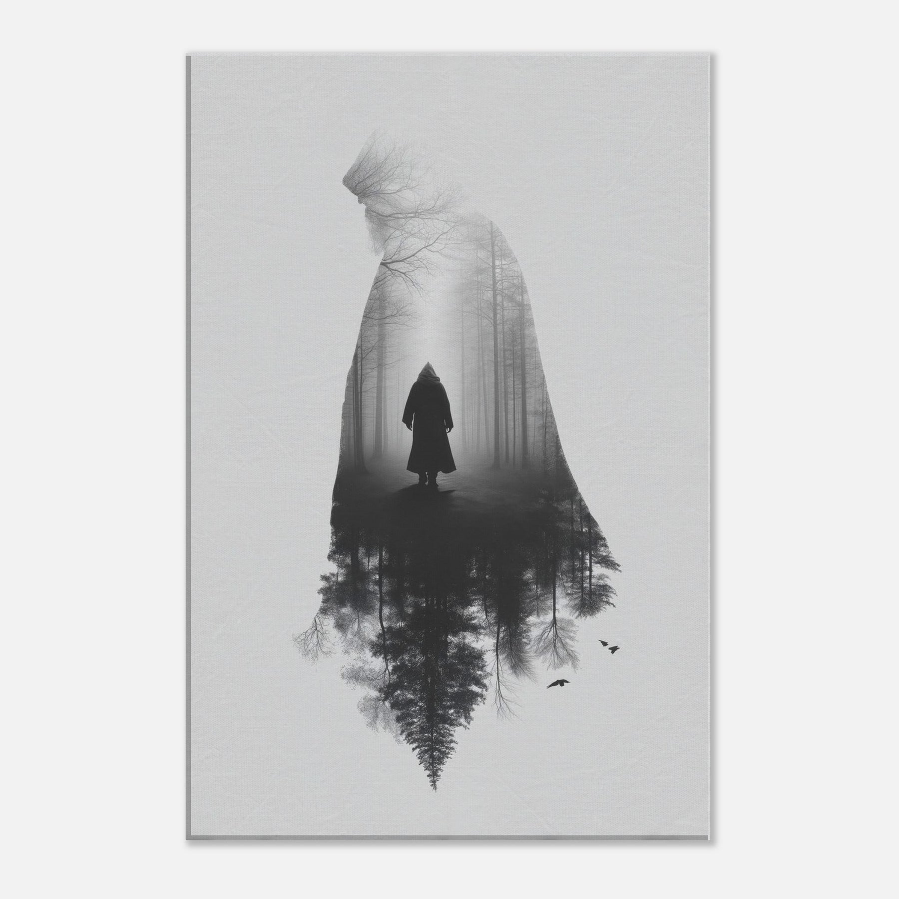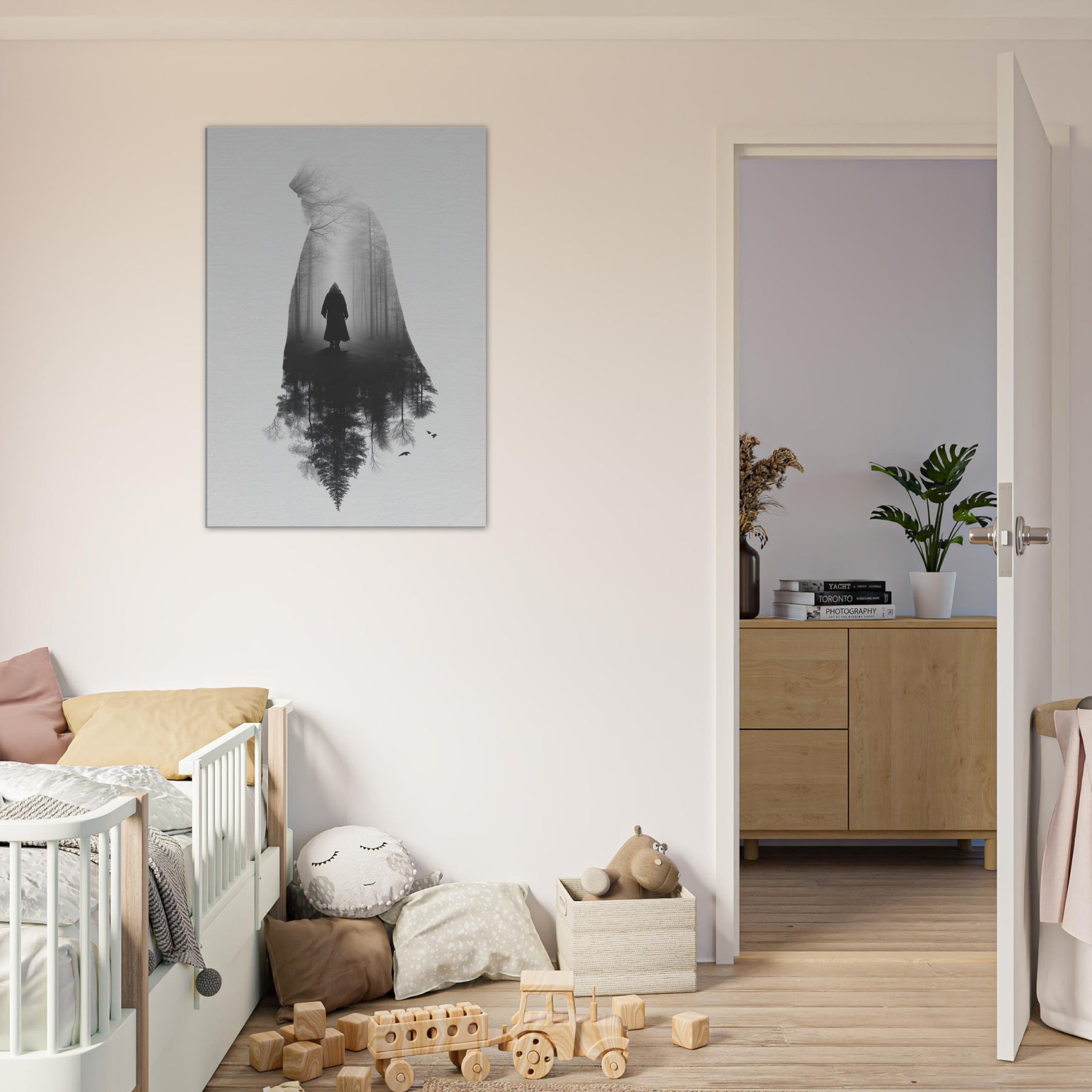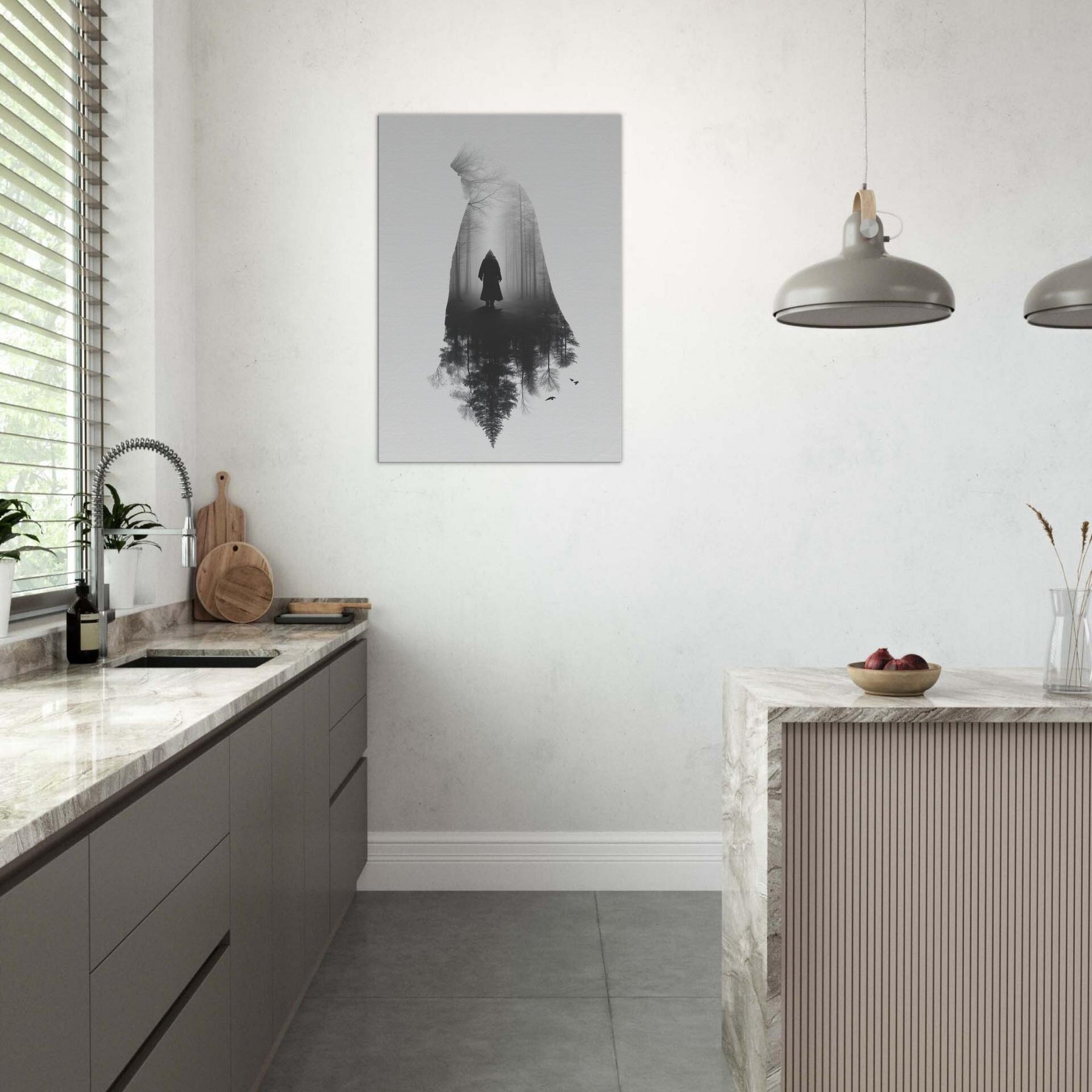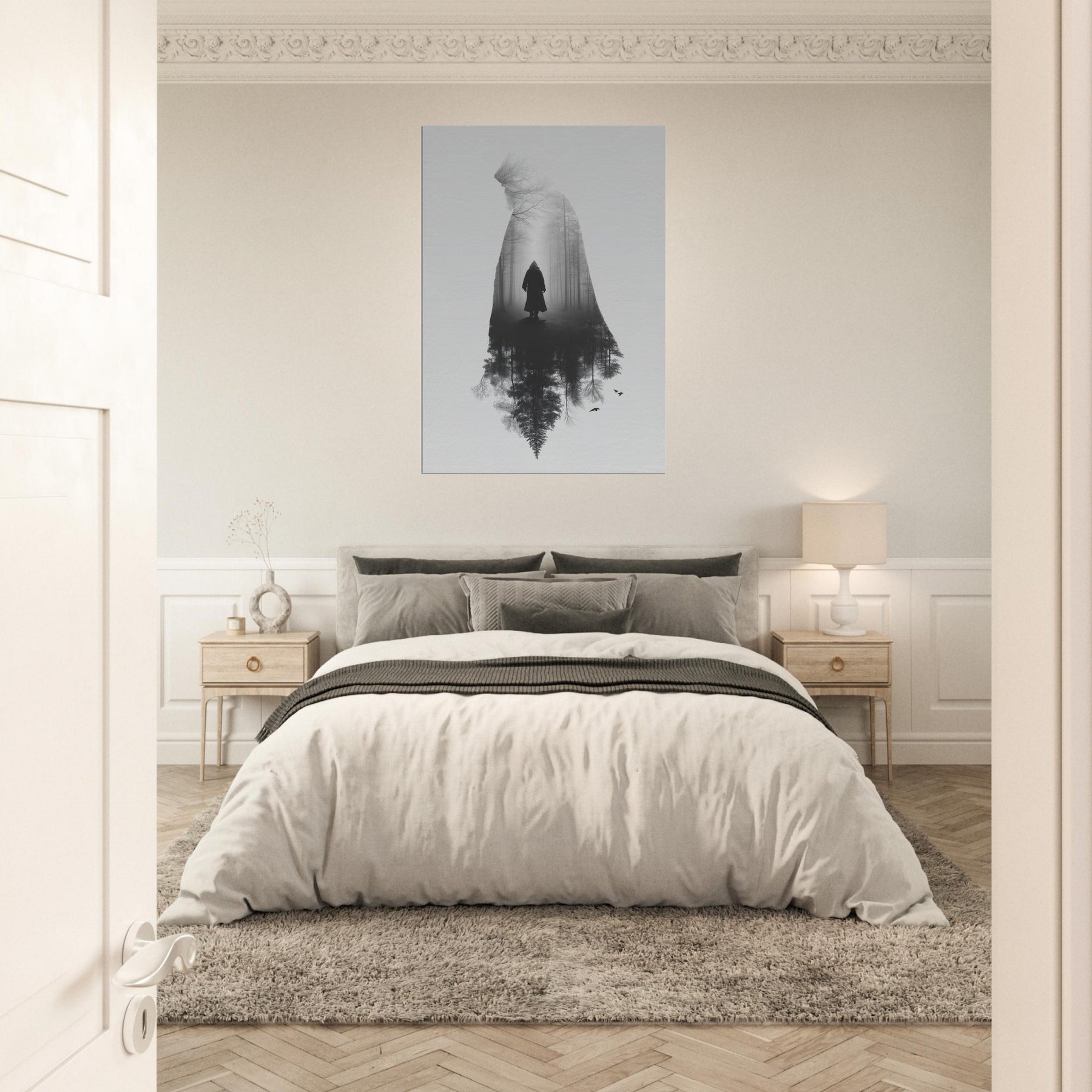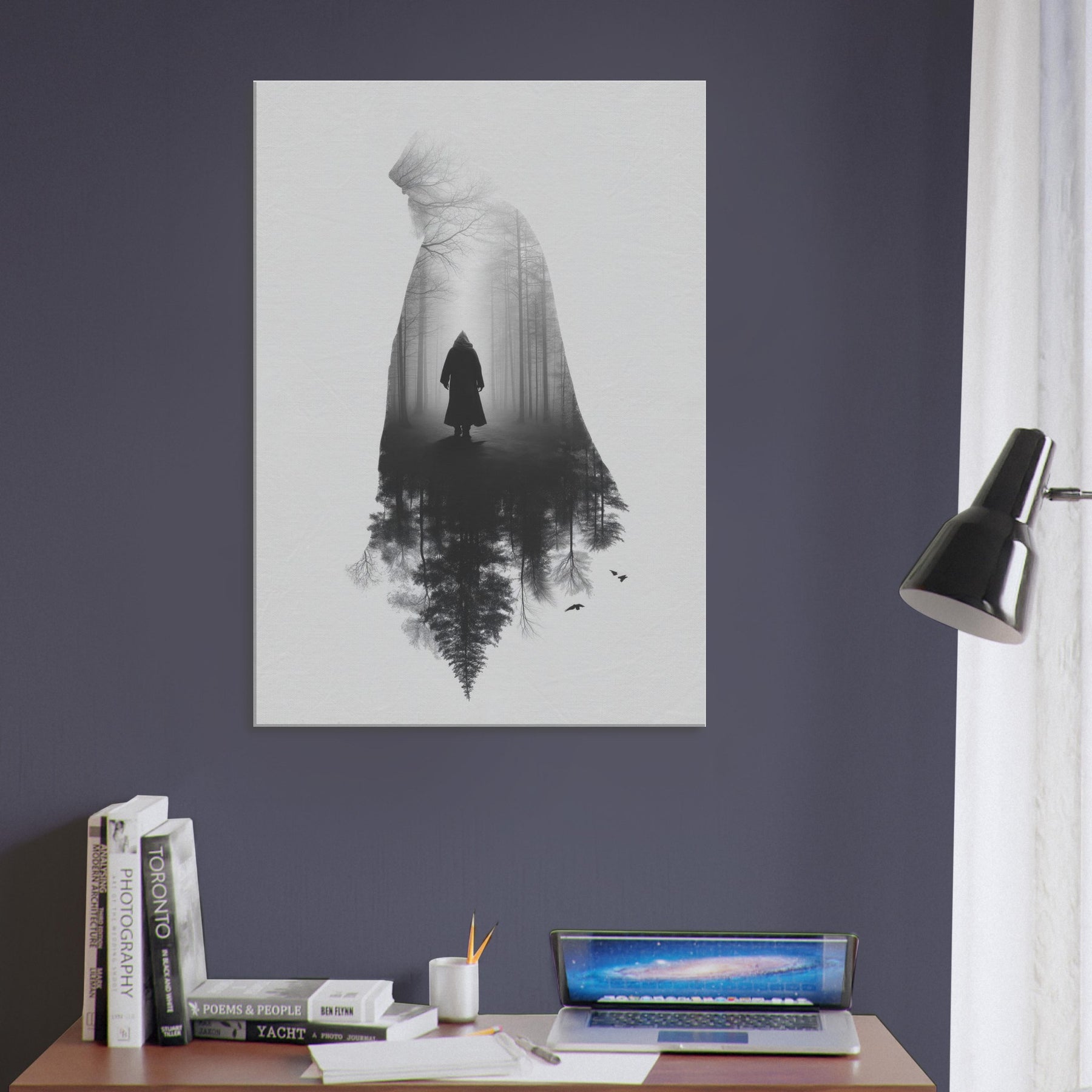 Step into a quiet, snow dusted forge of dreams. This surreal composition folds a solitary figure into the forest silhouette, revealing Odin, the All Father with a long beard and one eye, as if the myth itself walks your wall. Mist and pines blur into a double exposure of awe, inviting stillness and reflection. Ideal for living rooms or study corners, it casts a timeless, Nordic glow, turning everyday spaces into gateways for storytelling and quiet contemplation.