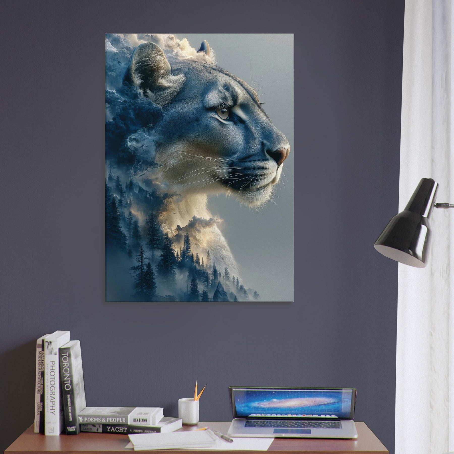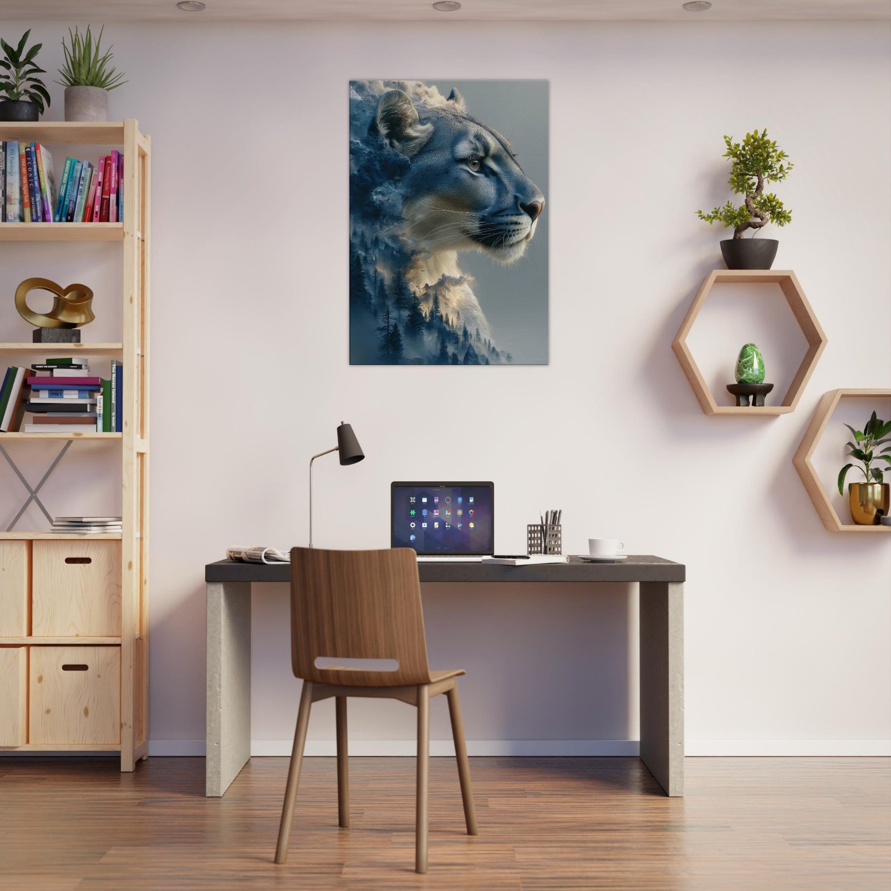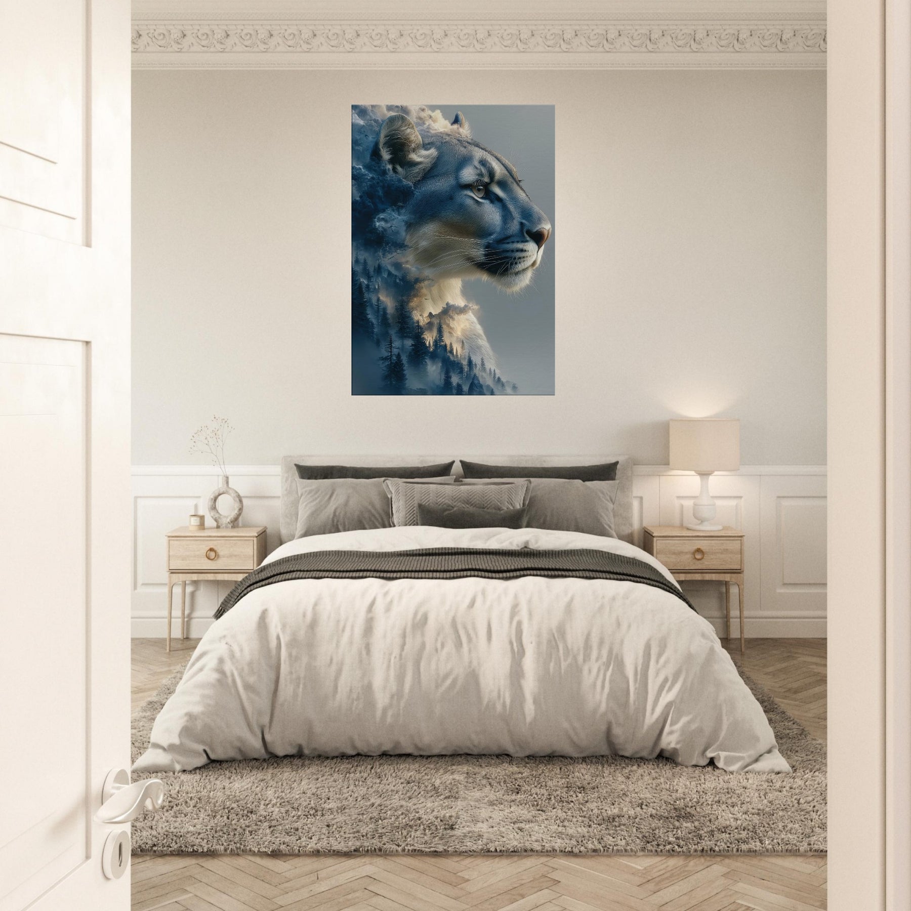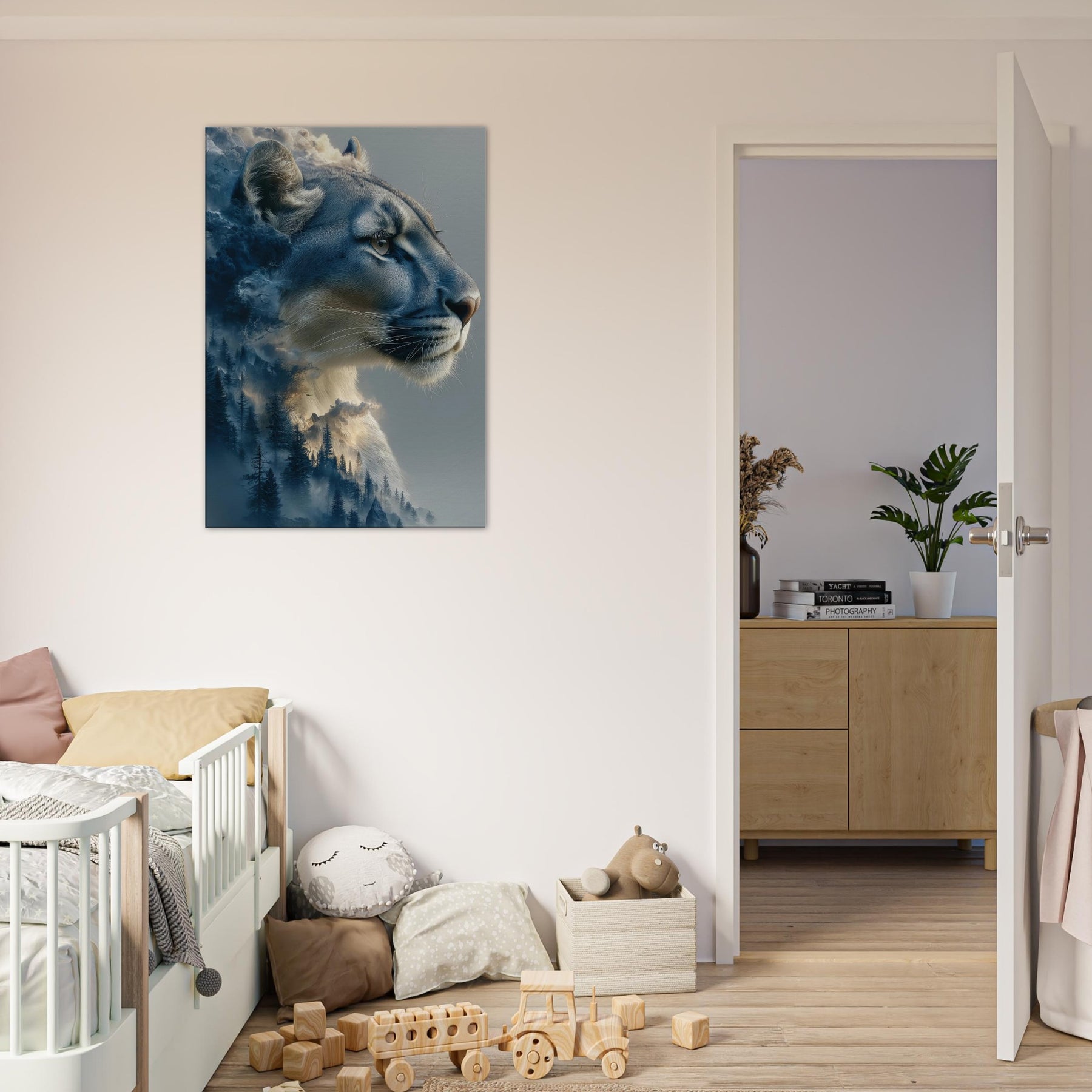 Within this surreal panorama, the Panther steps between mist and pines, its gaze both calm and electric. Clouds fold into fur, and a forest slopes into the curve of its profile, creating a space where animal instinct meets dream design. The cool blues, graphite shadows, and moonlit highlights invite a tranquil rhythm to a living room or study, turning walls into a window of quiet strength. This work invites curiosity, conversation, and a sense of expansive, nocturnal grace an ode to the Panther that feels both intimate and cinematic.
