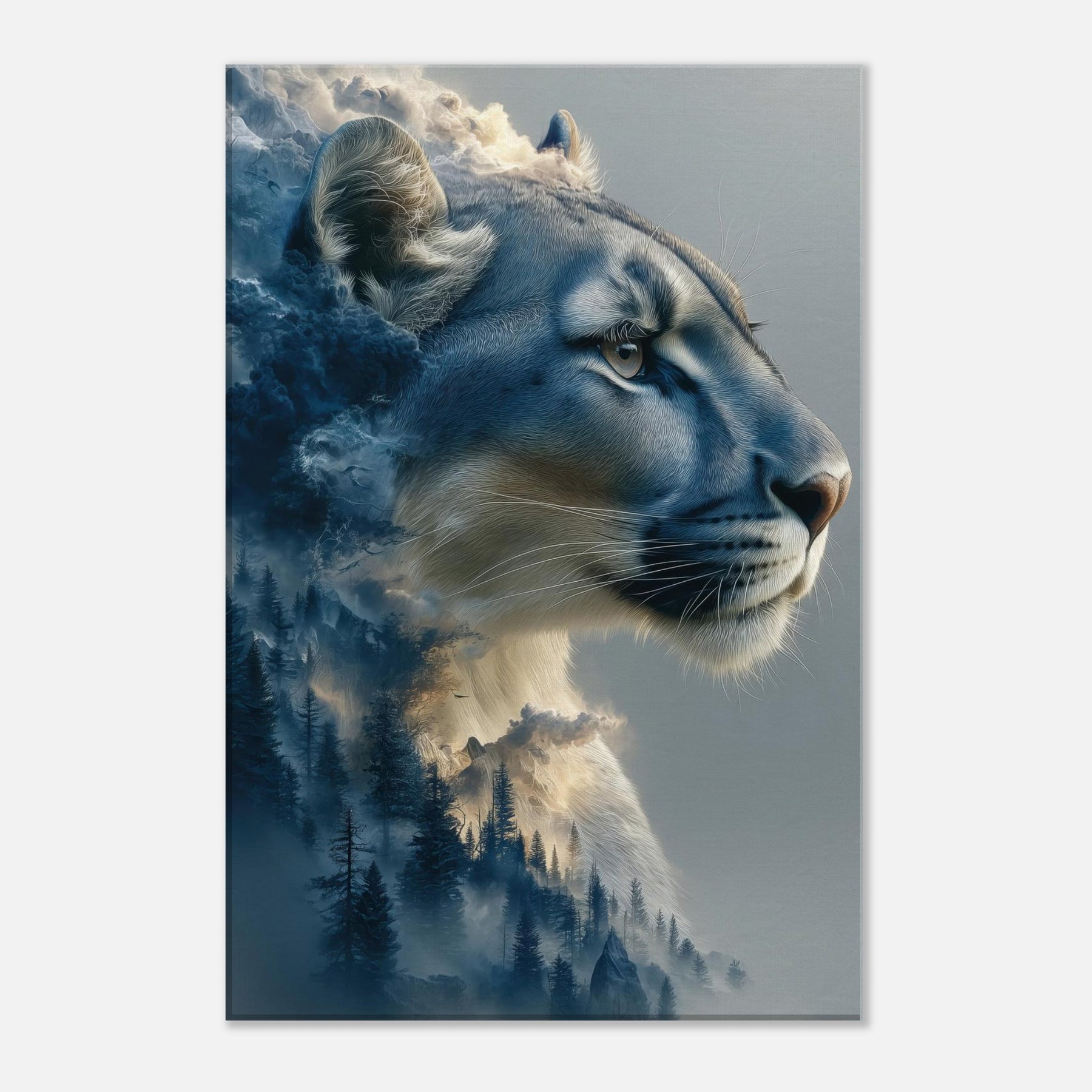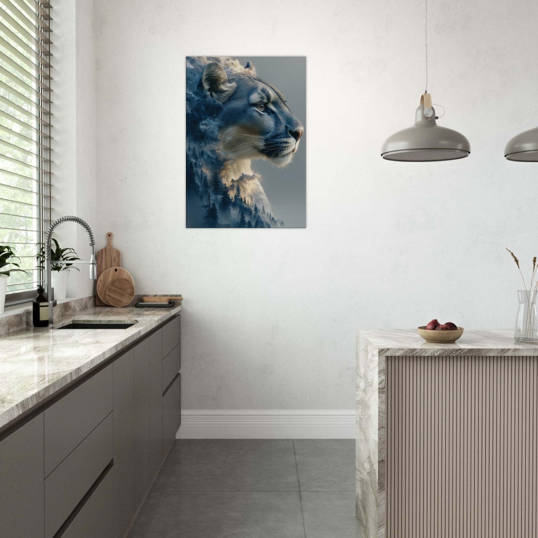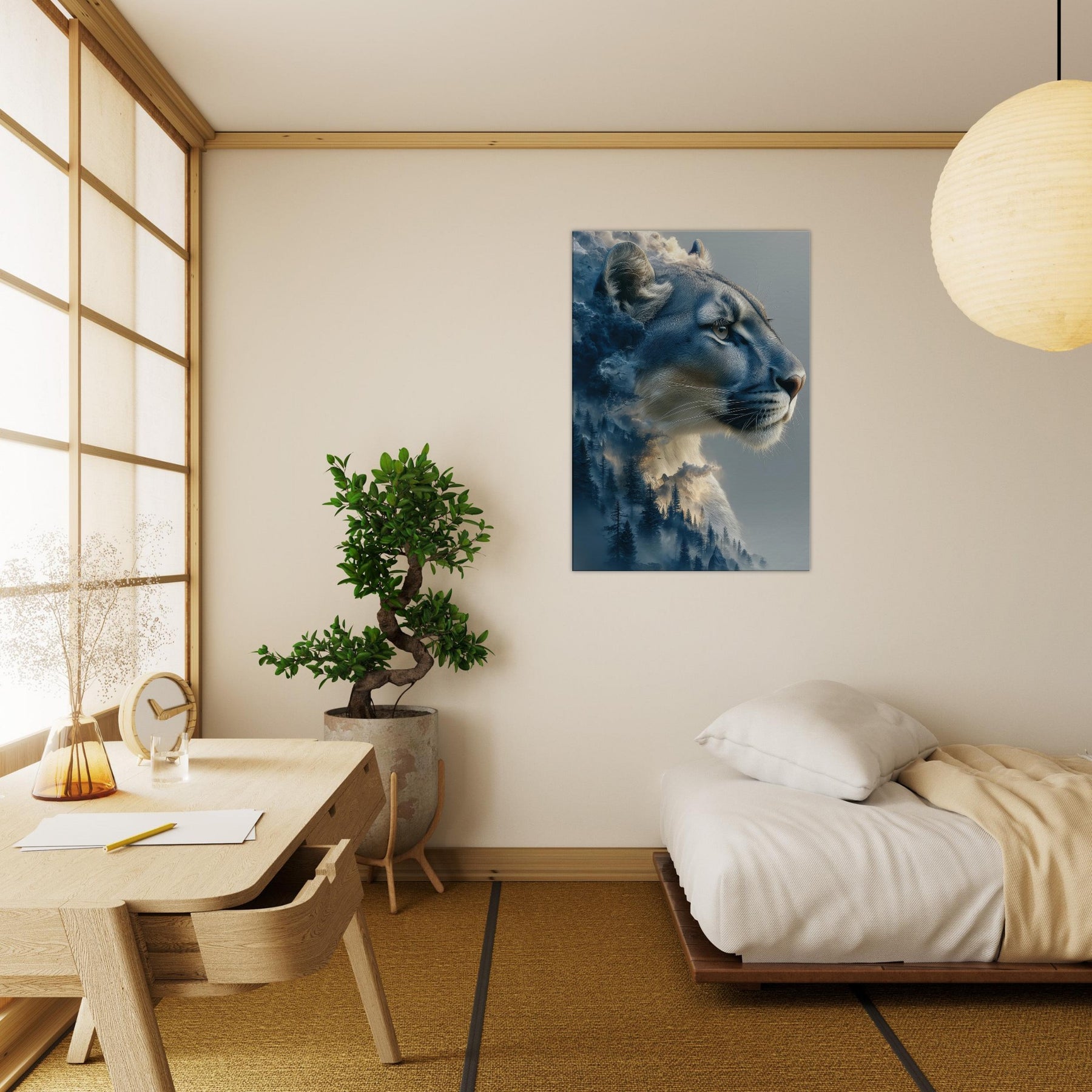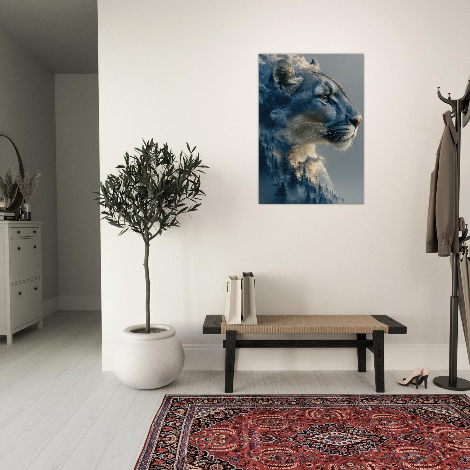 Within this surreal panorama, the Panther steps between mist and pines, its gaze both calm and electric. Clouds fold into fur, and a forest slopes into the curve of its profile, creating a space where animal instinct meets dream design. The cool blues, graphite shadows, and moonlit highlights invite a tranquil rhythm to a living room or study, turning walls into a window of quiet strength. This work invites curiosity, conversation, and a sense of expansive, nocturnal grace an ode to the Panther that feels both intimate and cinematic.