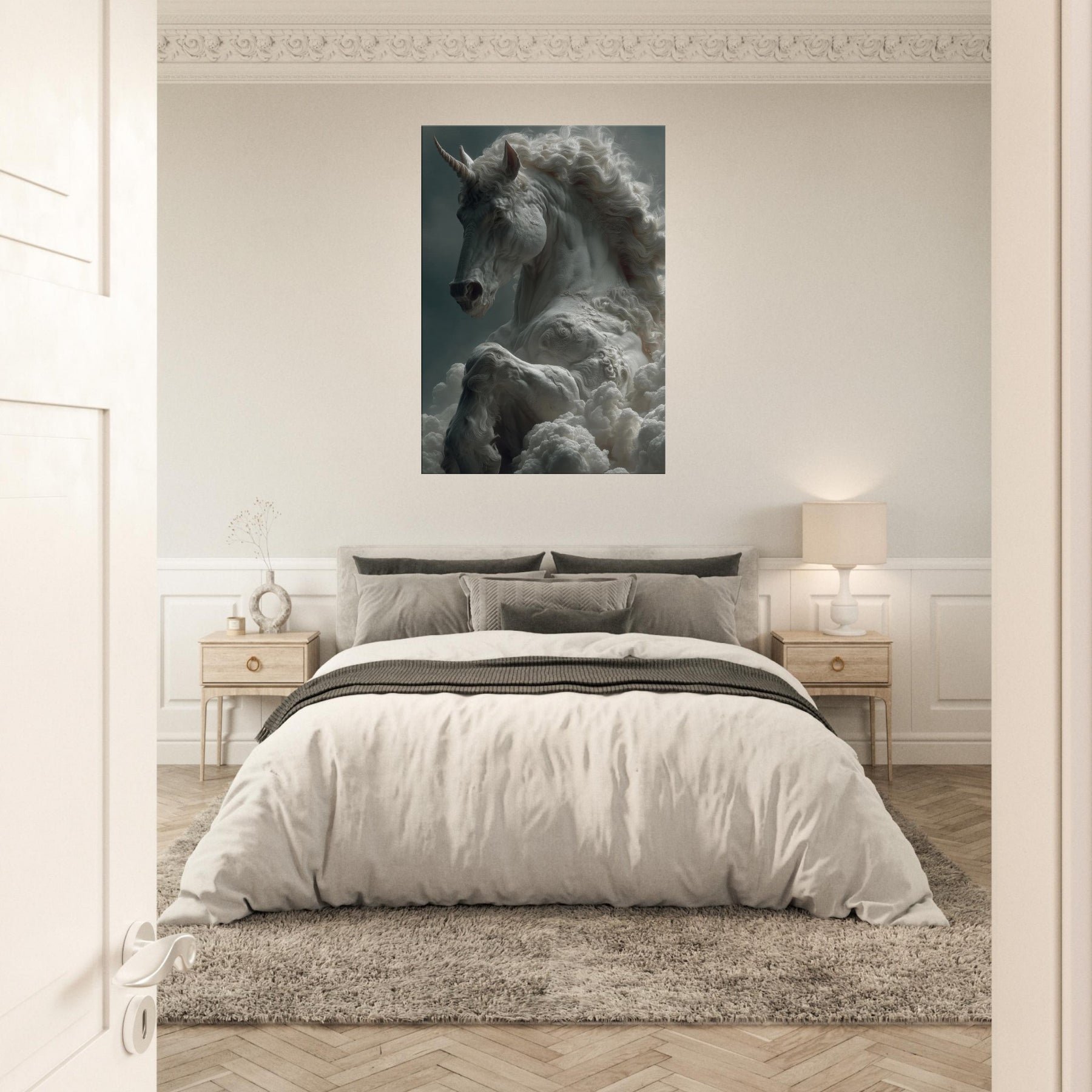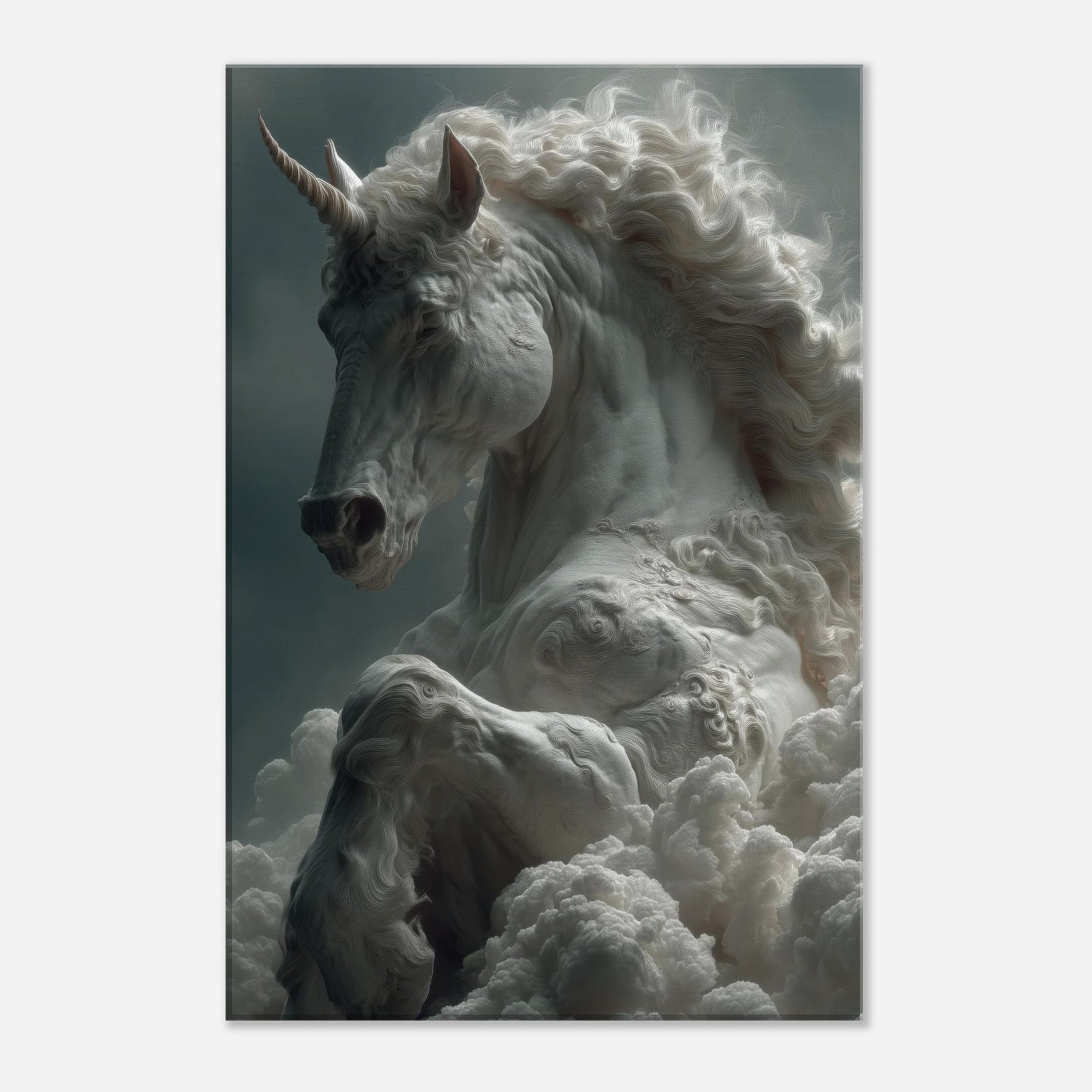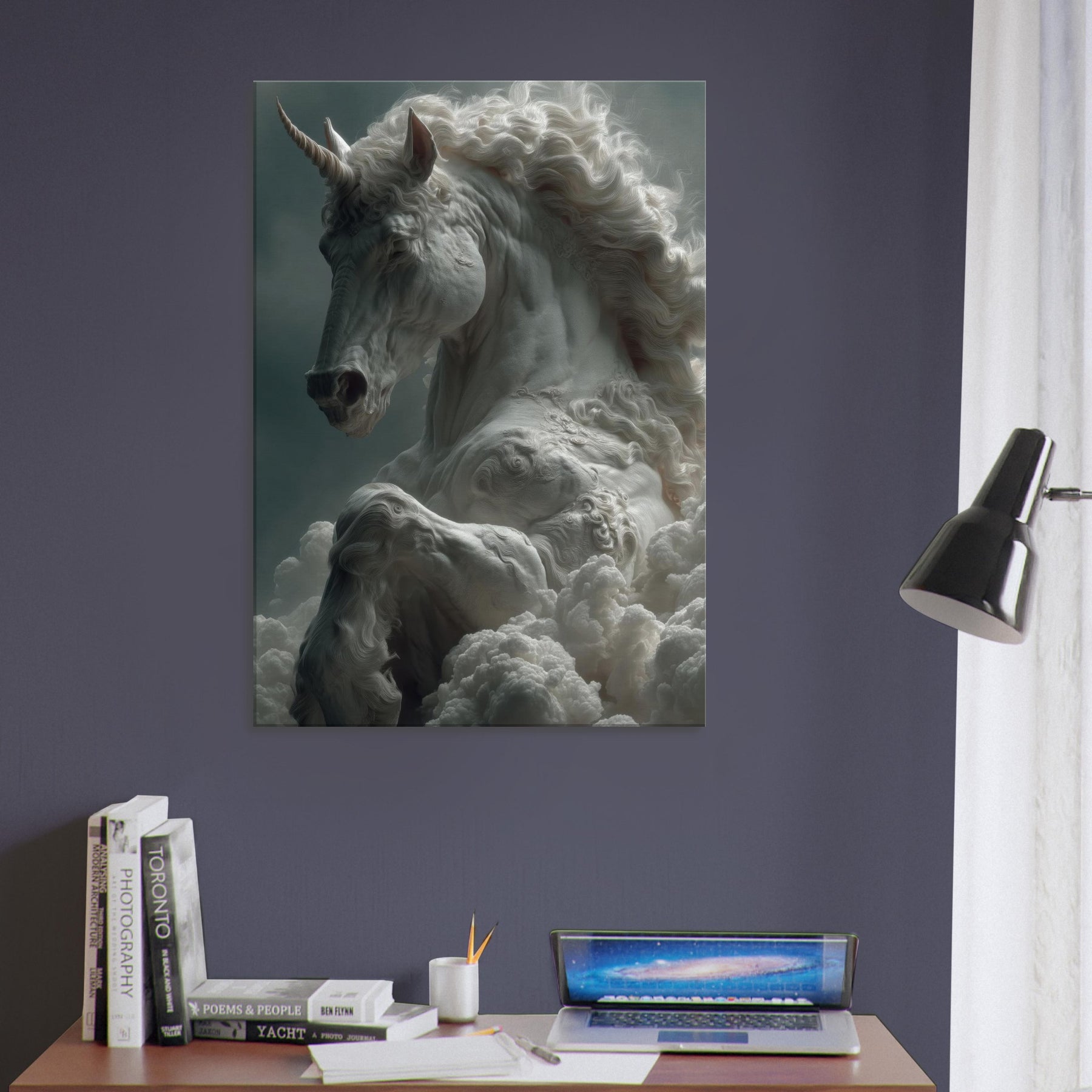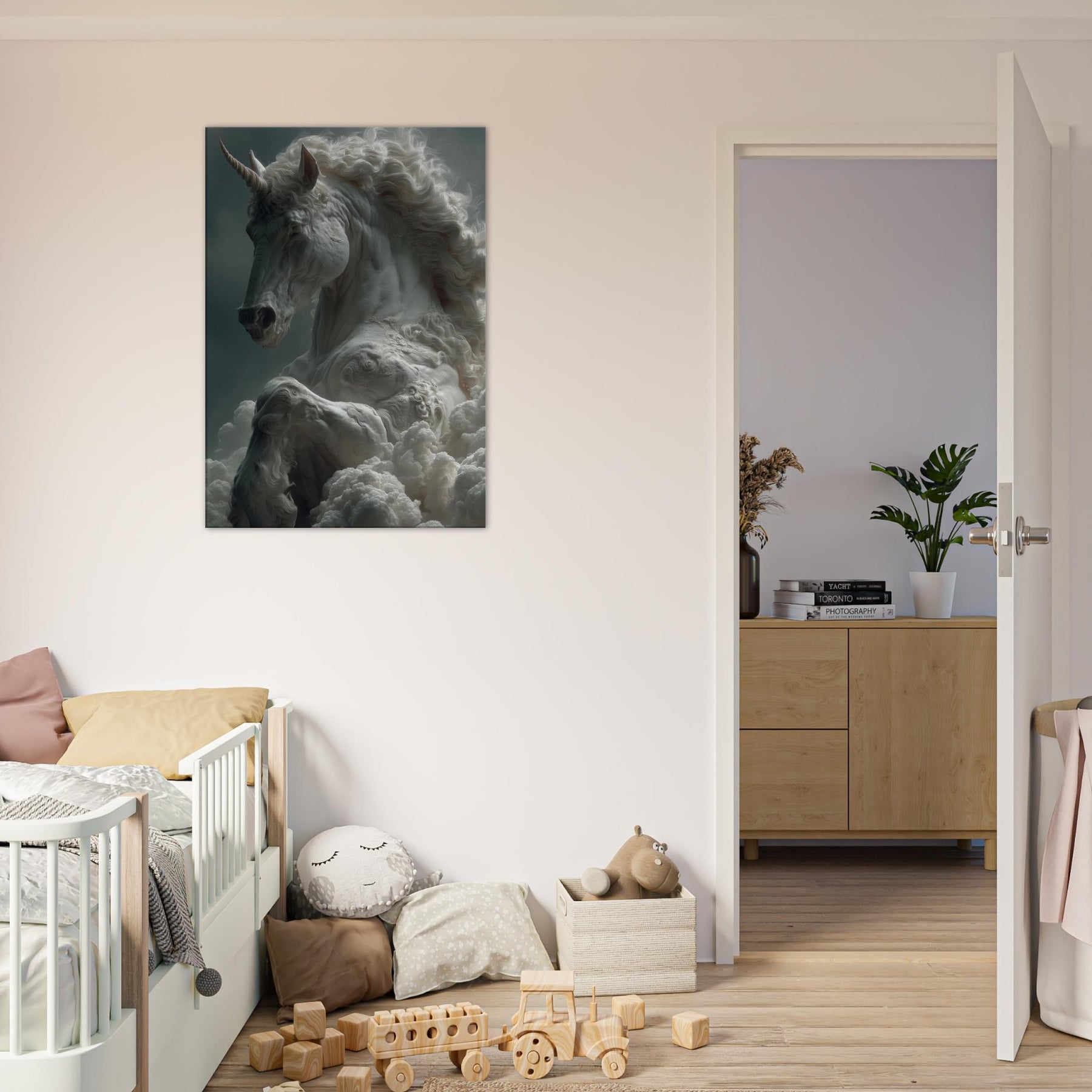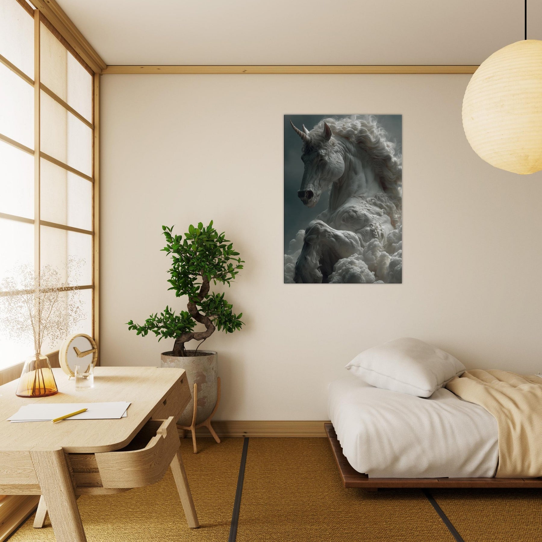 Qilin, the Chinese mythical unicorn like creature of virtue, glides through a luminous mist of cloud and moonlight. Its alabaster form is framed by curling mane and soft, sculpted shadows, a tranquil guardian in a dreamlike expanse. The atmosphere invites calm and wonder, a space where time slows and inspiration rises. Hang this piece where light lingers above a sofa or in a quiet hall and let mythic grace elevate your living space with quiet majesty.
