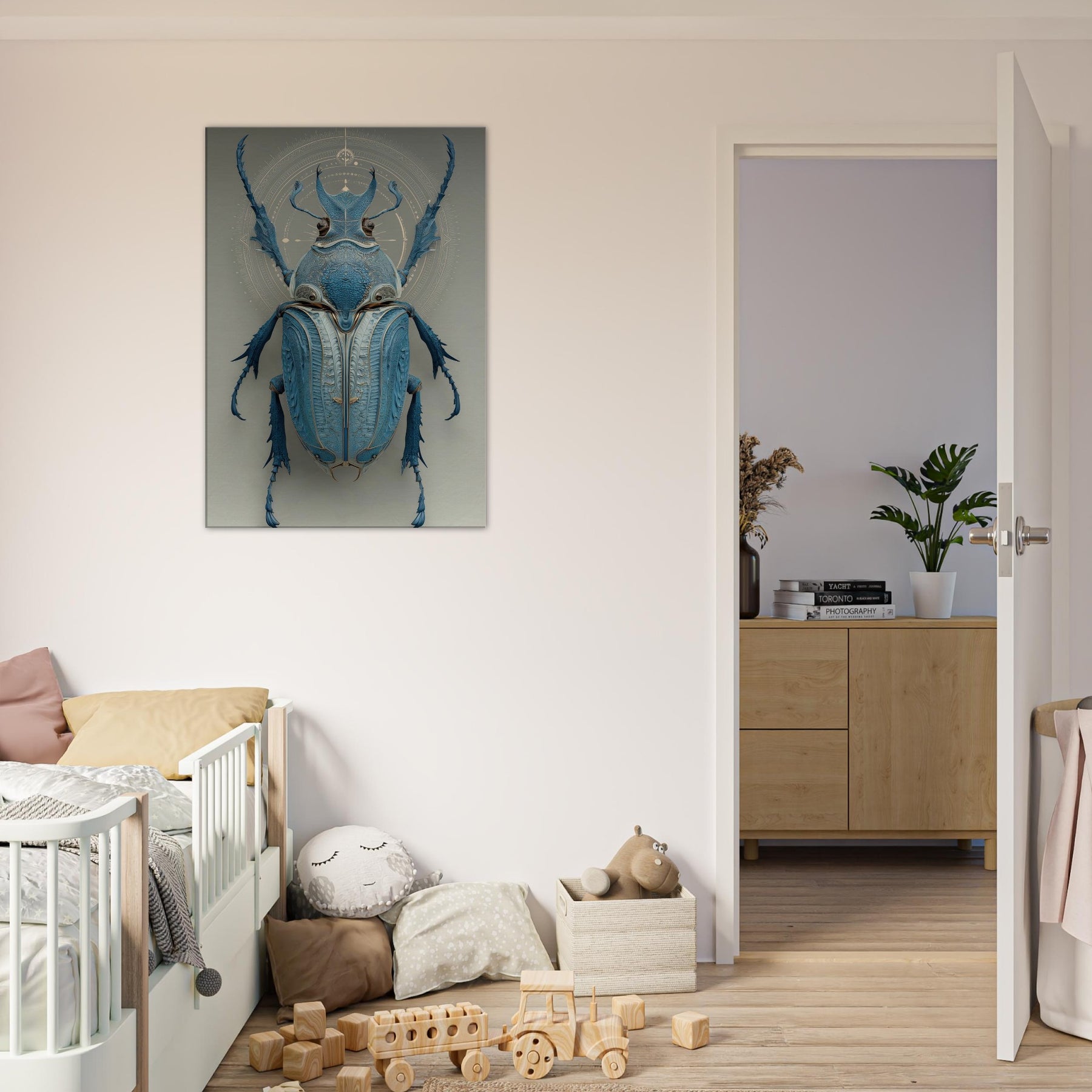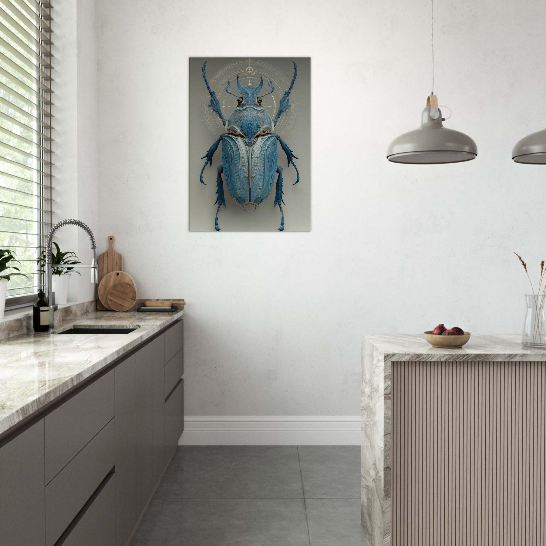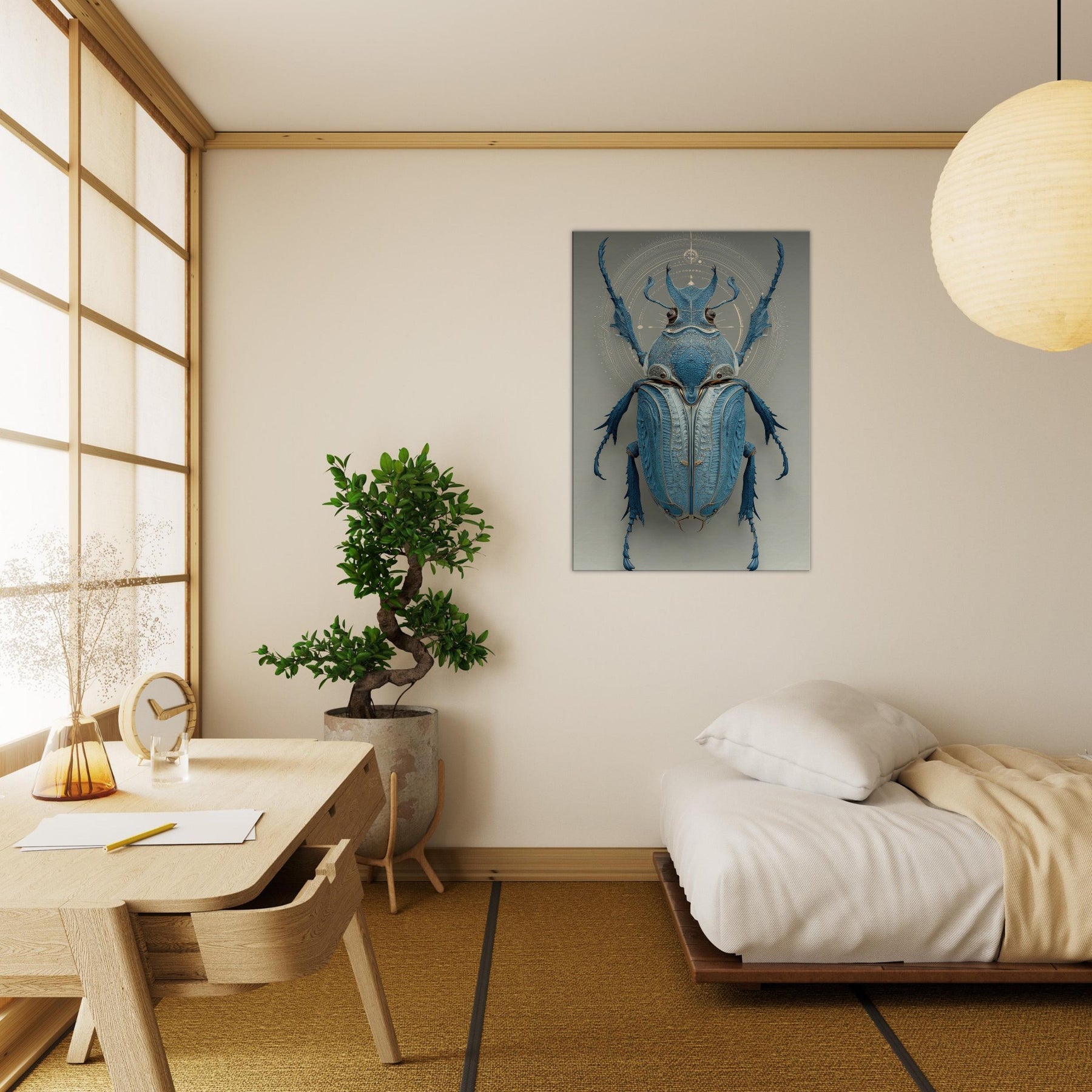 Step into a dreamscape where blue metal meets myth. This Scarab inspired sculpture merges surreal mood with tactile detail, turning a wall into a living portal. A celestial mandala frames the armored form, while iridescent textures shift with the light, revealing a quiet tension between ancient relic and modern artifact. The cool blues and meticulous relief invite slow, contemplative viewing, making any room feel larger, cooler, and more mysterious. Perfect as a centerpiece above a sofa or in a study, it invites wonder without shouting.