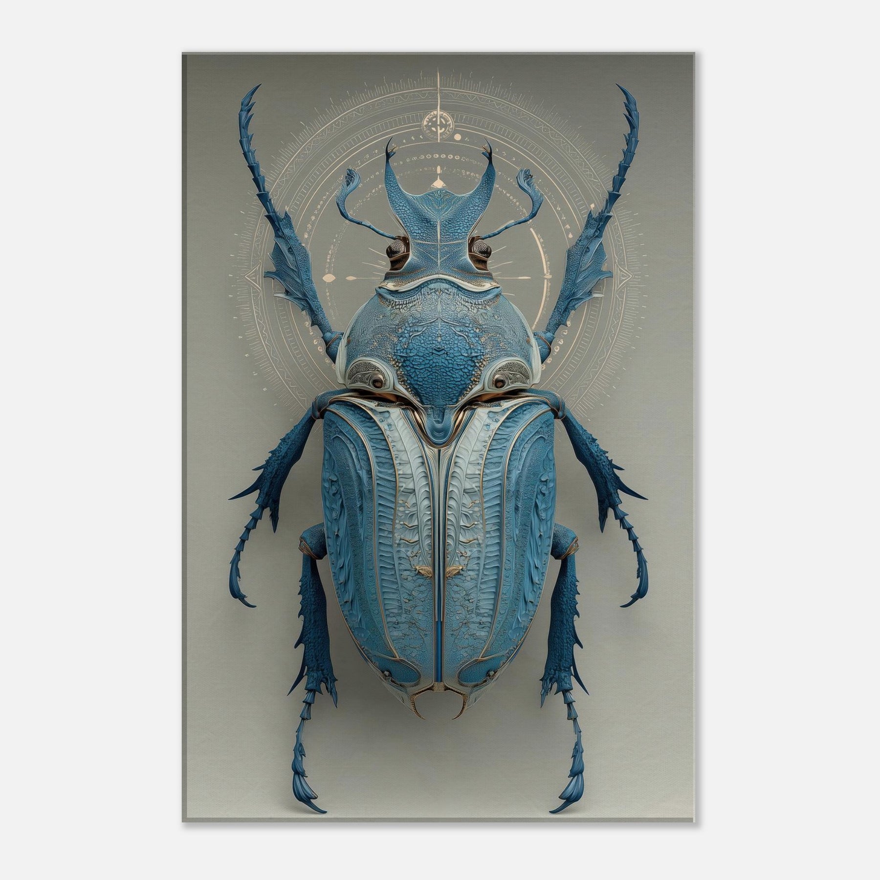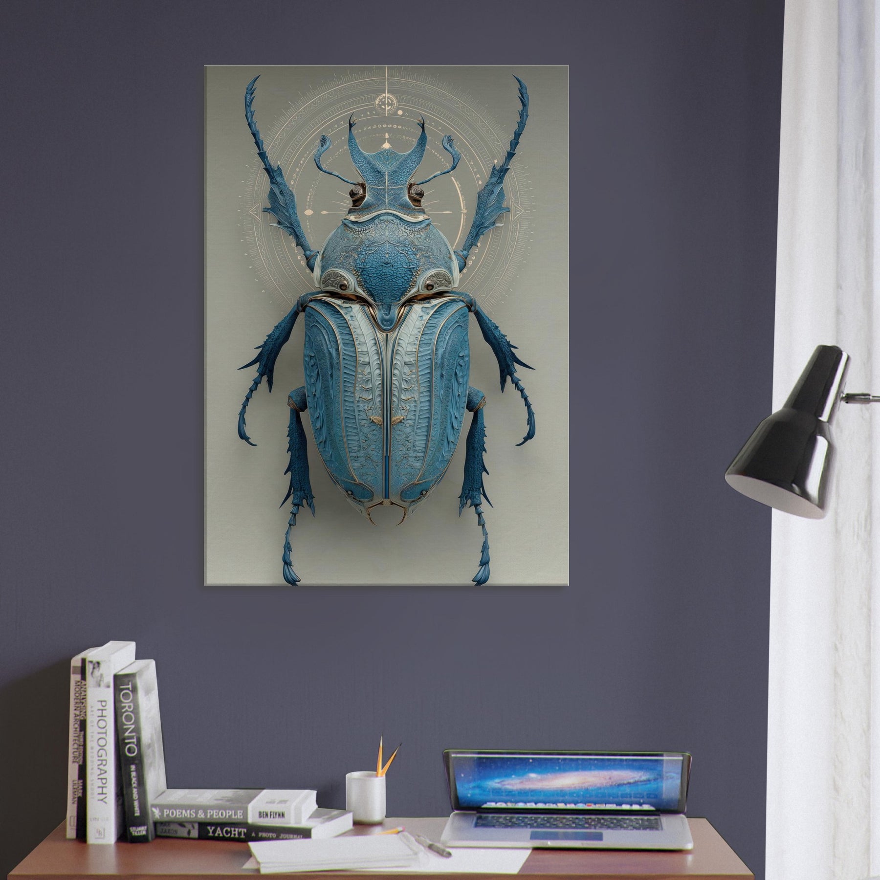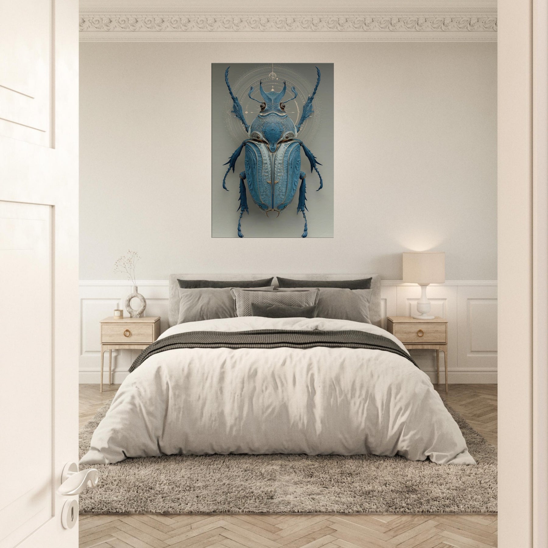Step into a dreamscape where blue metal meets myth. This Scarab inspired sculpture merges surreal mood with tactile detail, turning a wall into a living portal. A celestial mandala frames the armored form, while iridescent textures shift with the light, revealing a quiet tension between ancient relic and modern artifact. The cool blues and meticulous relief invite slow, contemplative viewing, making any room feel larger, cooler, and more mysterious. Perfect as a centerpiece above a sofa or in a study, it invites wonder without shouting.