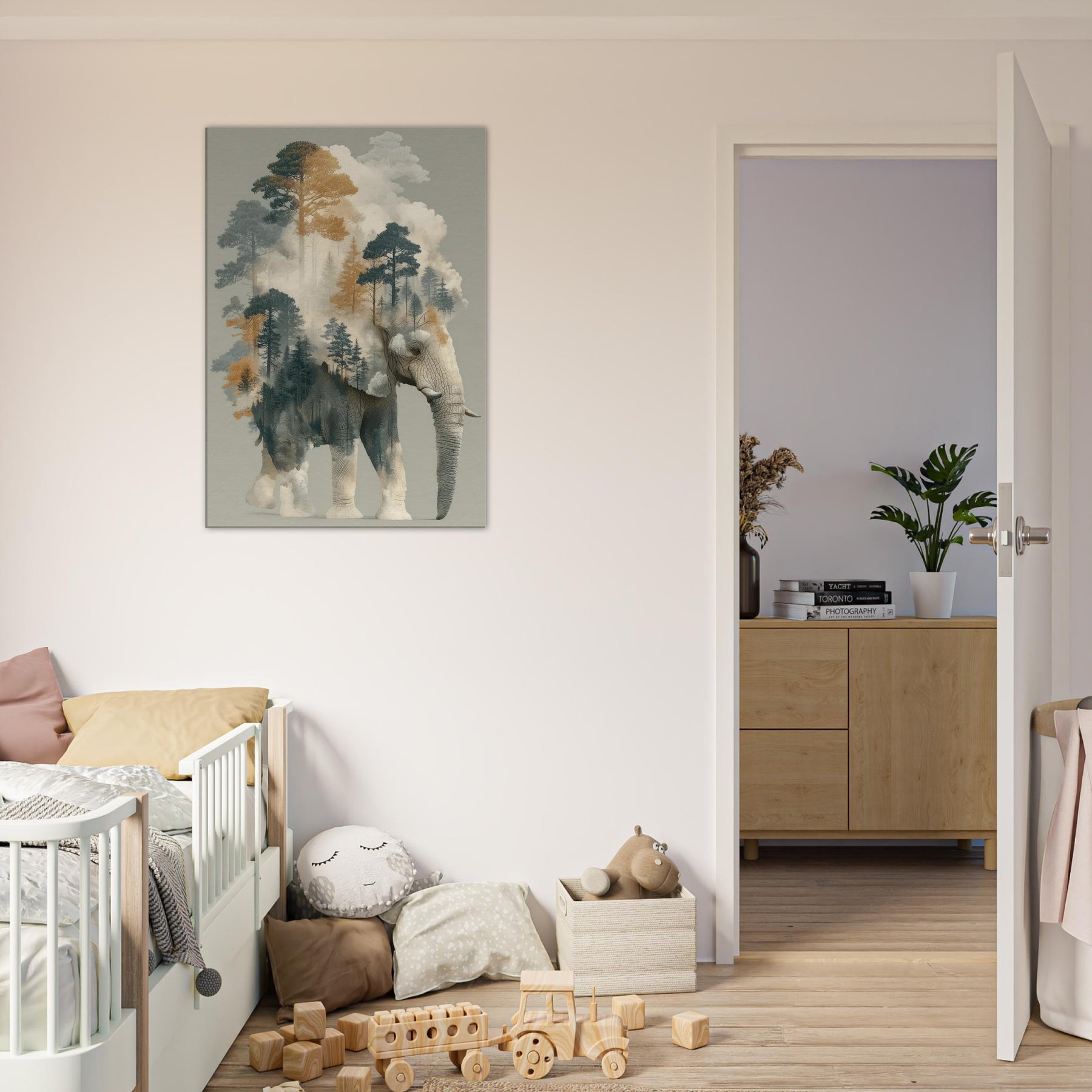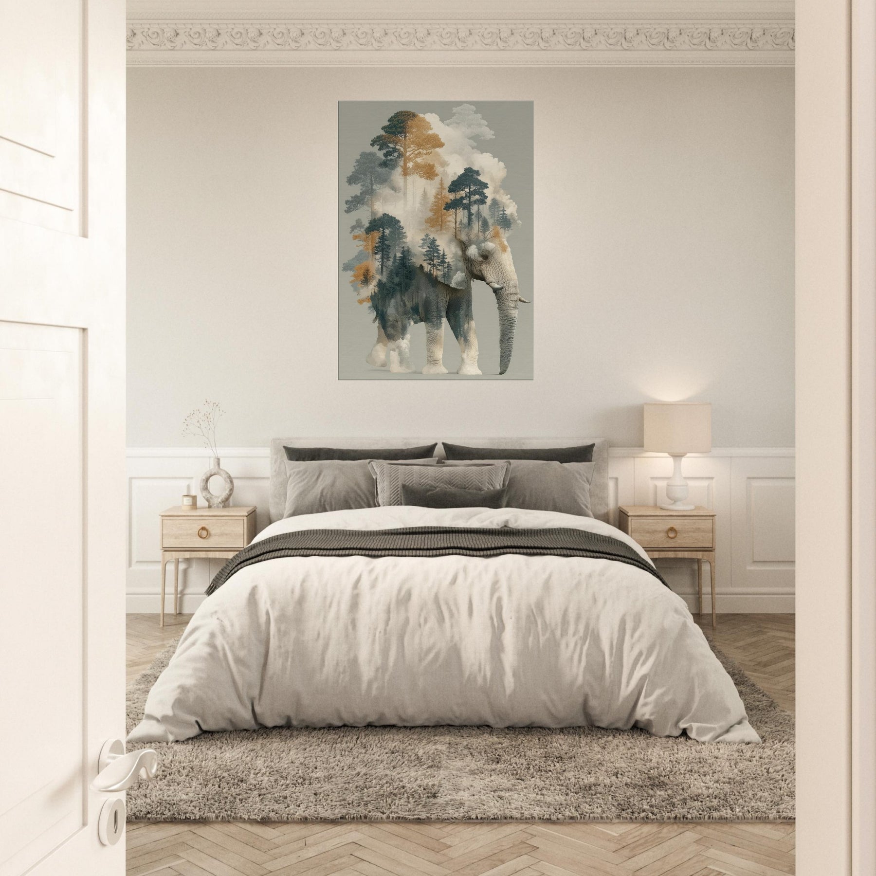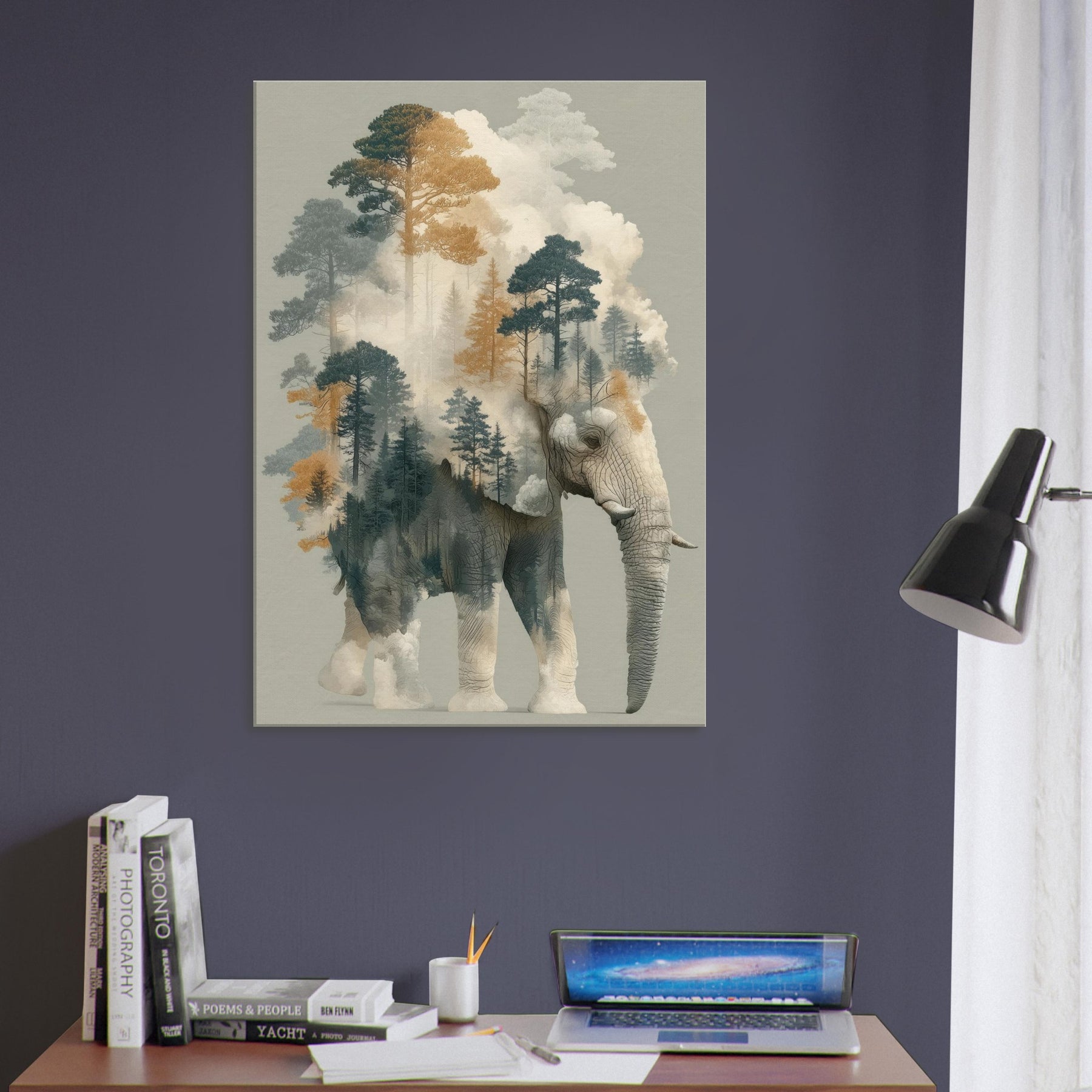 Enter a dream where memory and forest breathe as one. This evocative composition places the Elephant at the heart of a misty woodland, its form dissolving into smoke and pines in graceful, surreal harmony. The muted palette of graphite, ochre, and soft taupe glides across the canvas, inviting a meditative presence into your living space. As light shifts, the artwork reveals quiet tensions between strength and fragility, turning a sofa into a doorway to imagination.