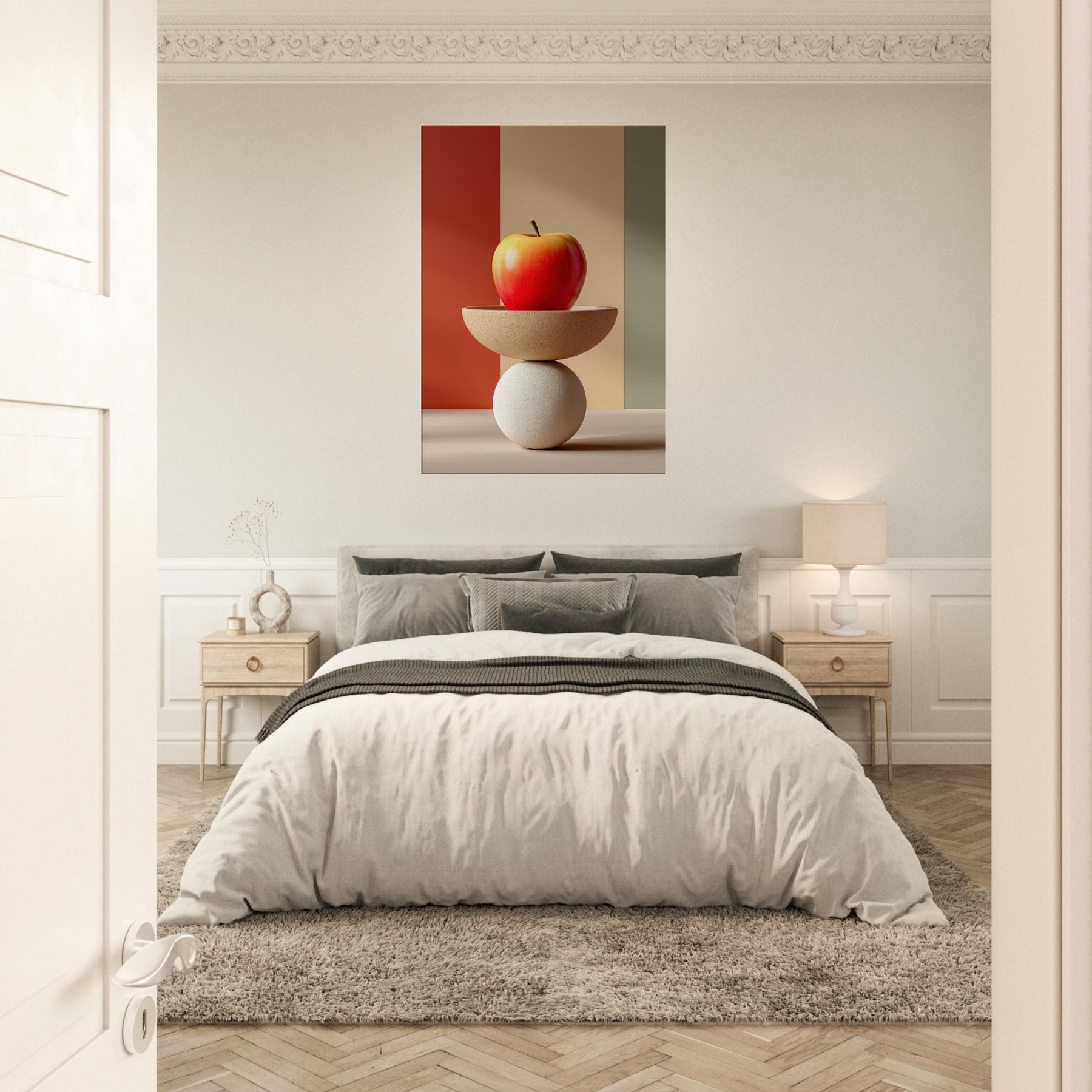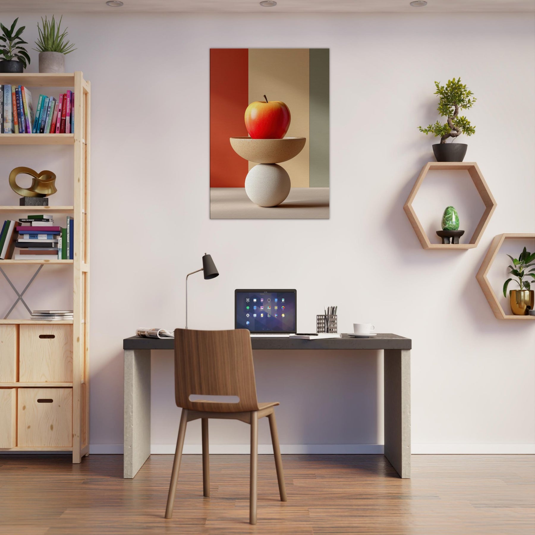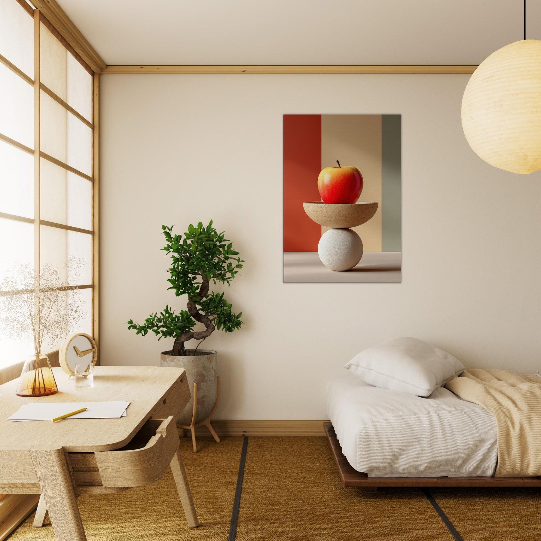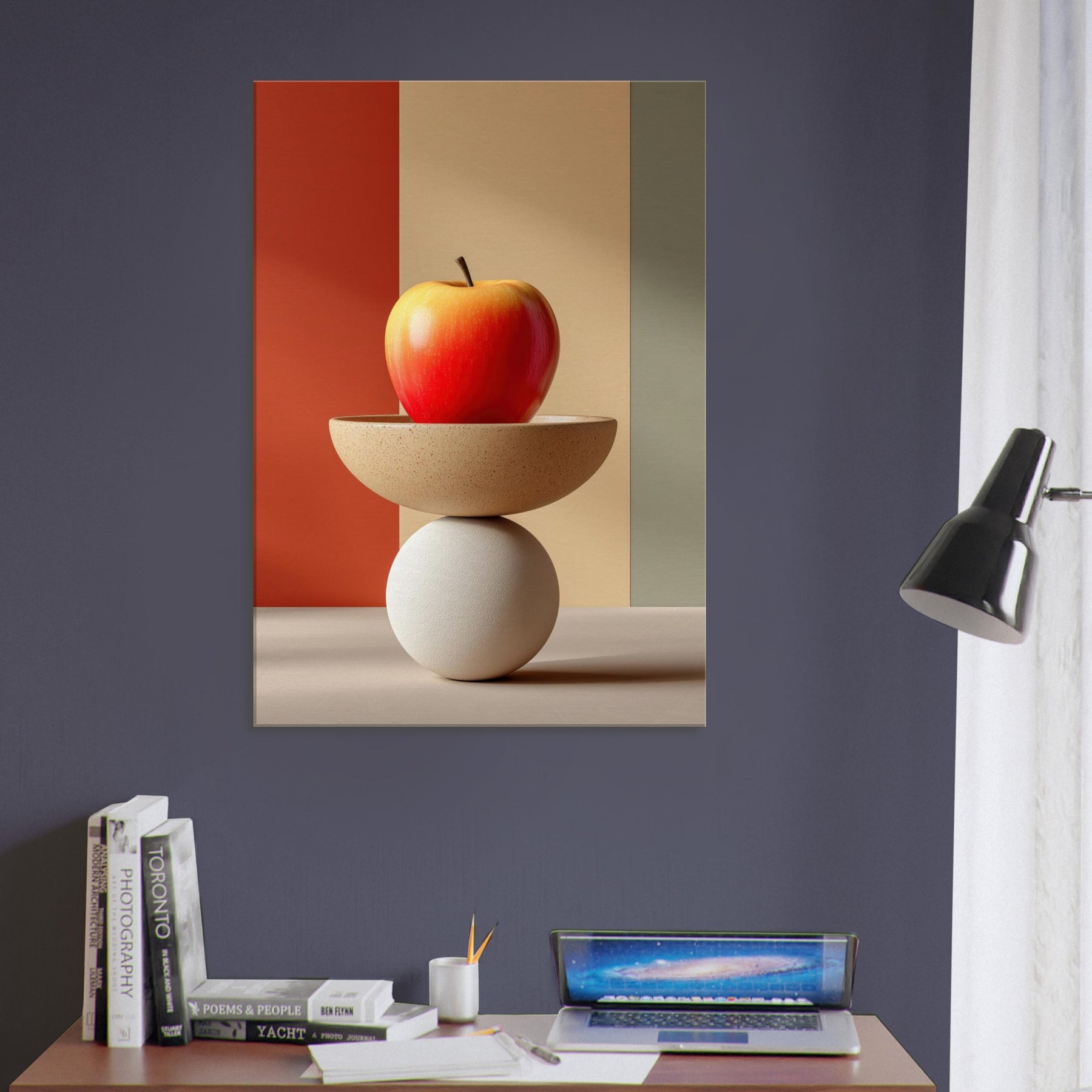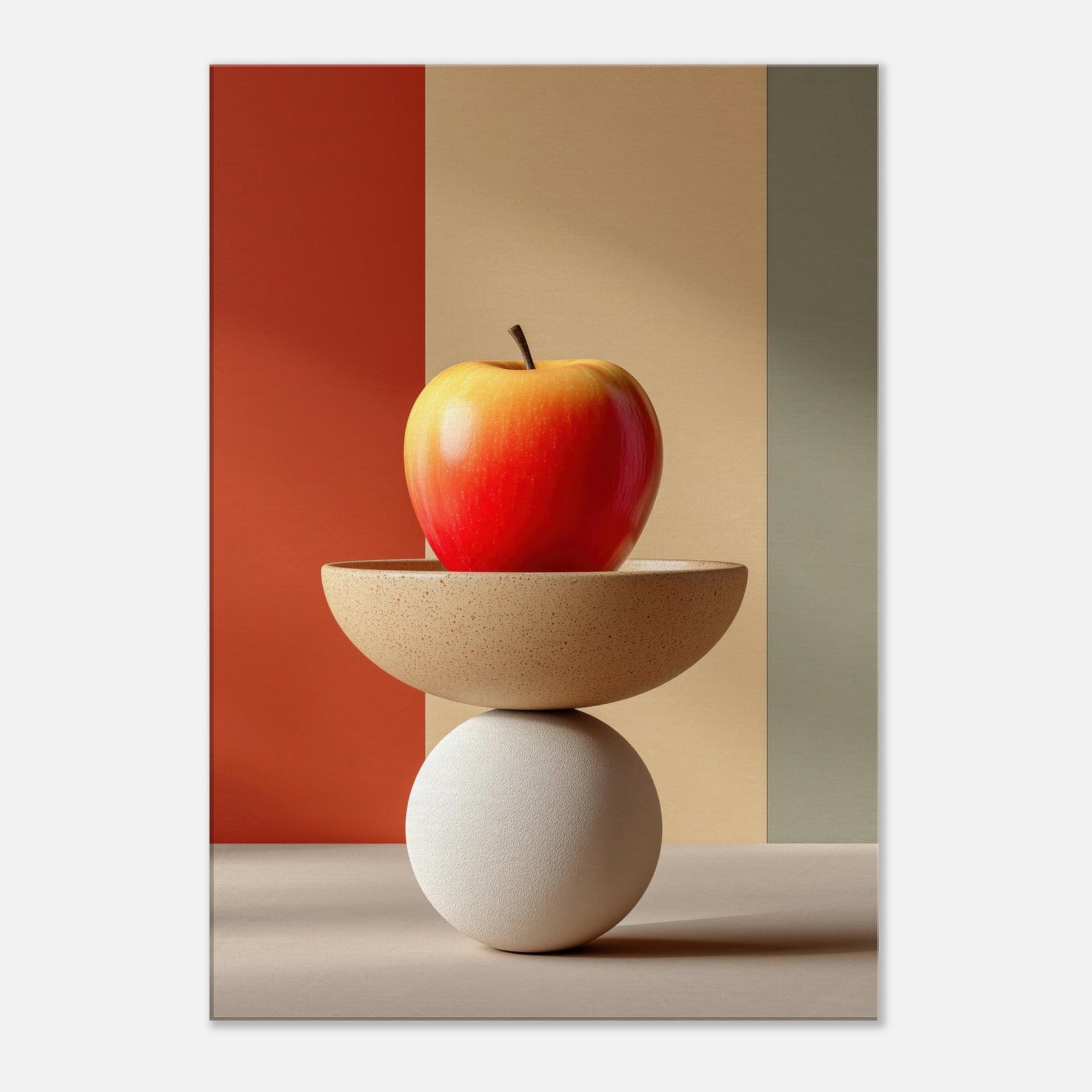 An arresting still life that slides between whimsy and poise, this Fruit Bowl seems to defy gravity as a sculptural object. The apple glows with sun warmed red and amber hues, balanced on a shallow ceramic bowl that rests upon a cool white sphere. In soft, color blocked light, the composition becomes a meditative vignette calm, curious, dreamlike. Hang it in a living room or study to invite tactile reflection, subtle warmth, and a conversation about balance and imagination.