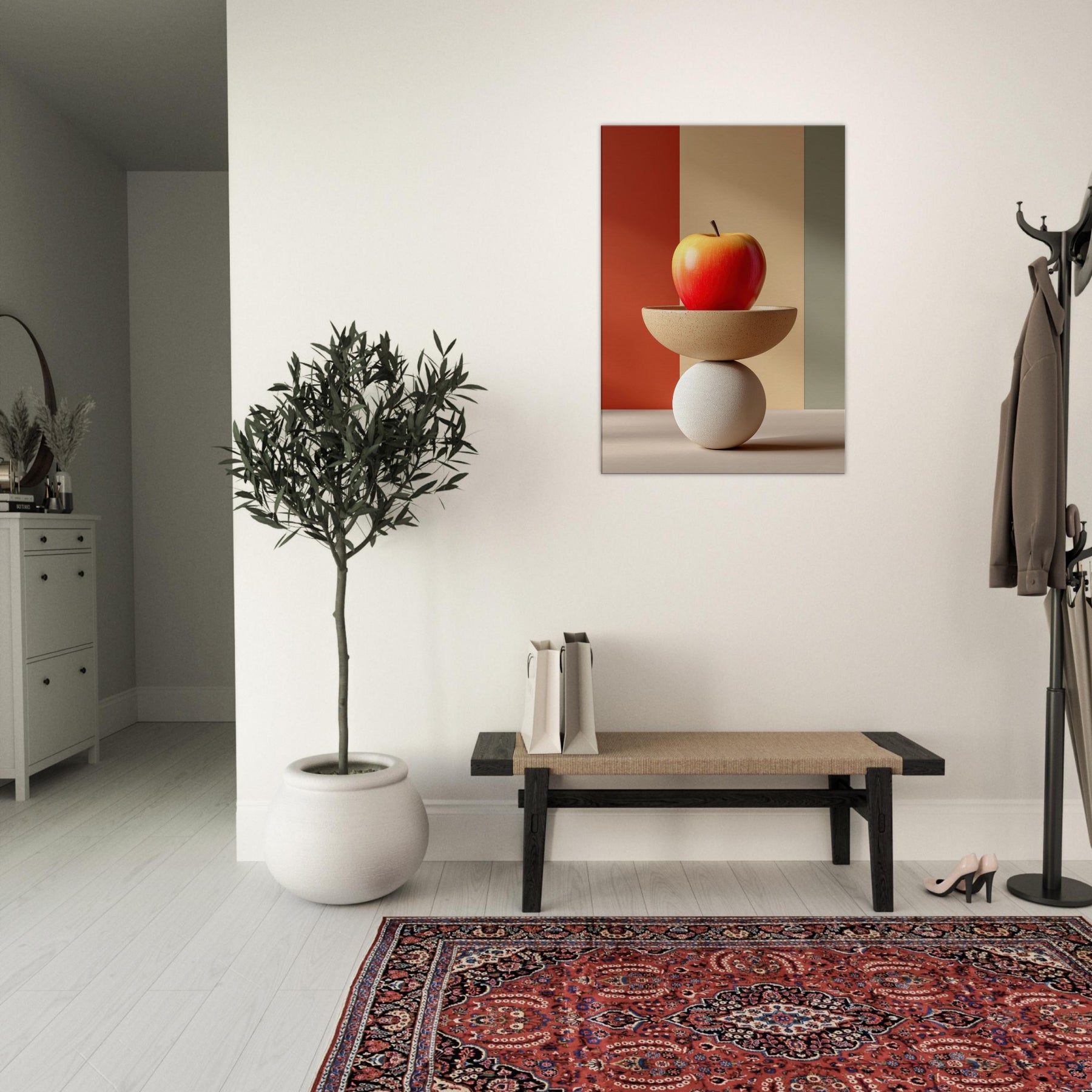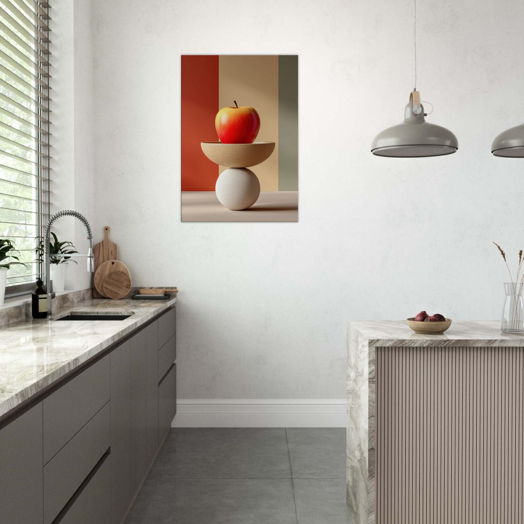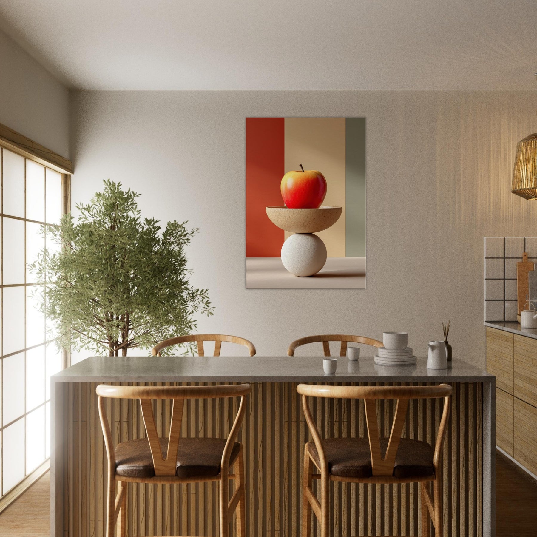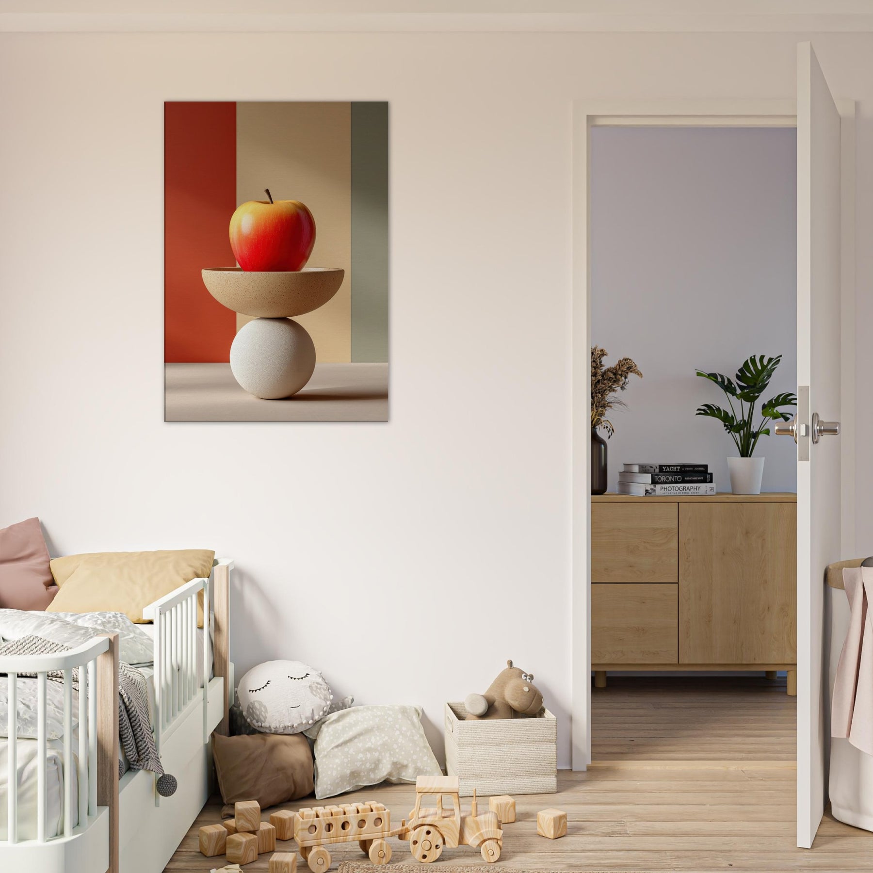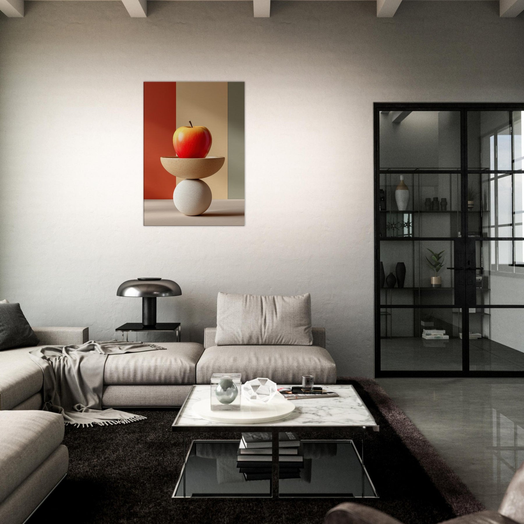 An arresting still life that slides between whimsy and poise, this Fruit Bowl seems to defy gravity as a sculptural object. The apple glows with sun warmed red and amber hues, balanced on a shallow ceramic bowl that rests upon a cool white sphere. In soft, color blocked light, the composition becomes a meditative vignette calm, curious, dreamlike. Hang it in a living room or study to invite tactile reflection, subtle warmth, and a conversation about balance and imagination.