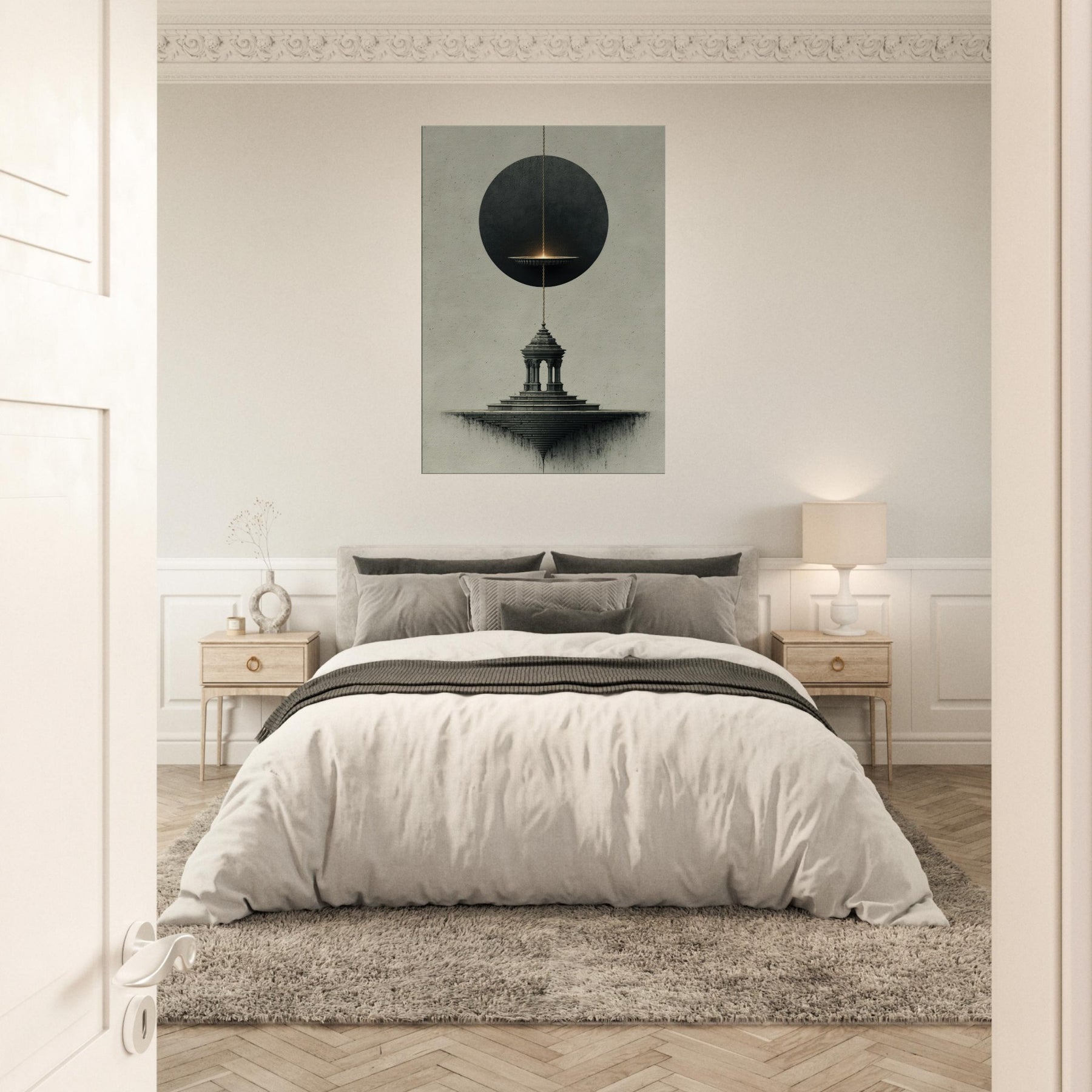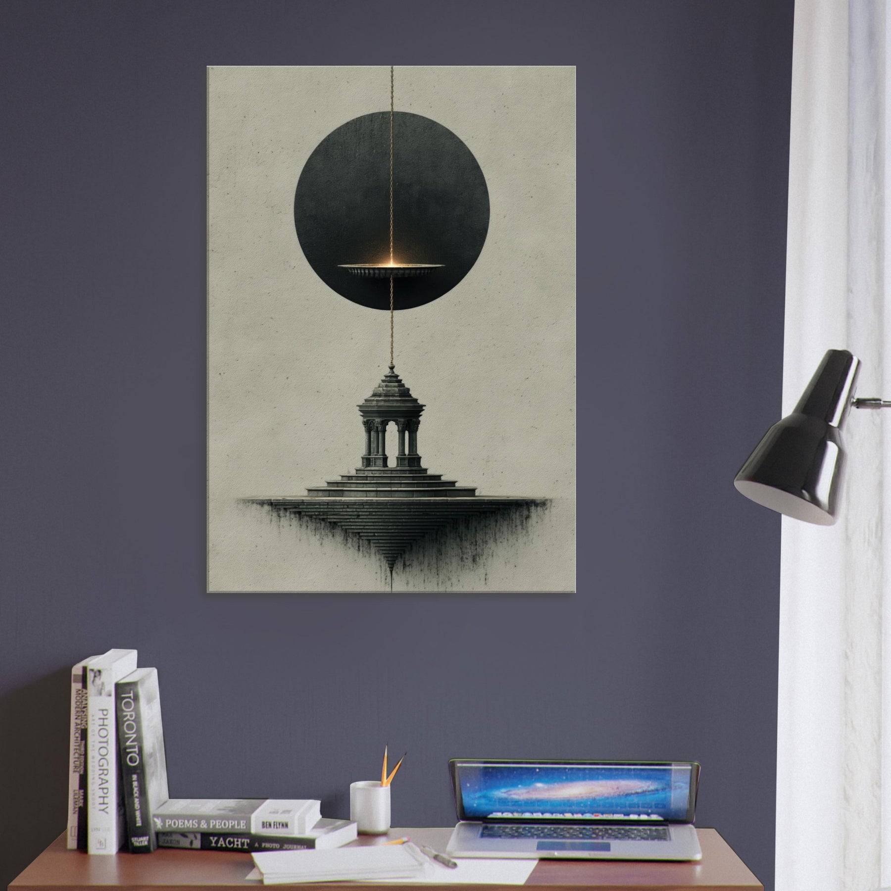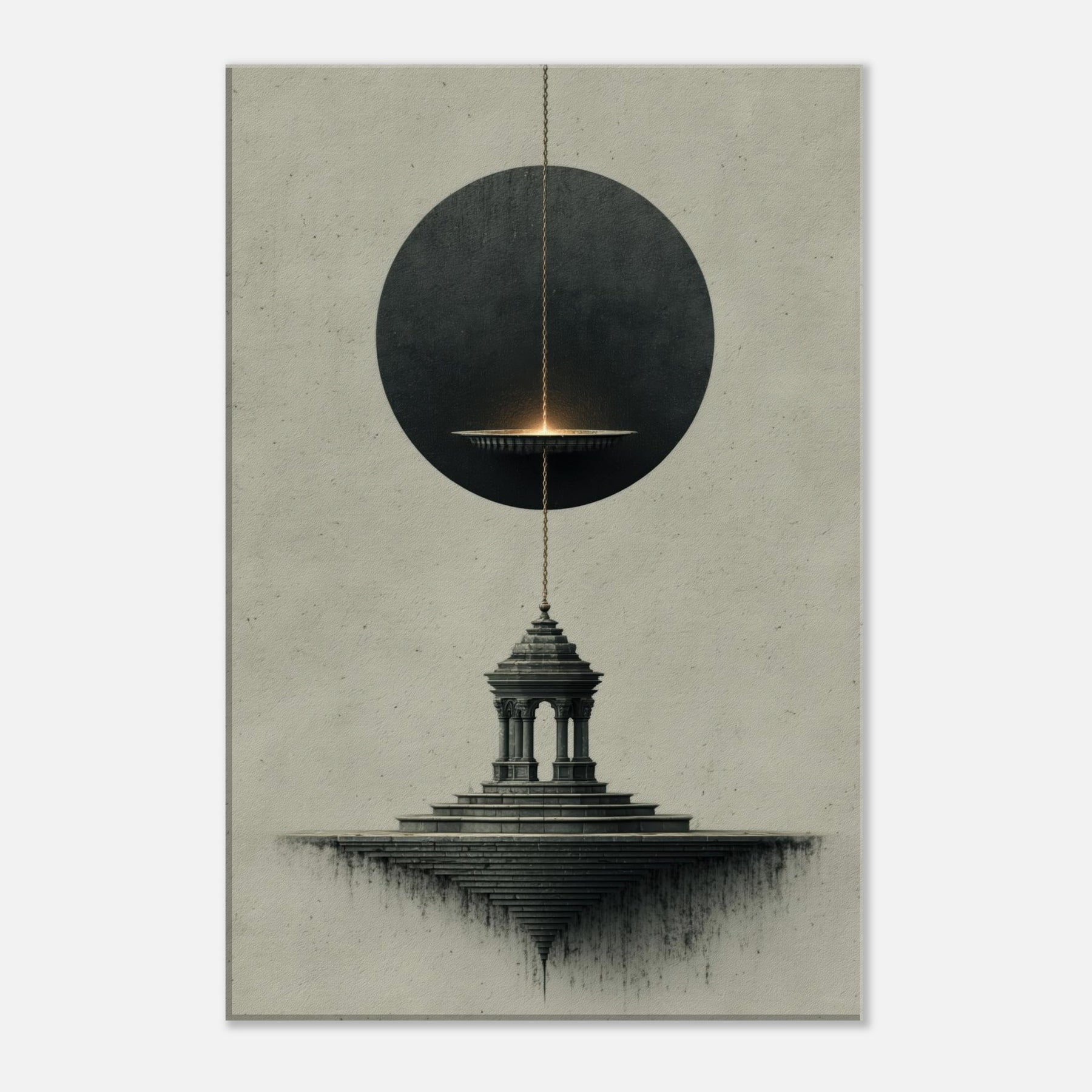 Pendulum (Divination) hovers between a shadowed circle and a stone pedestal, turning stillness into a whispered ritual. The surreal composition breathes with nocturnal mood, where the pendulum's glow traces intention along a quiet horizon and the architectural steps descend into dreamlike infinity. This artwork invites a space to breathe, transforming a living room or study into a sanctuary of intuition and wonder, where mood and meaning align in a delicate, mystical atmosphere.