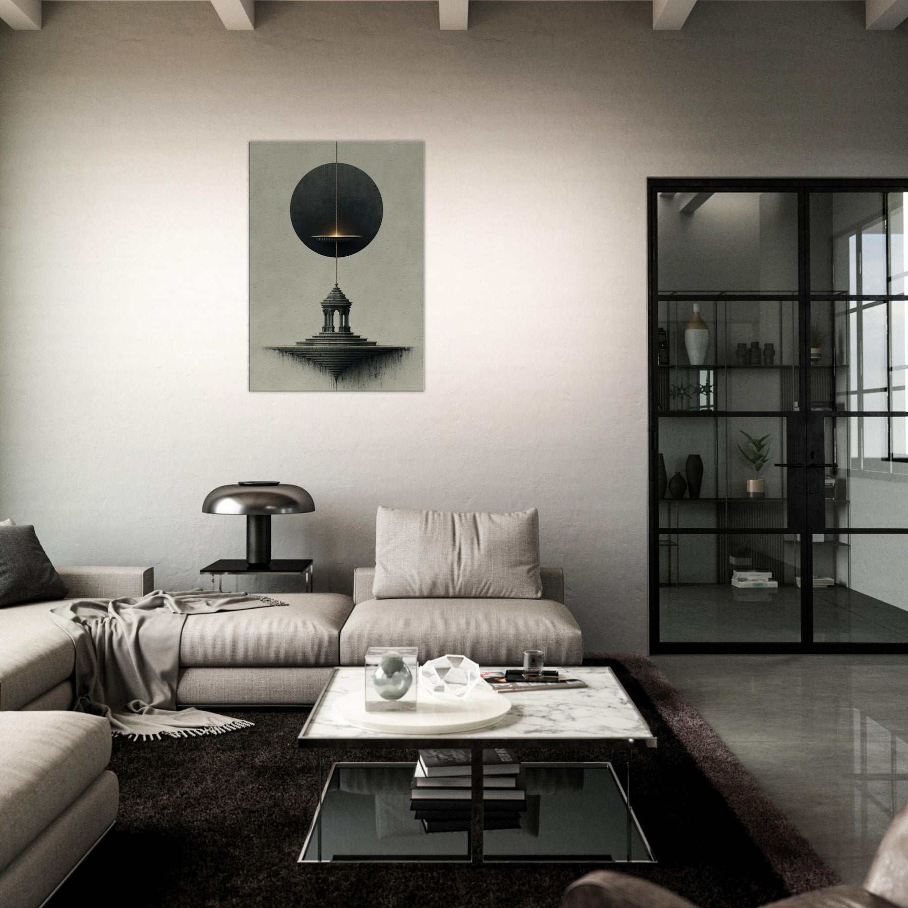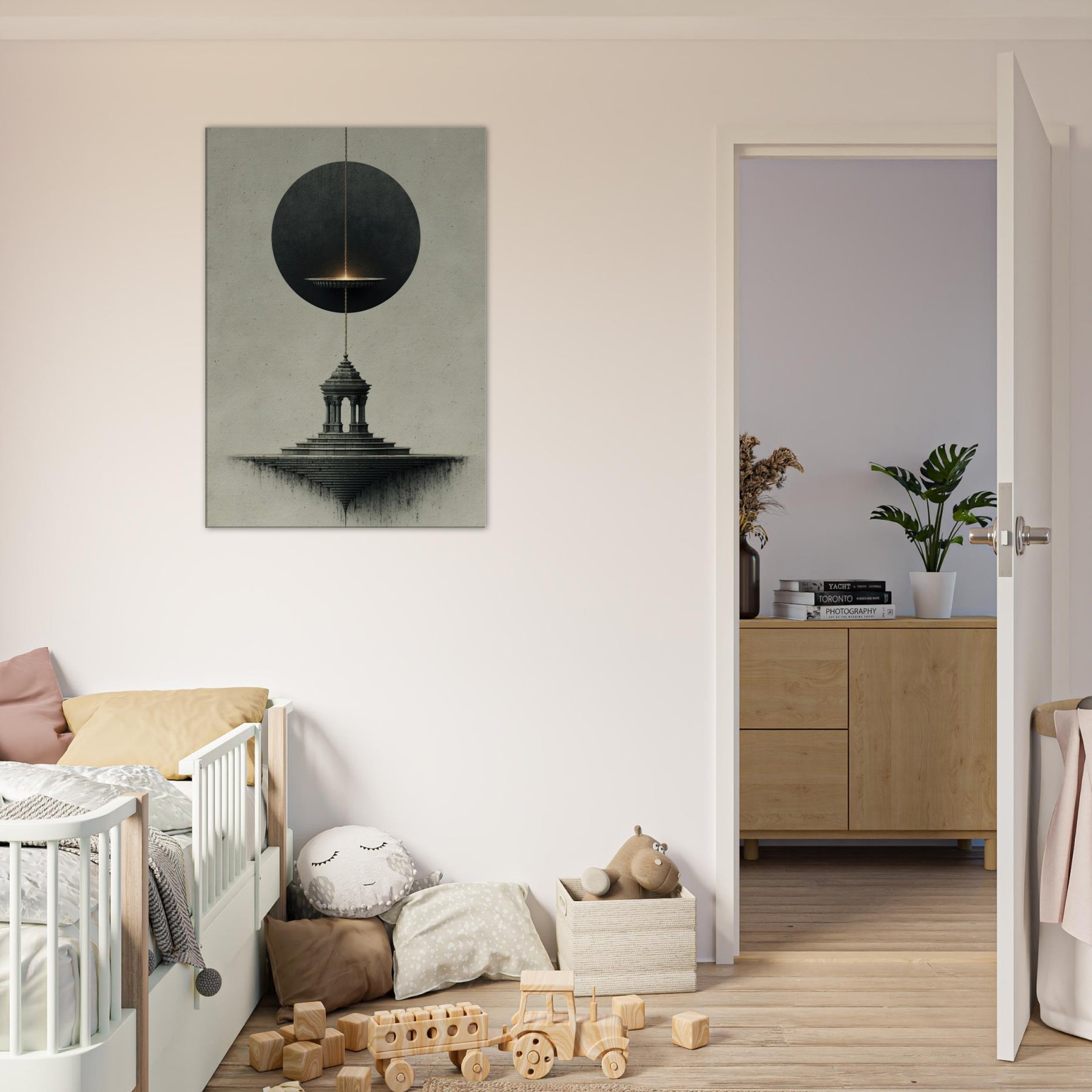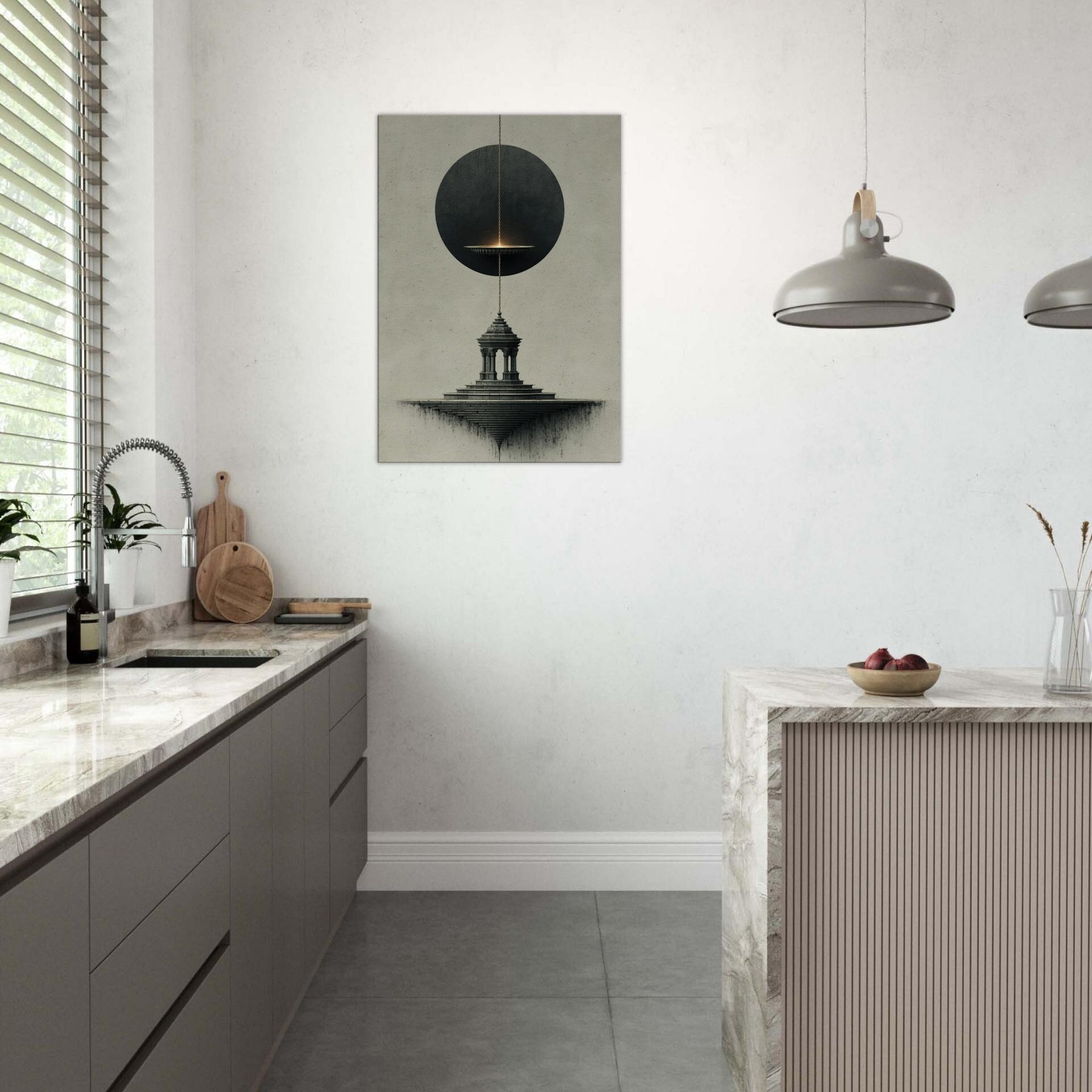Pendulum (Divination) hovers between a shadowed circle and a stone pedestal, turning stillness into a whispered ritual. The surreal composition breathes with nocturnal mood, where the pendulum's glow traces intention along a quiet horizon and the architectural steps descend into dreamlike infinity. This artwork invites a space to breathe, transforming a living room or study into a sanctuary of intuition and wonder, where mood and meaning align in a delicate, mystical atmosphere.