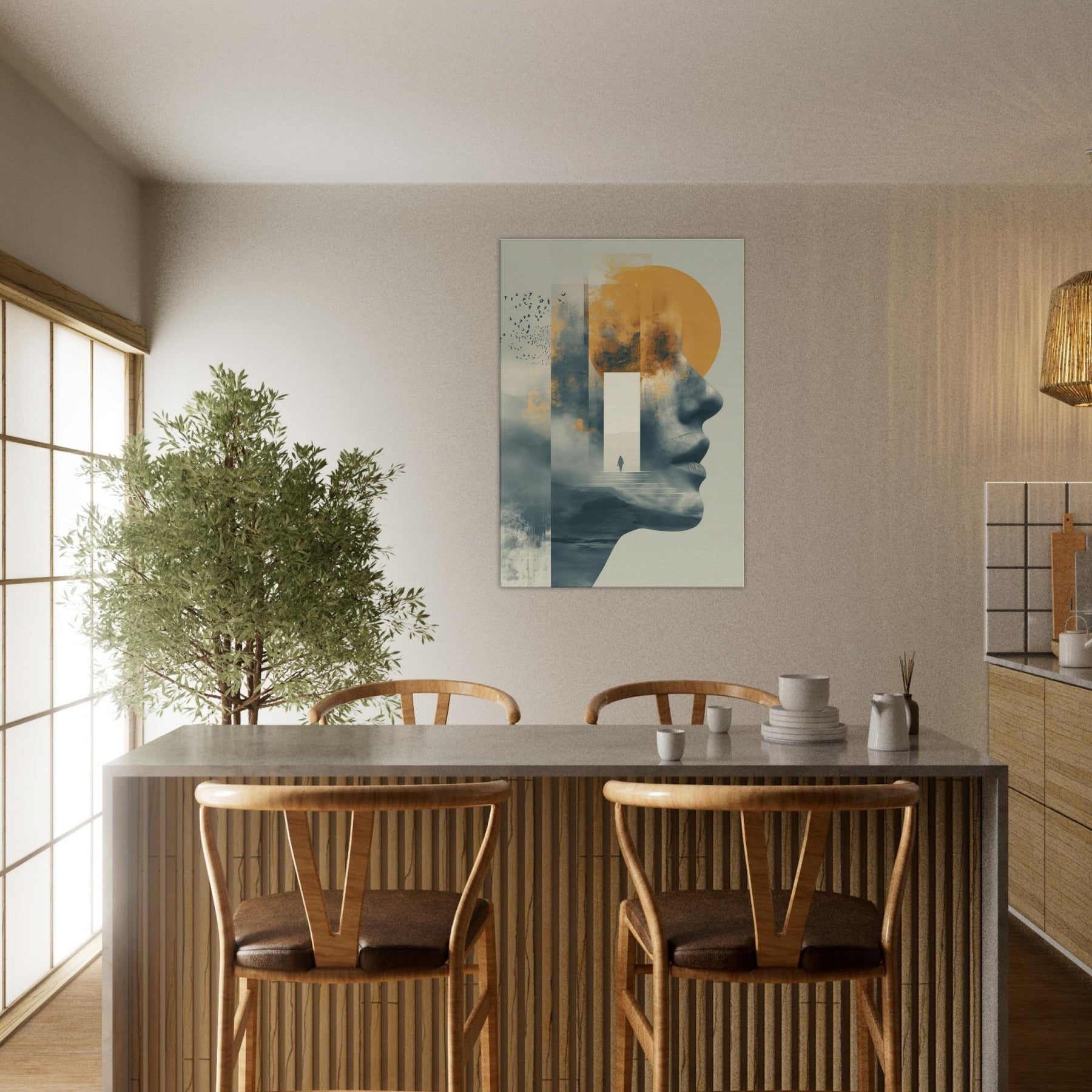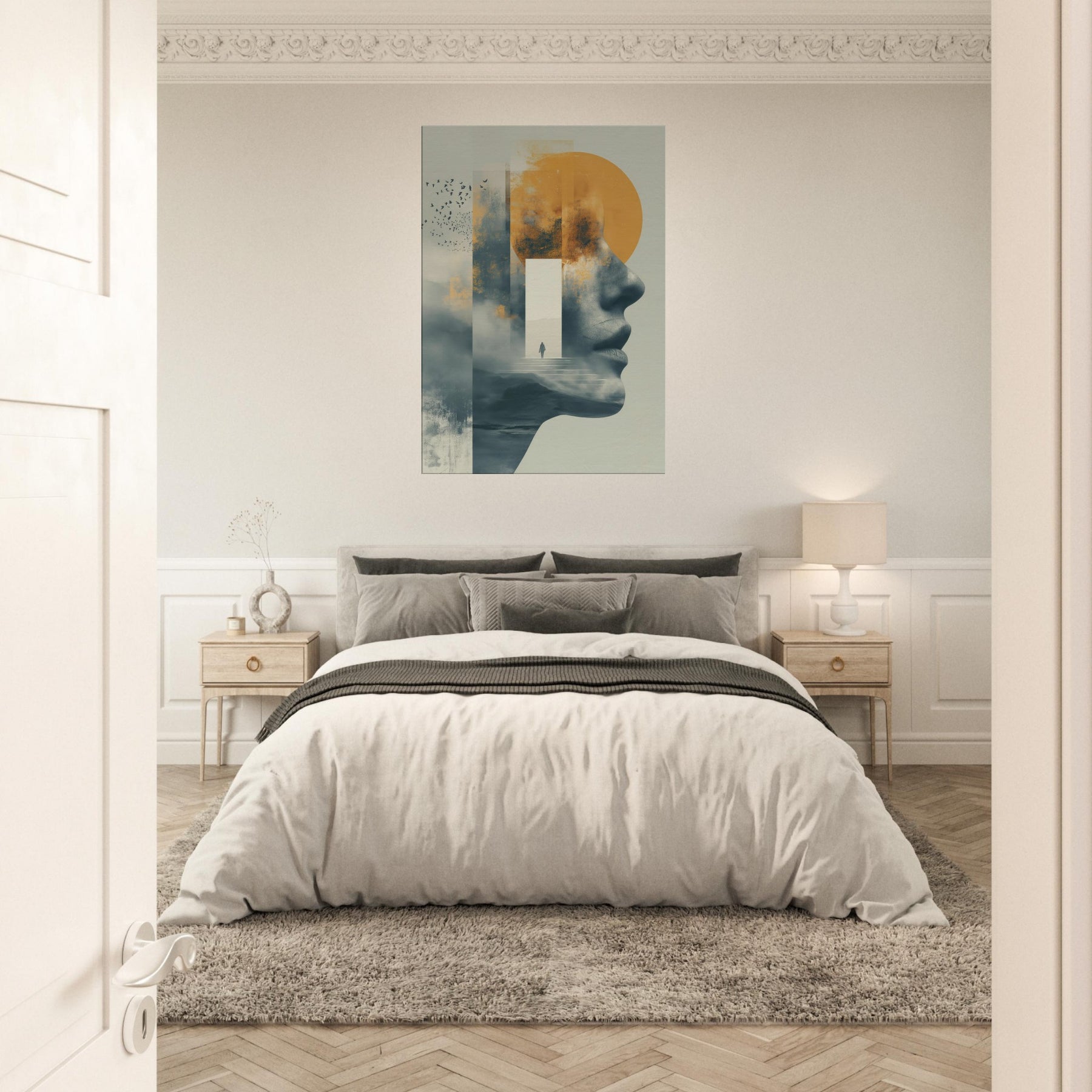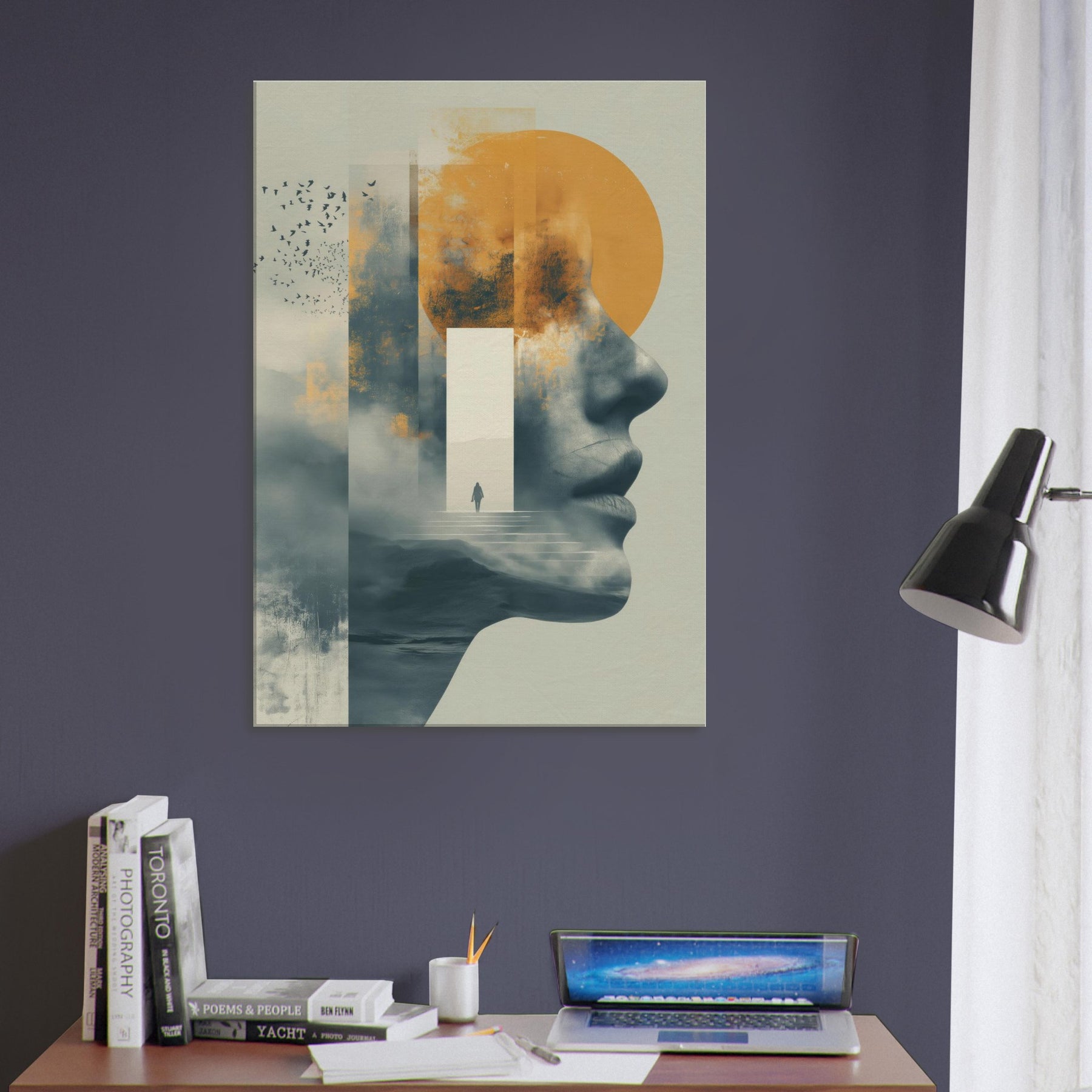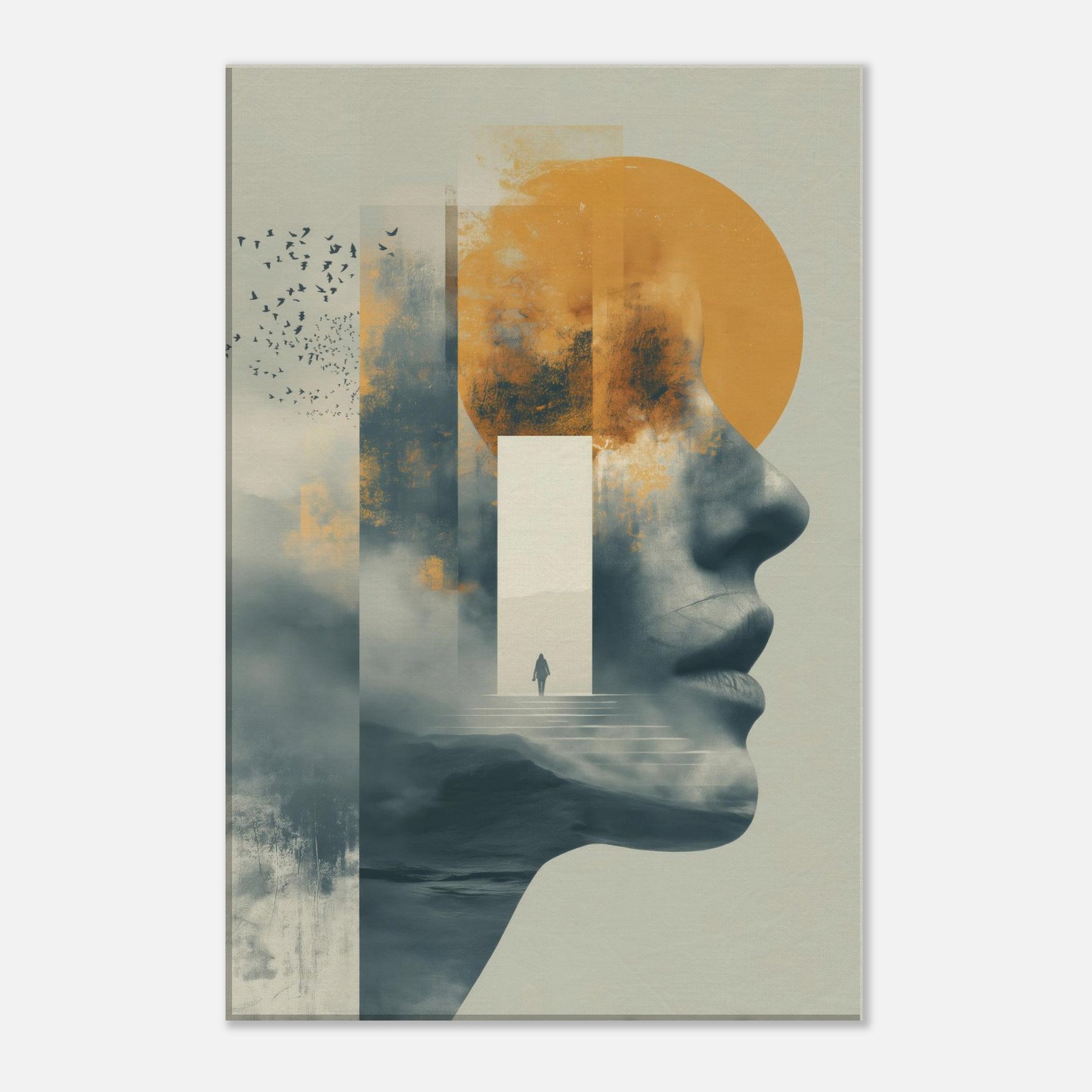Turn your space into a dream portal with this Surrealist ode to memory and form. Geometric shapes unsettle the ordinary, framing a quiet profile as if carved from mist and light. A sun hued arc, slabs, and a solitary figure crossing a doorway invite inward reflection, while the soft fog and muted blues quiet the room into contemplation. Install as a focal point in living rooms or bedrooms to summon calm, curiosity, and a whisper of otherworldly elegance.