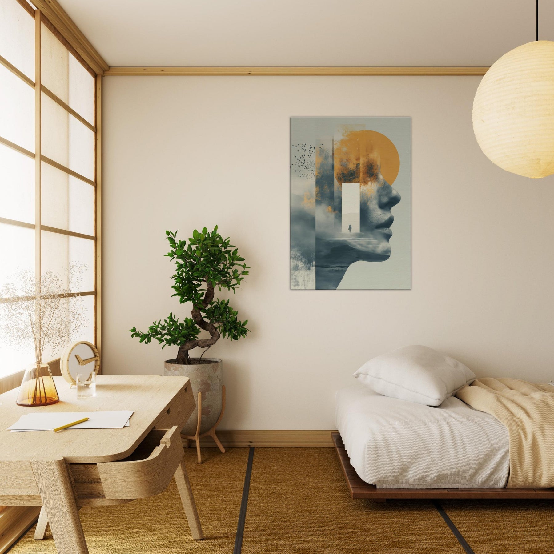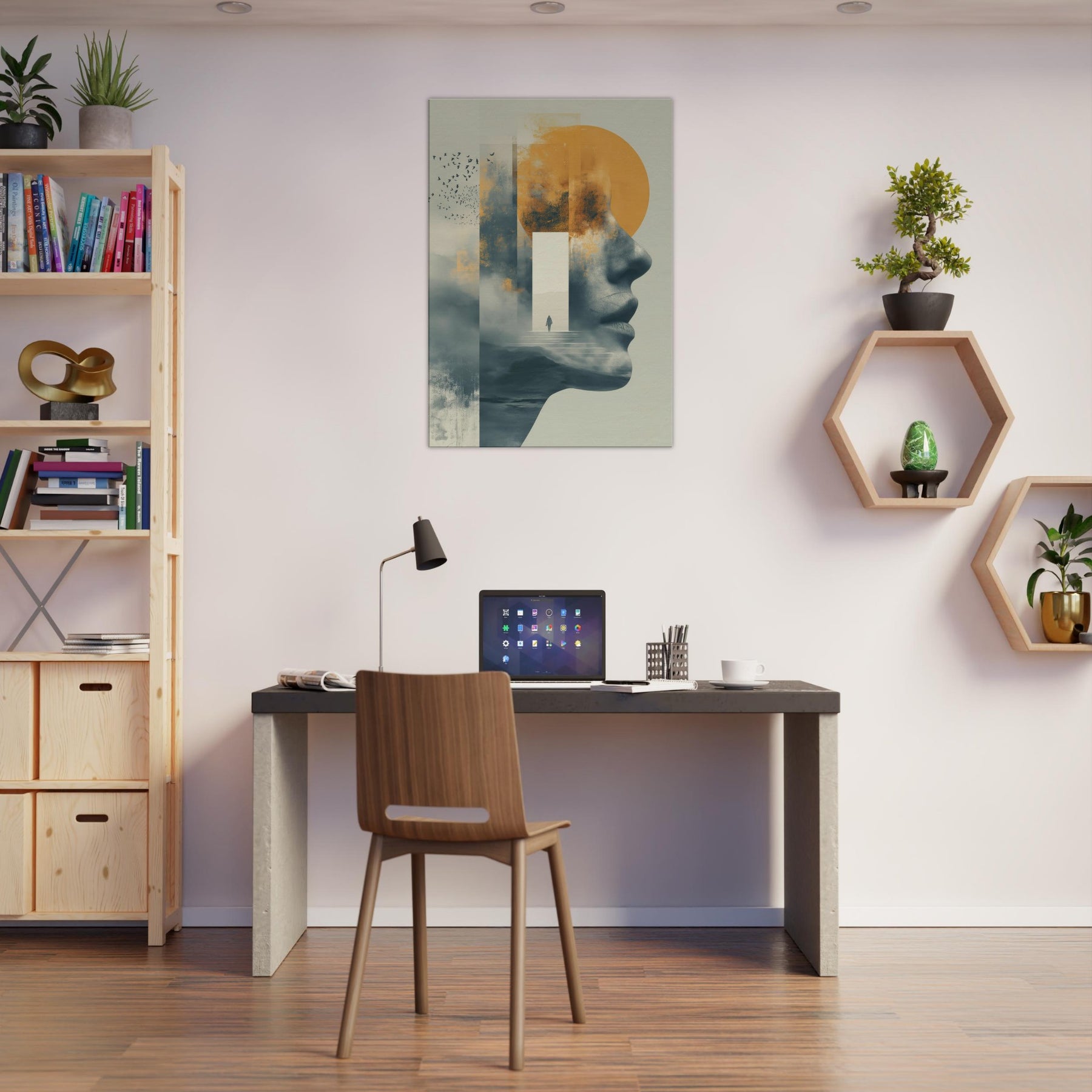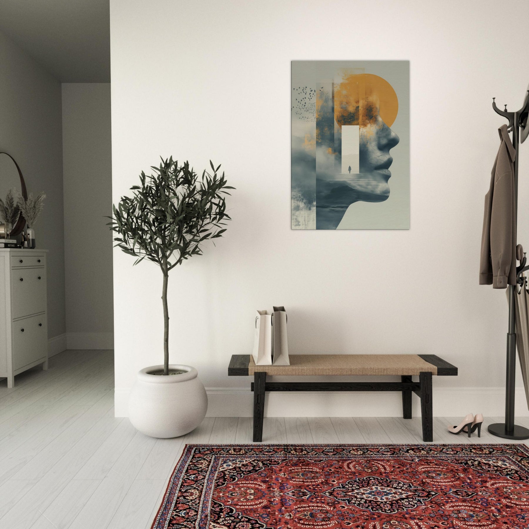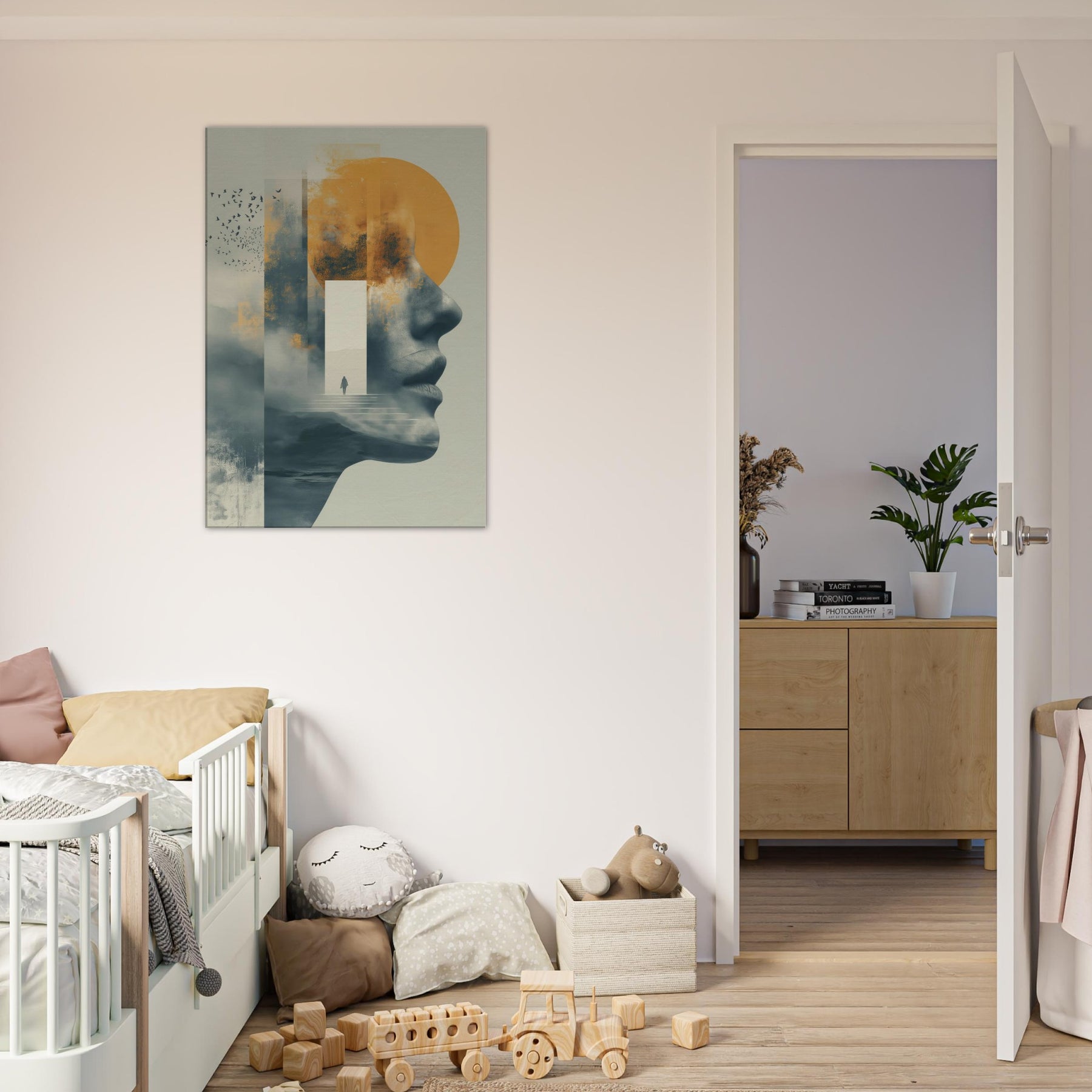 Turn your space into a dream portal with this Surrealist ode to memory and form. Geometric shapes unsettle the ordinary, framing a quiet profile as if carved from mist and light. A sun hued arc, slabs, and a solitary figure crossing a doorway invite inward reflection, while the soft fog and muted blues quiet the room into contemplation. Install as a focal point in living rooms or bedrooms to summon calm, curiosity, and a whisper of otherworldly elegance.